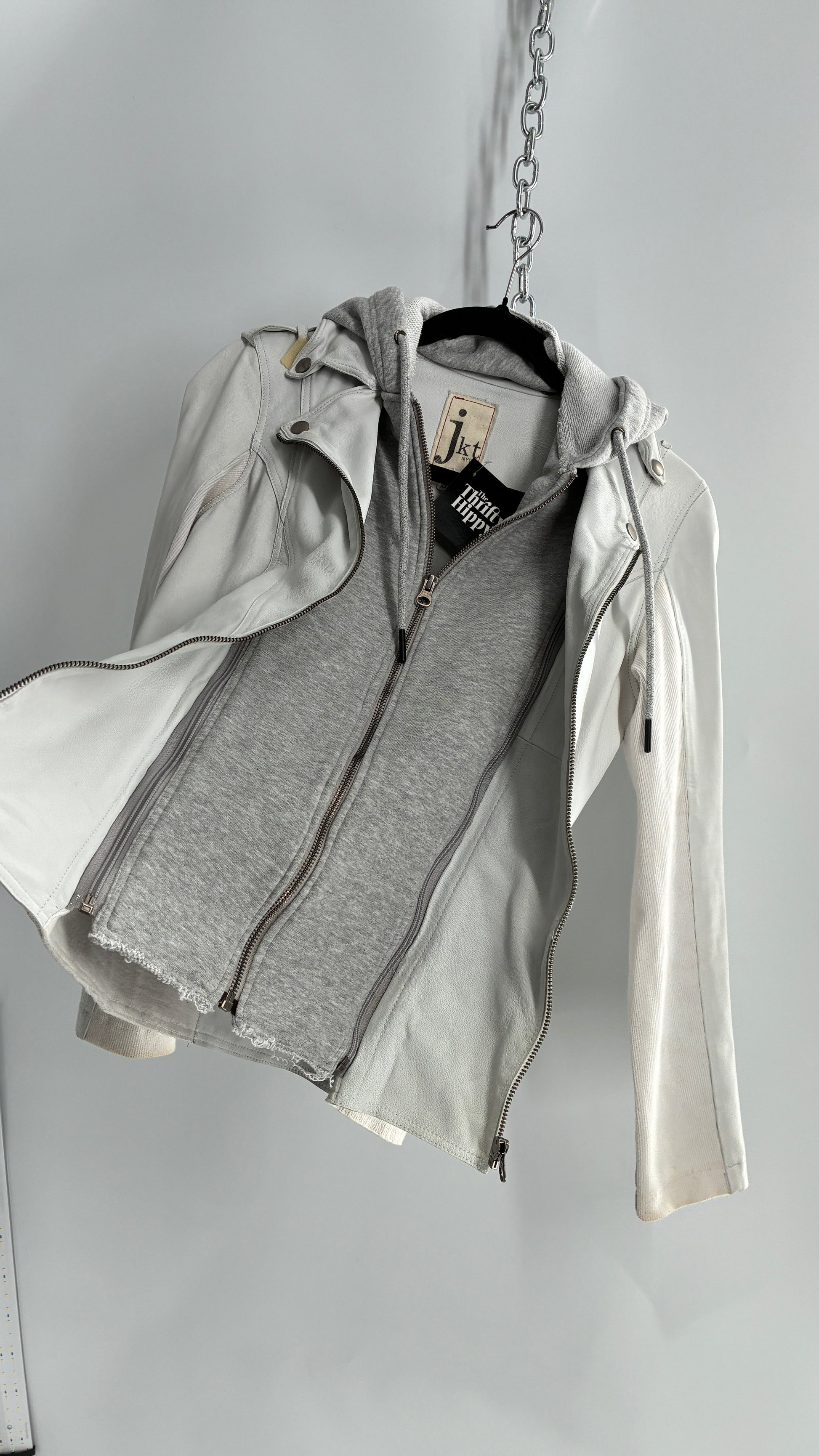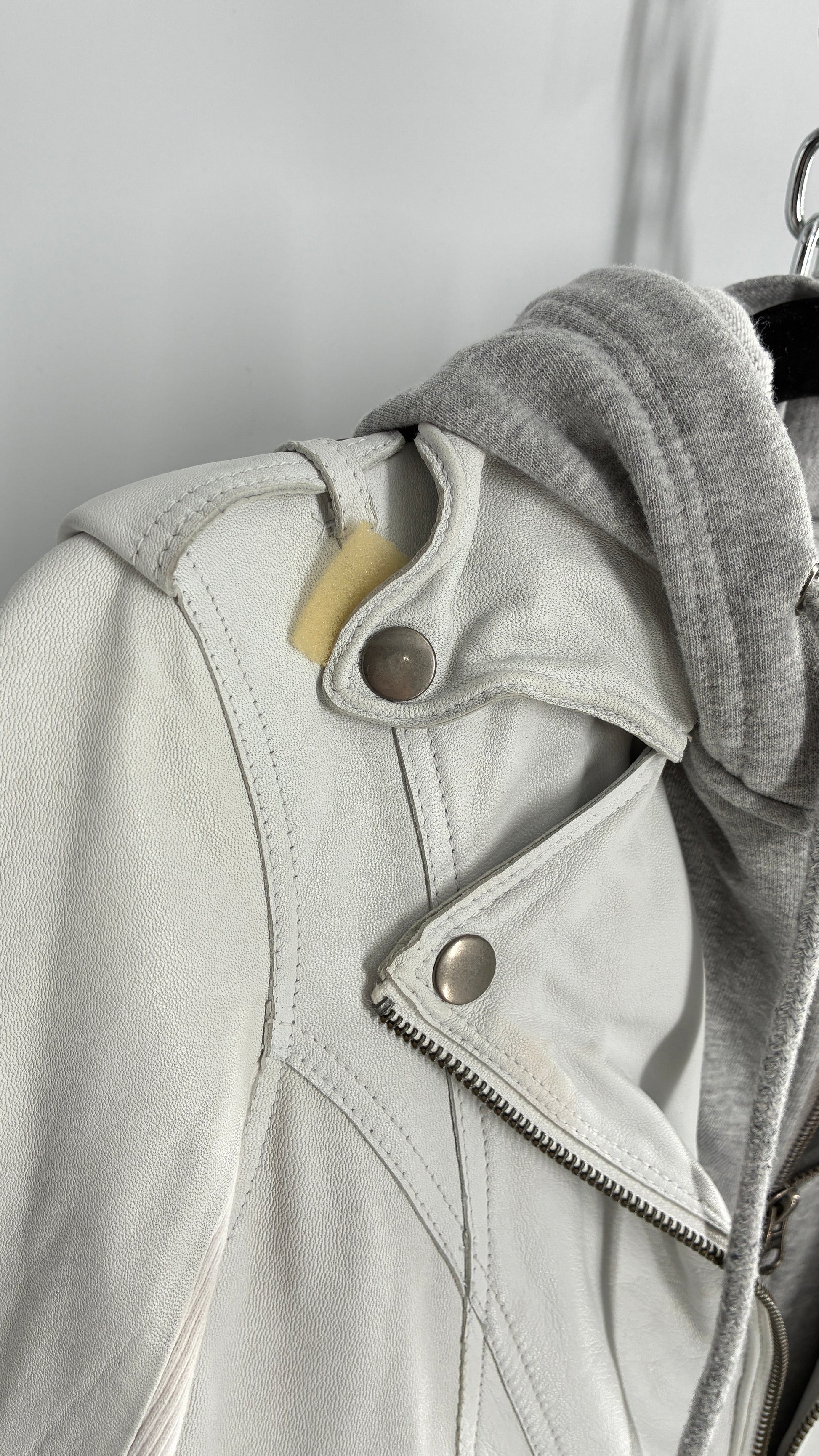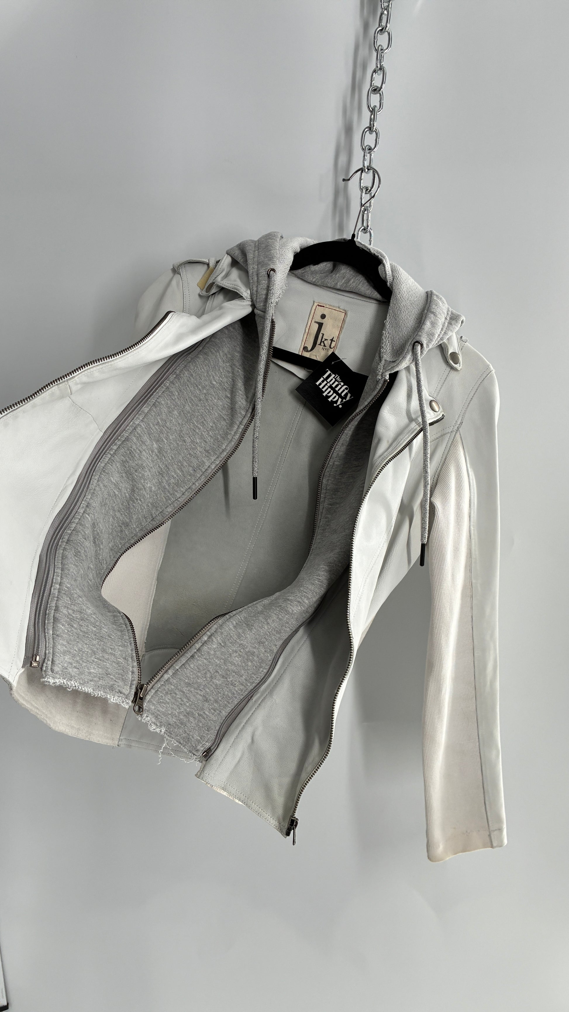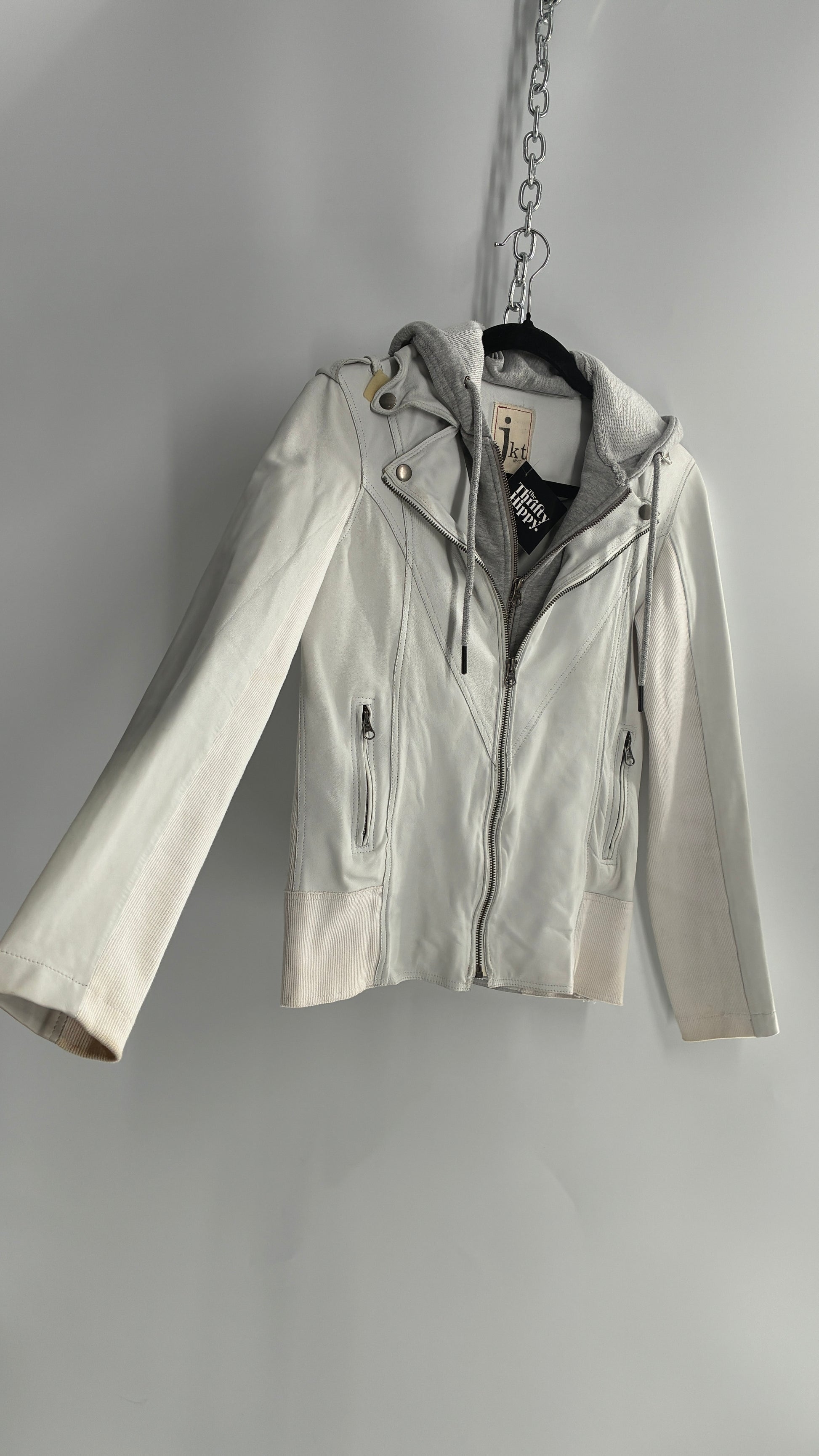 Jakett White Genuine Leather Double Layer Moto Jacket with Removable Grey Hoodie Insert