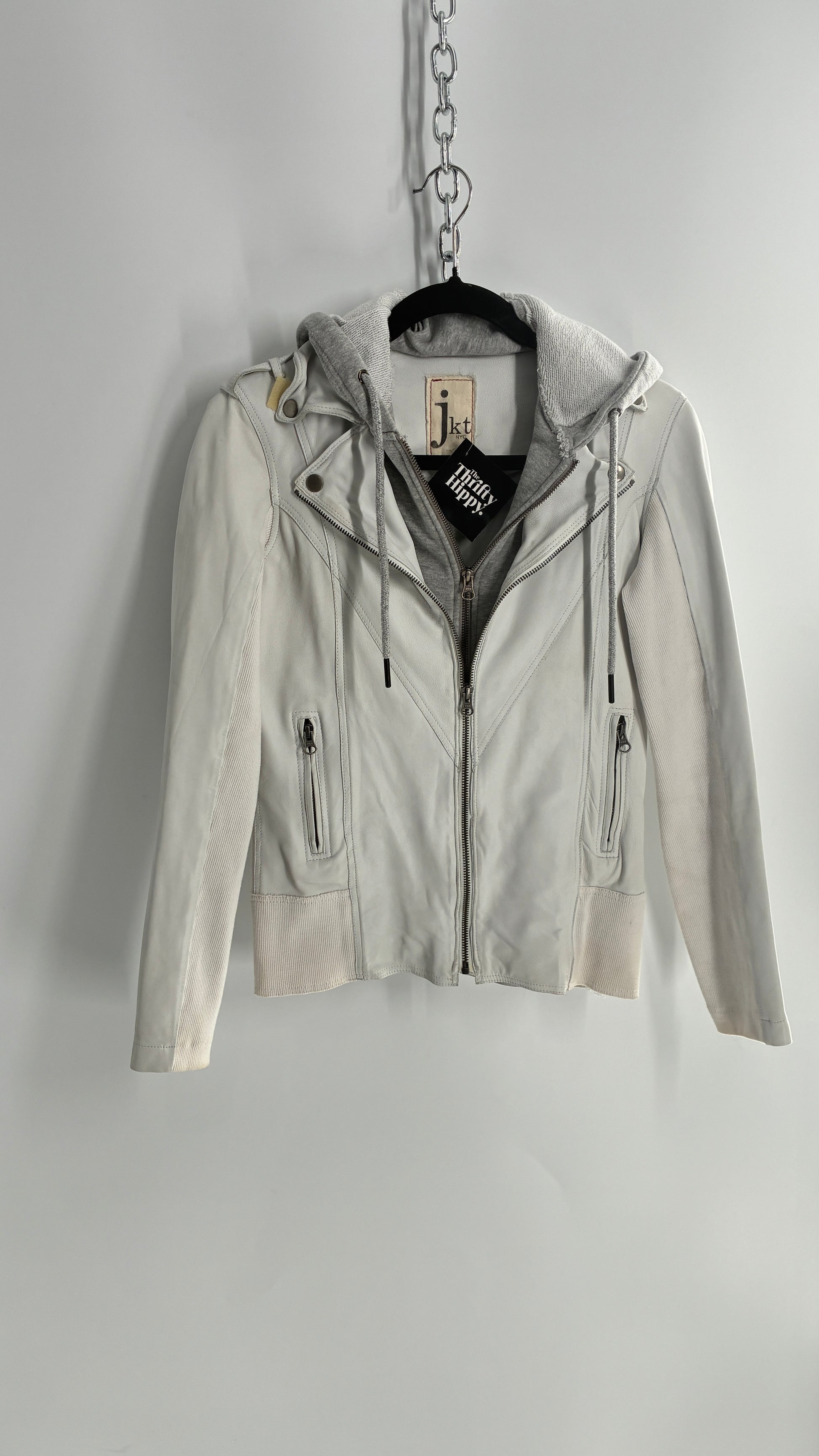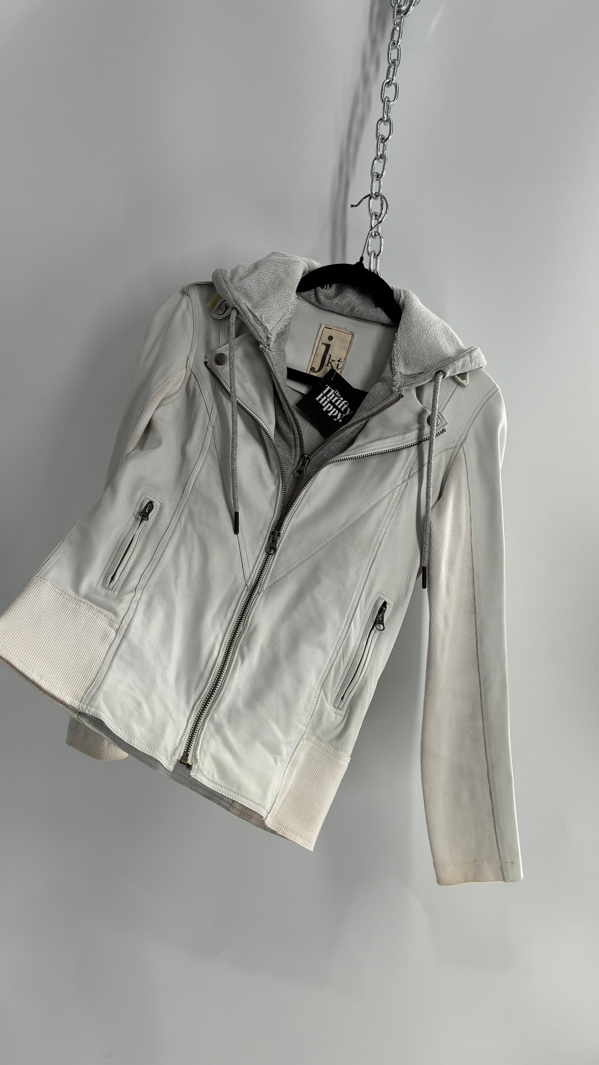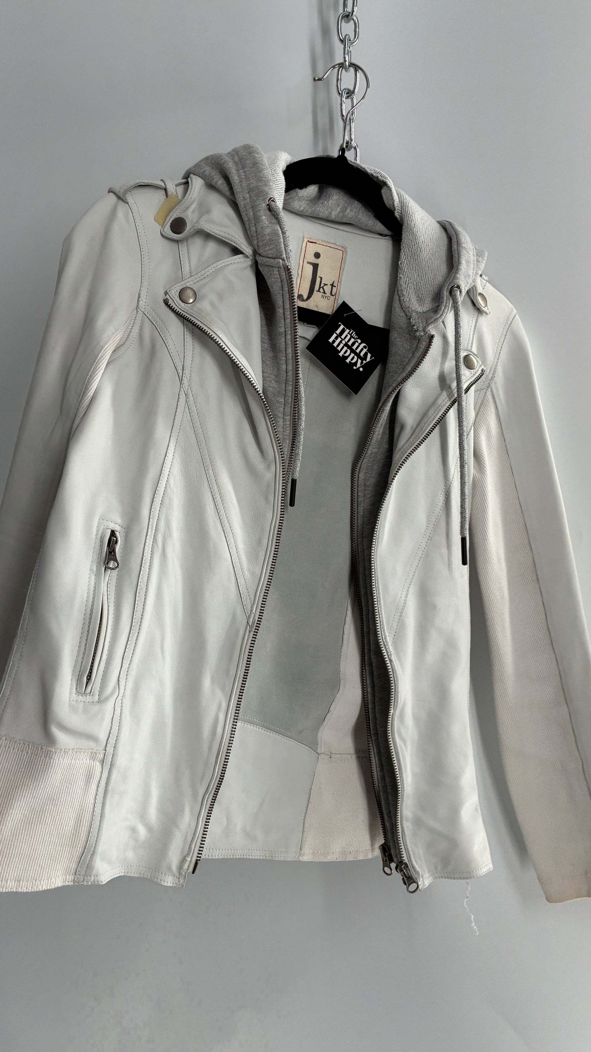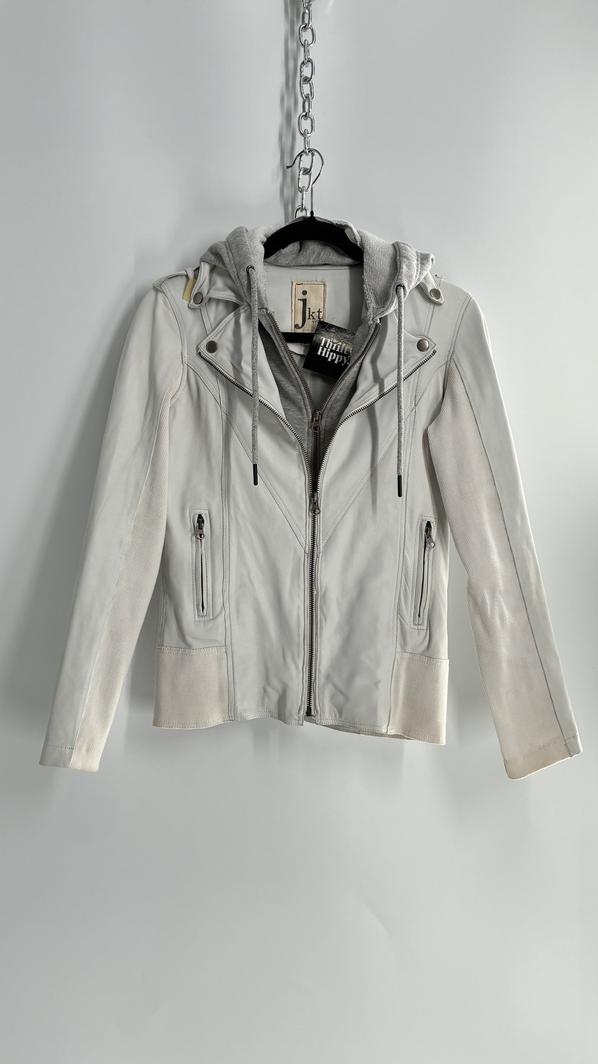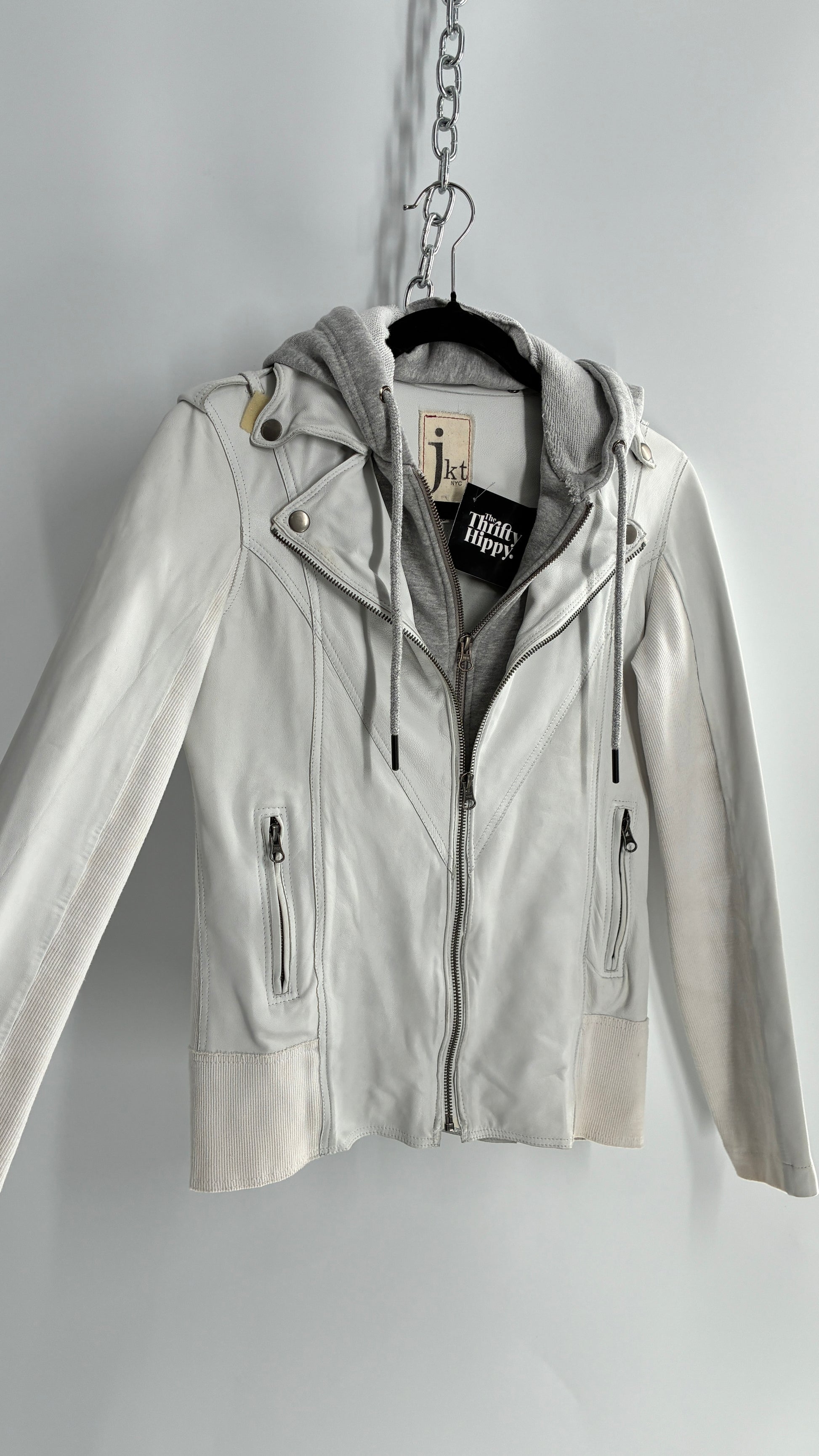 Jakett White Genuine Leather Double Layer Moto Jacket with Removable Grey Hoodie Insert