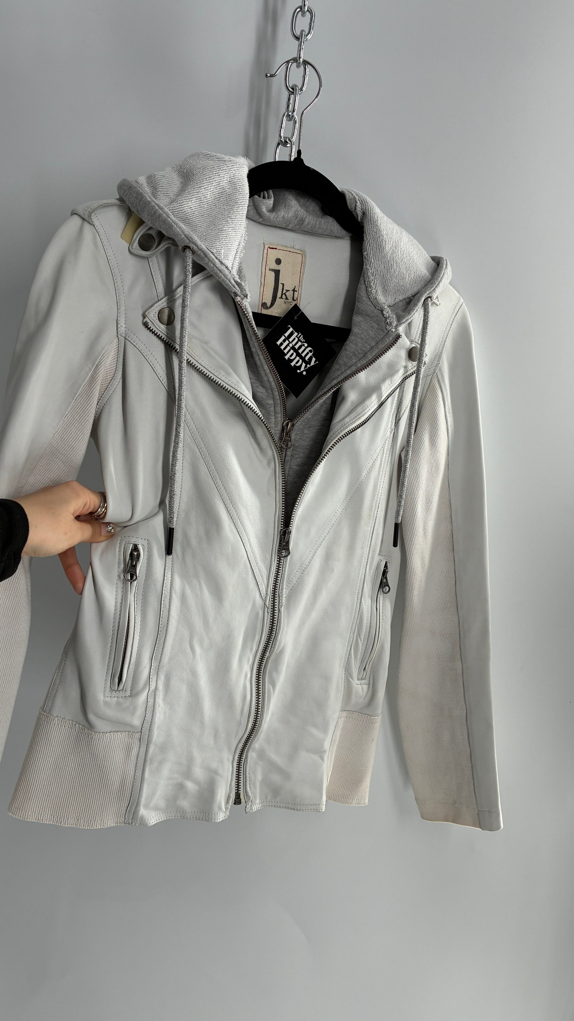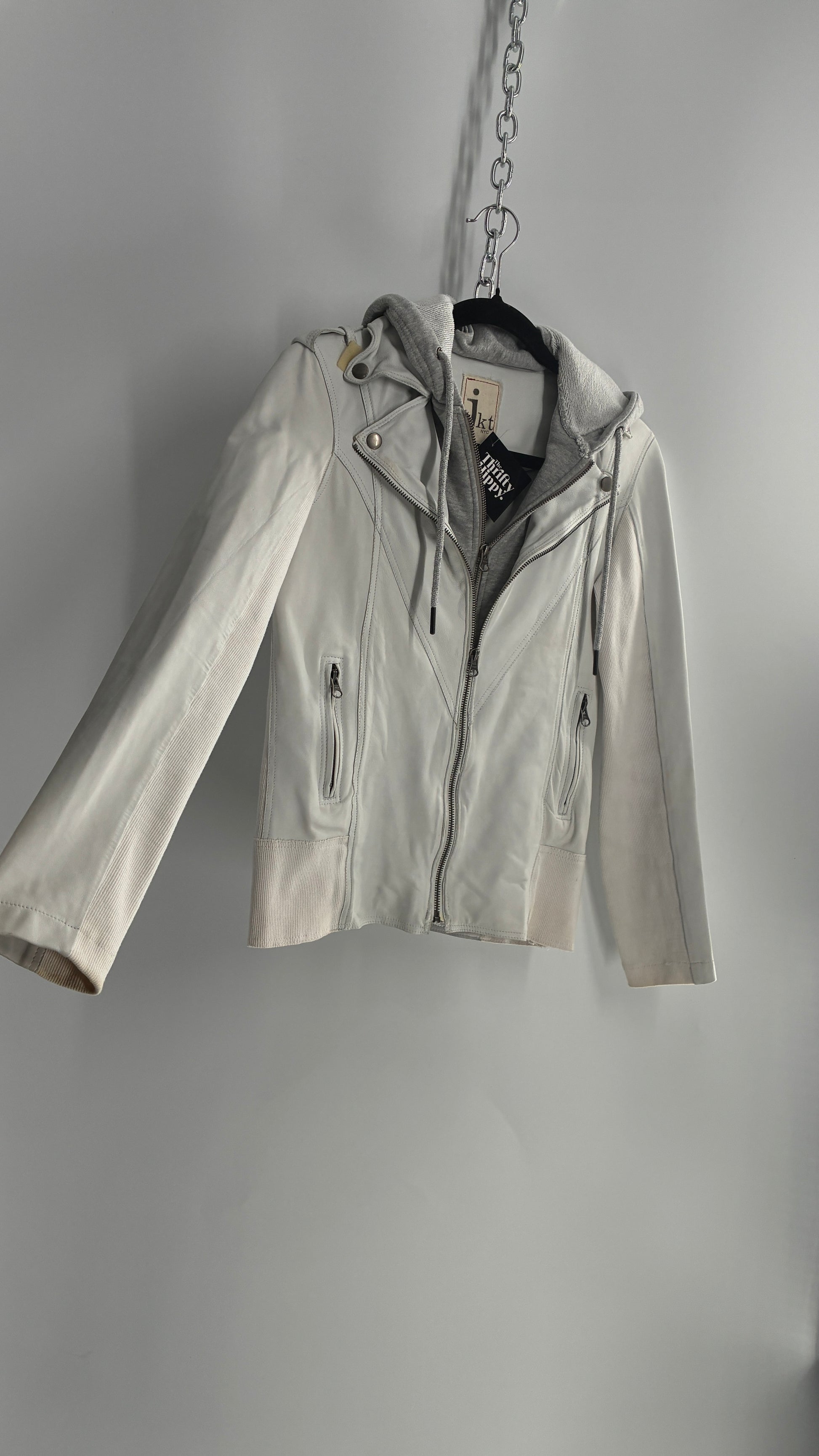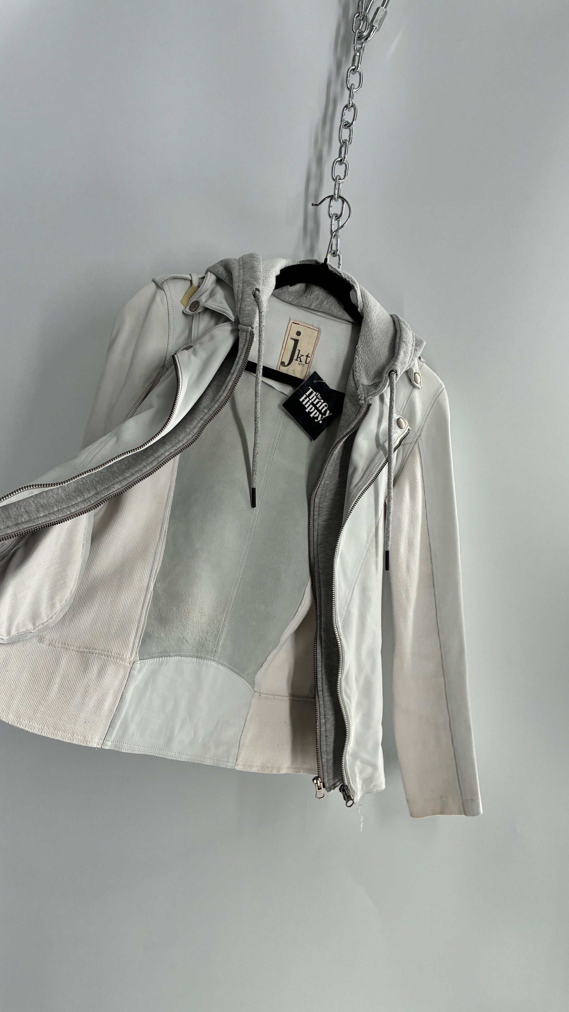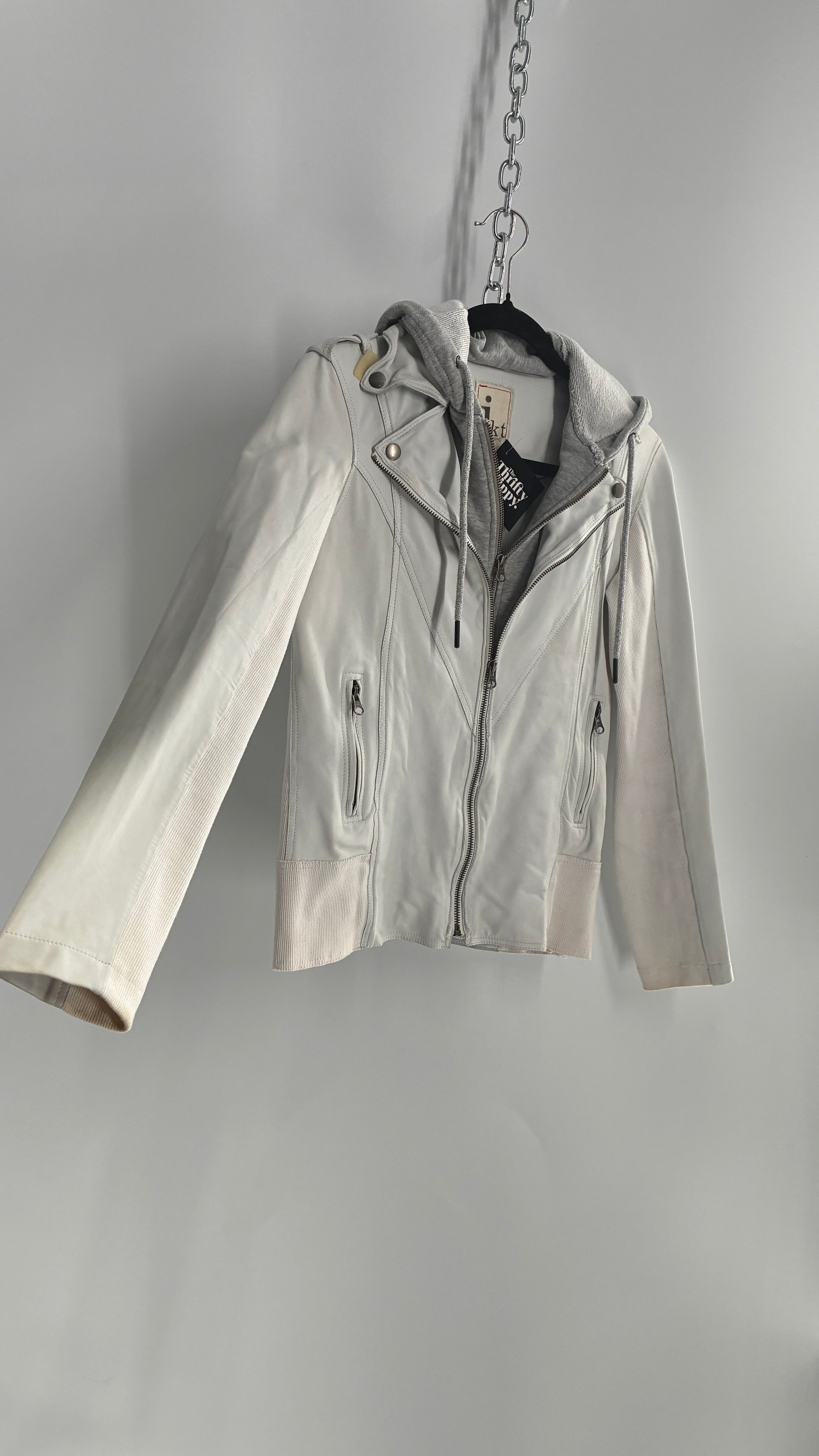Jakett White Genuine Leather Double Layer Moto Jacket with Removable Grey Hoodie Insert