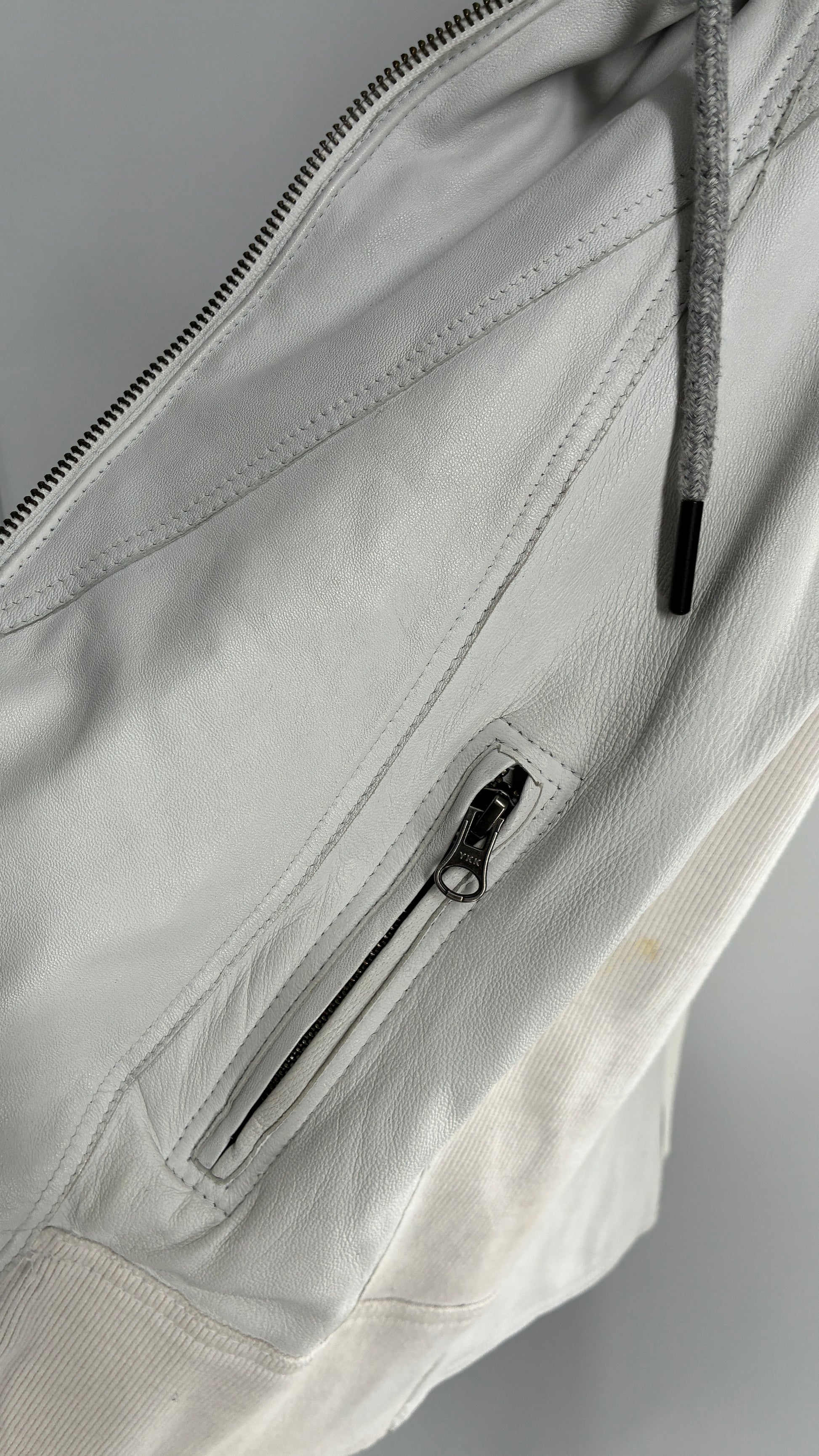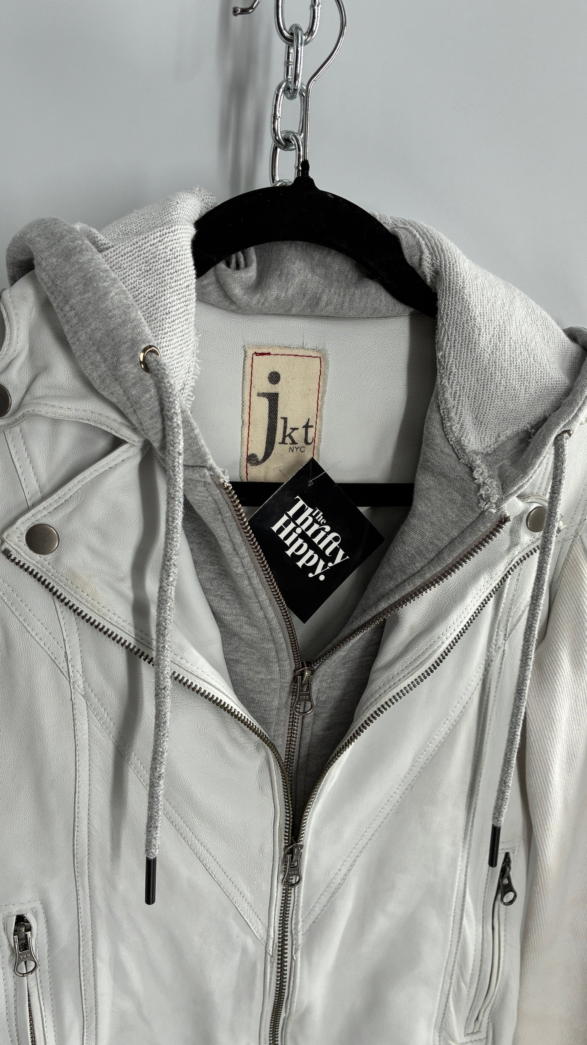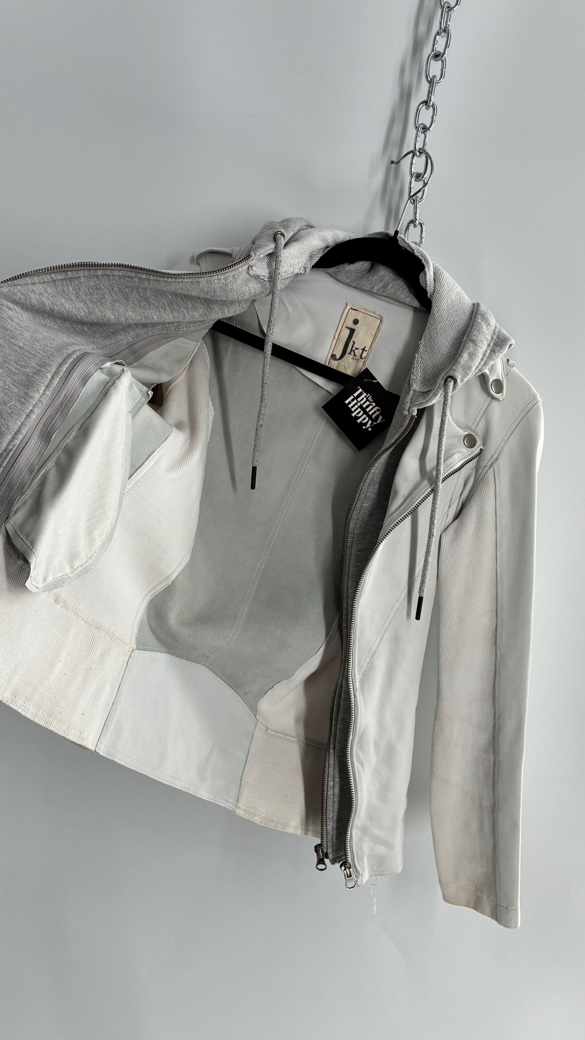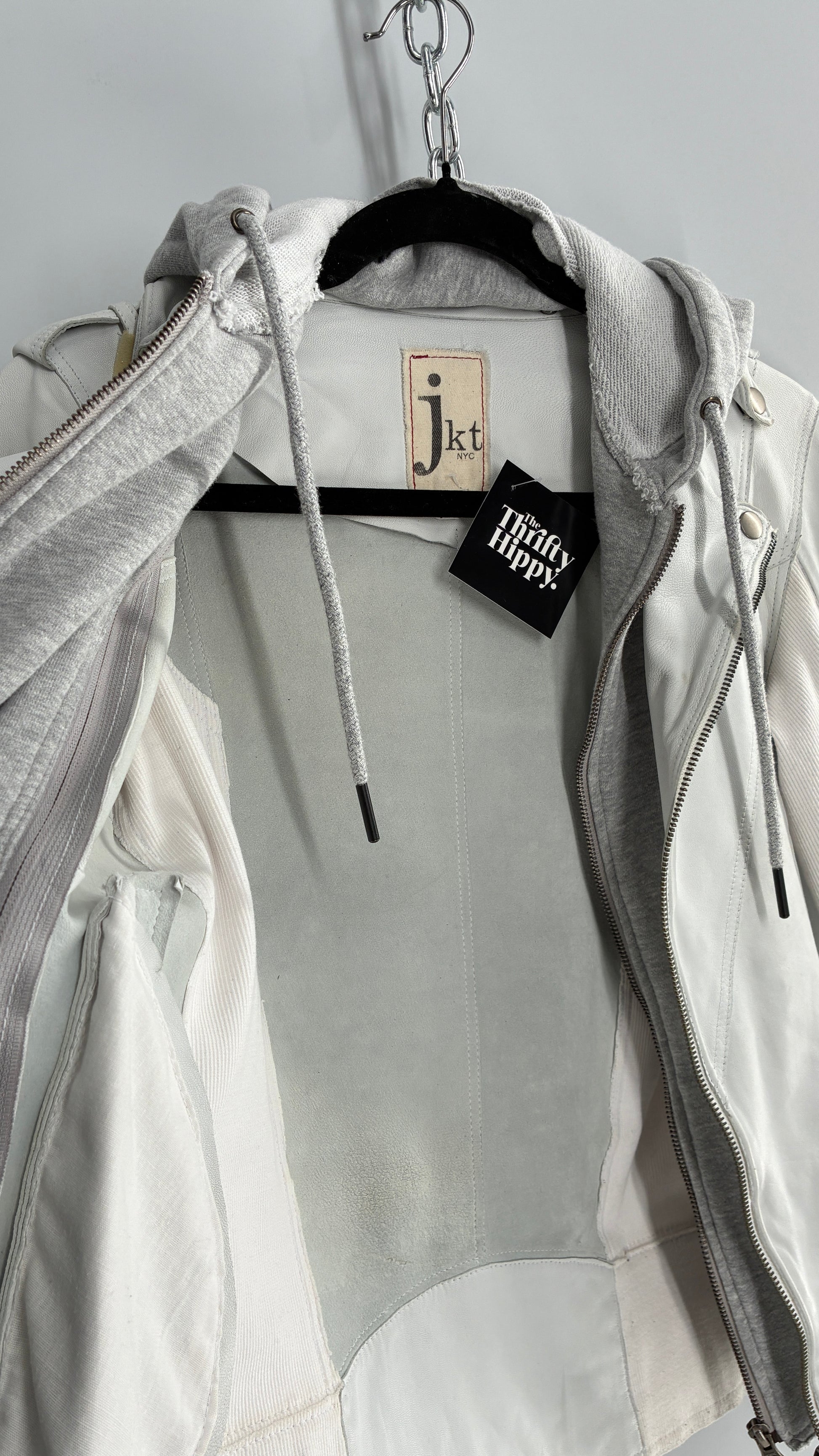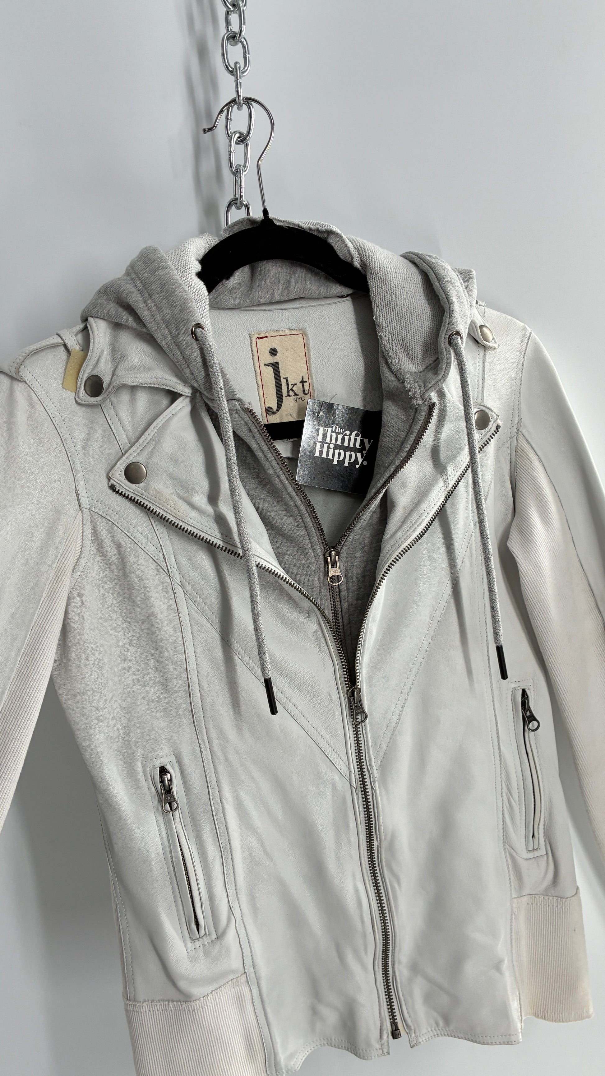 Jakett White Genuine Leather Double Layer Moto Jacket with Removable Grey Hoodie Insert