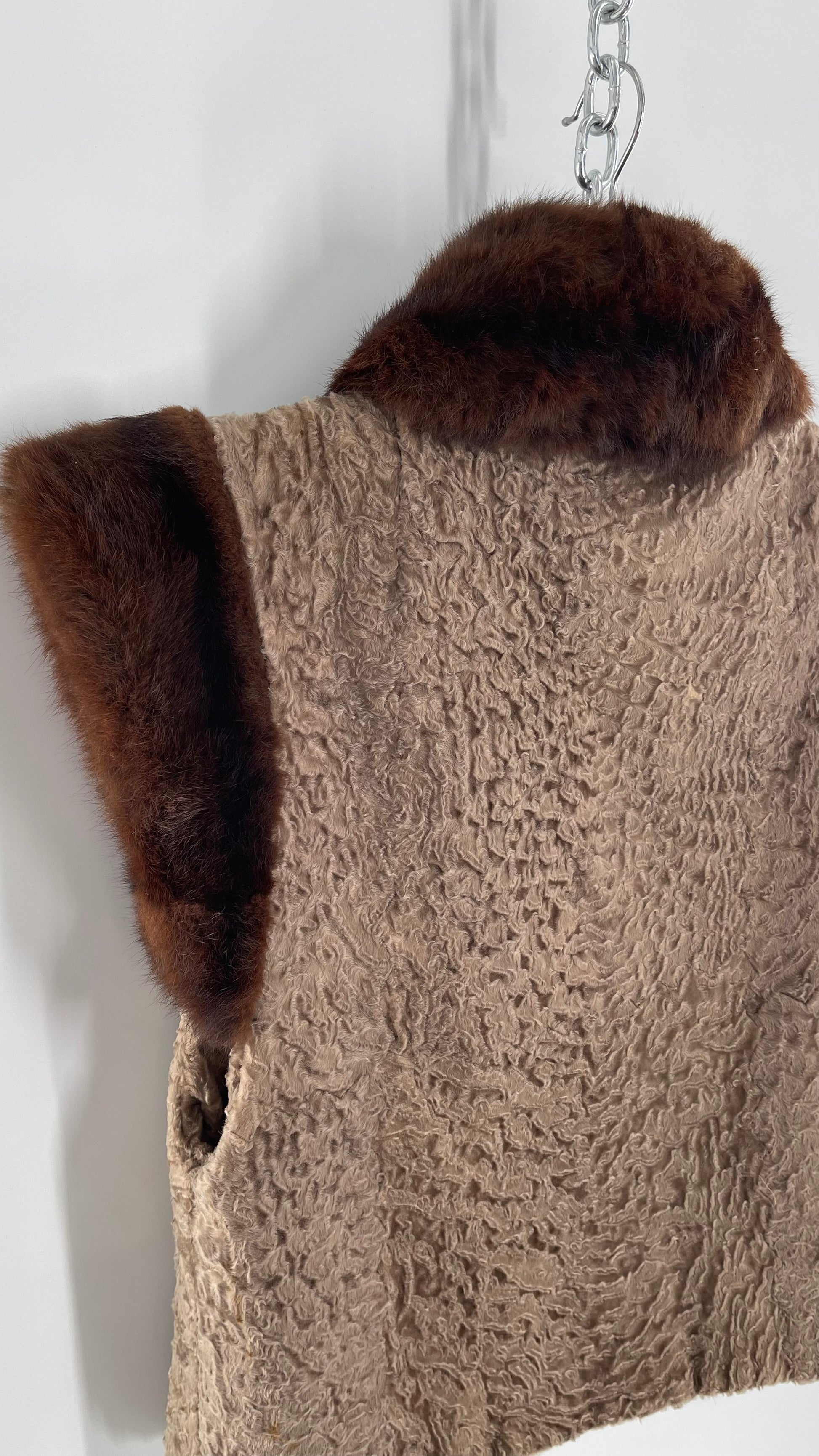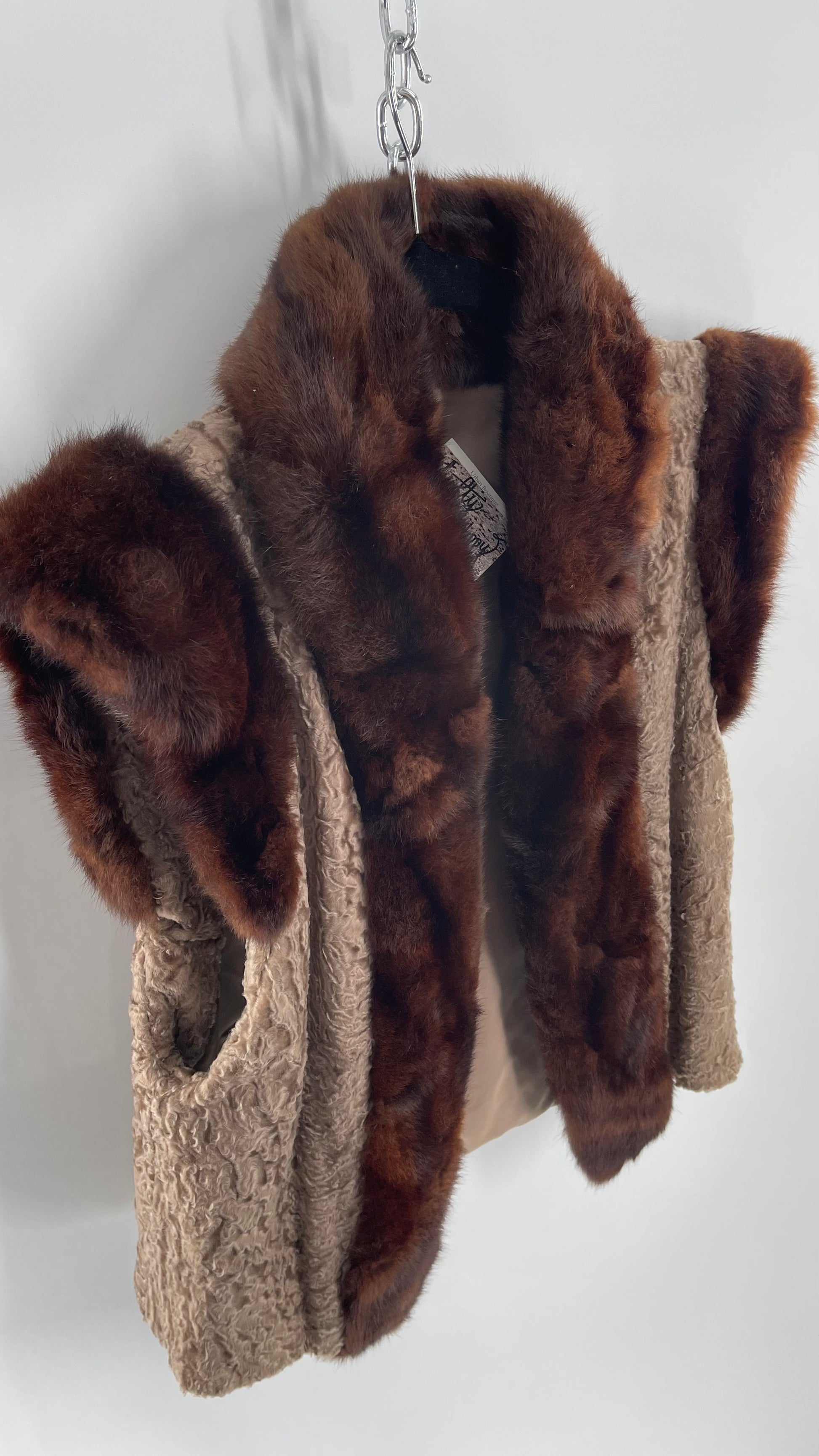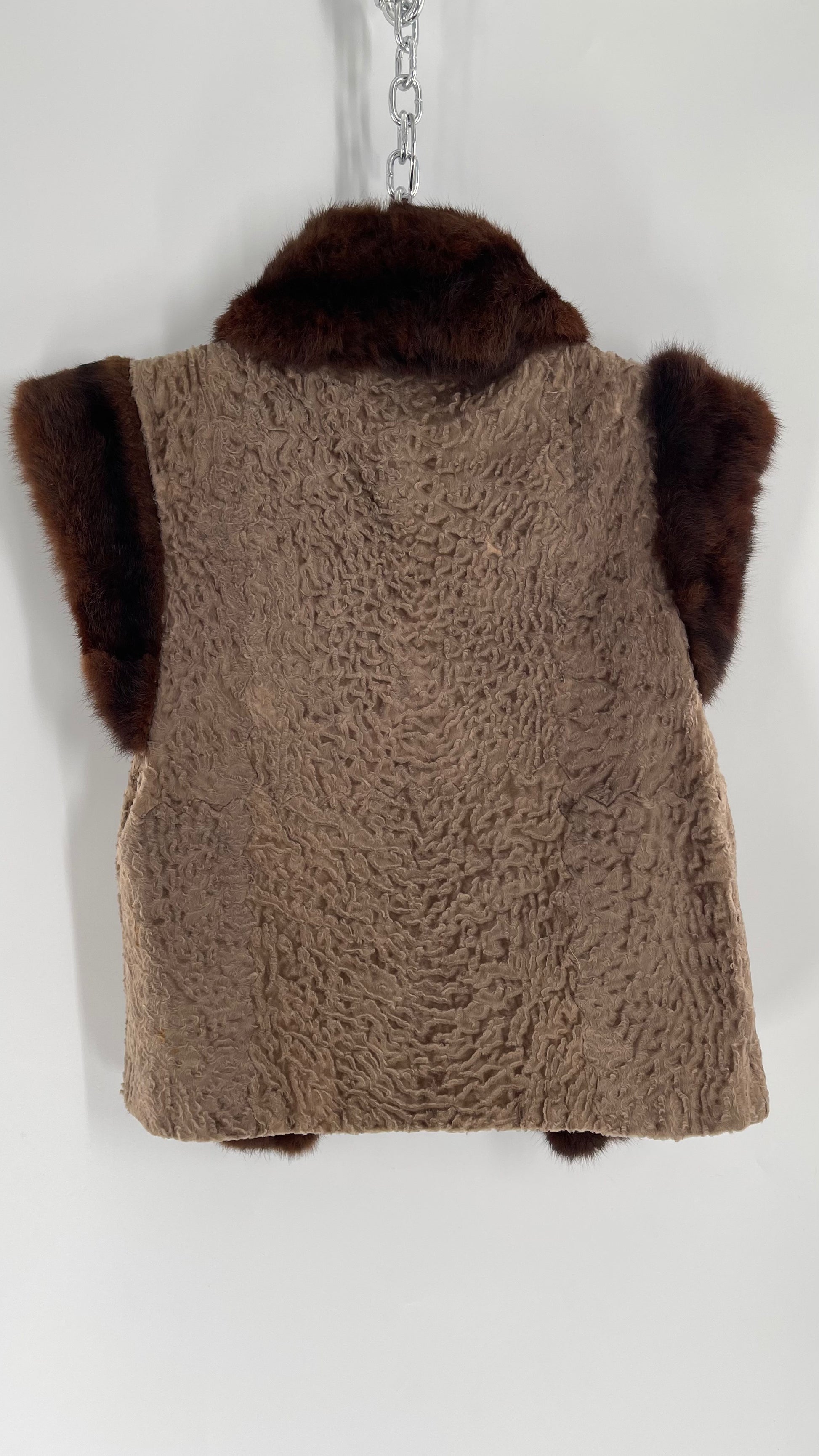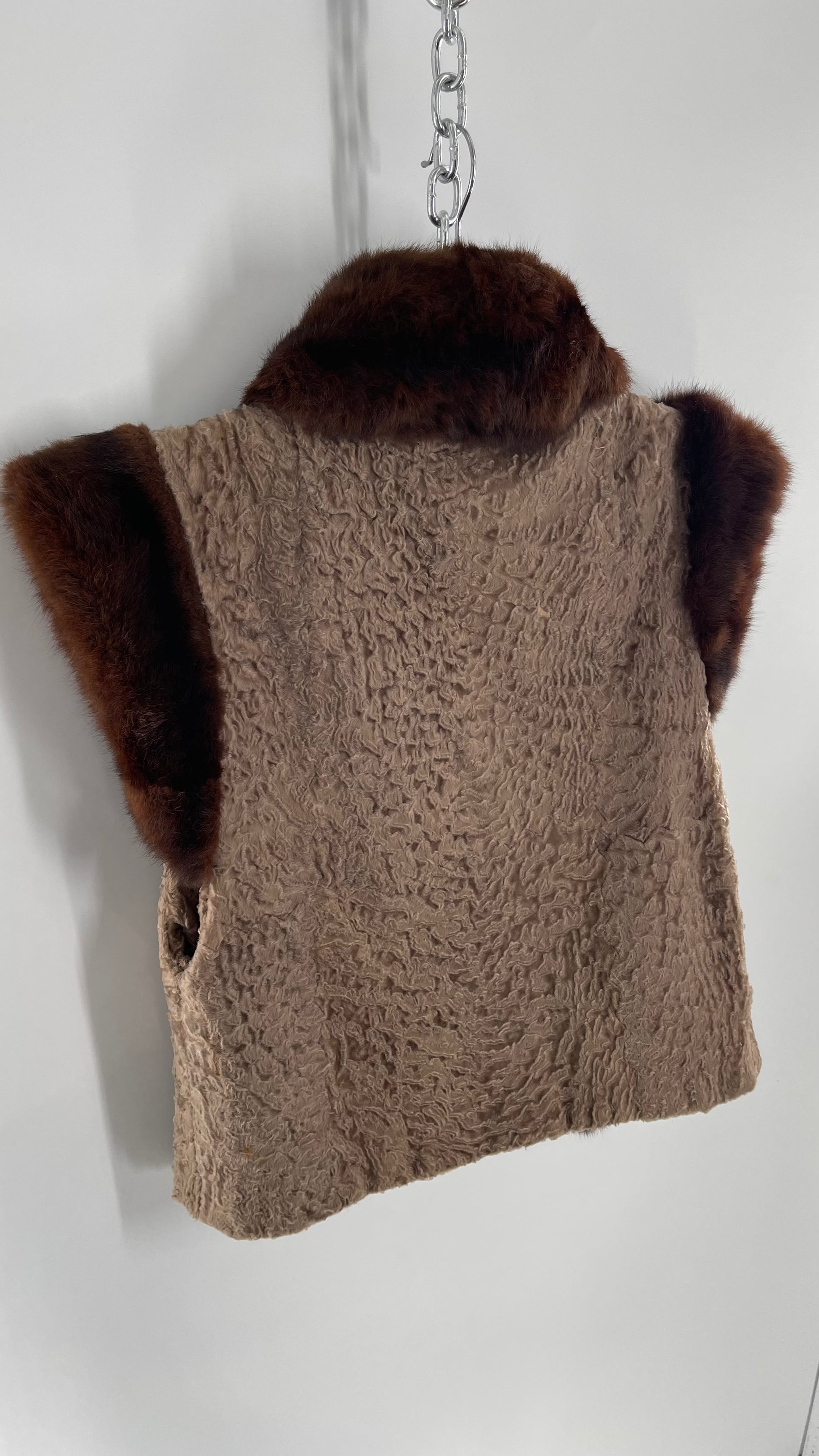 Vintage Genuine Fur Vest Handmade with what appears to be sheared, wavy lamb fur body and contrasting fur trim