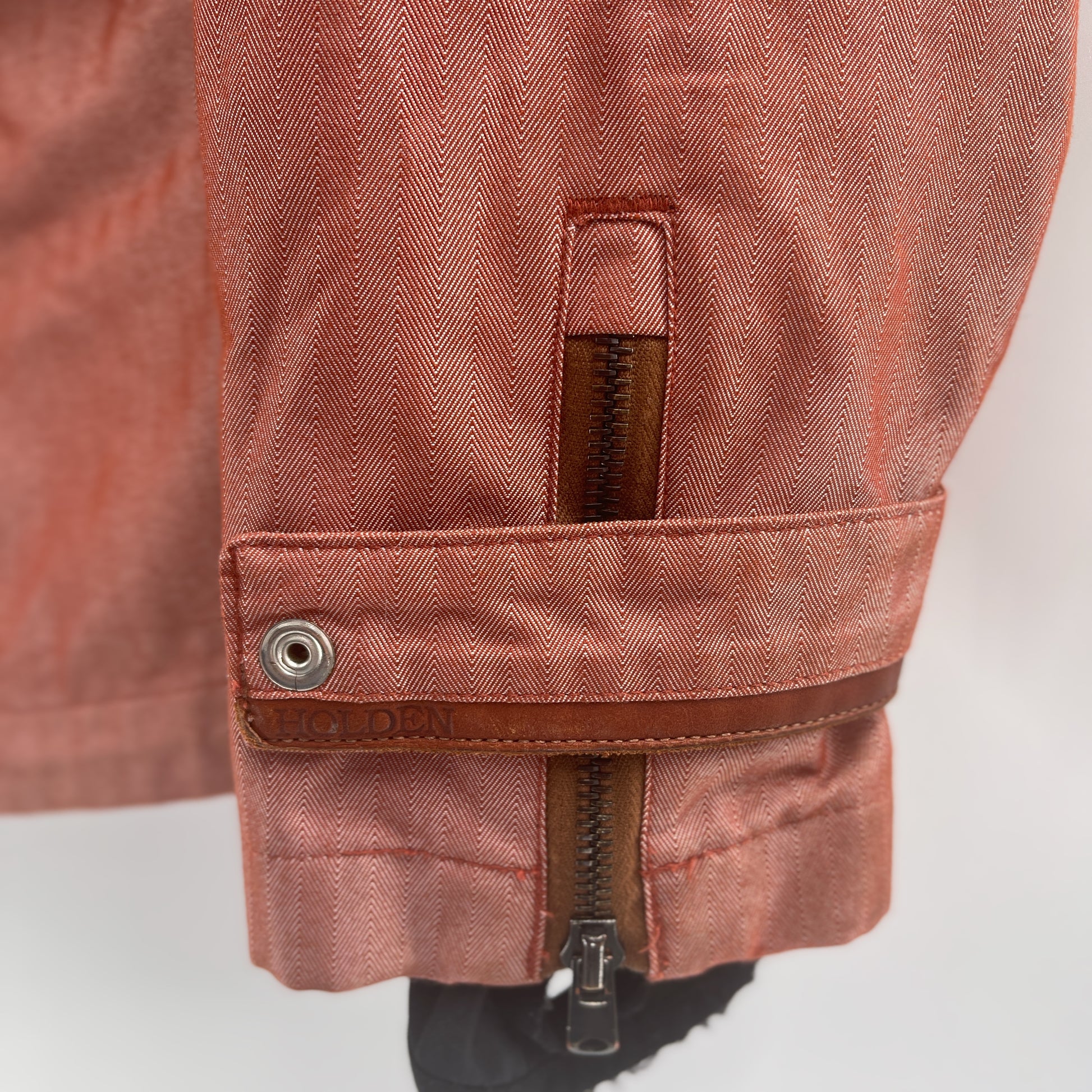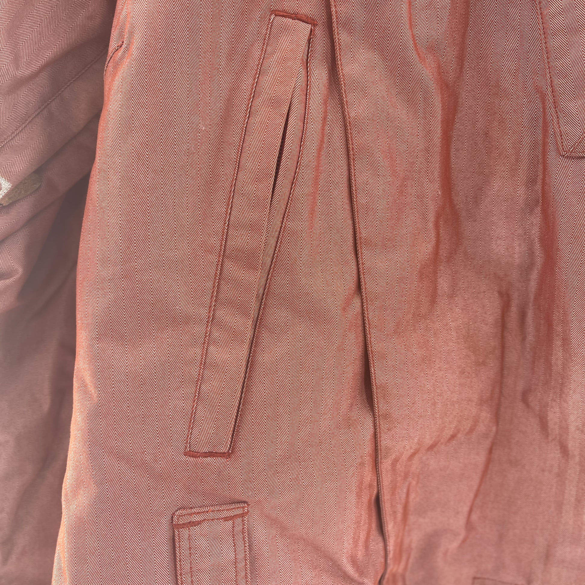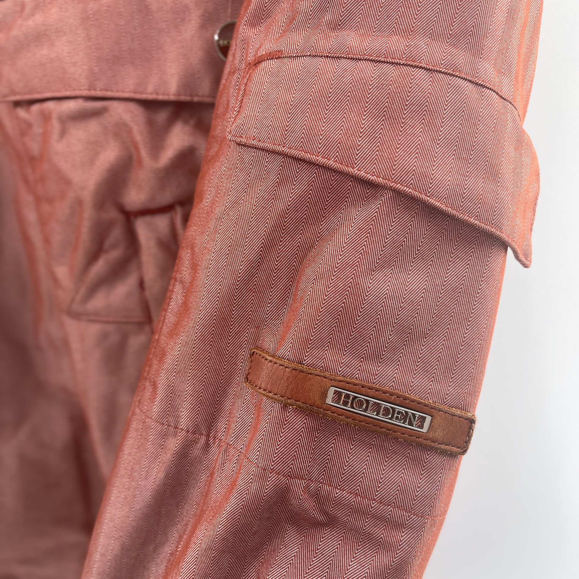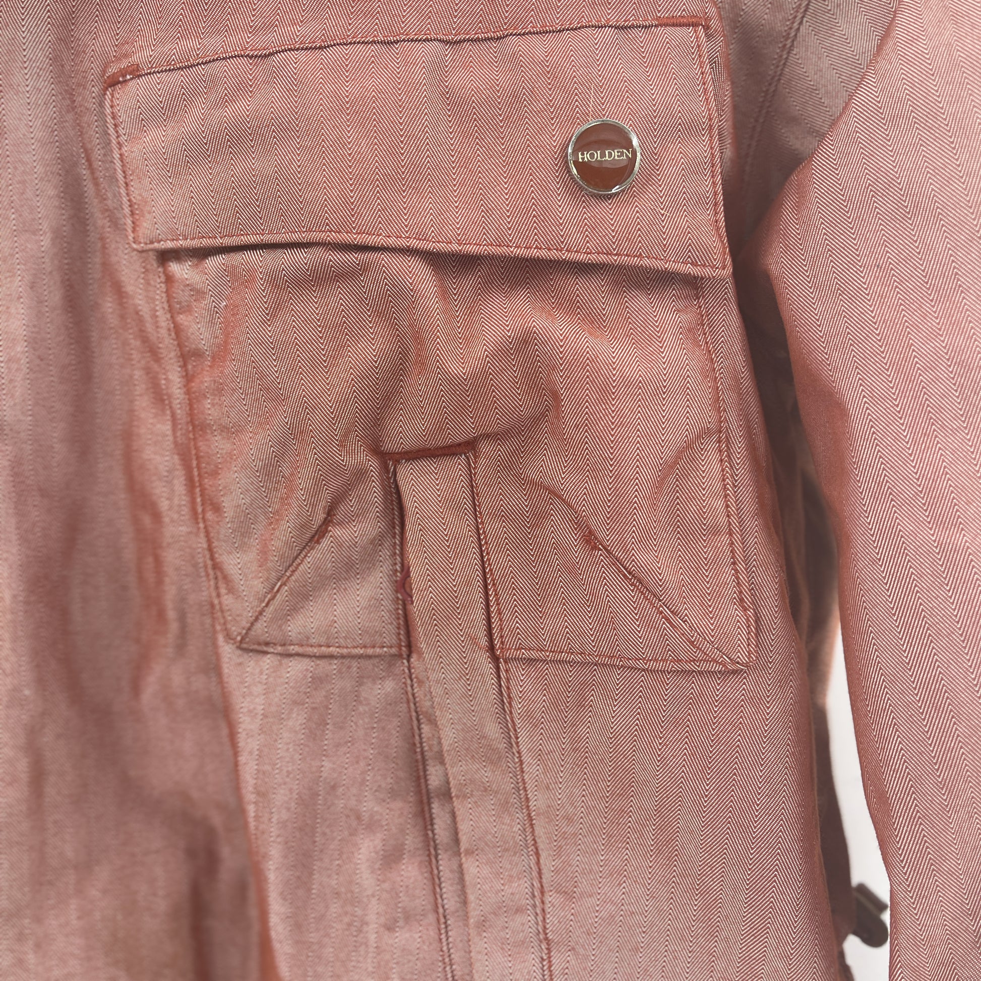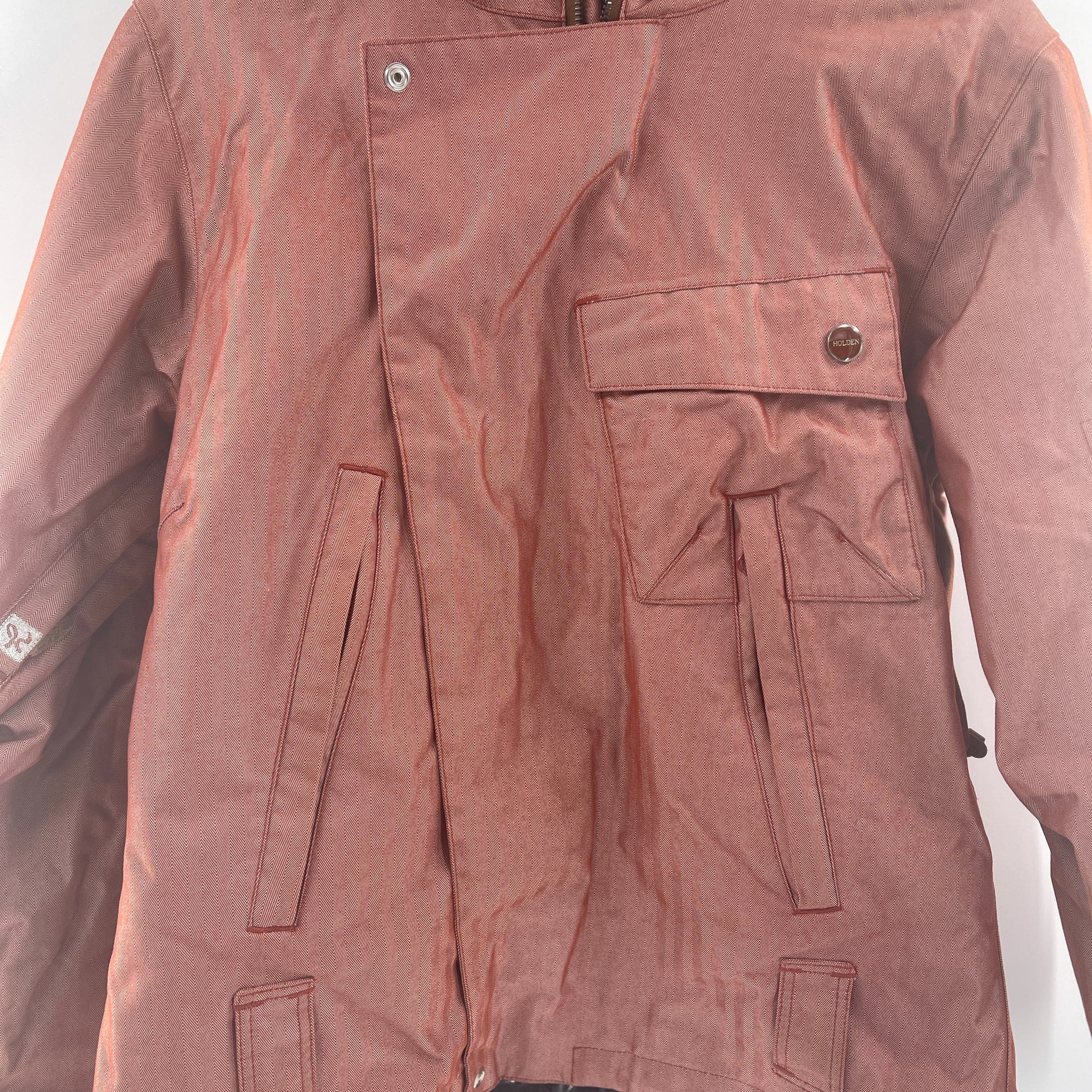 Holden salmon ski/snowboard Jacket with subtle herringbone pattern> Waterproof coating, Tons of technical features; zip front with snap and hook/loop fastening, zip and snap sleeves with internal thumbhole gaitor removable hood zip out waist gaitor,zipper to attach to snowpants in the back, drawstring bungee hood