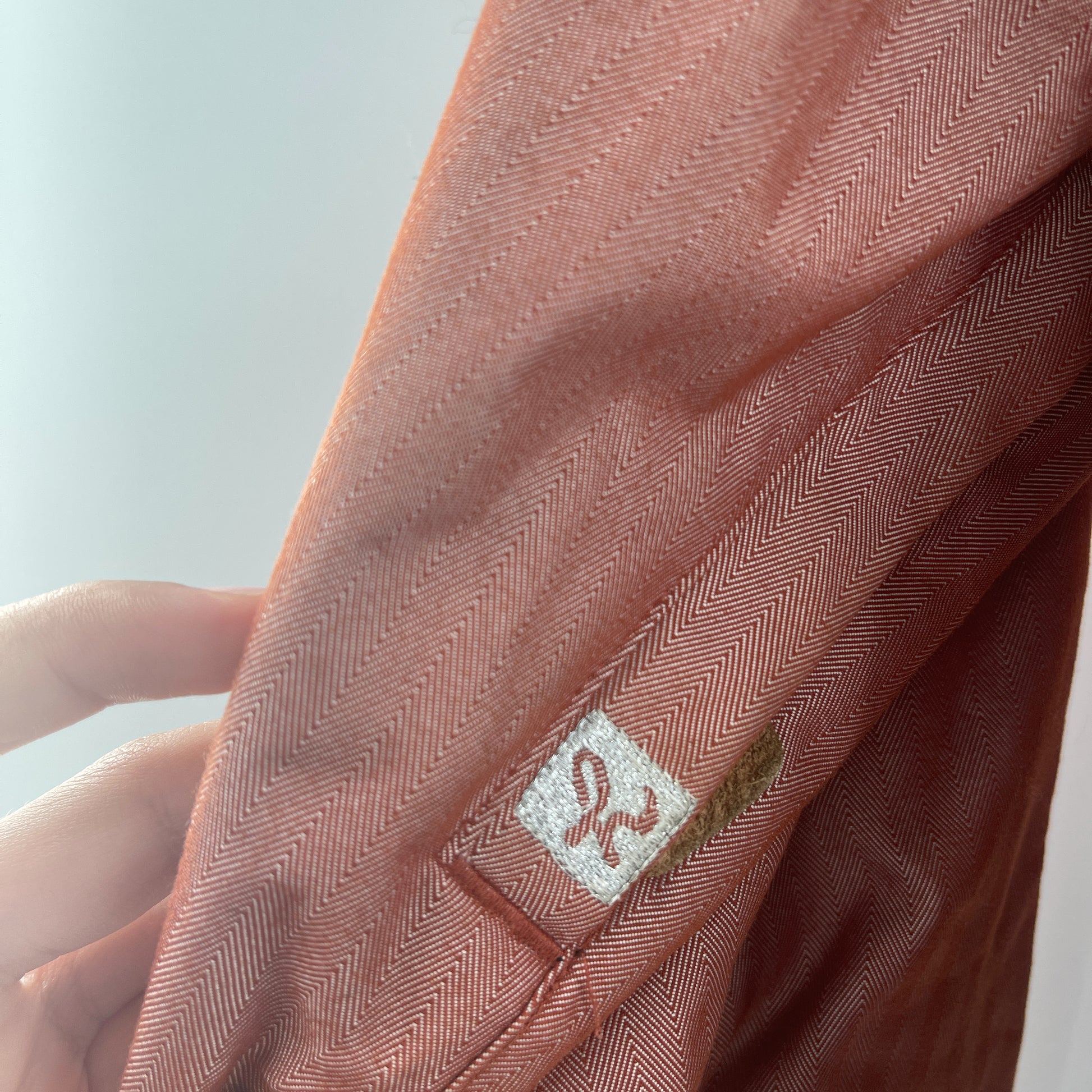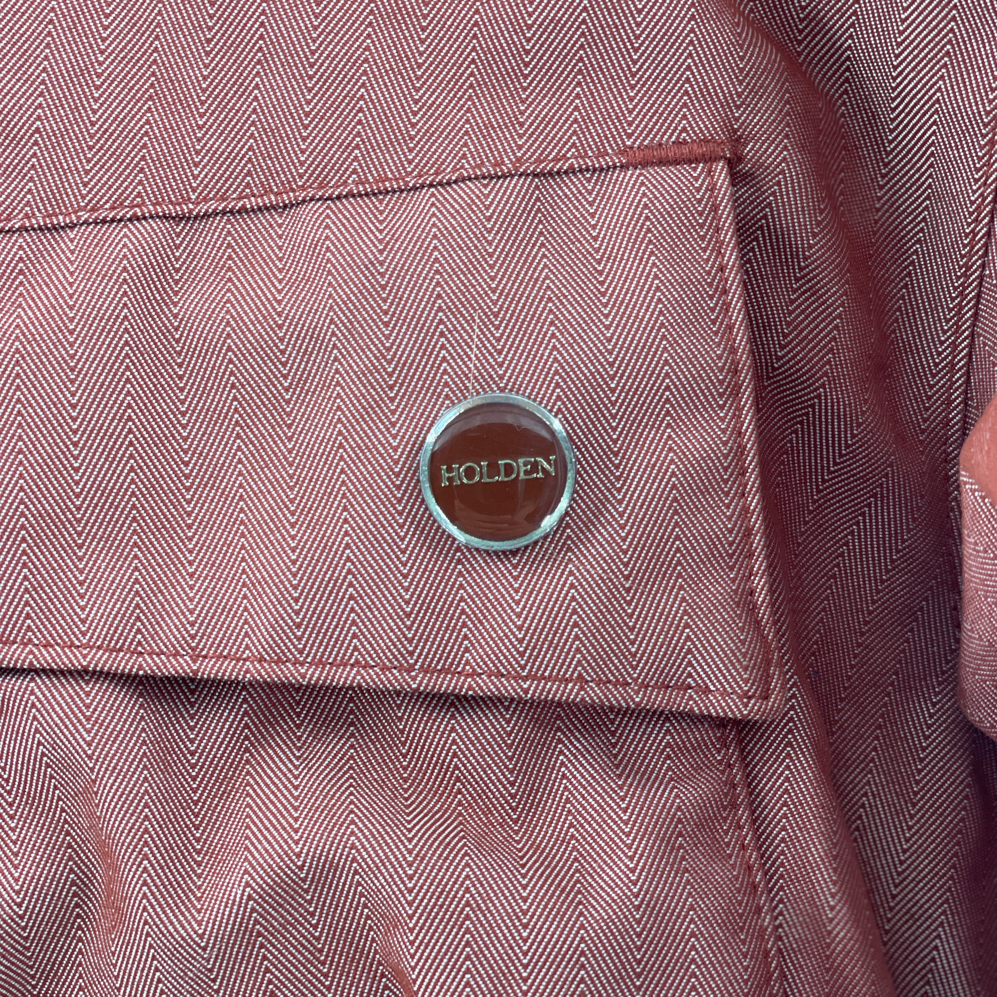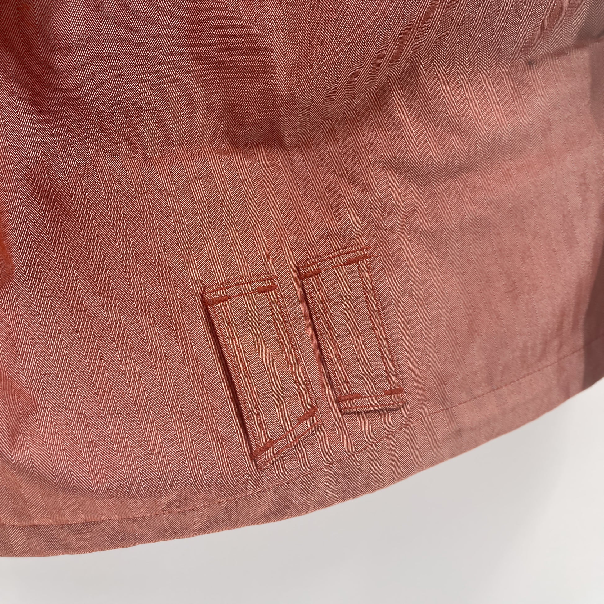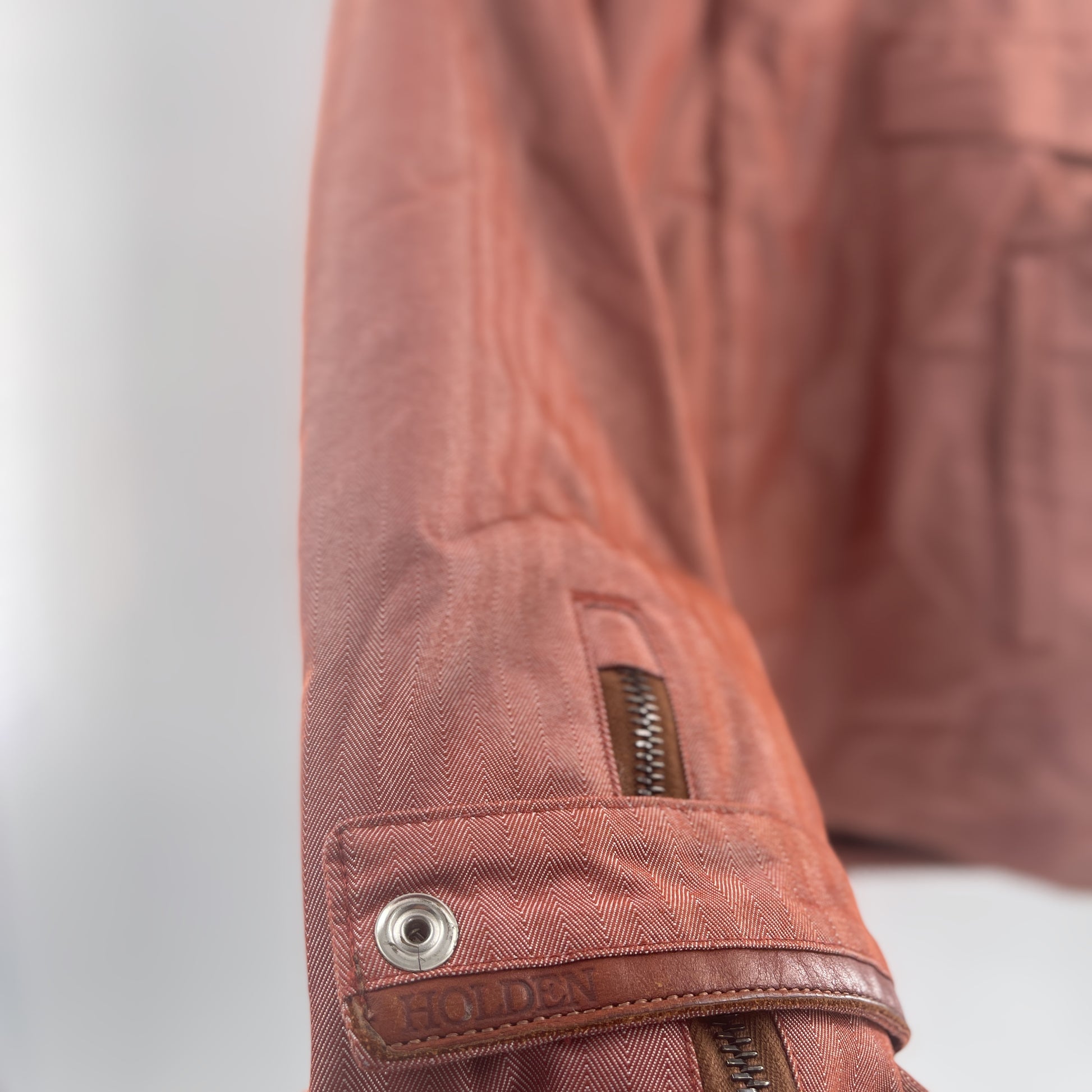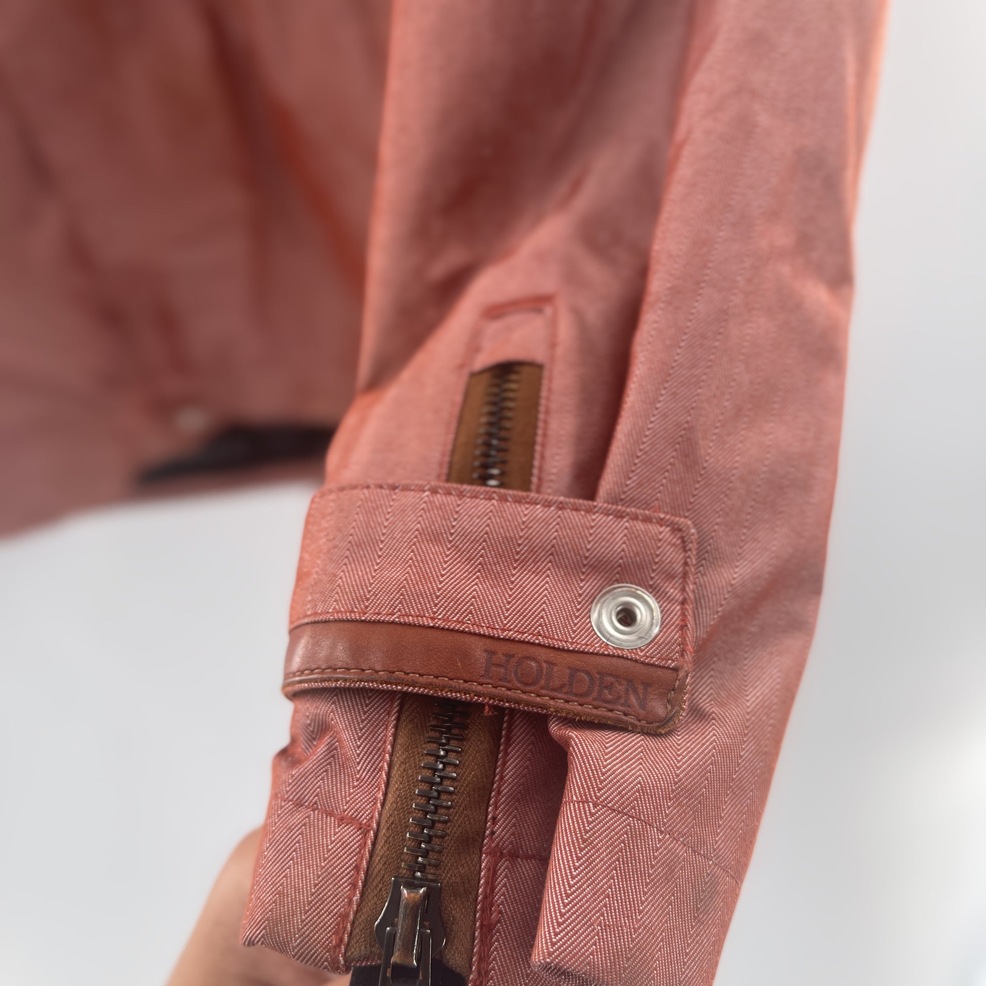 Holden salmon ski/snowboard Jacket with subtle herringbone pattern> Waterproof coating, Tons of technical features; zip front with snap and hook/loop fastening, zip and snap sleeves with internal thumbhole gaitor removable hood zip out waist gaitor,zipper to attach to snowpants in the back, drawstring bungee hood