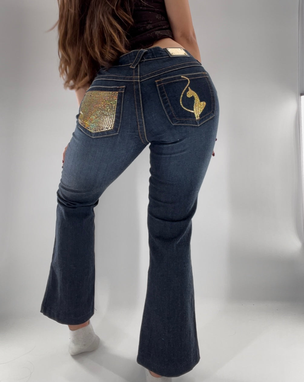 These baby phat kickflares have a dark wash, gold sequined pocket, iconic baby phat logo and gold metal jacron that’s still covered in plastic (Sz 3)