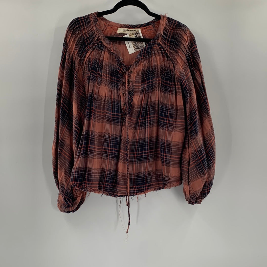 Free People salmon + navy plaid prairie top with pleated neckline, tie front detail, raw hem, and cuffed bishop sleeves