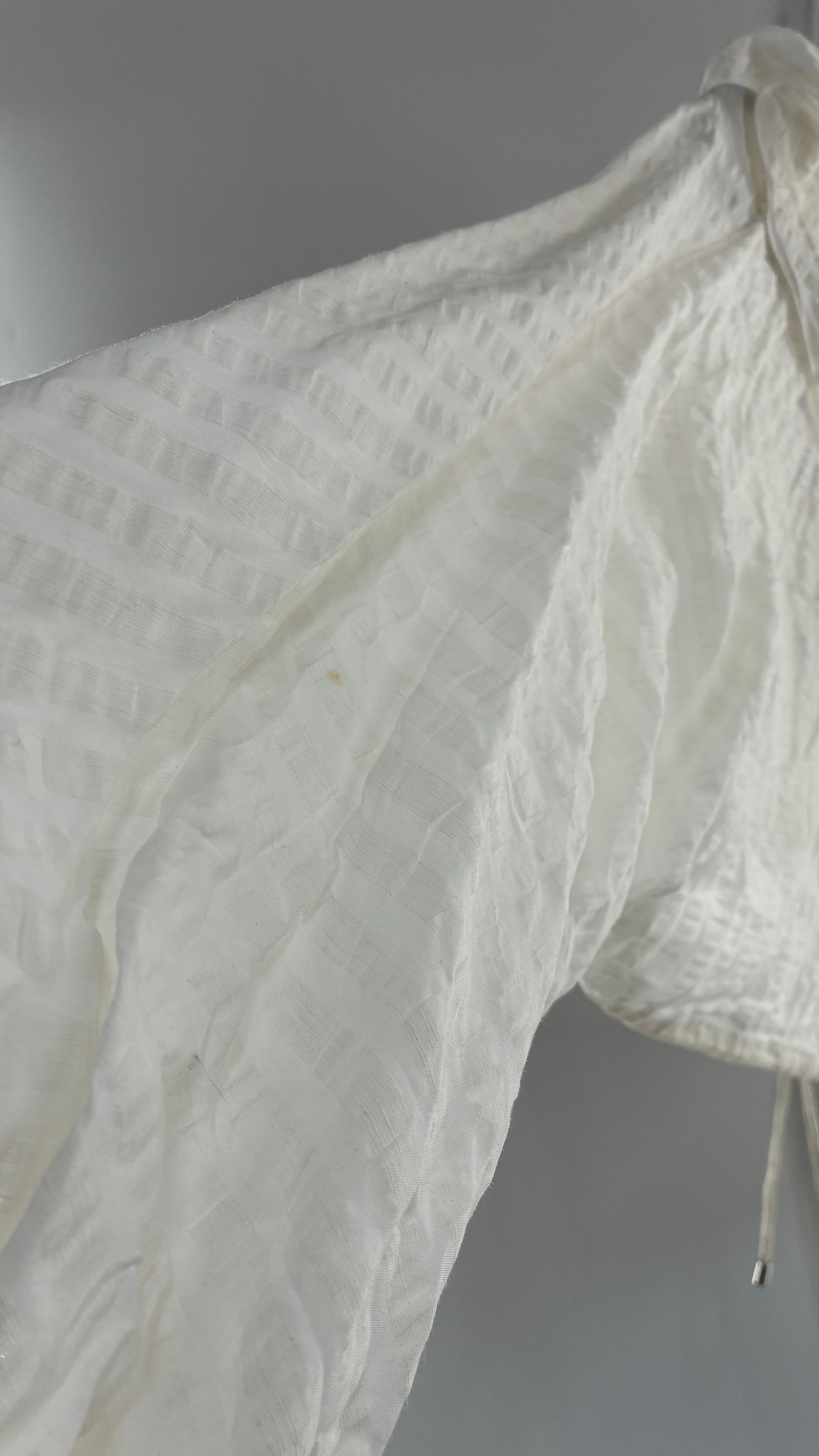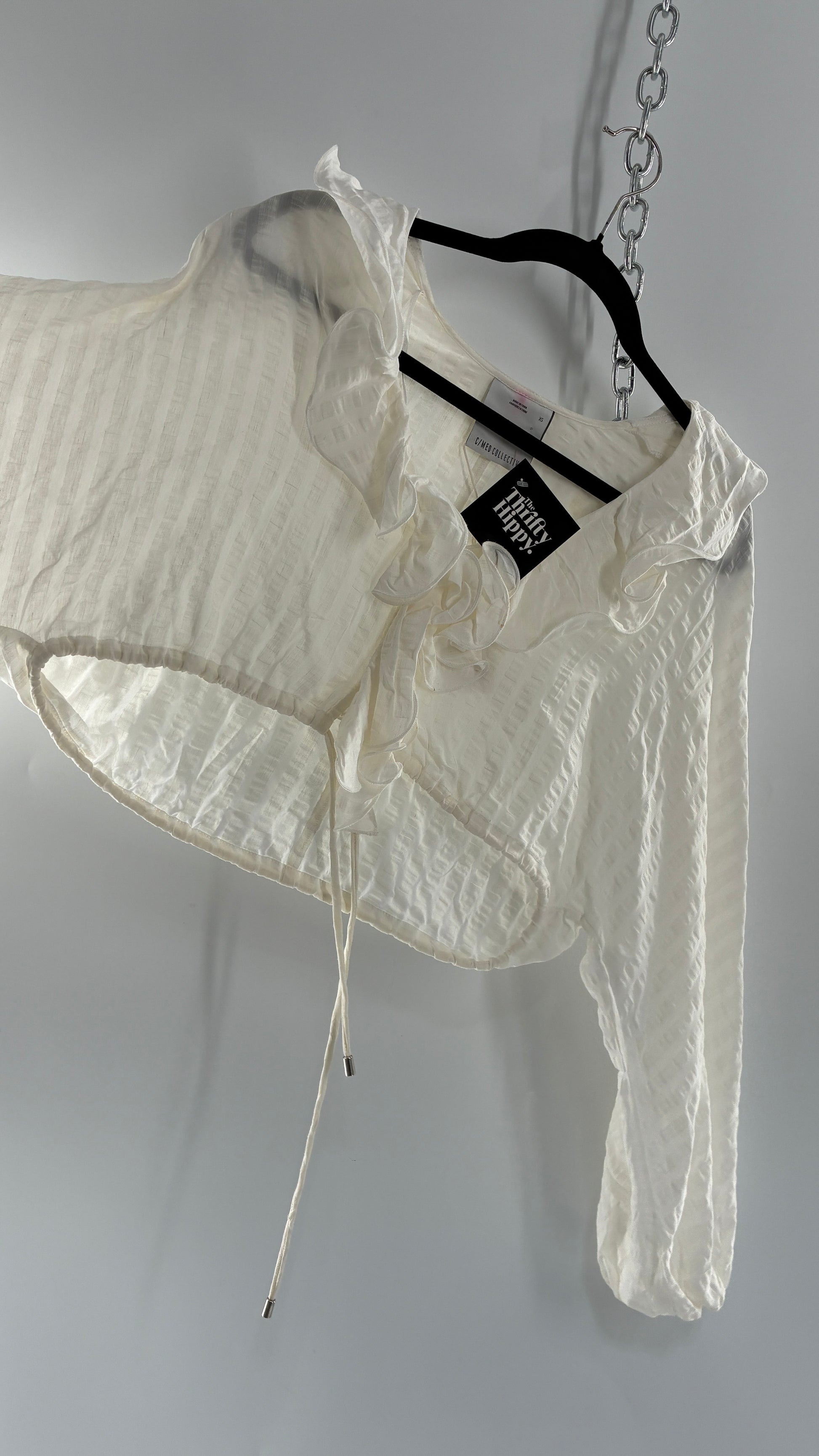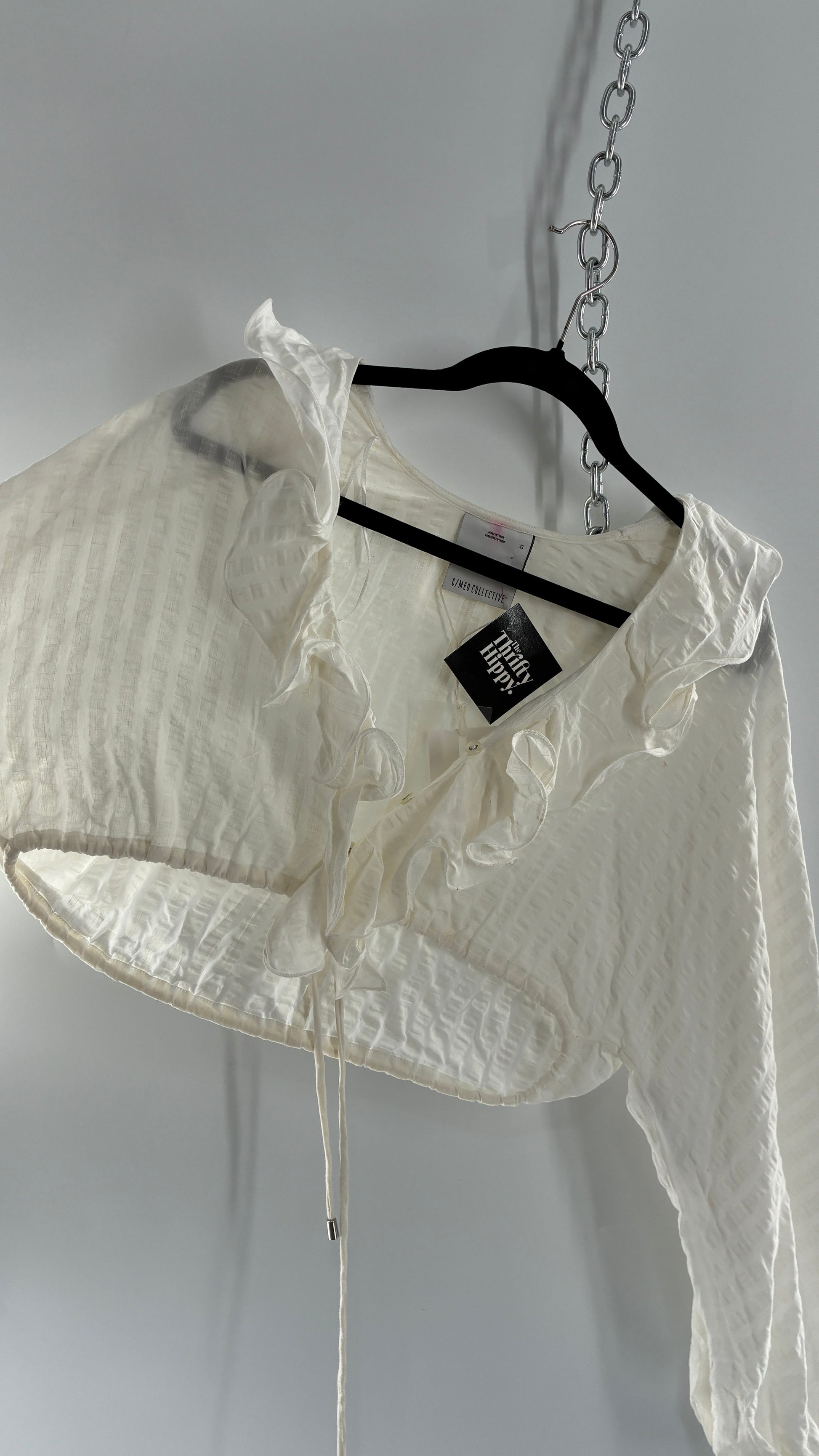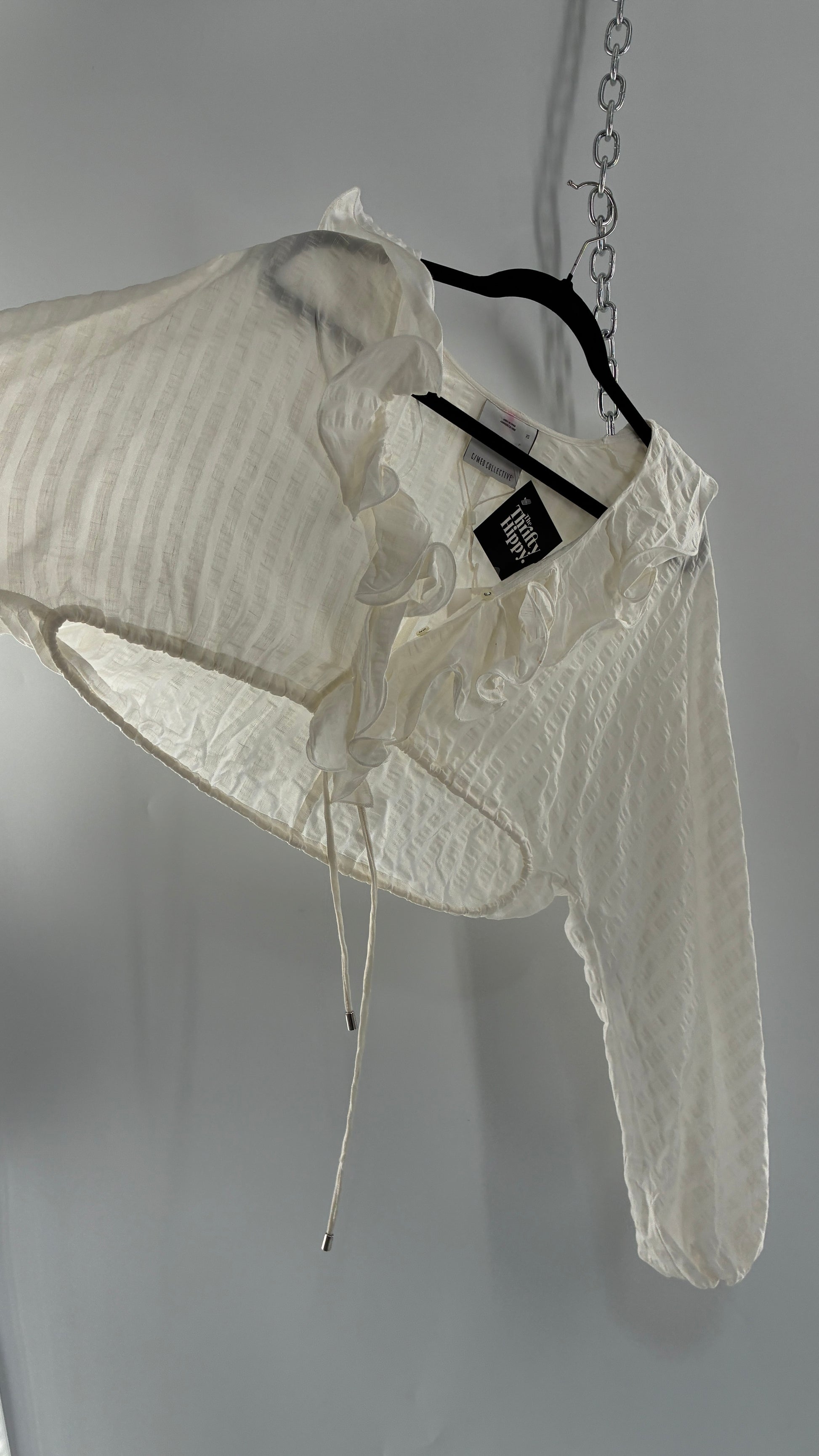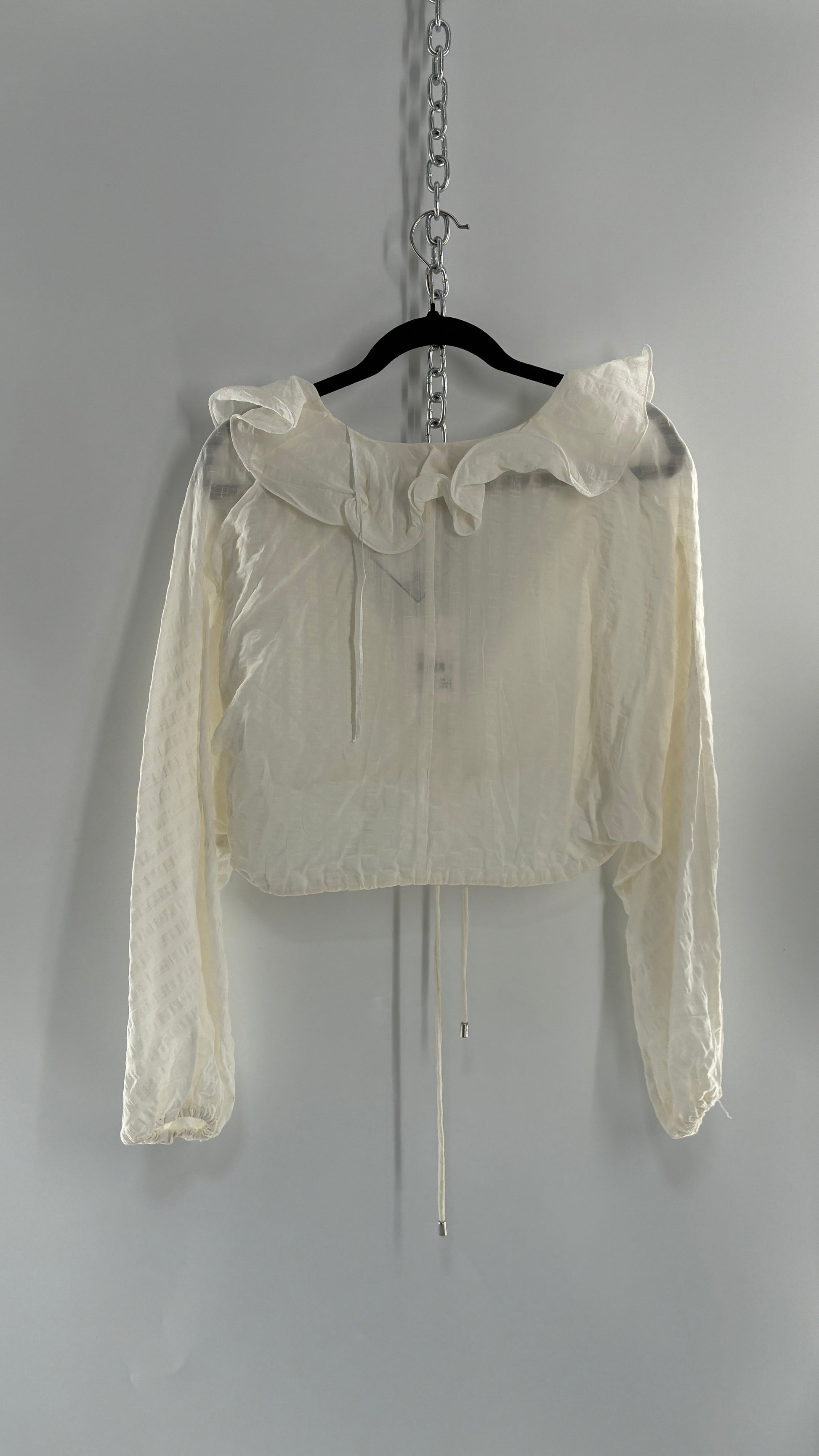 CMEO Collective White Balloon Sleeve Blouse with Ruffled, Button Up Neckline and Adjustable Drawstring Waist (XS 0-2)