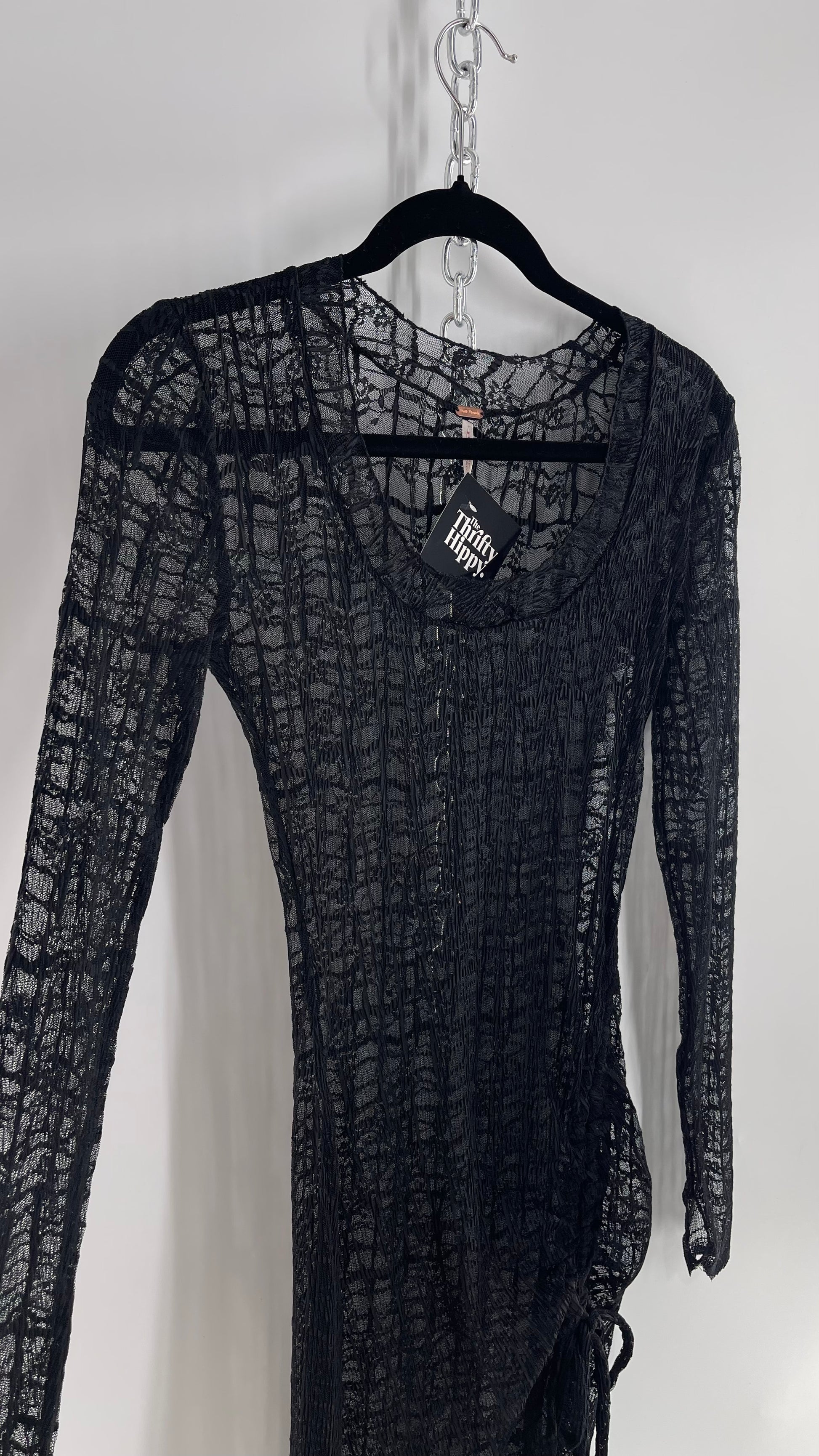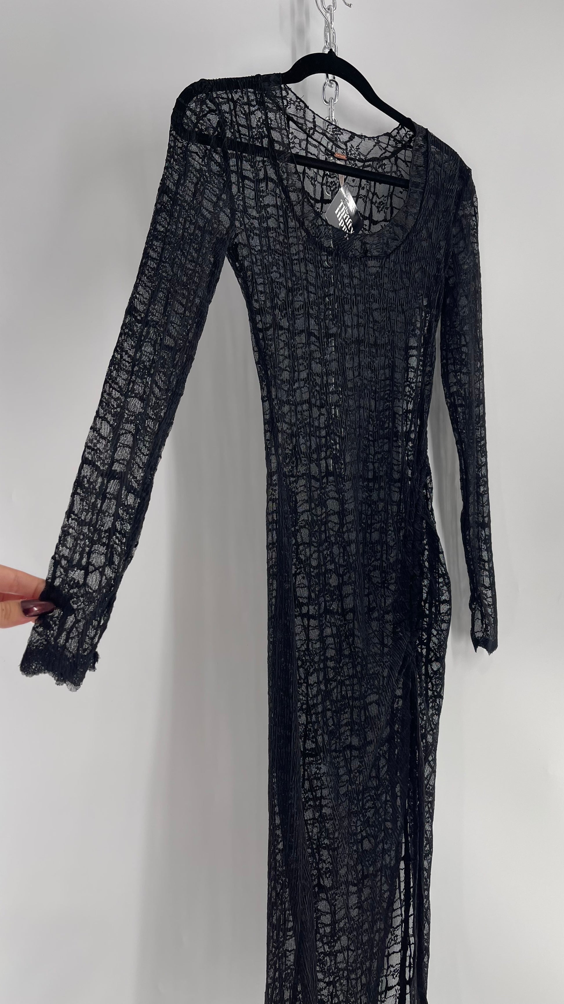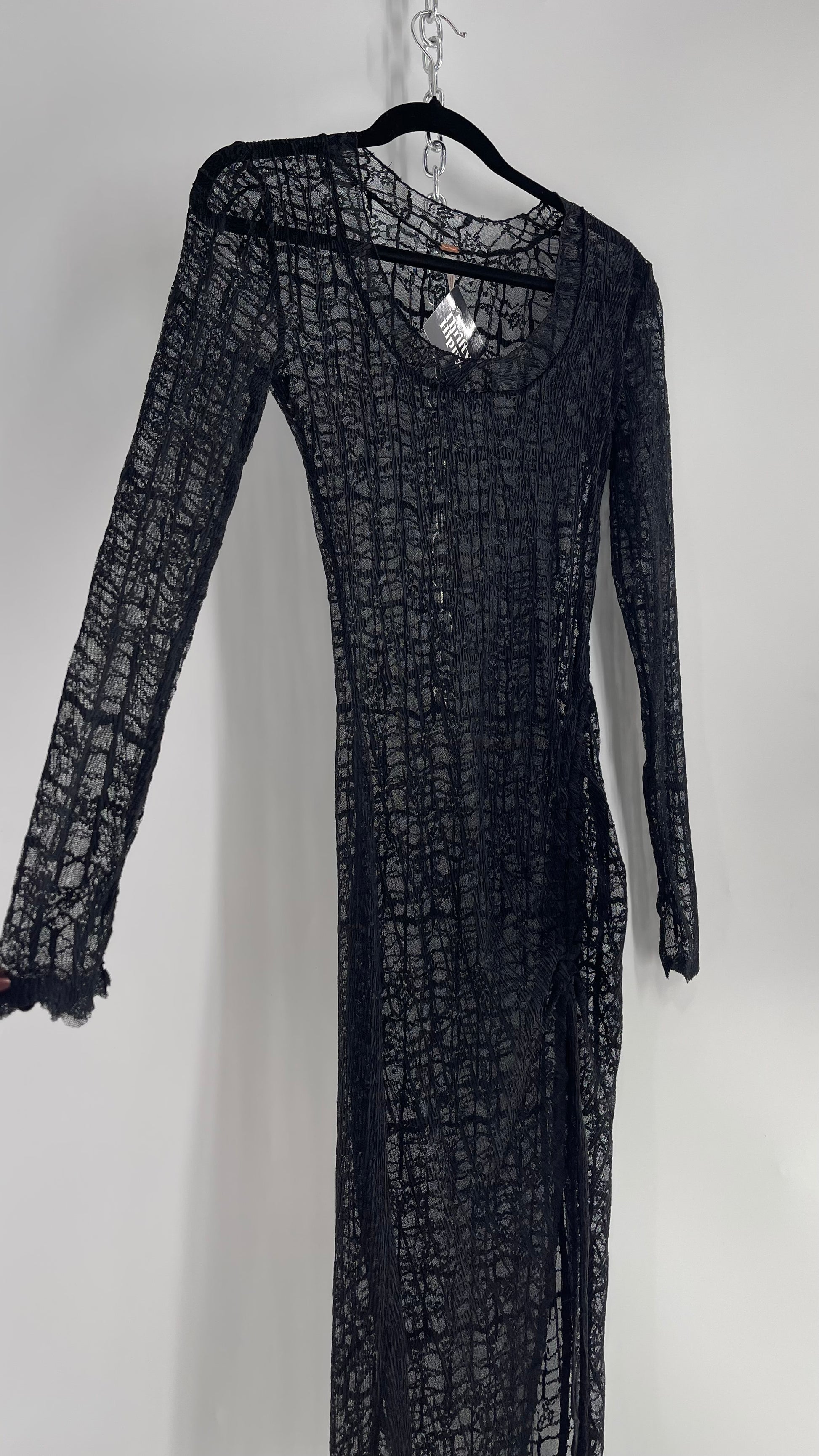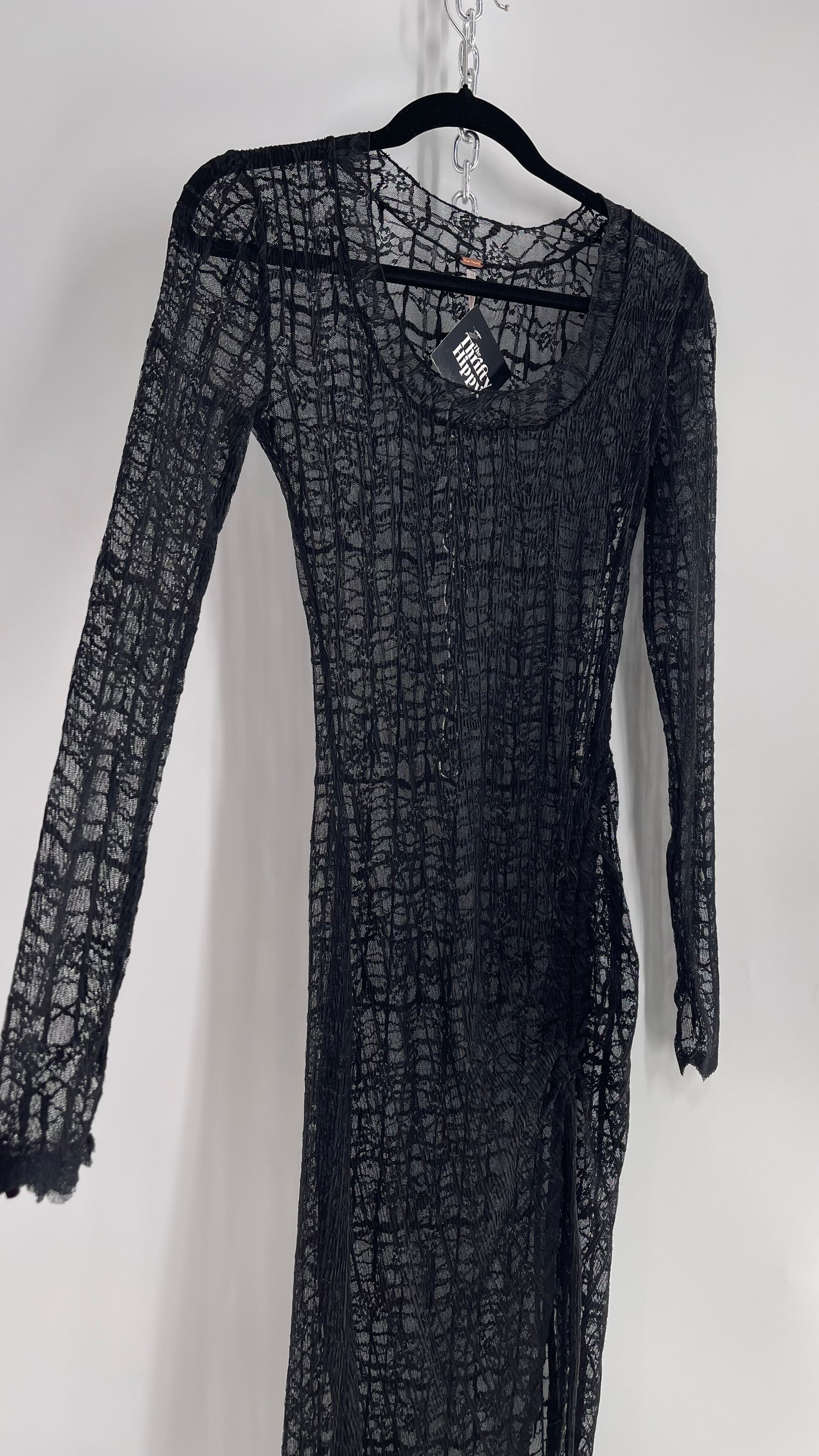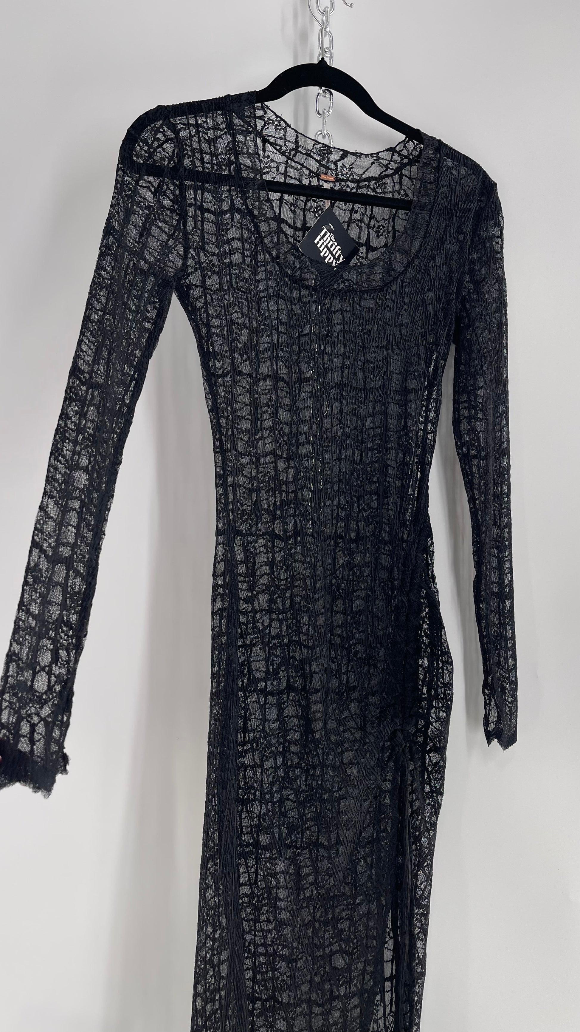 Free People Black Sheer Crimped Lace Long Sleeve Maxi with Ruched Slit (XS)