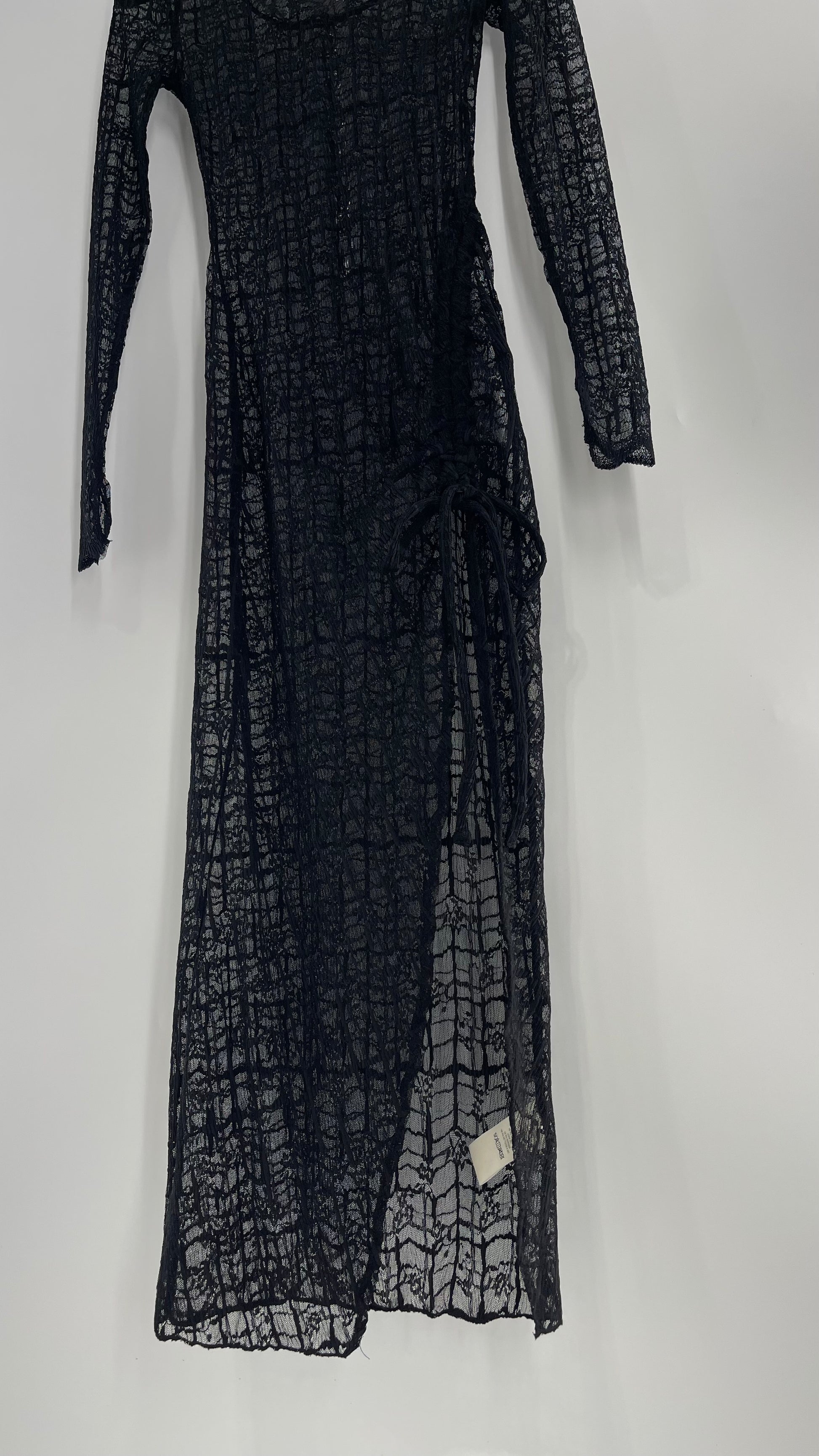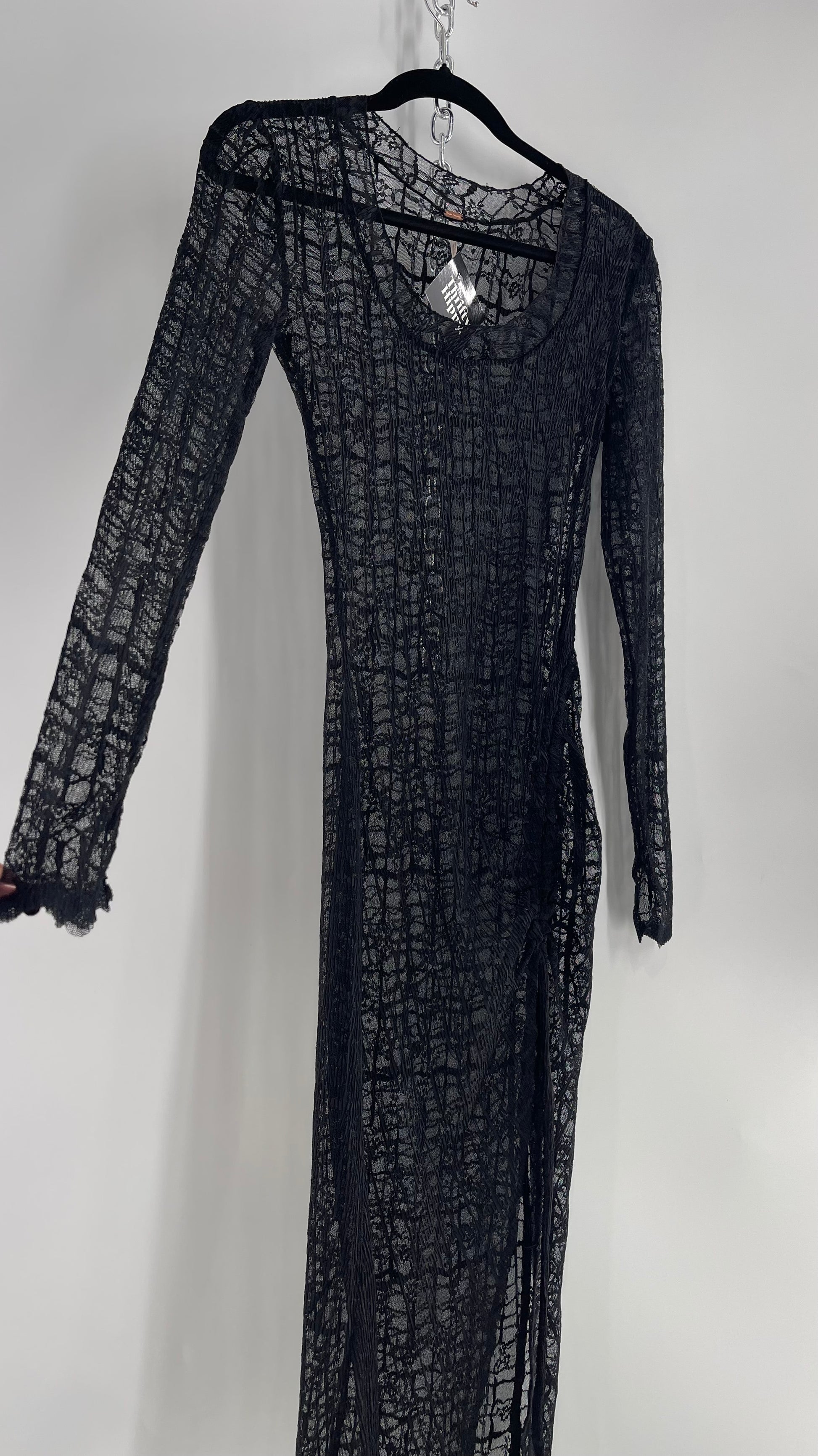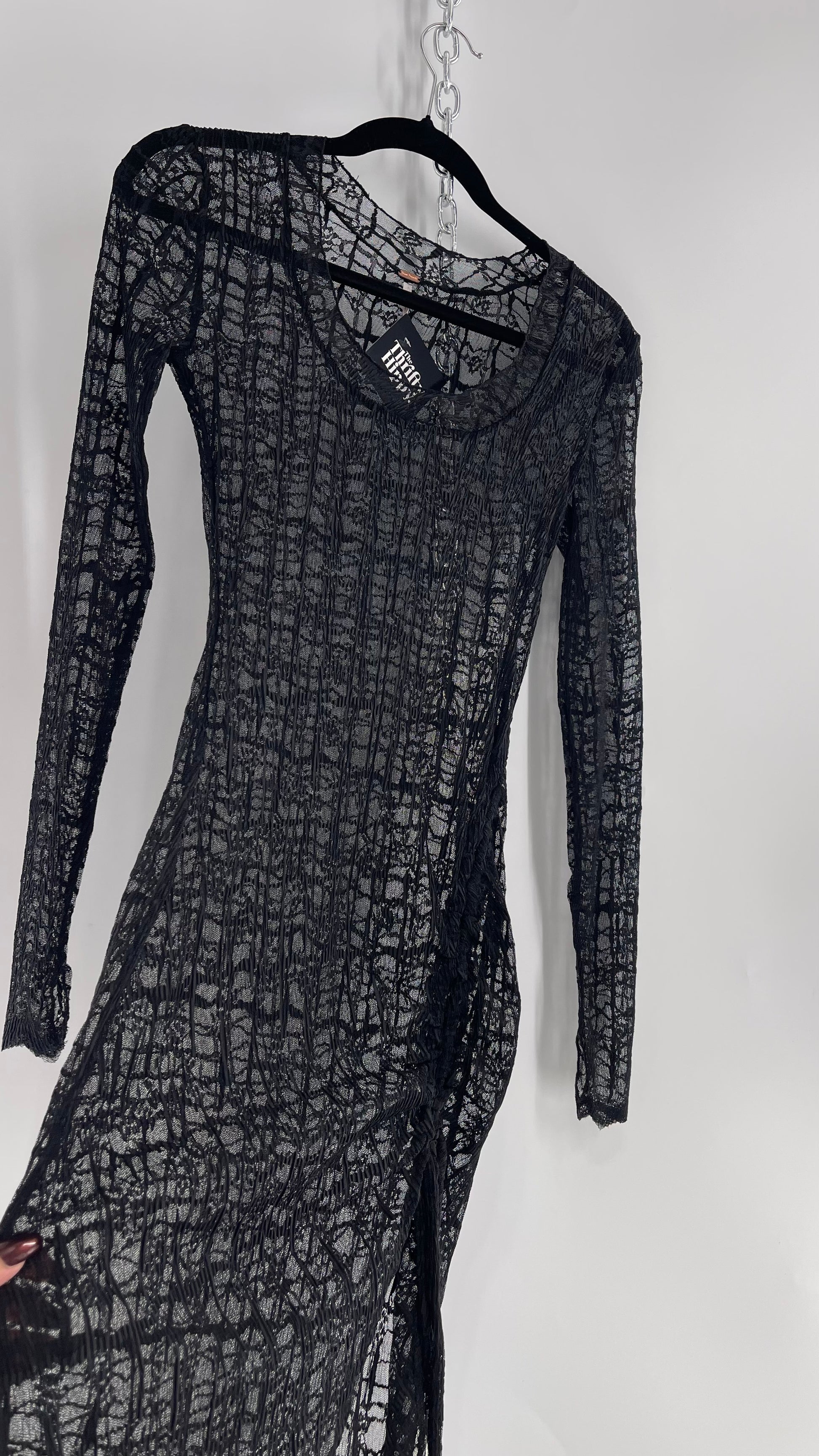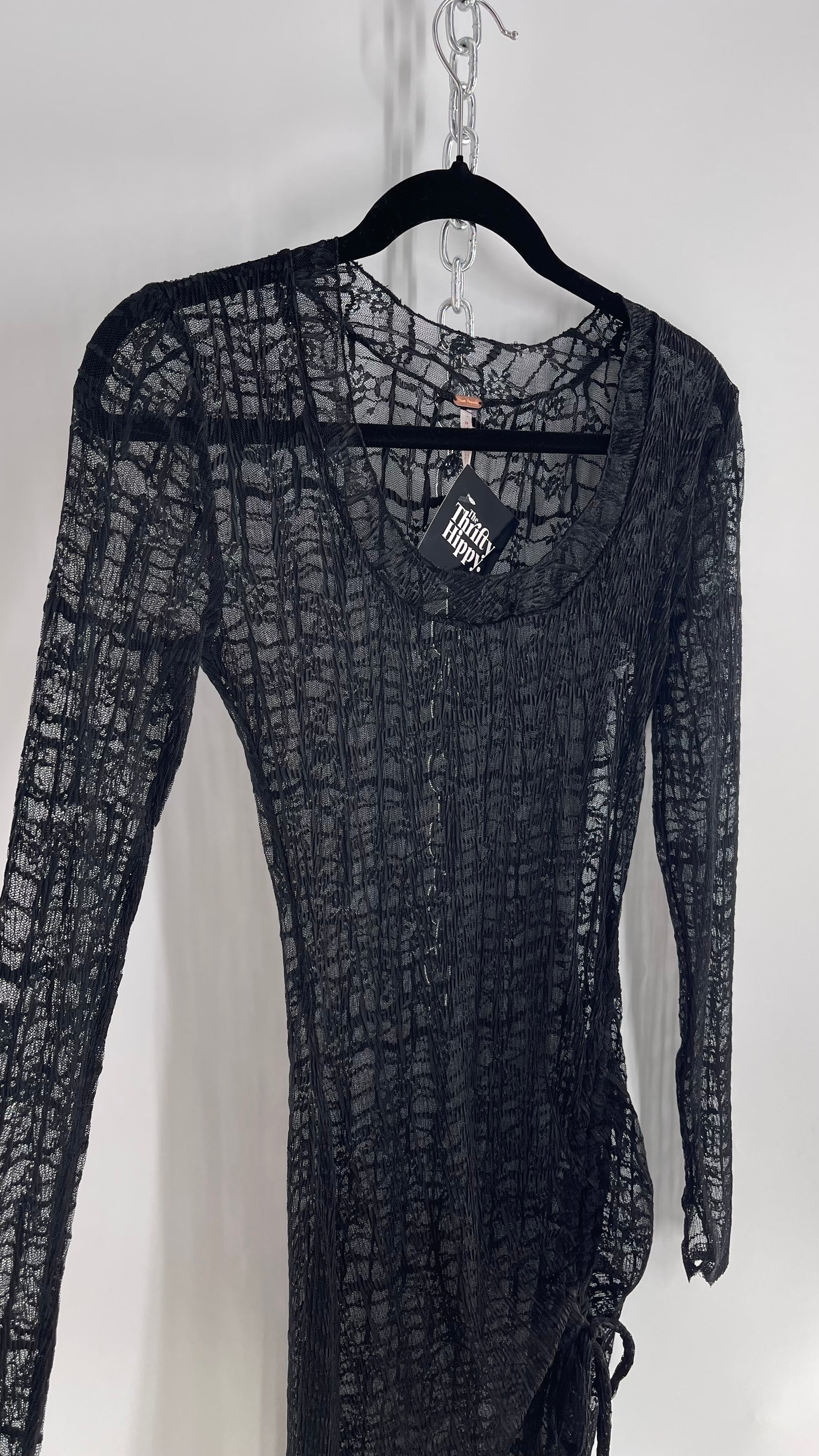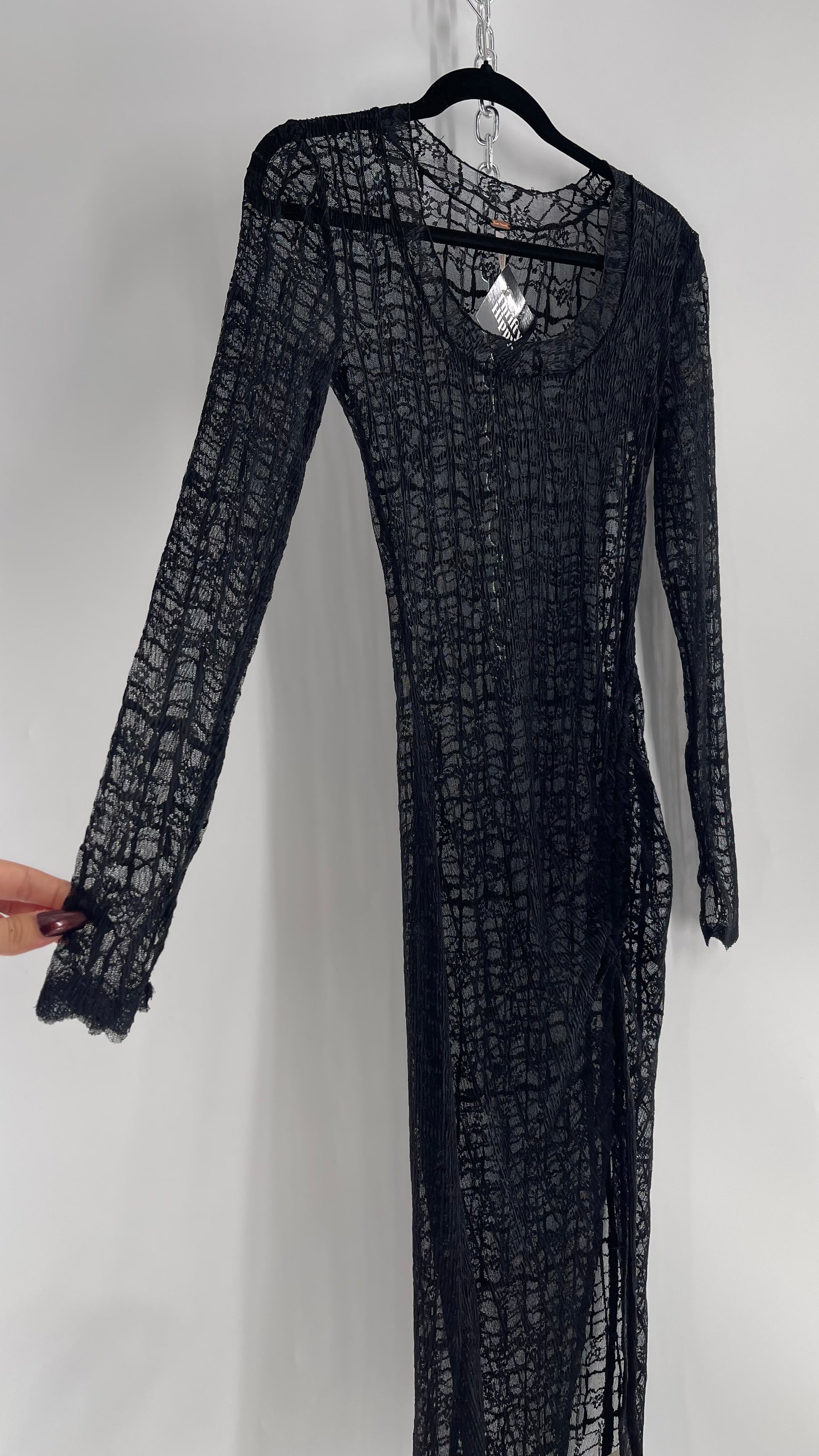 Free People Black Sheer Crimped Lace Long Sleeve Maxi with Ruched Slit (XS)