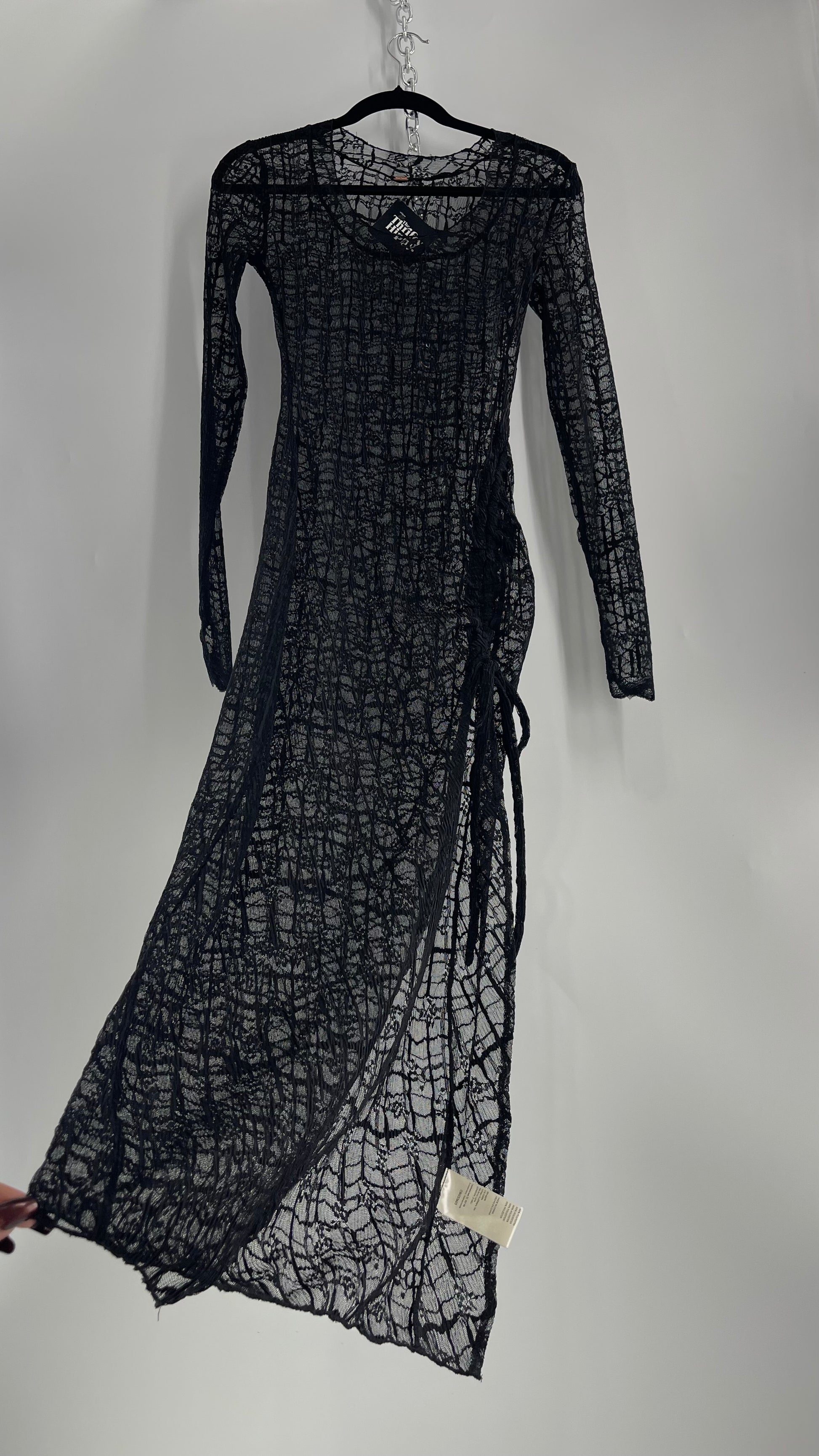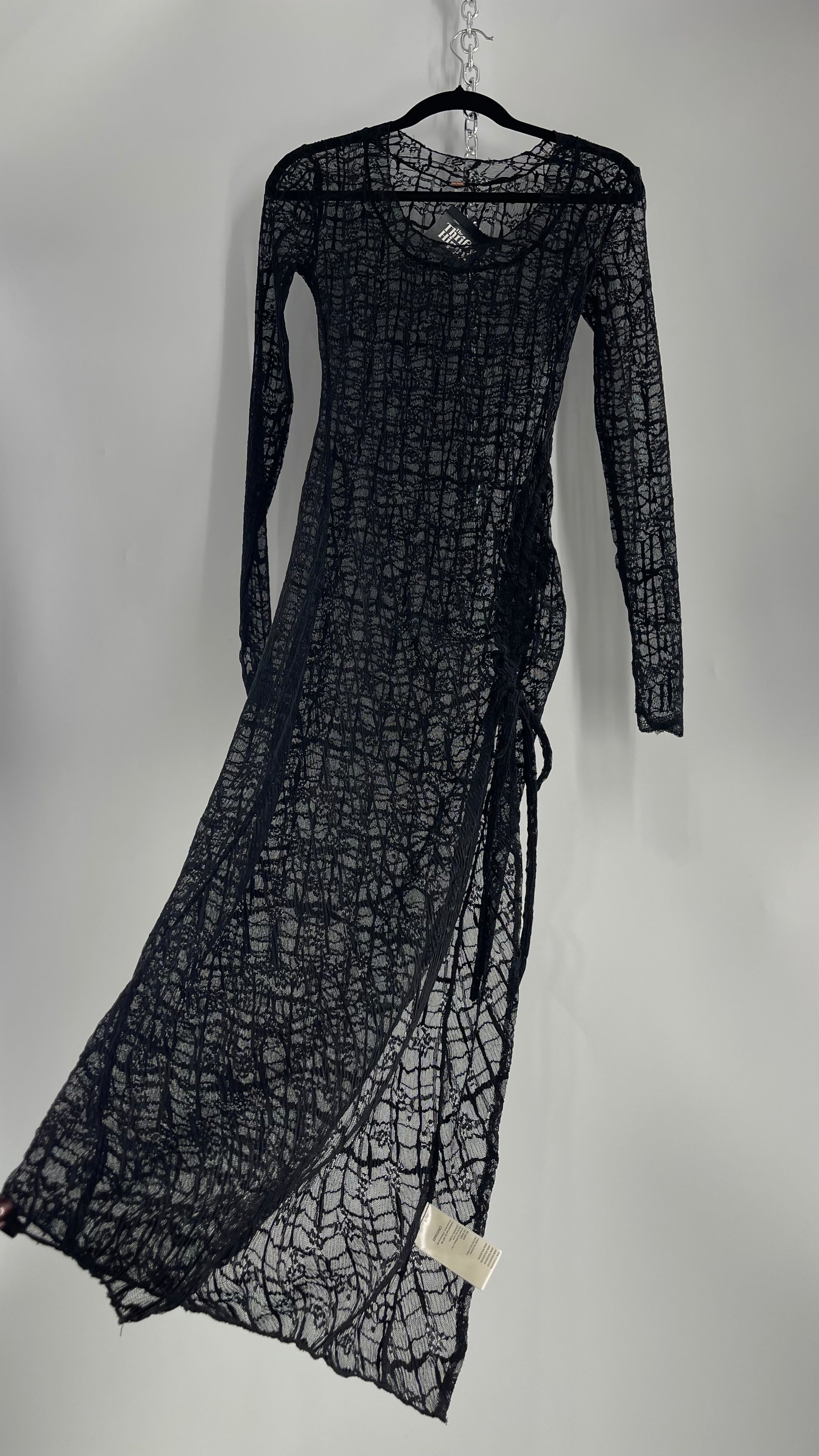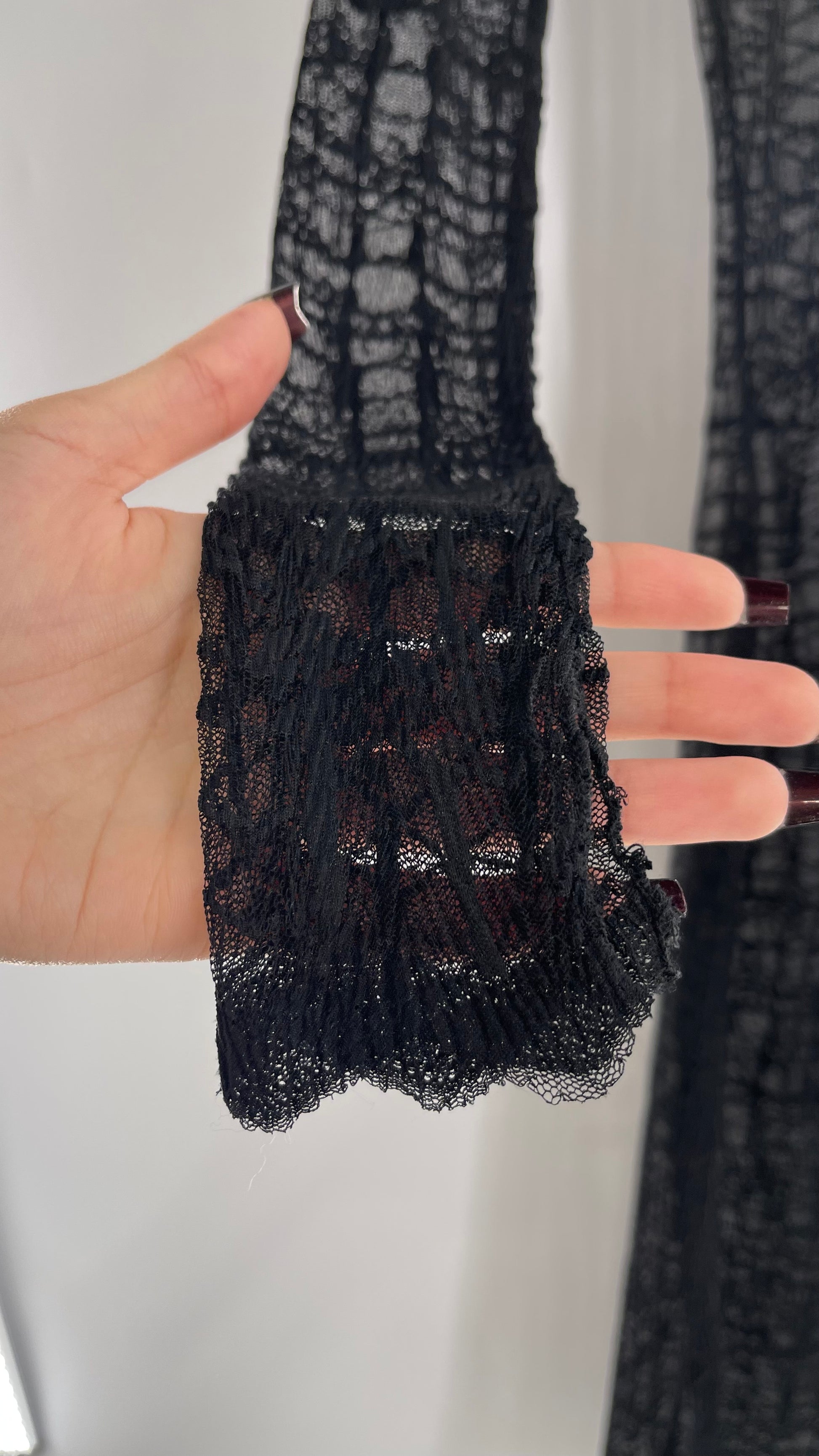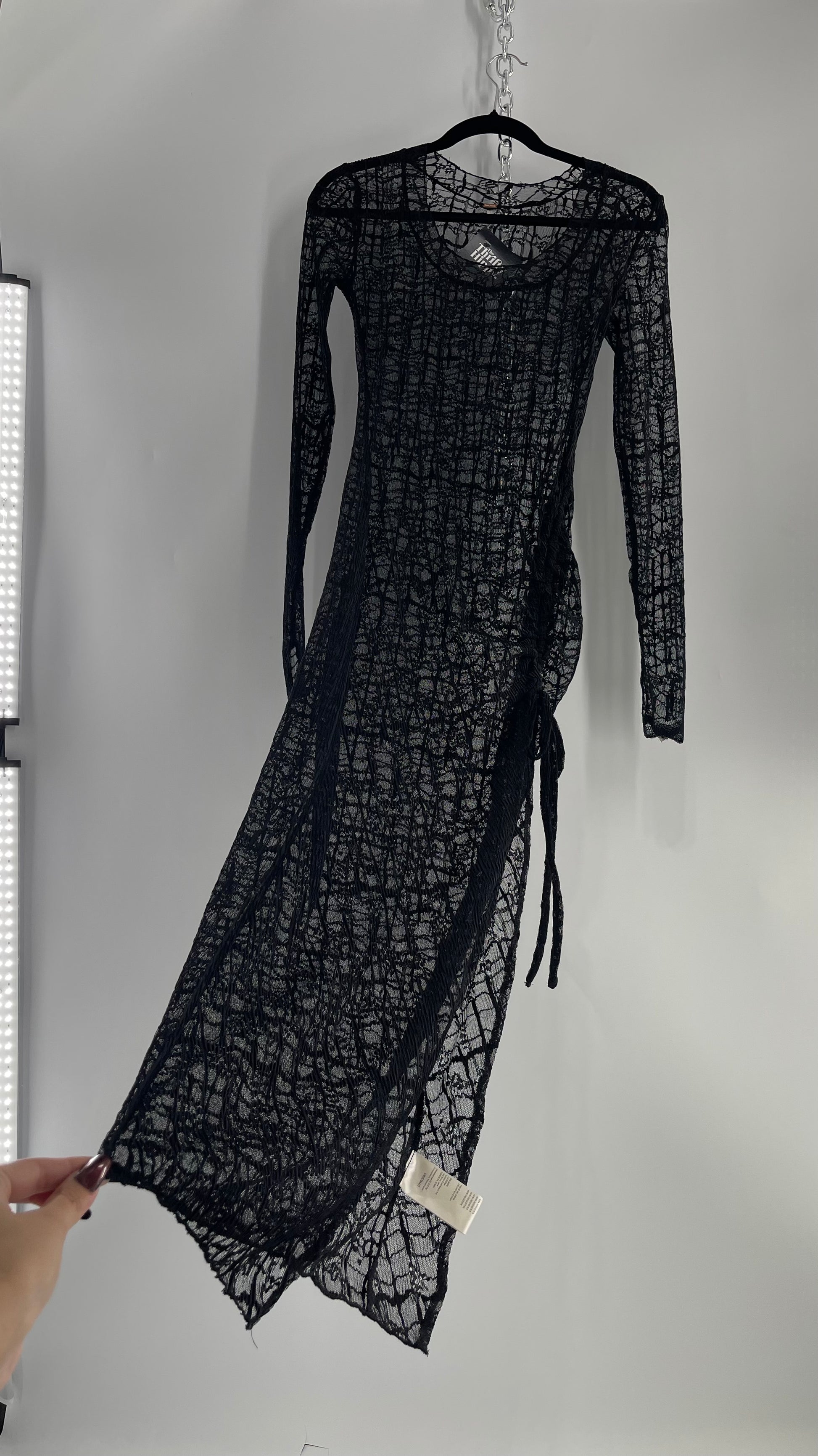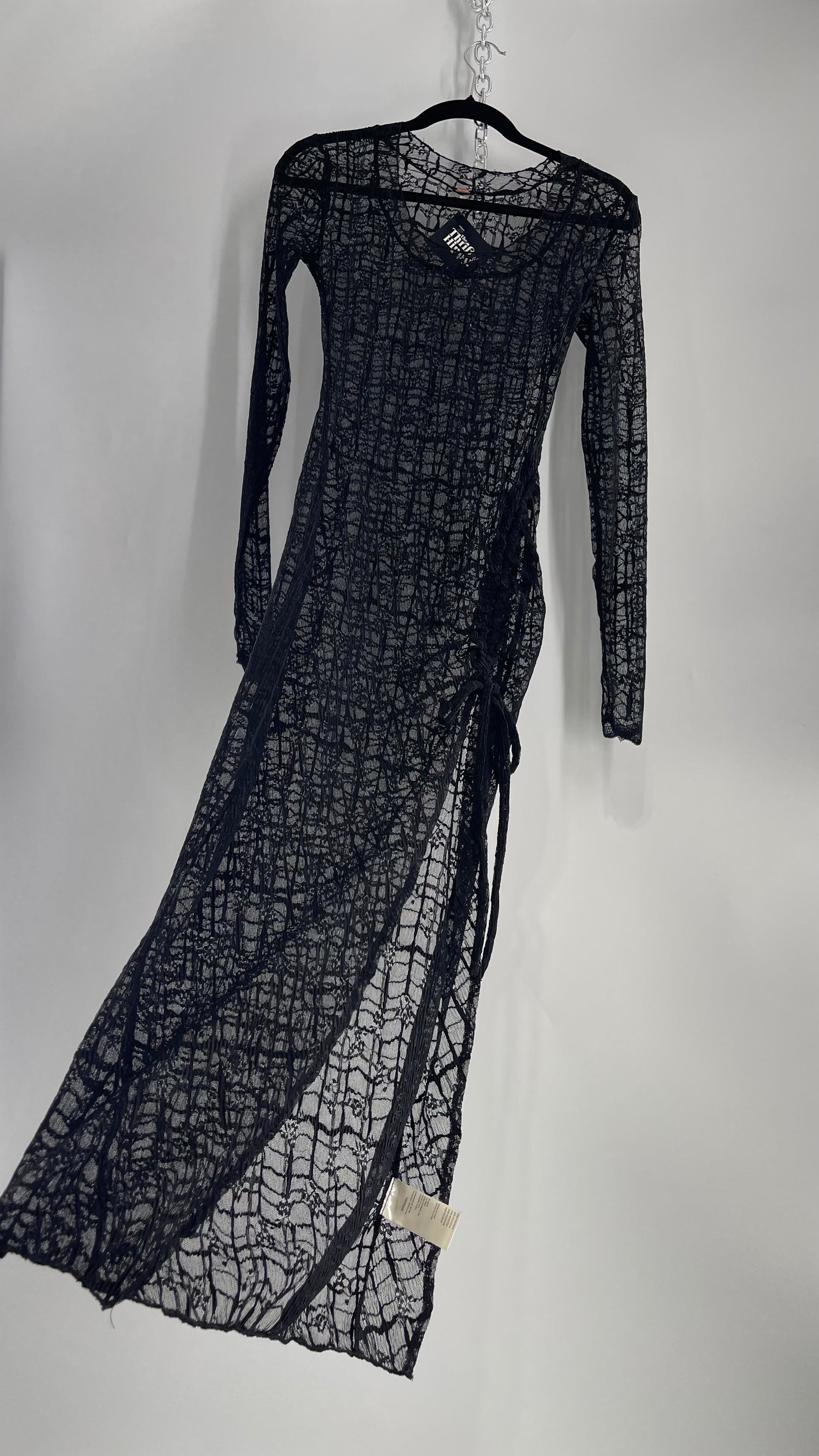 Free People Black Sheer Crimped Lace Long Sleeve Maxi with Ruched Slit (XS)