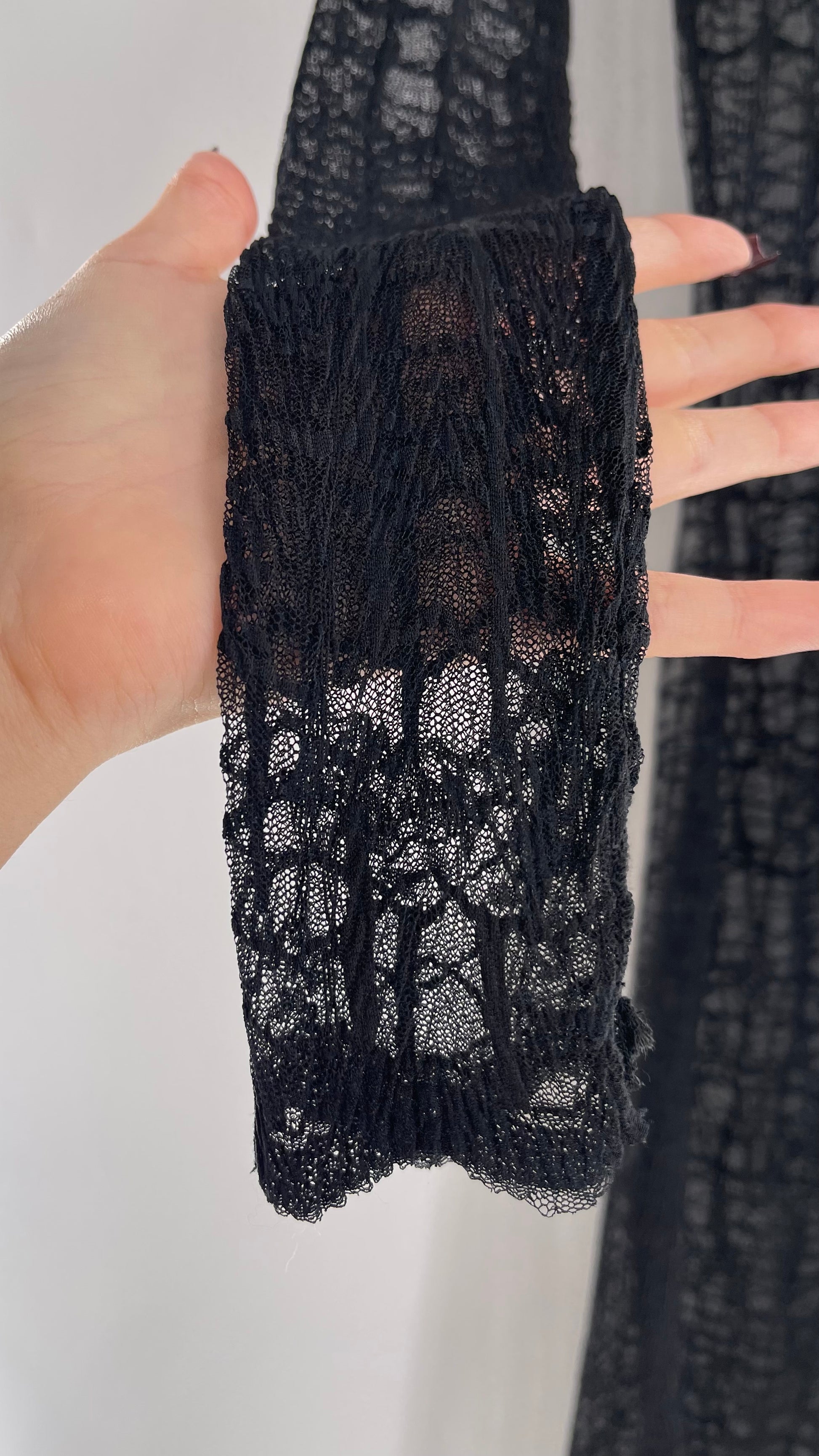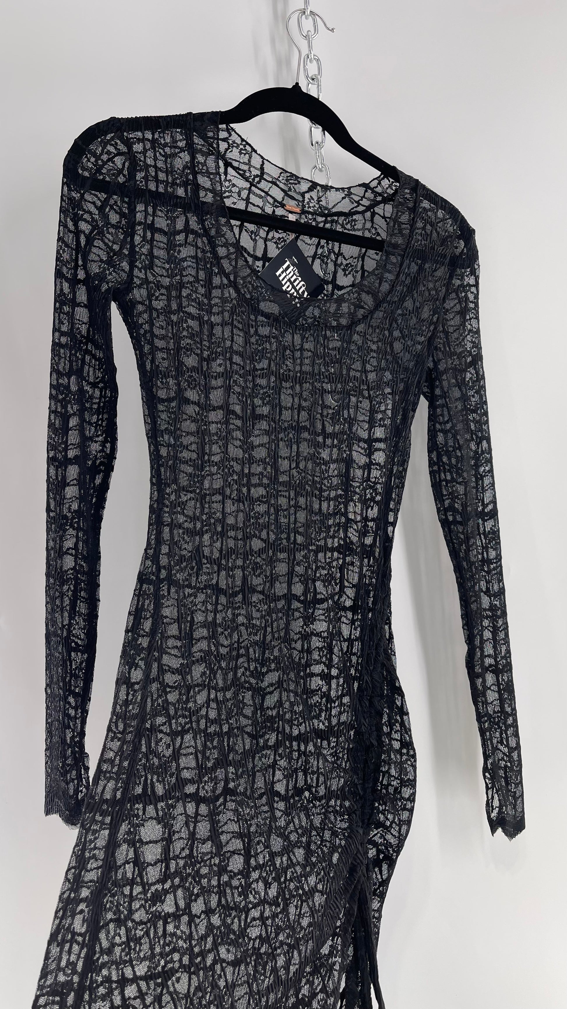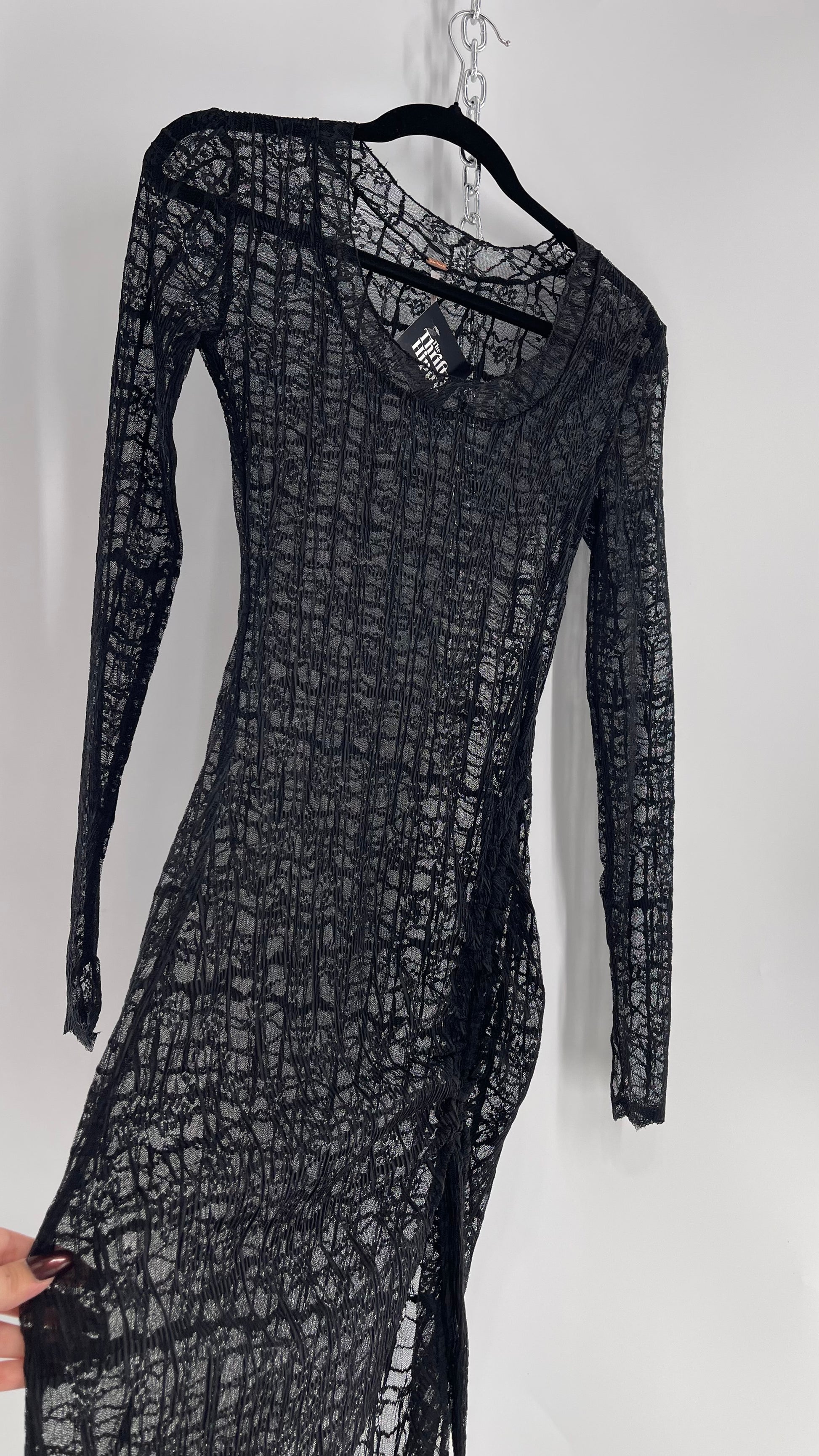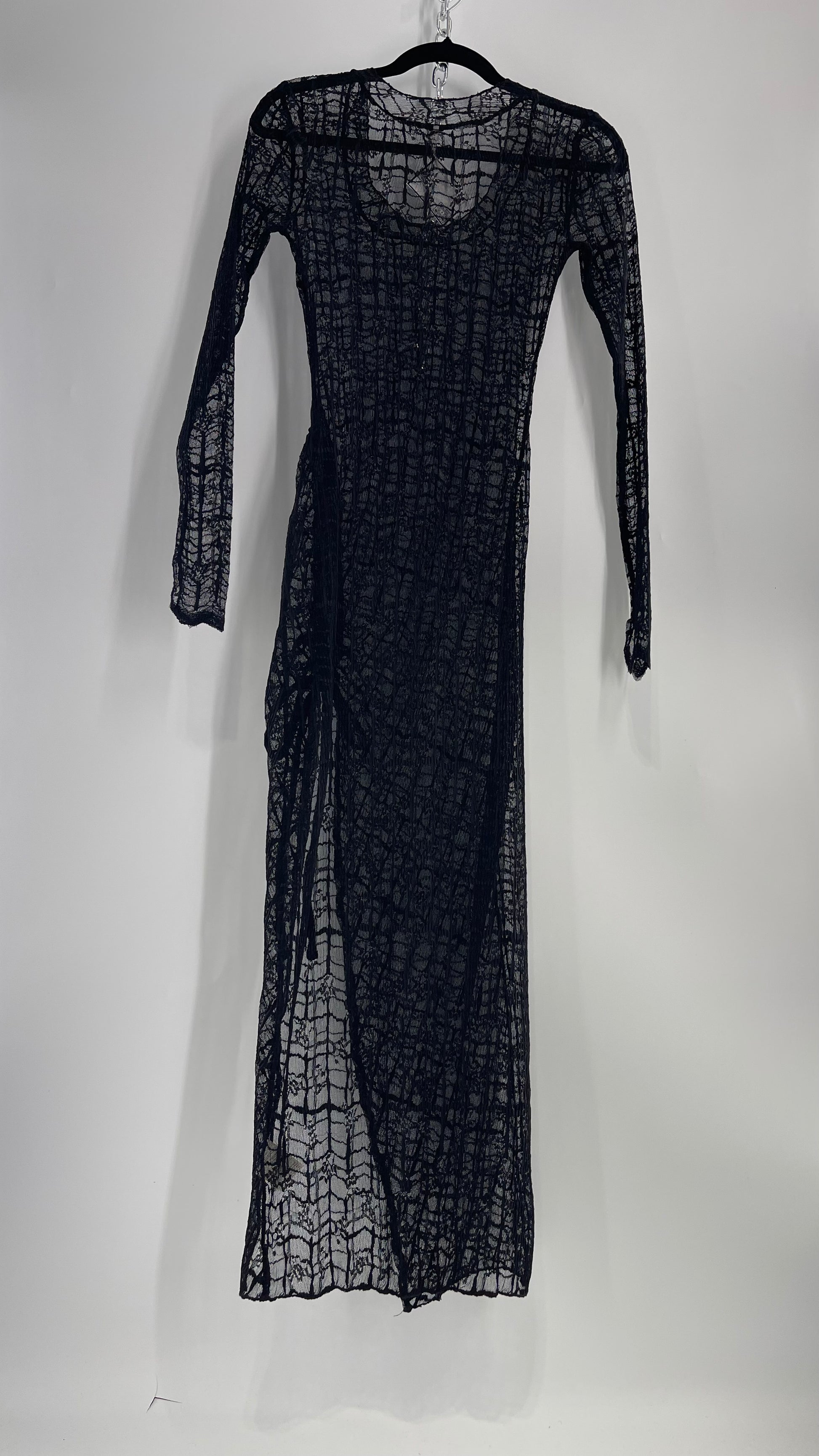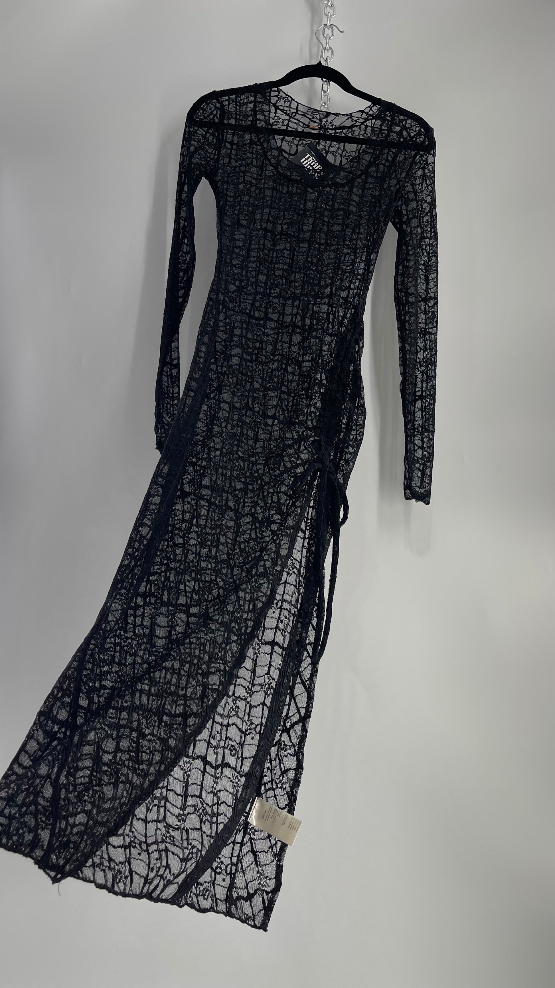 Free People Black Sheer Crimped Lace Long Sleeve Maxi with Ruched Slit (XS)