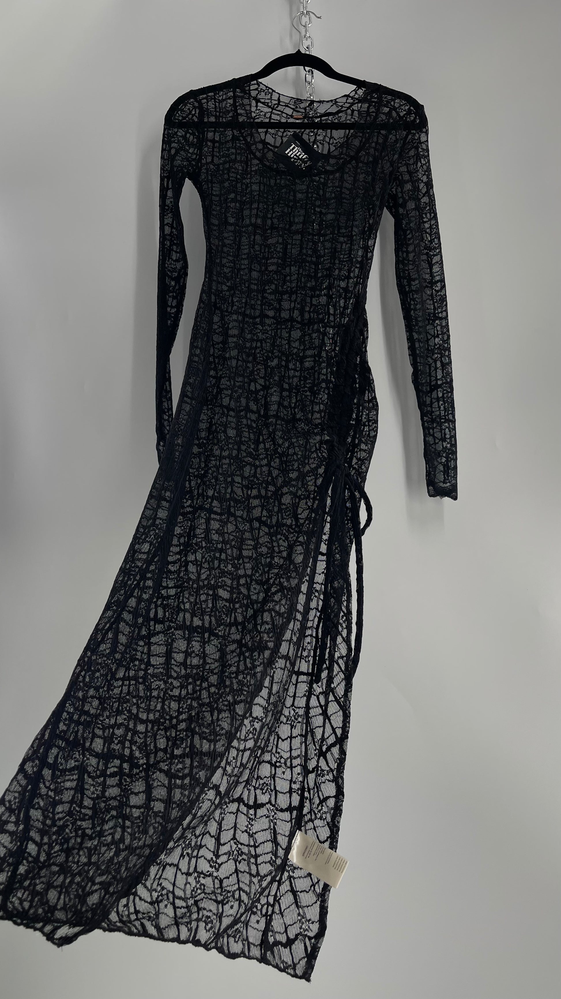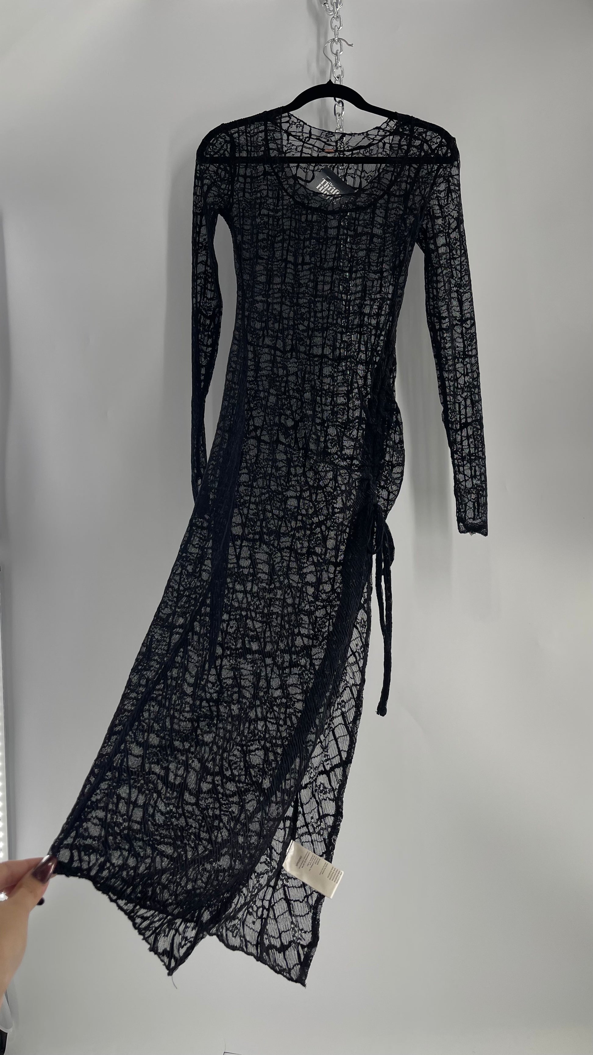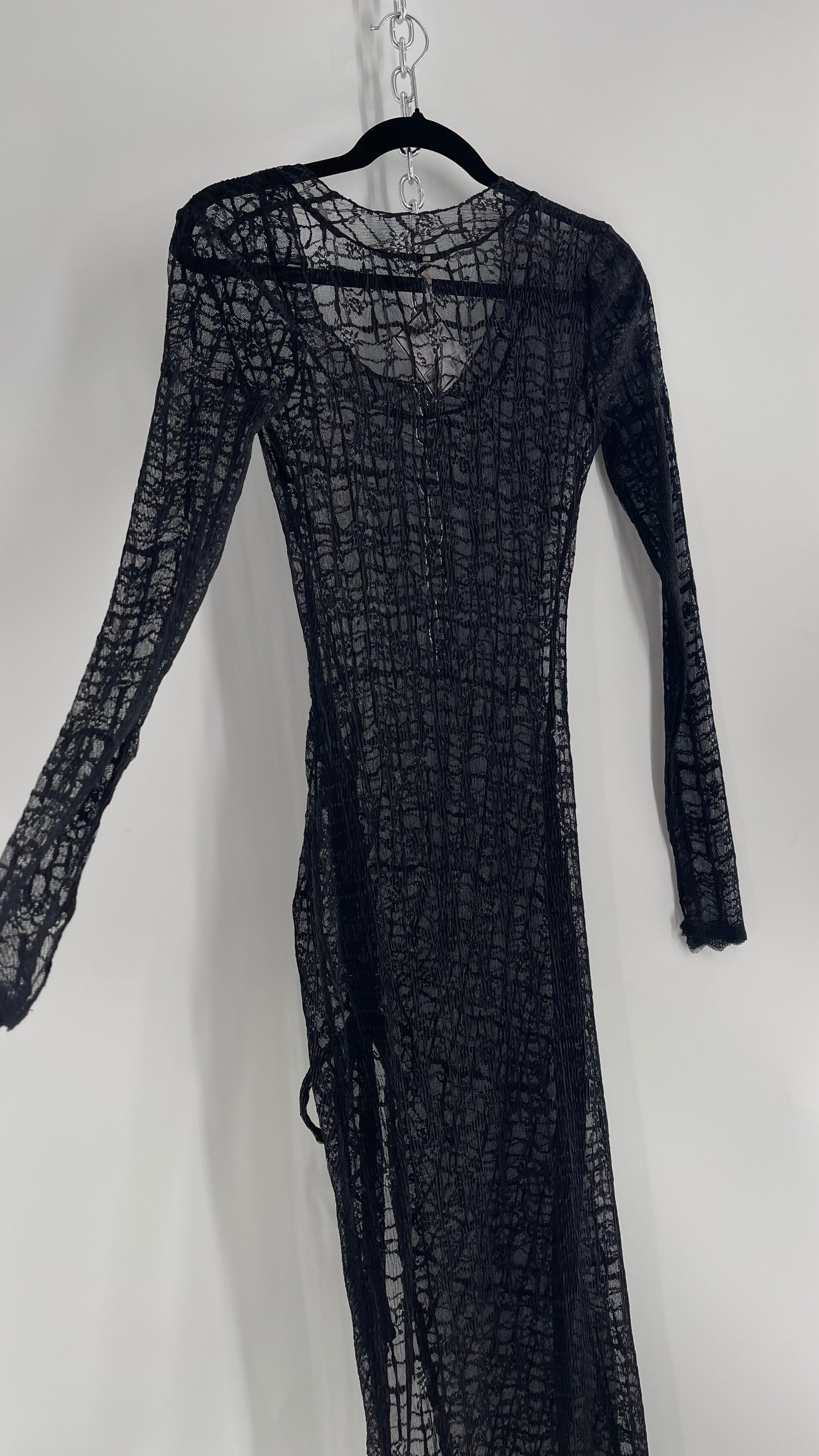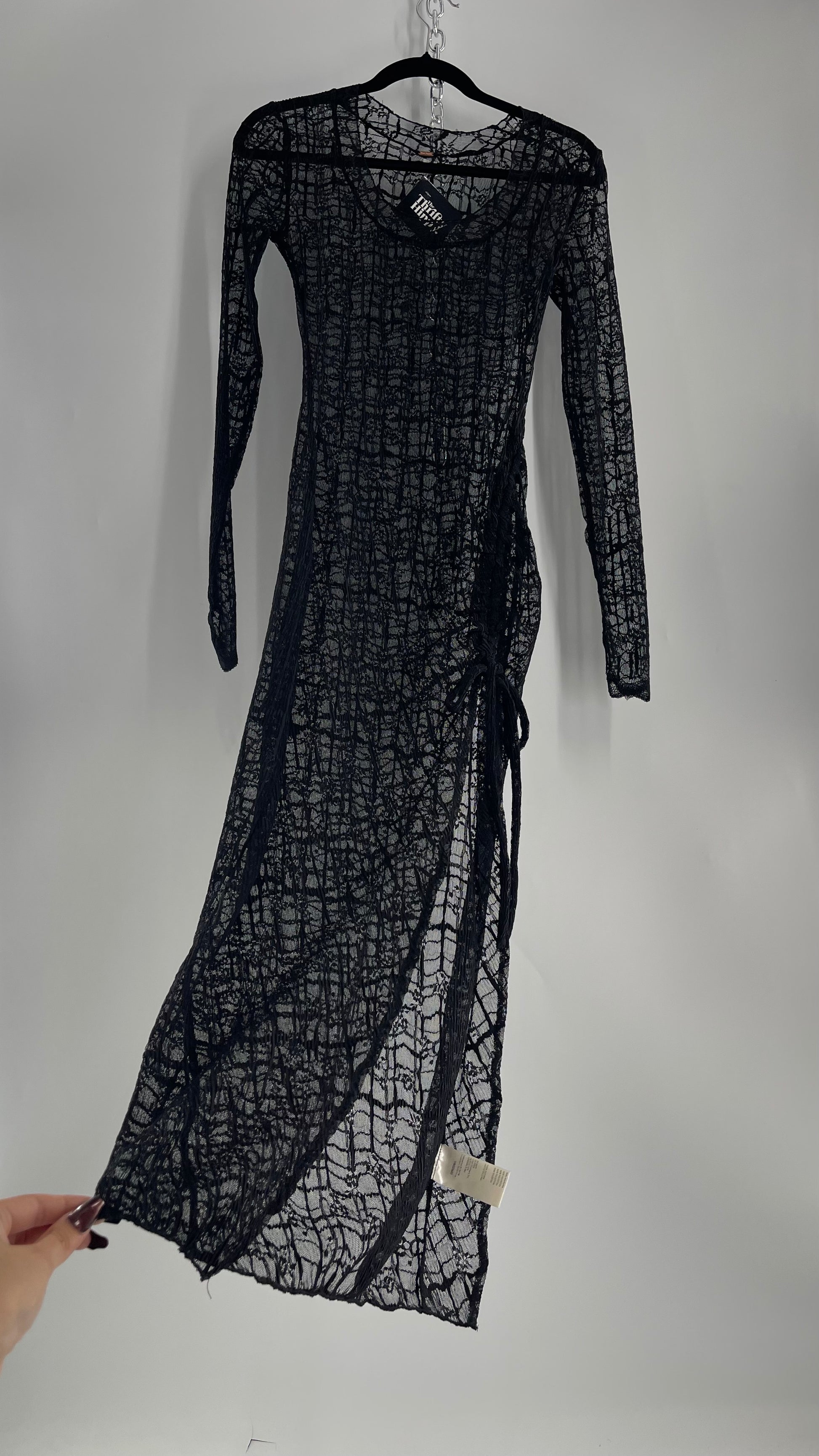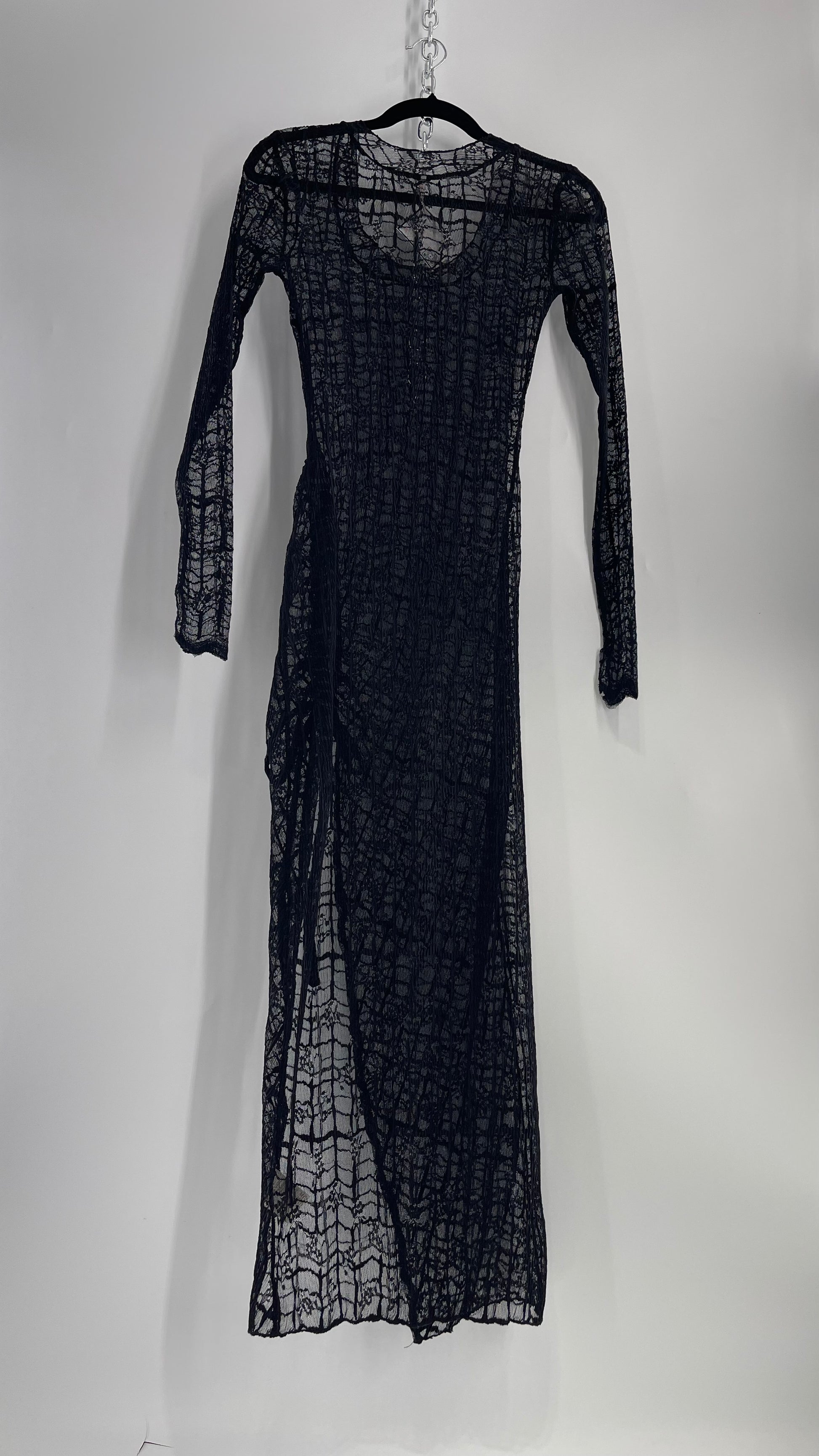 Free People Black Sheer Crimped Lace Long Sleeve Maxi with Ruched Slit (XS)