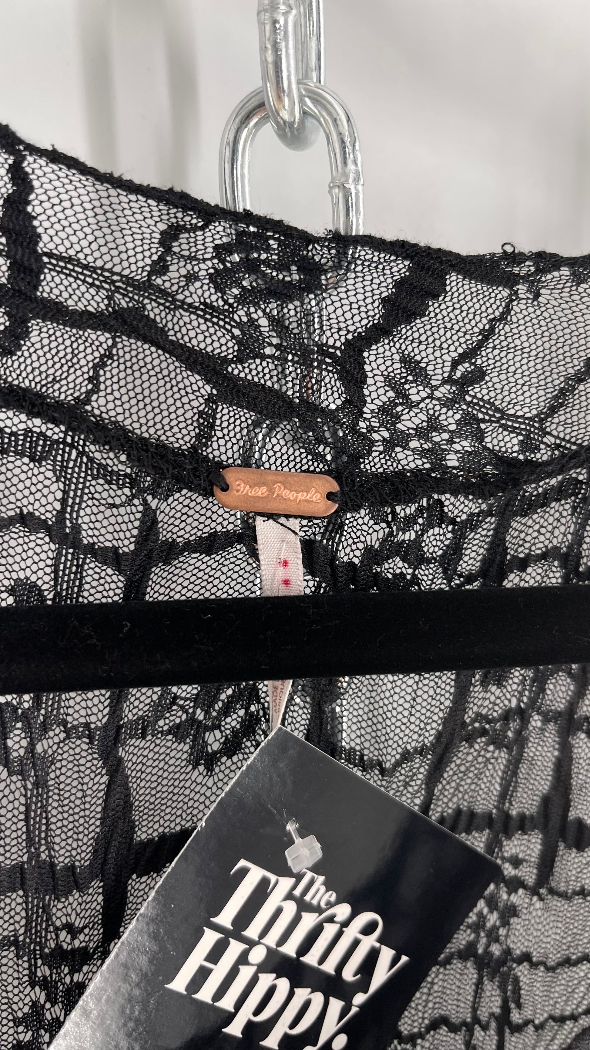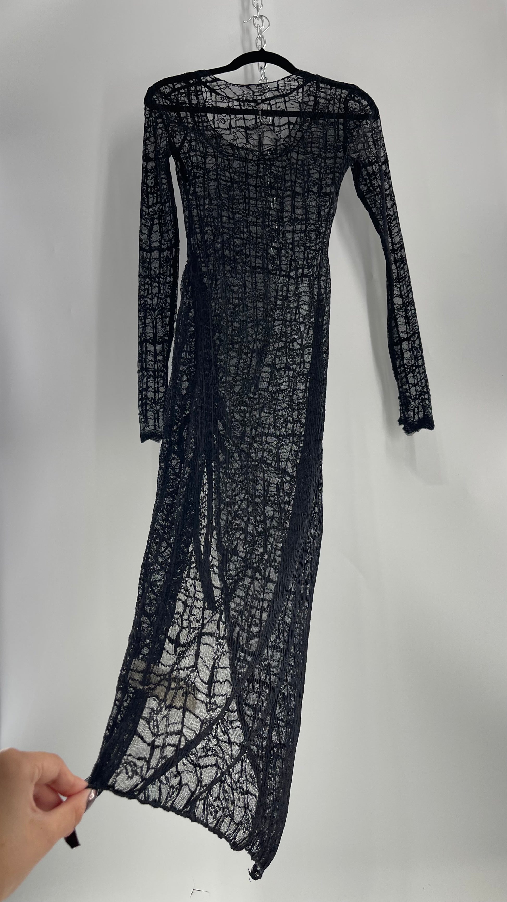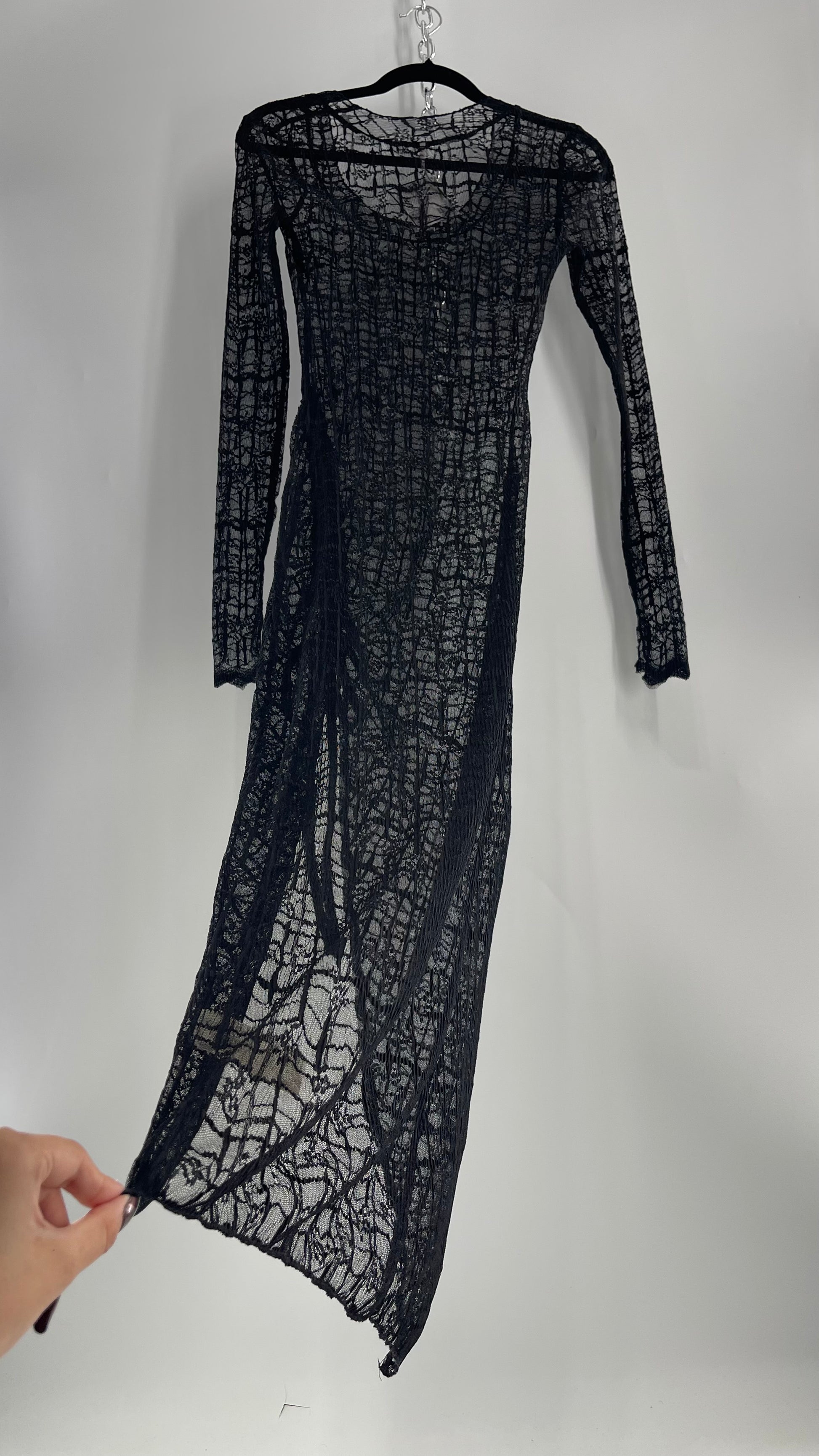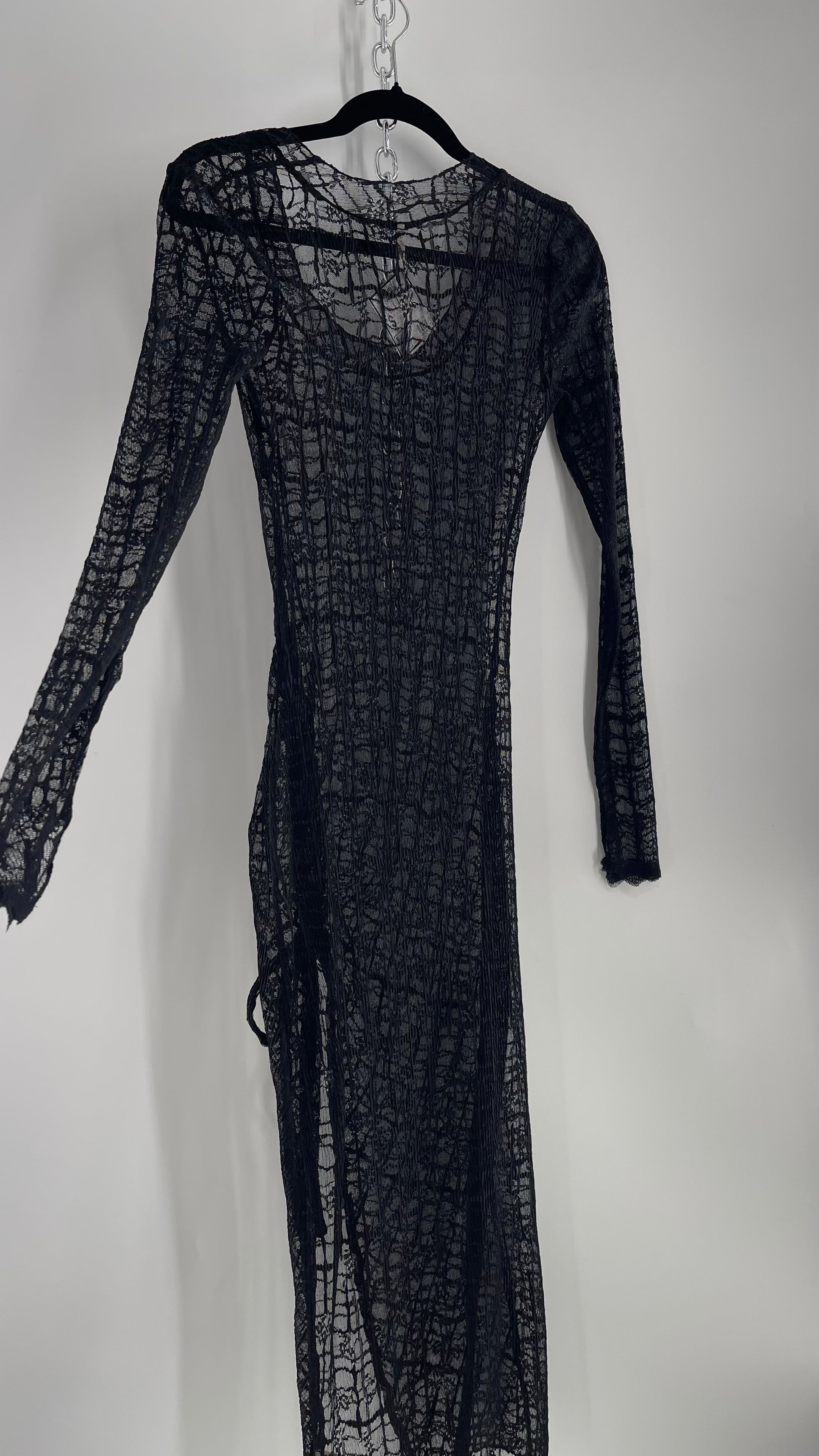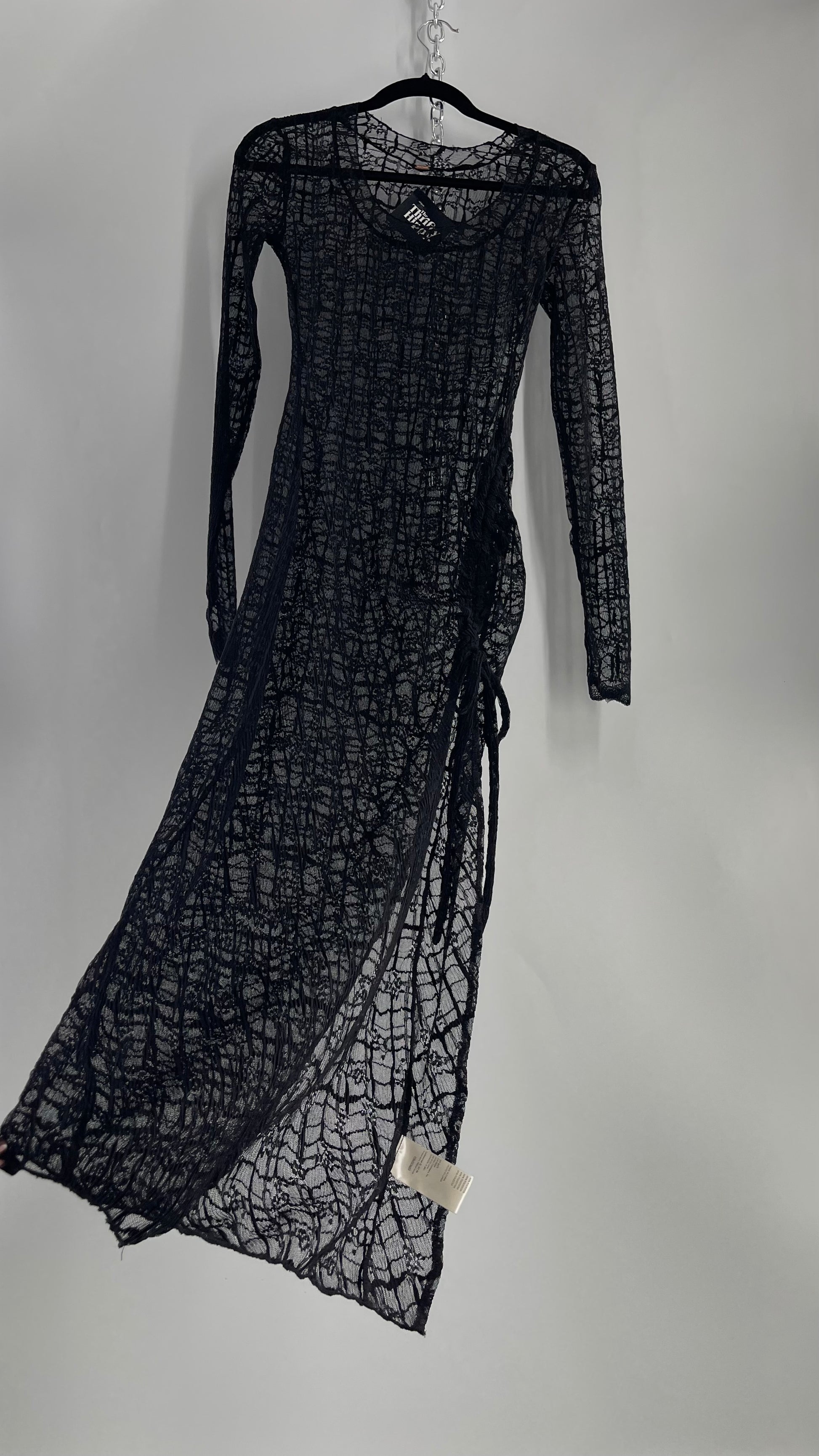 Free People Black Sheer Crimped Lace Long Sleeve Maxi with Ruched Slit (XS)