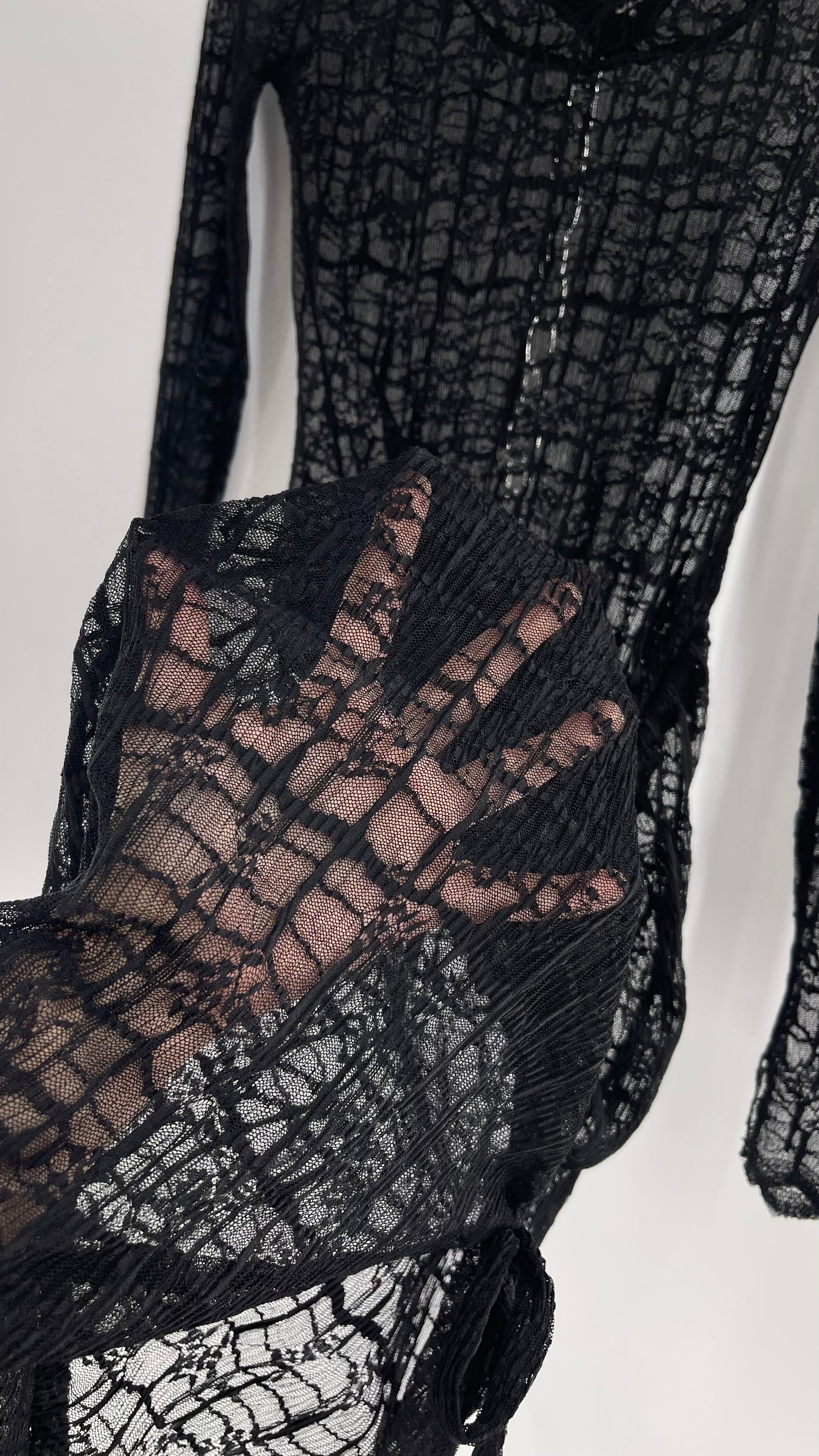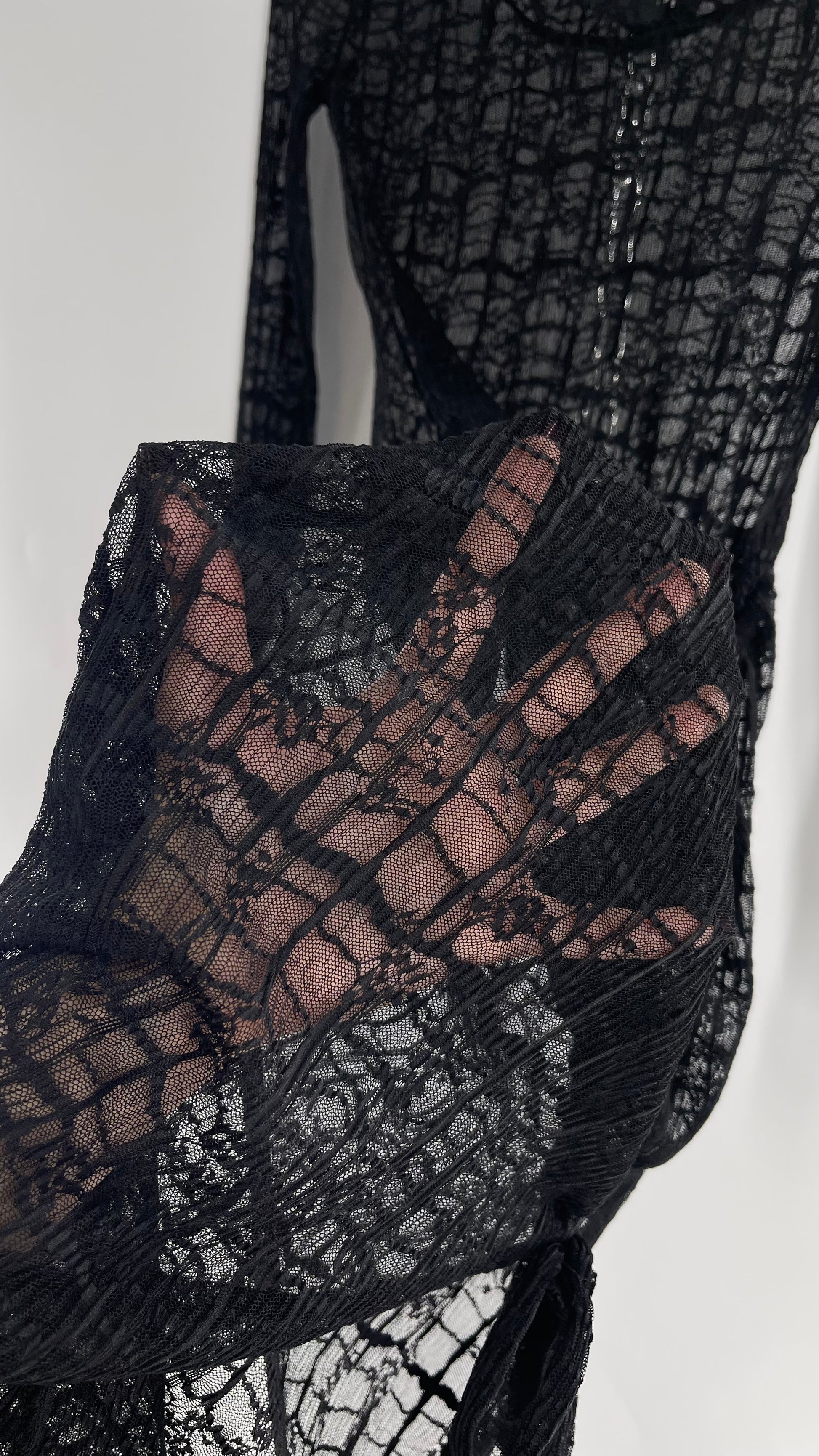 Free People Sabina Black Sheer Crimped Lace Long Sleeve Maxi with Ruched Slit (XS)