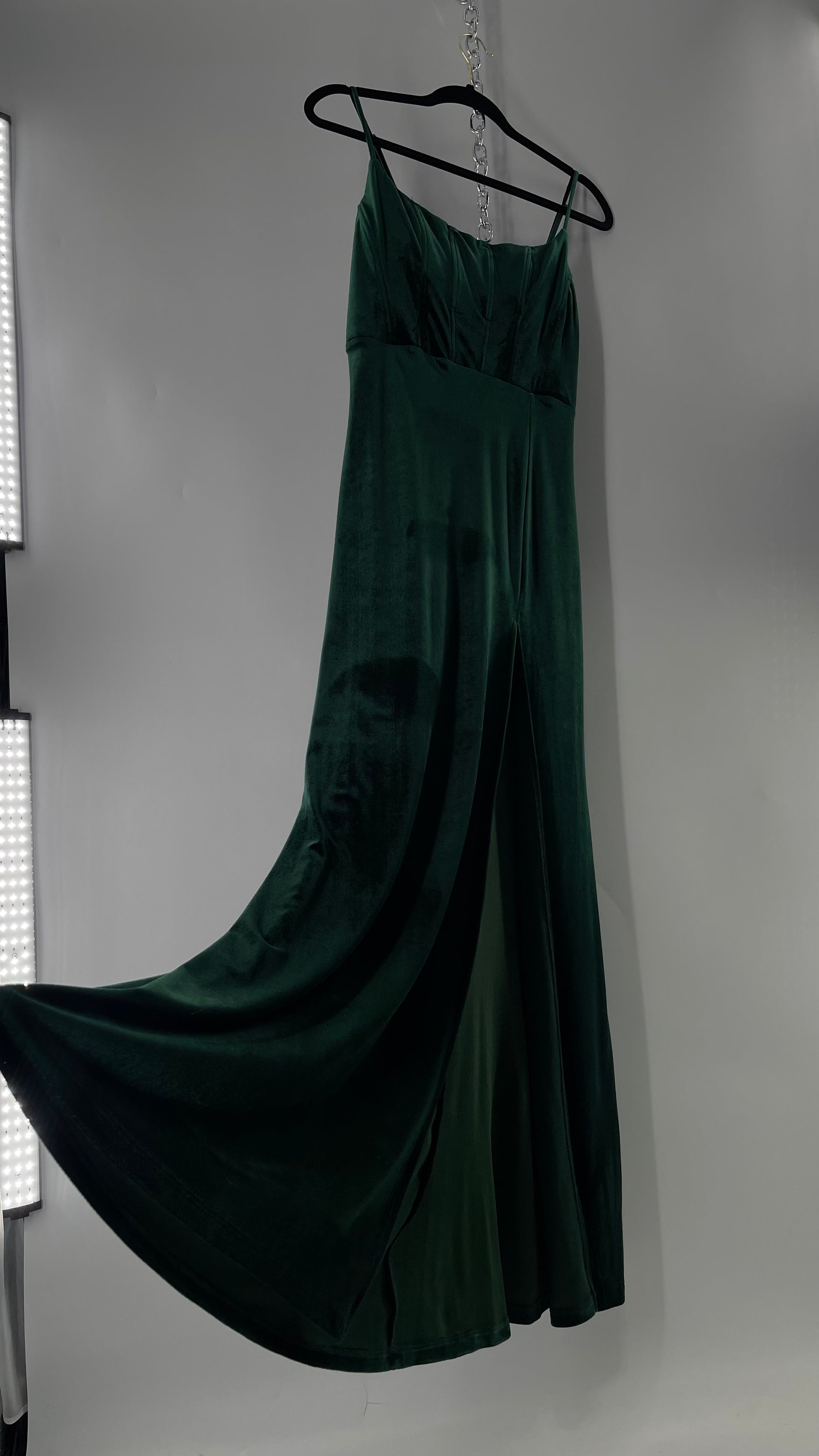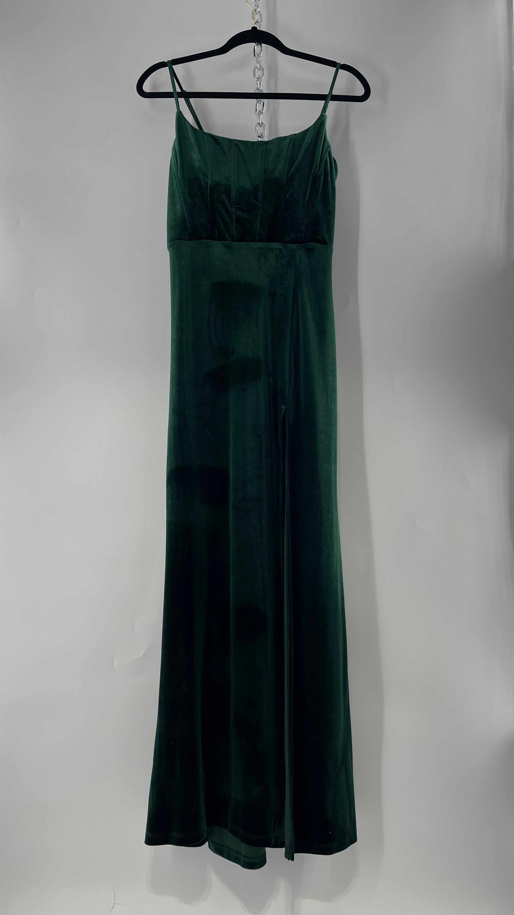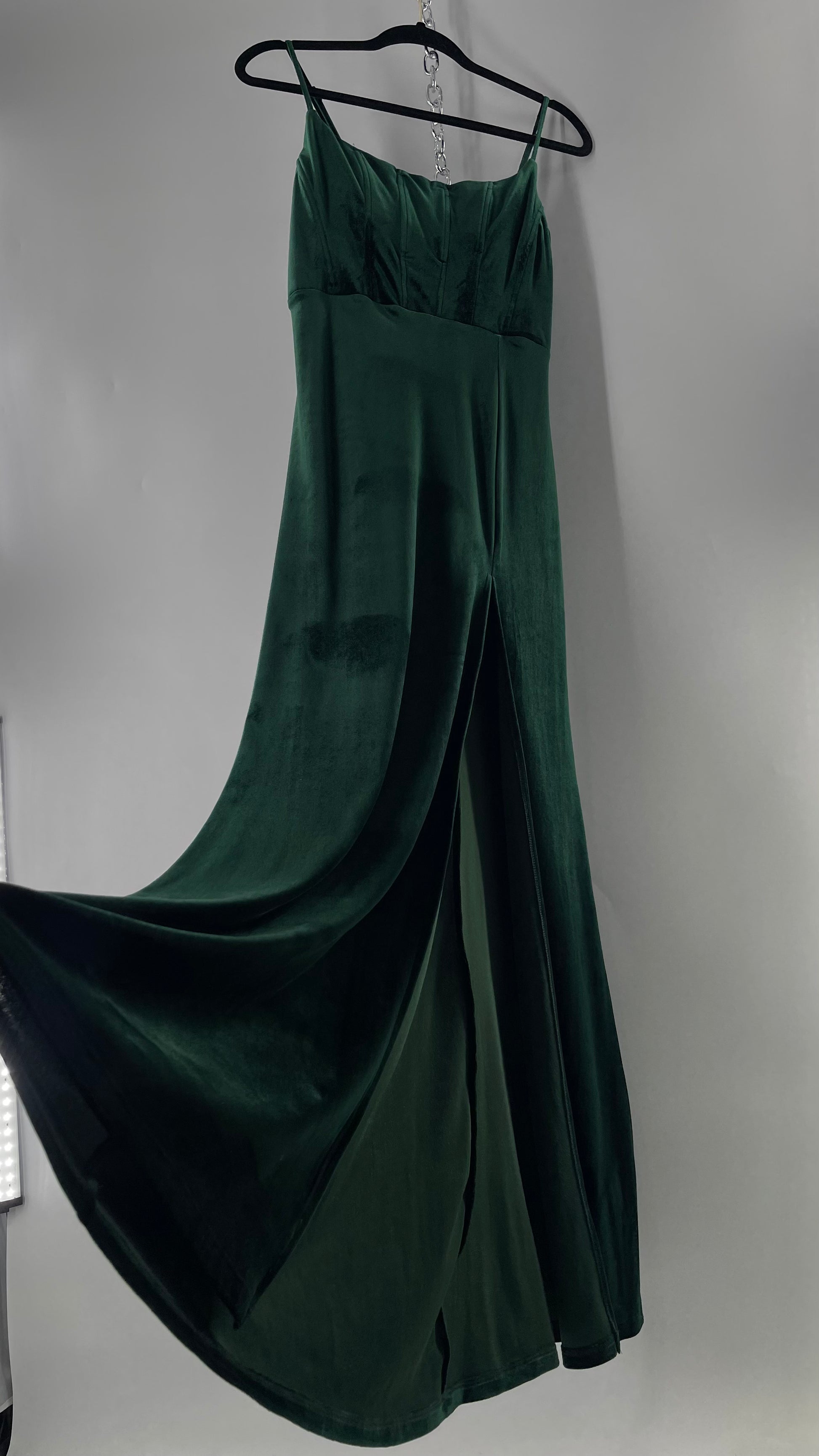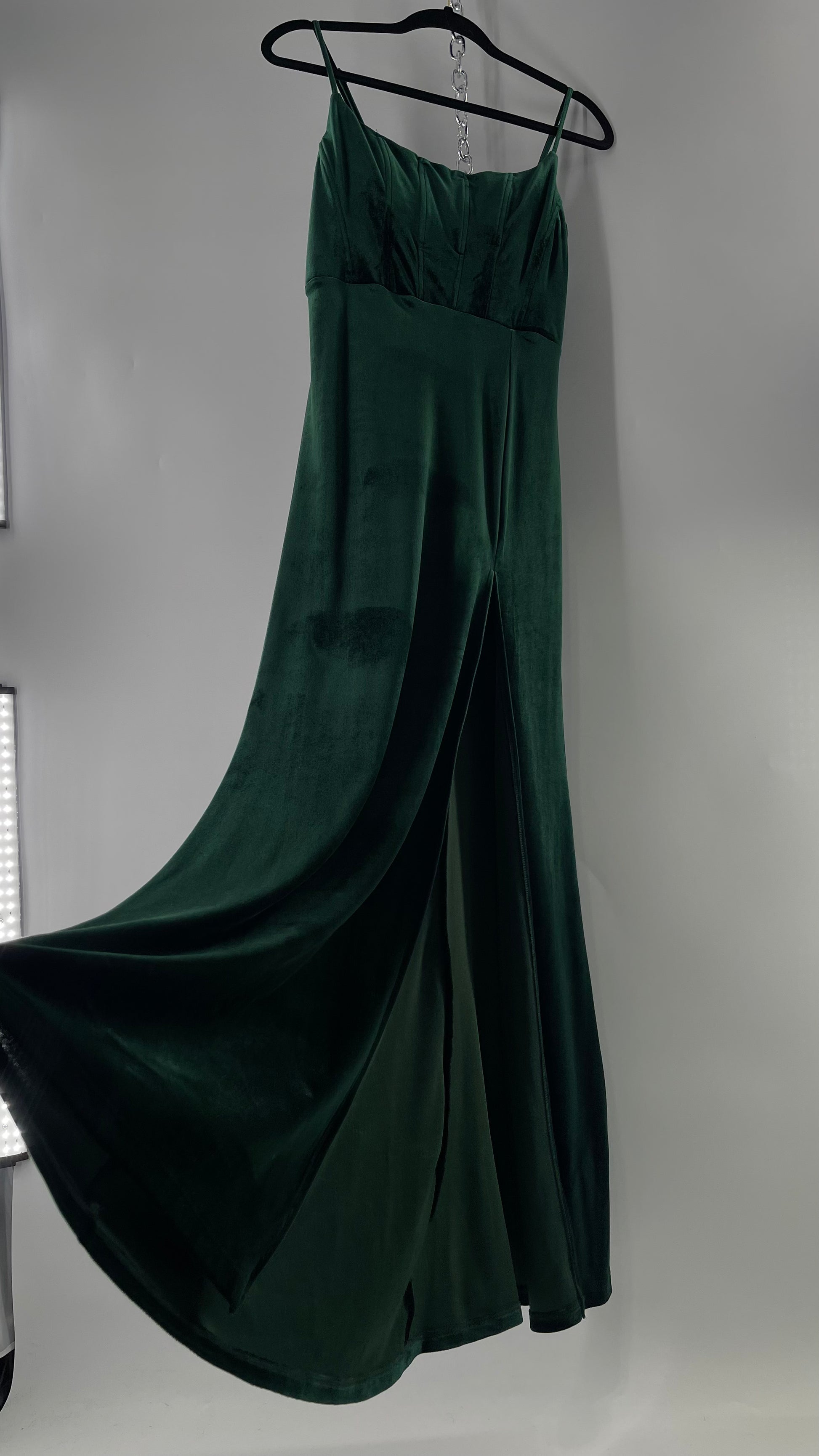 Windsor Forest Green Velvet Maxi Dress with Corseted Bust and Side Slit (11/12)