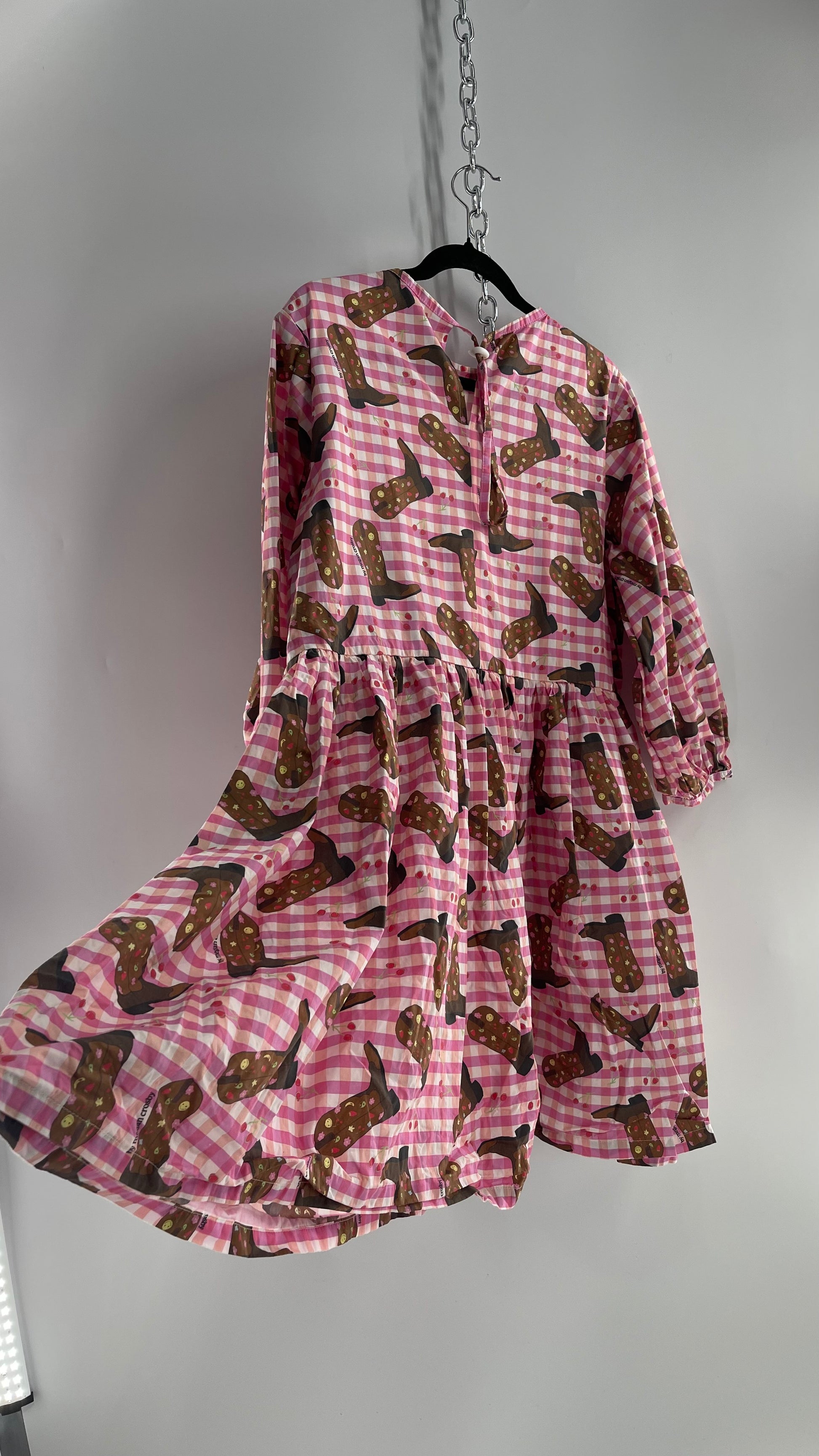 Megan Crosby Lila Plaid Mini Dress with Exaggerated Puff Sleeve and Cow Boy Boot Pattern (XL)