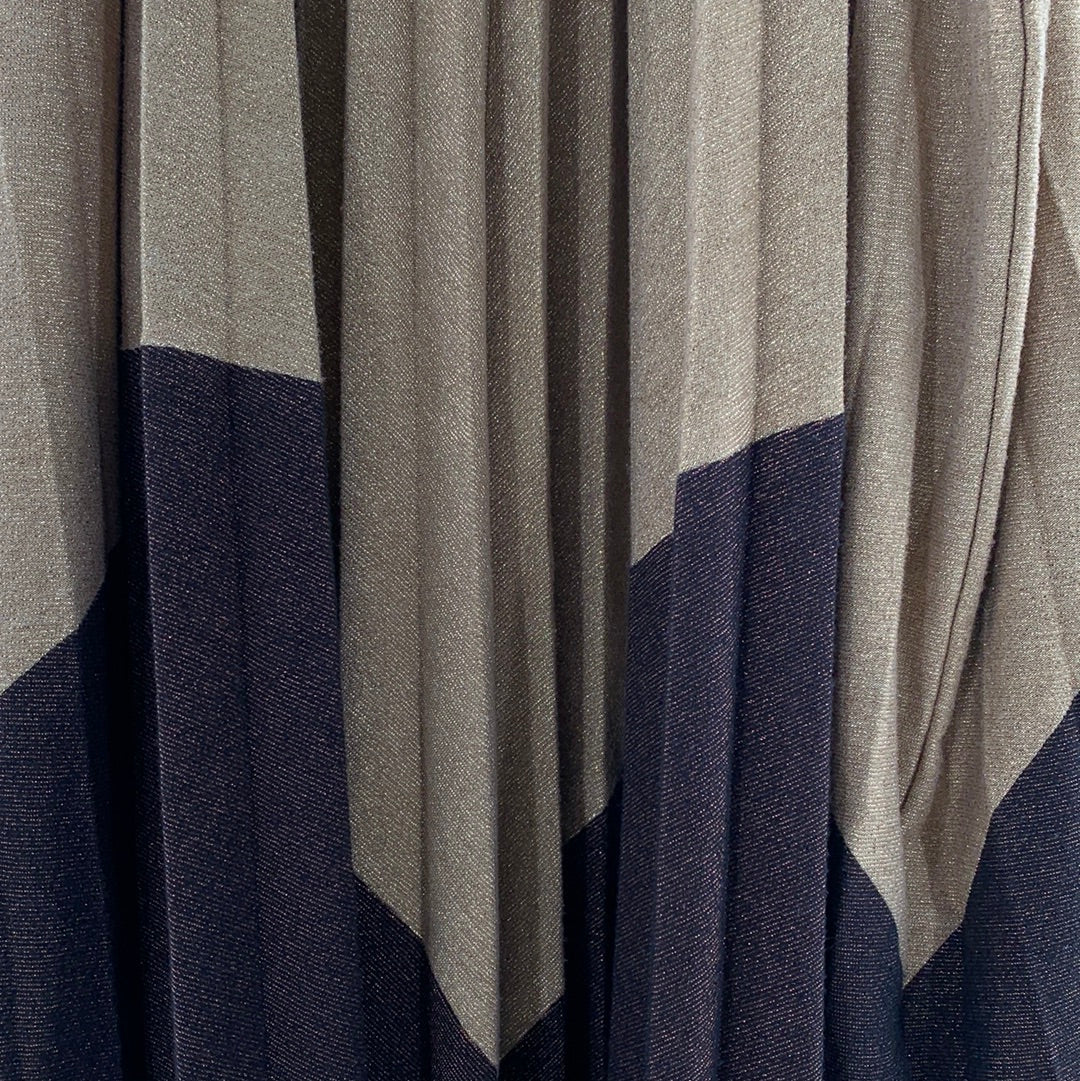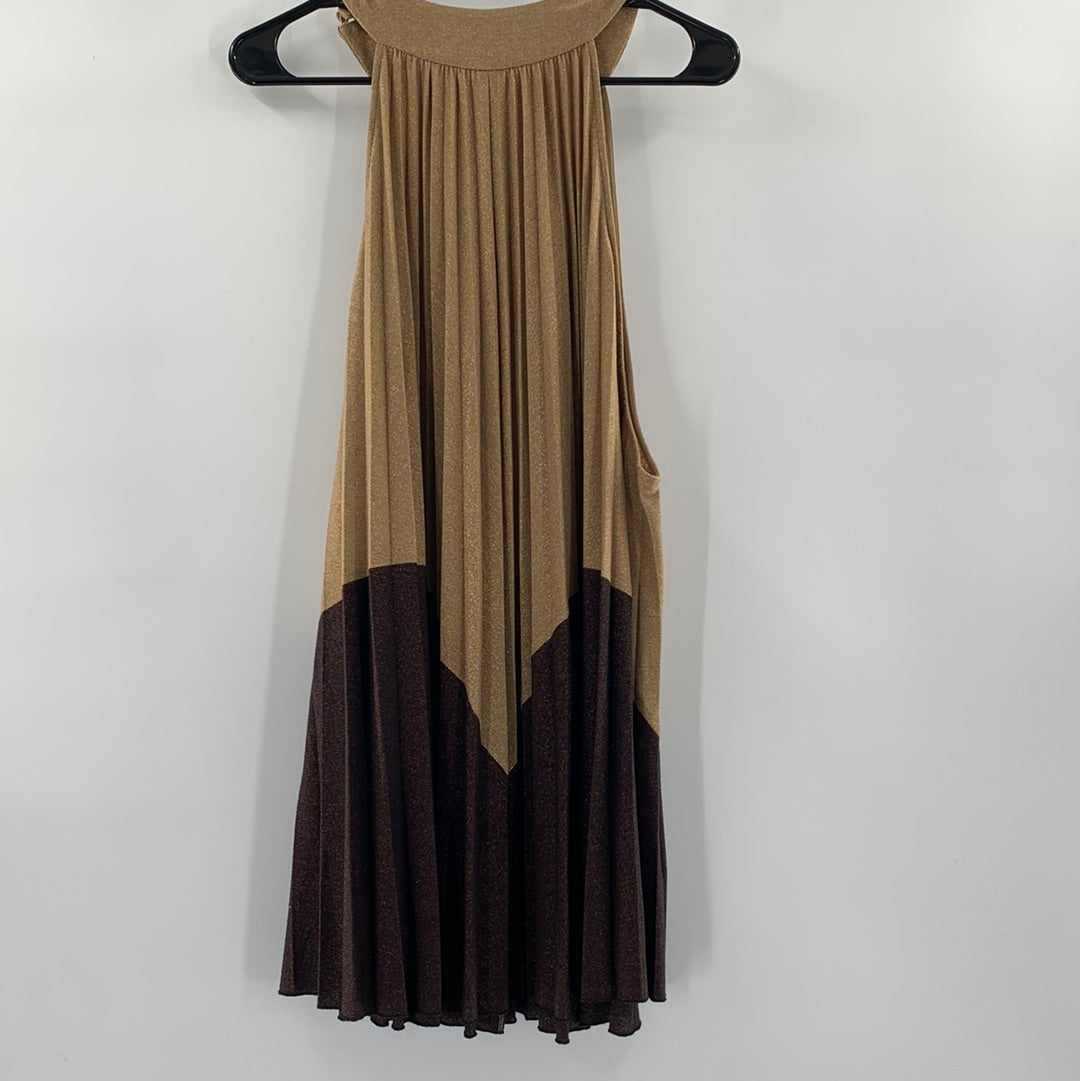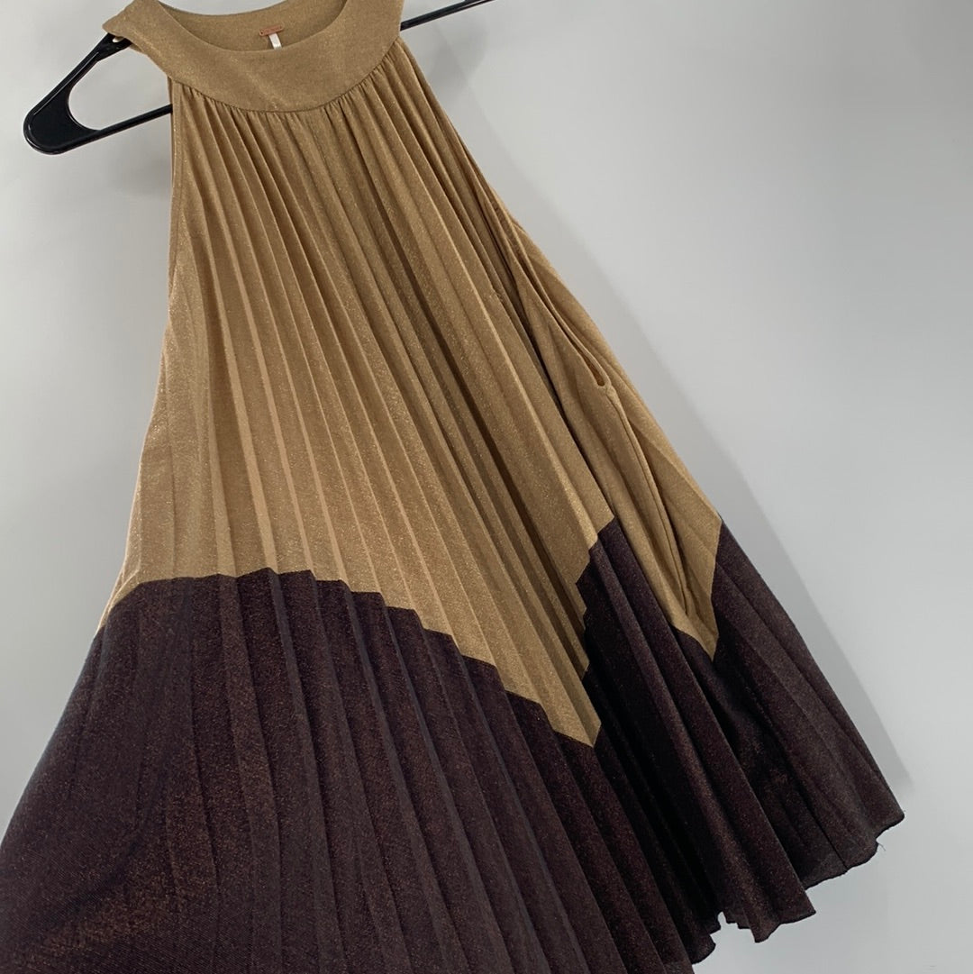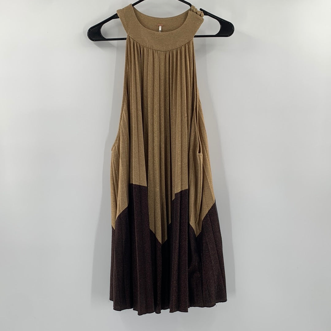 Free People Glittery Gold and brown pleated mini dress with high neckline and button closure