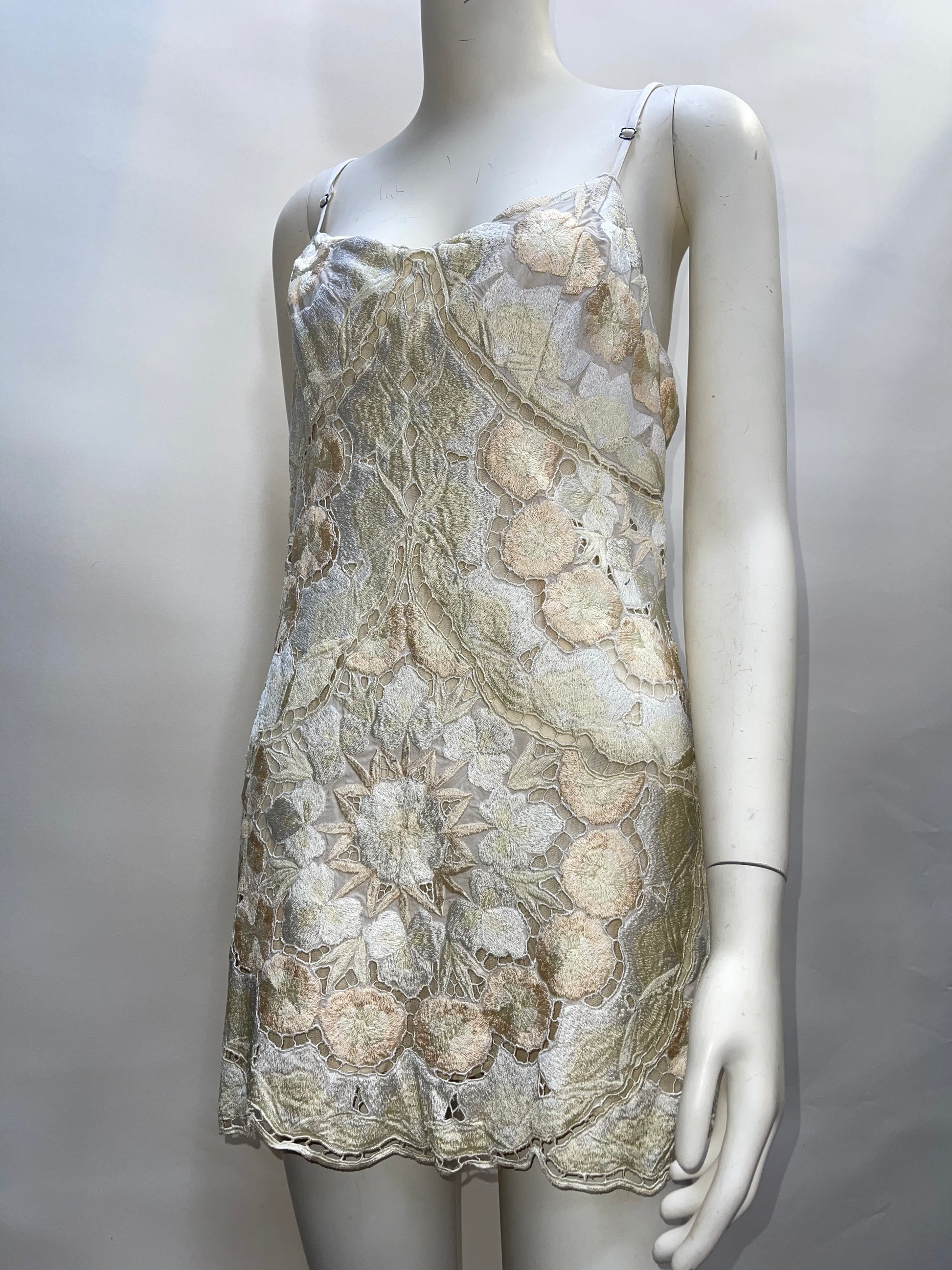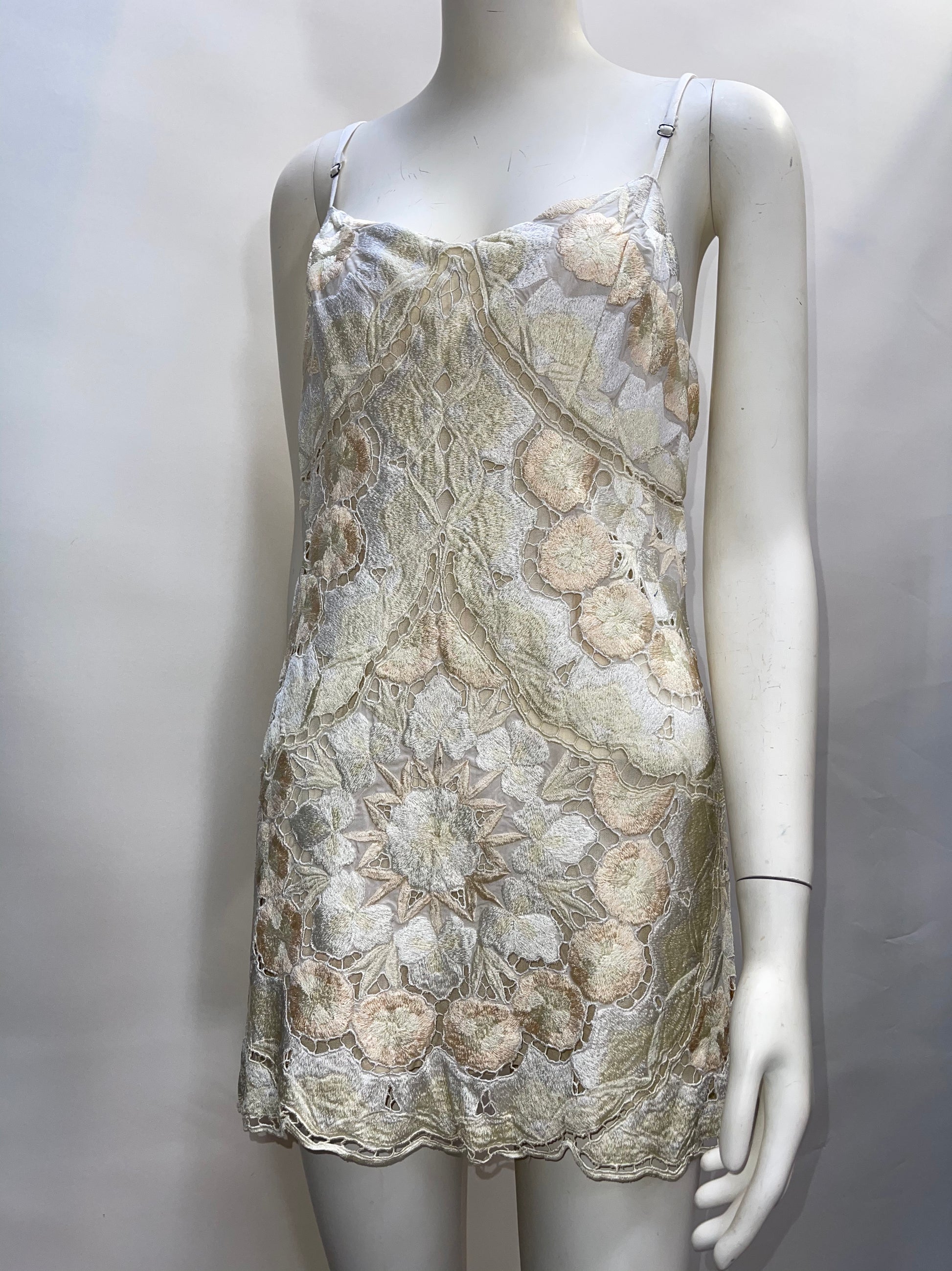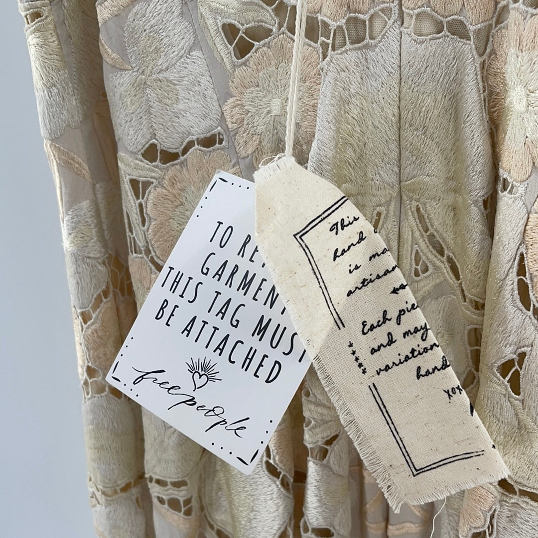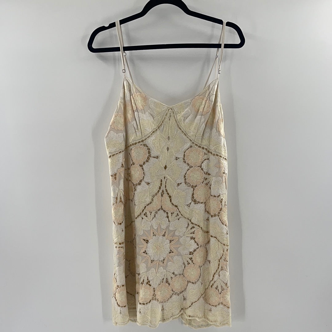 Free People heavily embroidered lace slip dress with varying shades of white, cream and beige