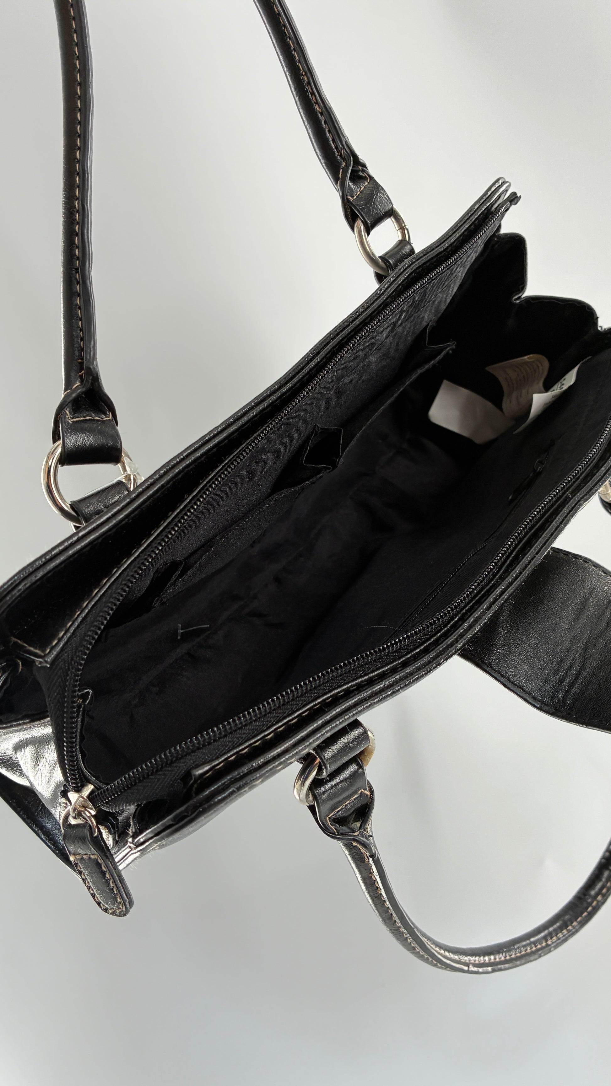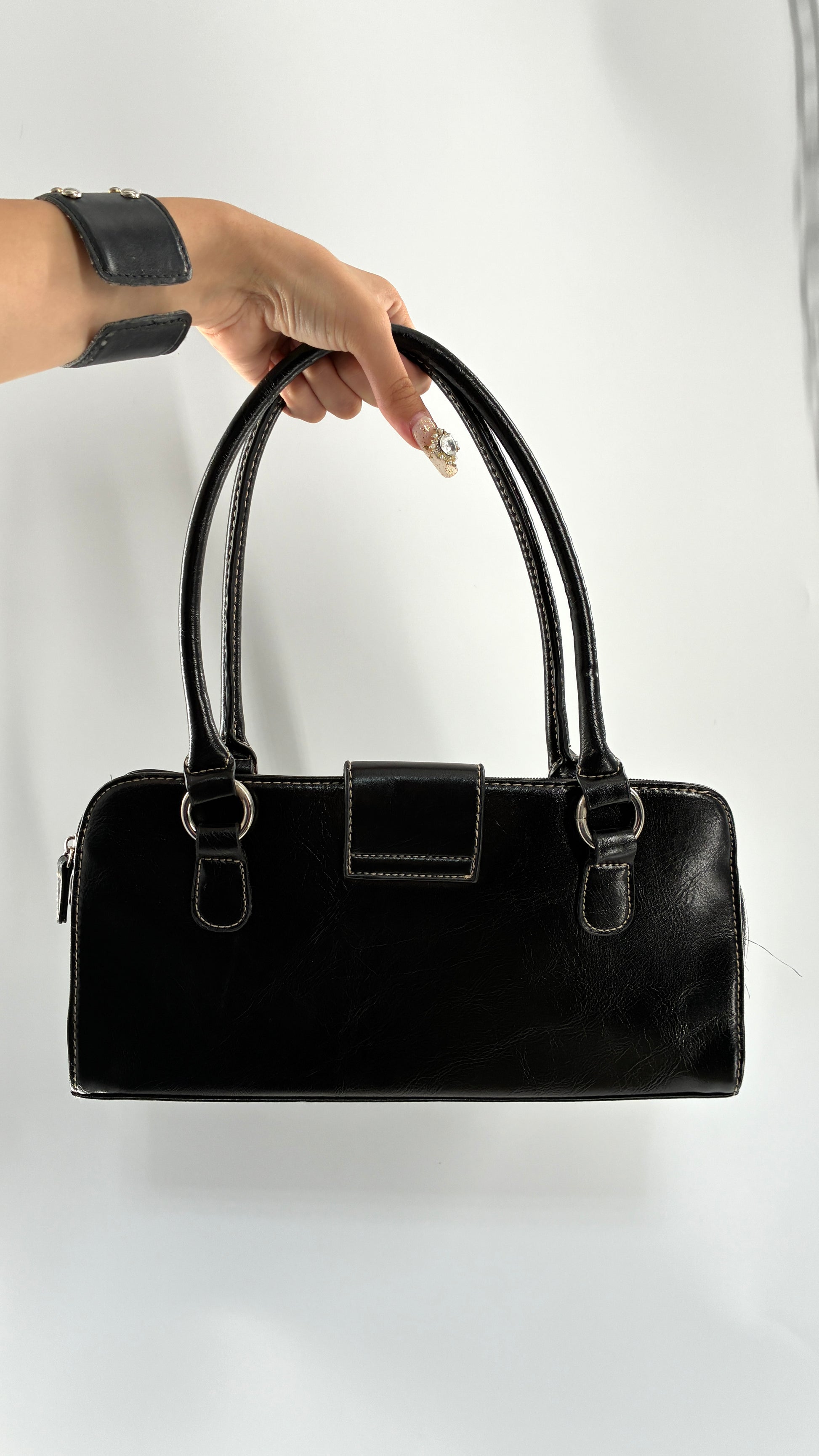 Deadstock Vintage MINICCI Black Shoulder Bag With Silver Hardware, Exaggerated Stitching