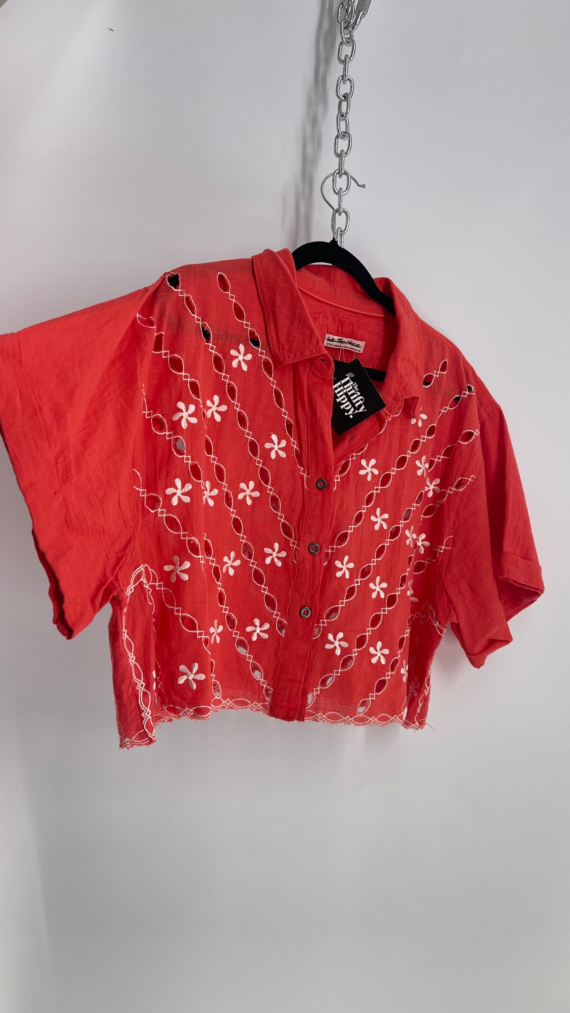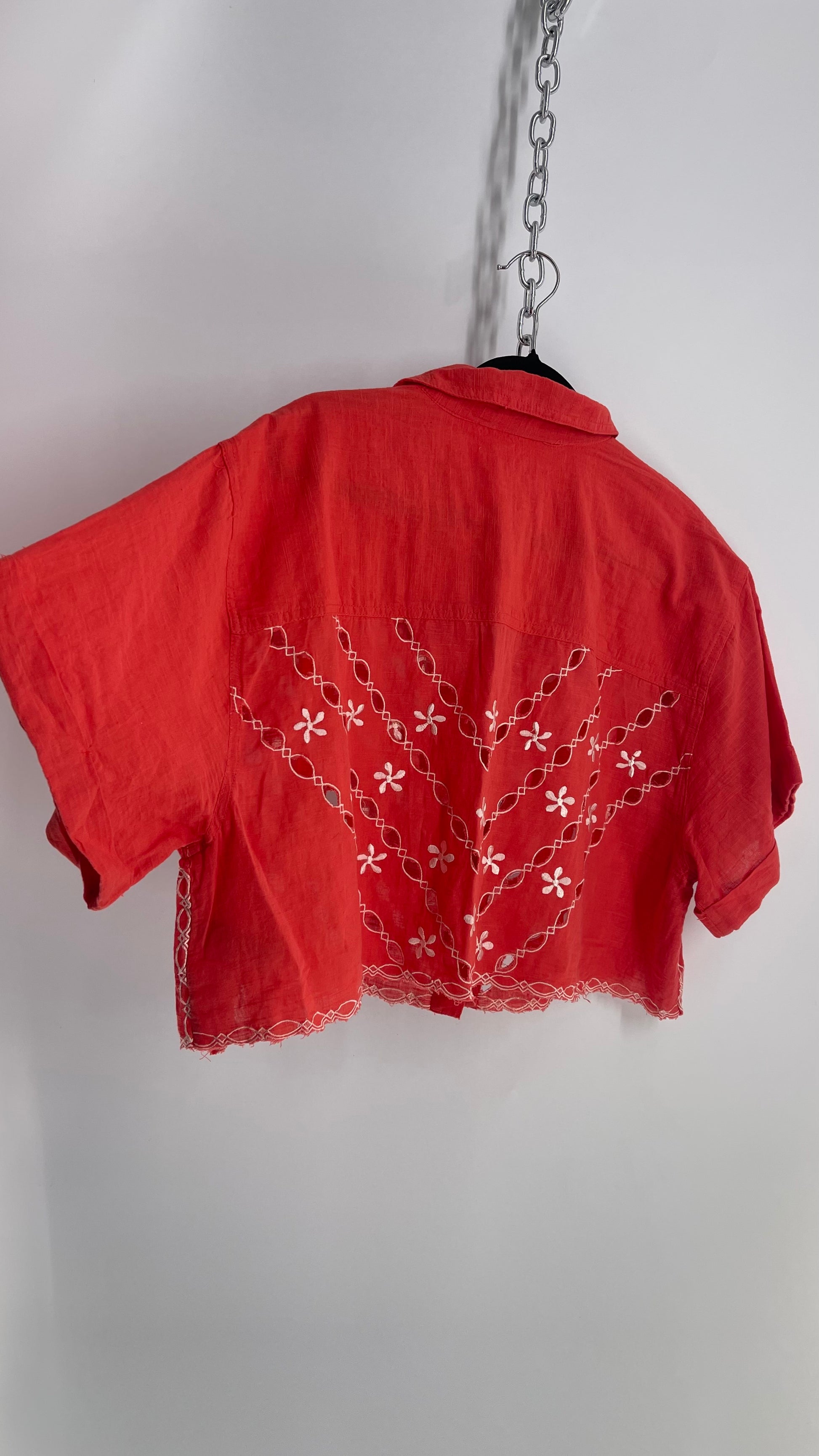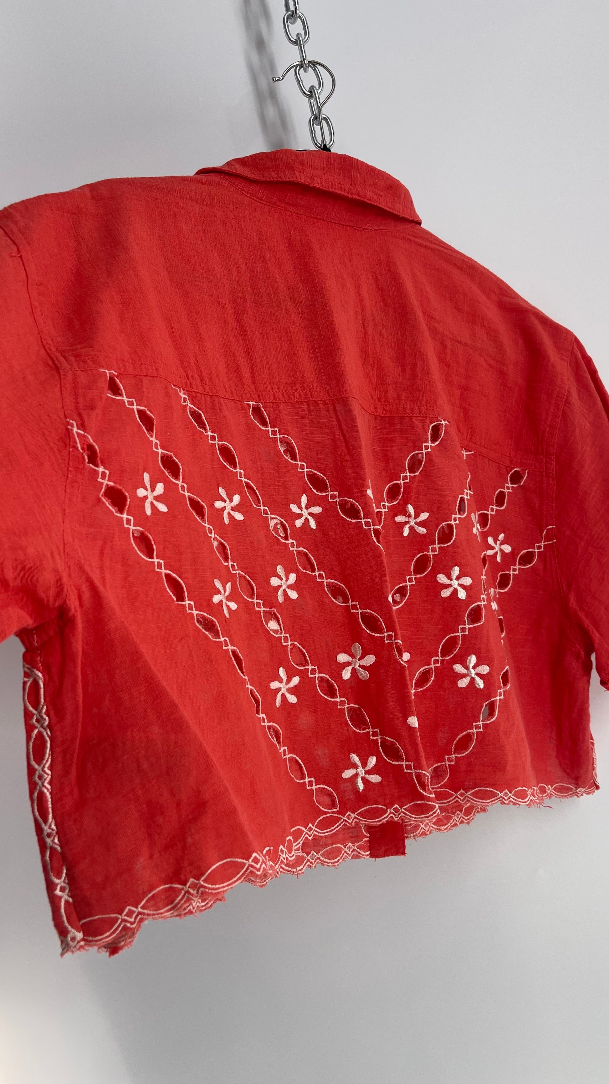 Free People Coral Top with White Eyelet Lace Embroidery (XS)