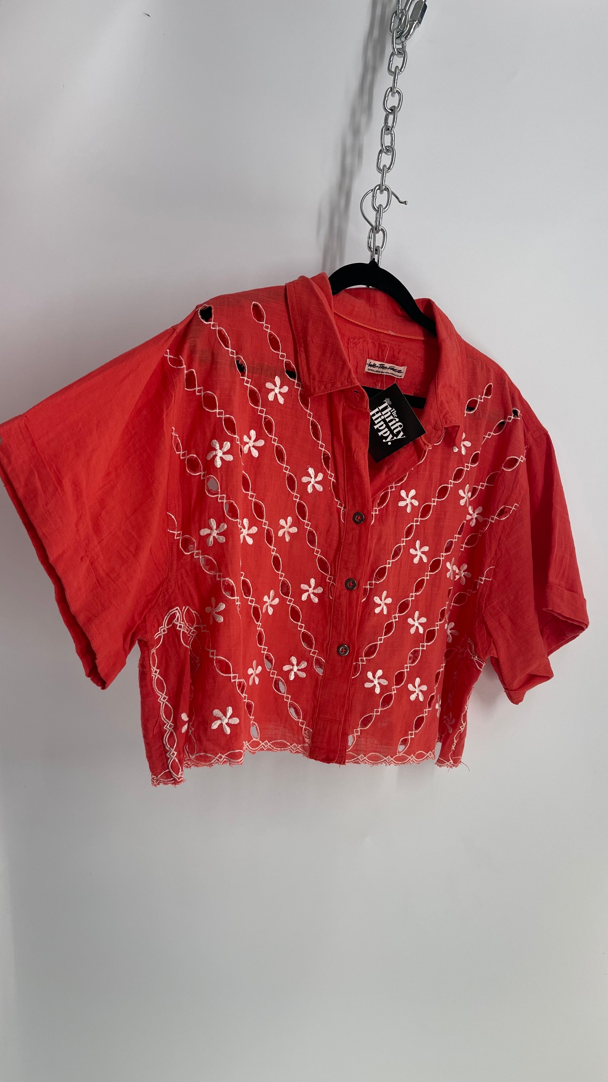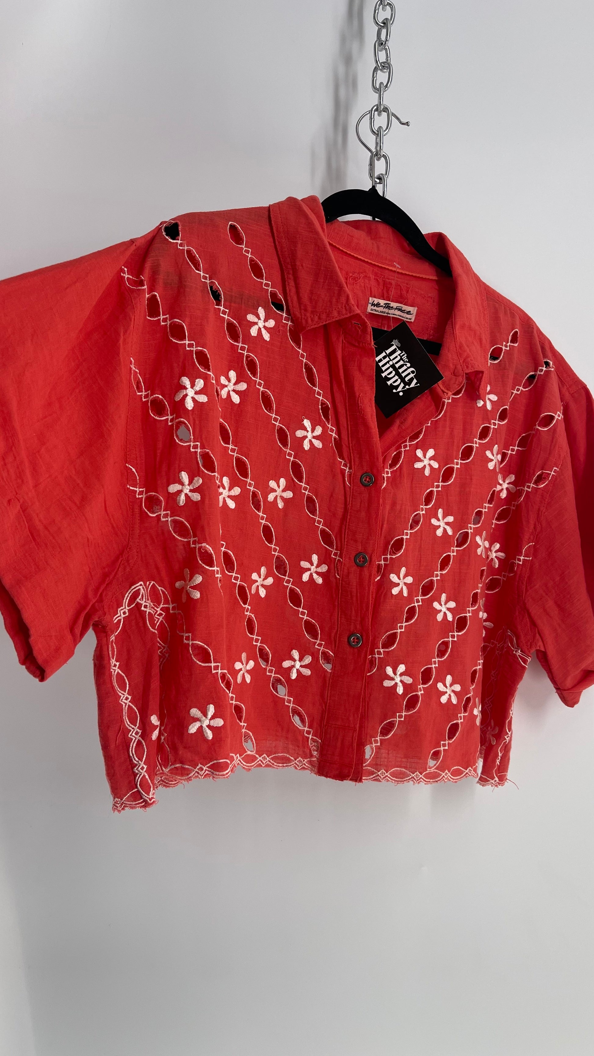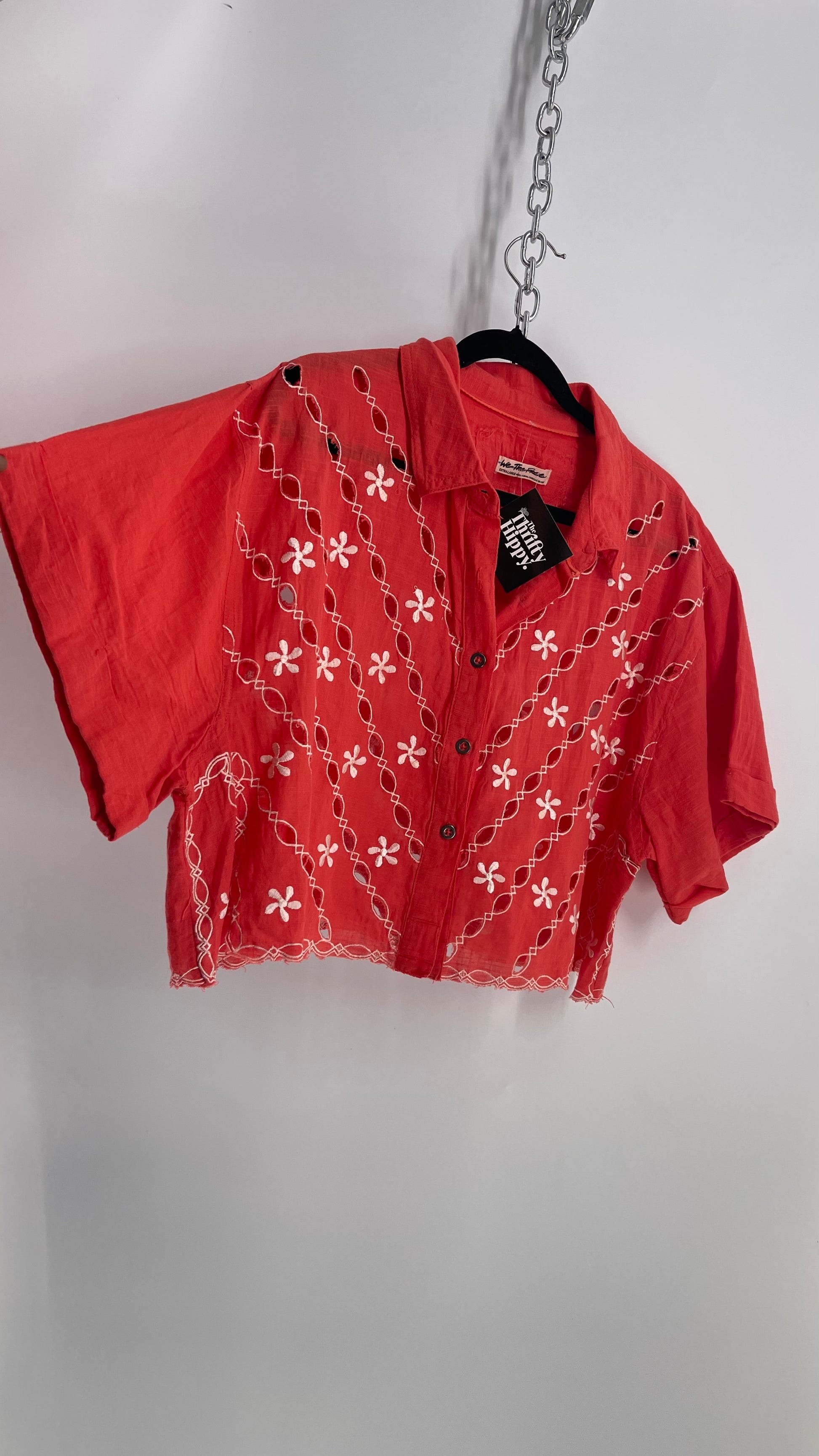 Free People Coral Top with White Eyelet Lace Embroidery (XS)