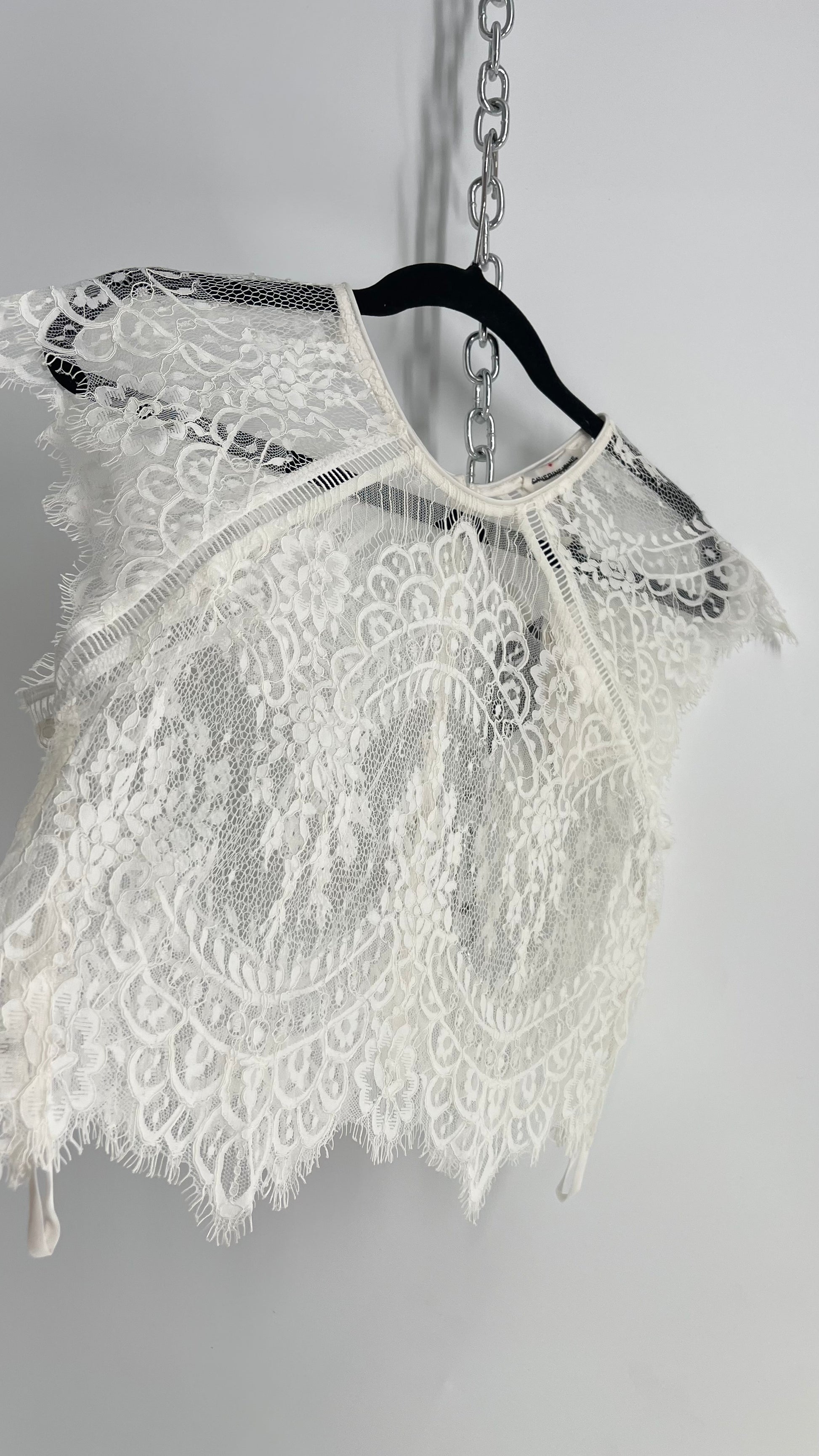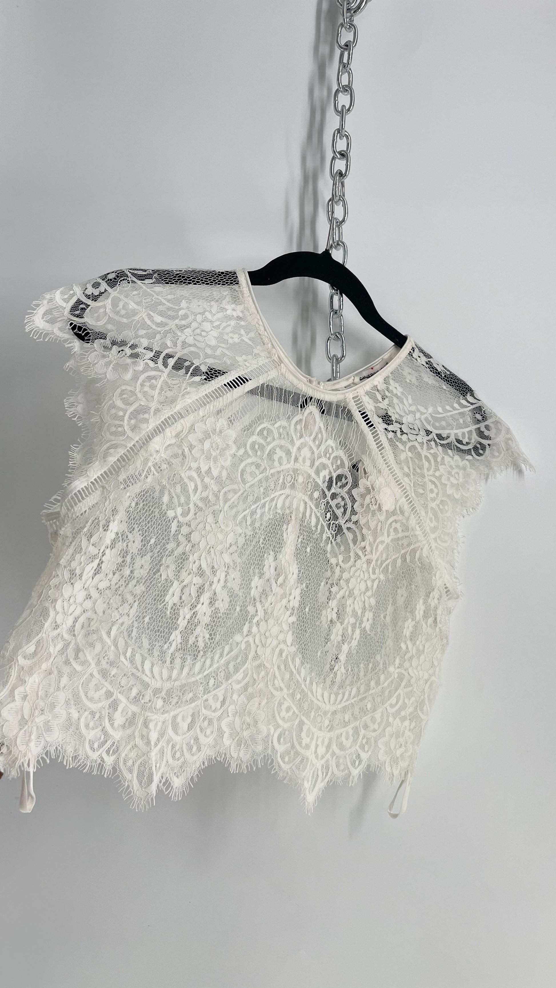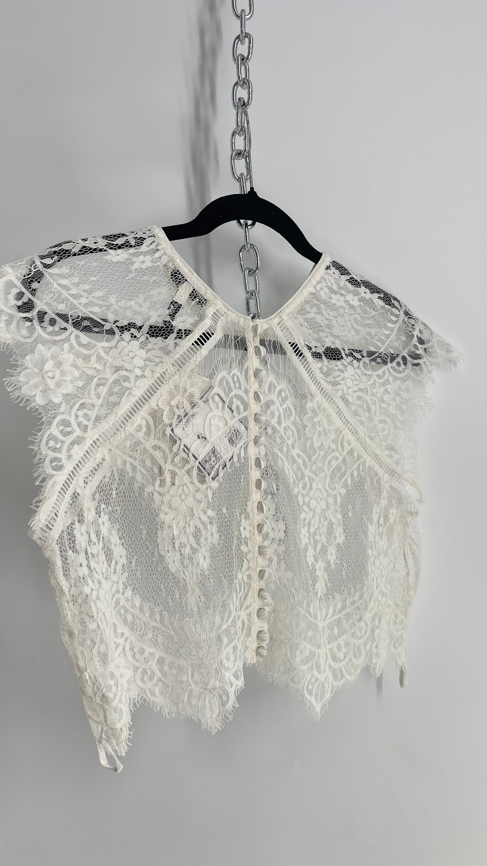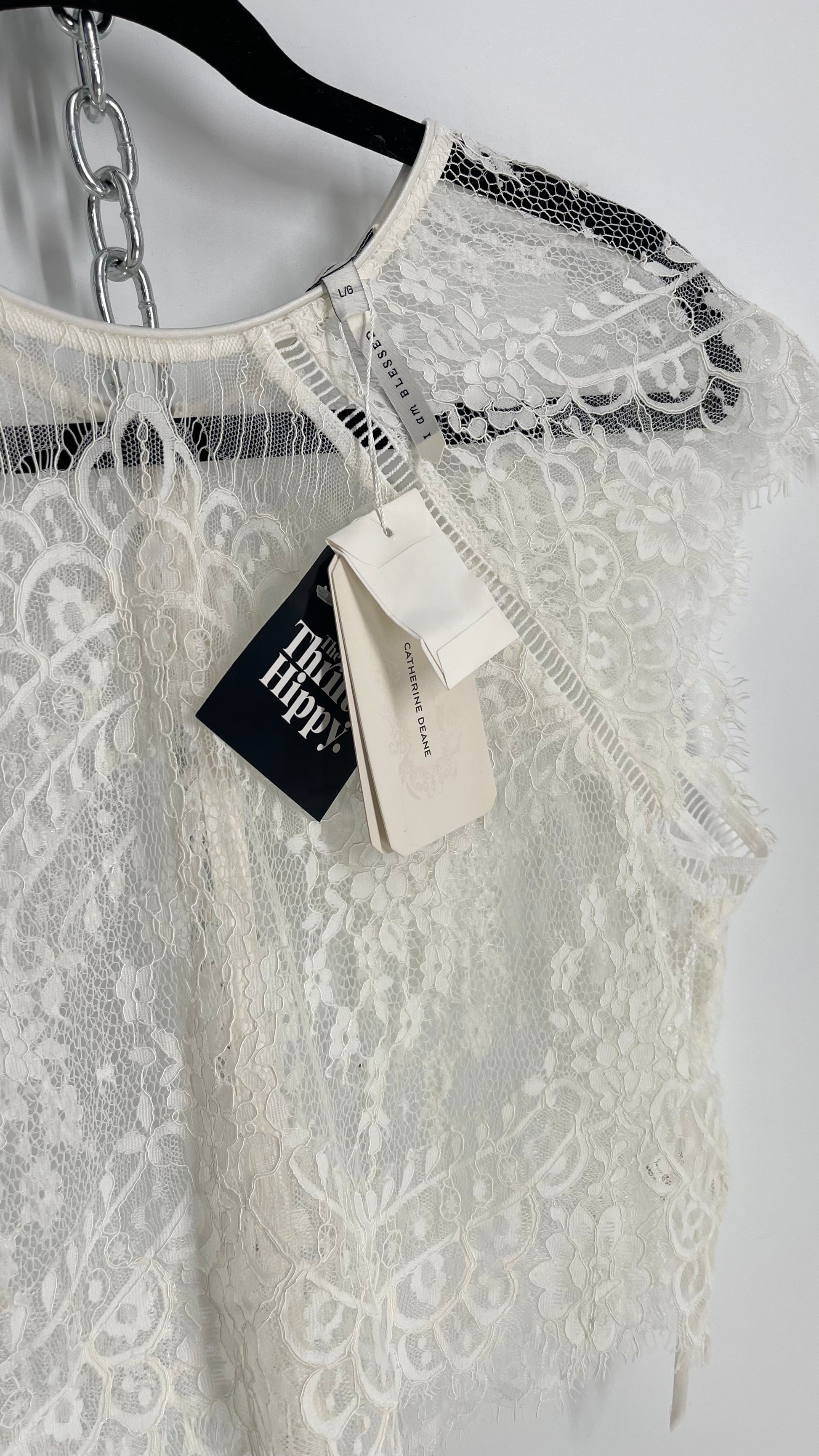 Catherine Deane ITÁLIA White Lace Button Back Short Sleeve Topper Covered in Beading with Tags Attached (Large)