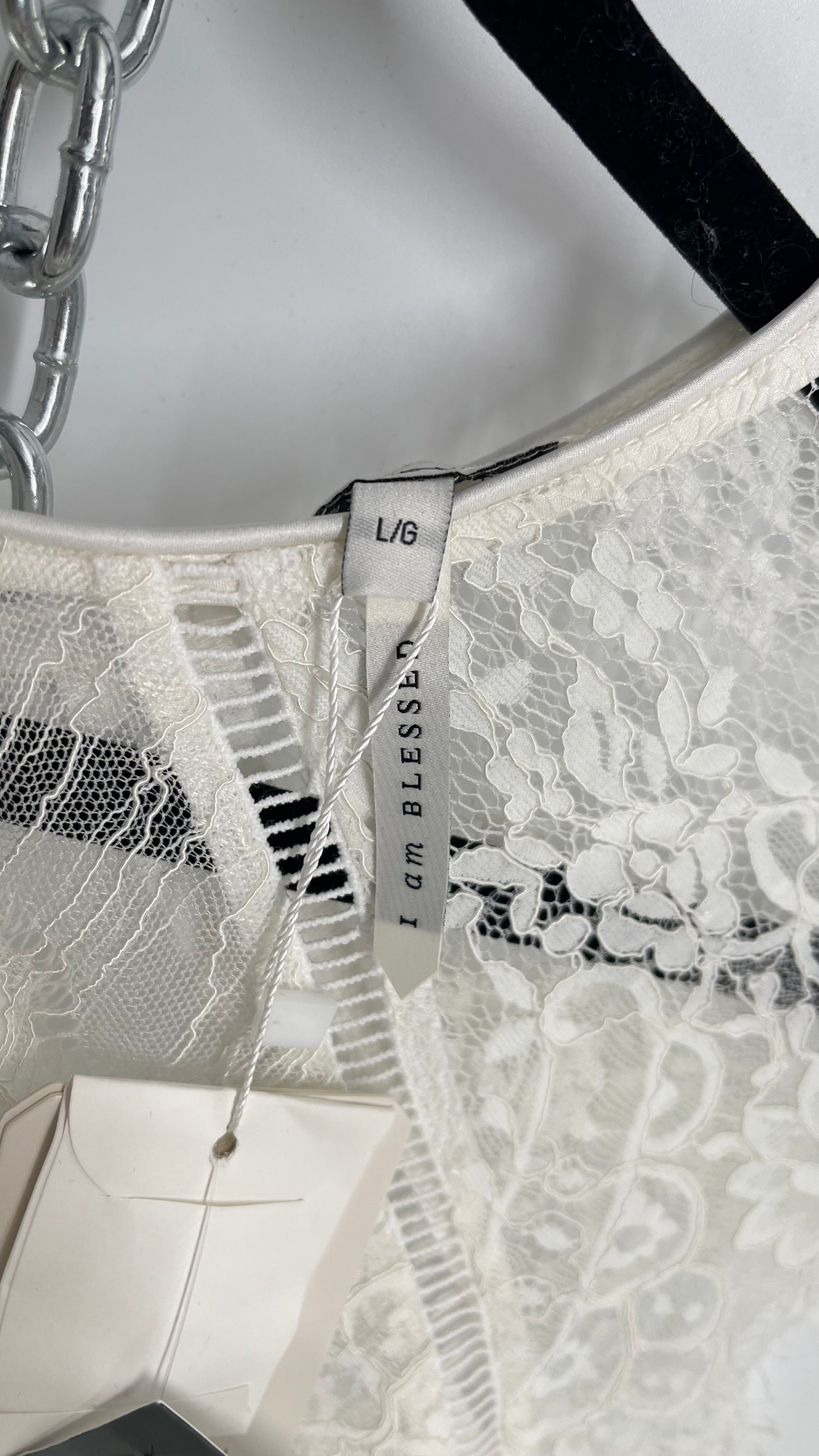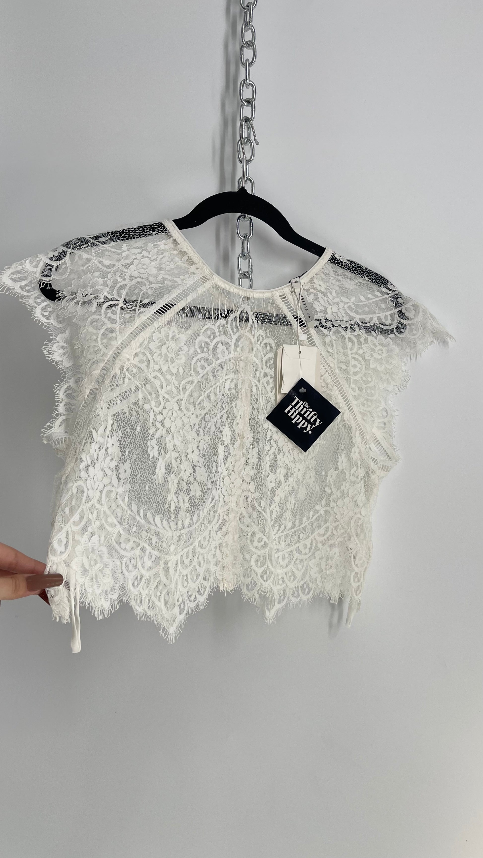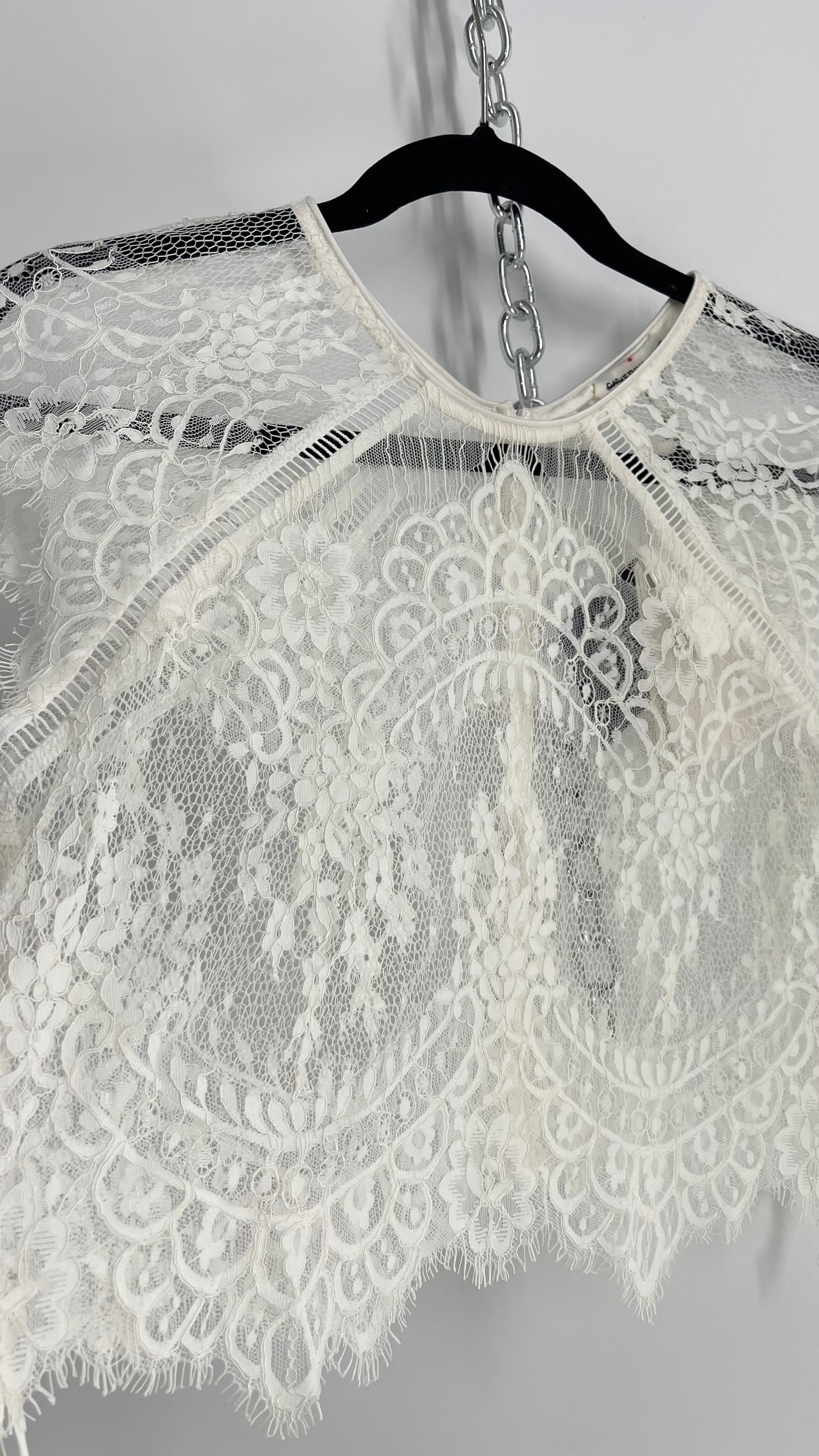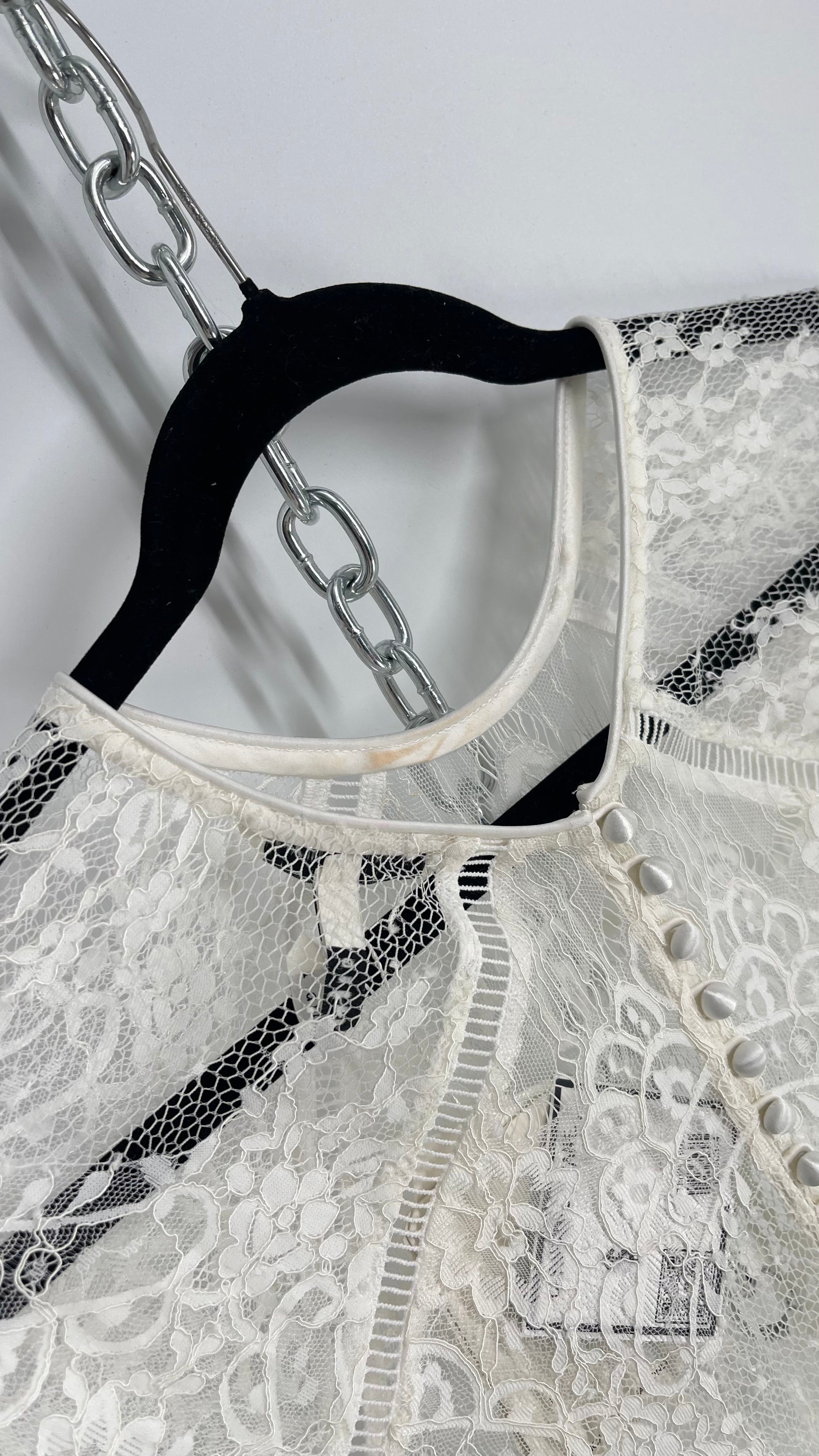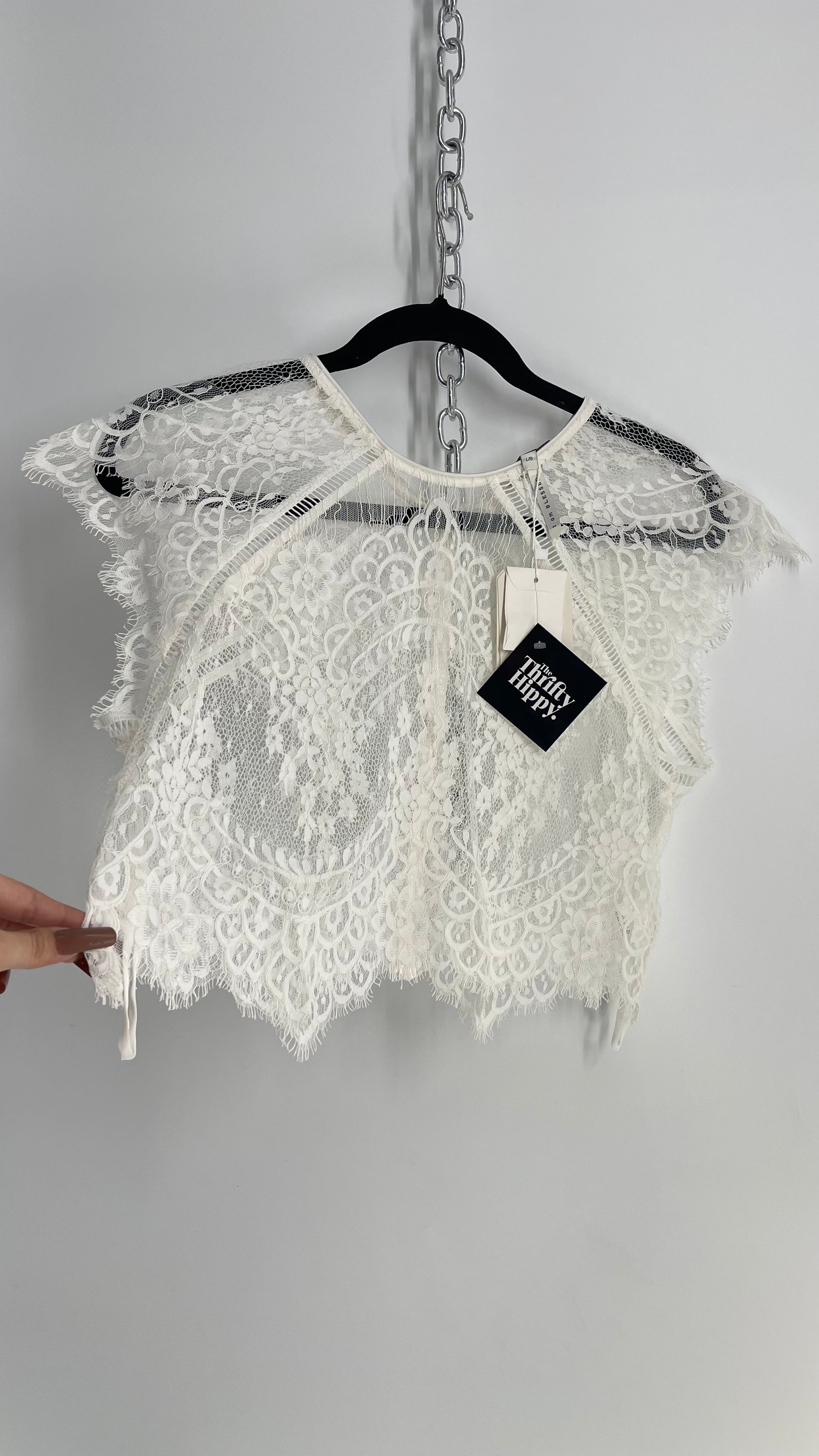 Catherine Deane ITÁLIA White Lace Button Back Short Sleeve Topper Covered in Beading with Tags Attached (Large)
