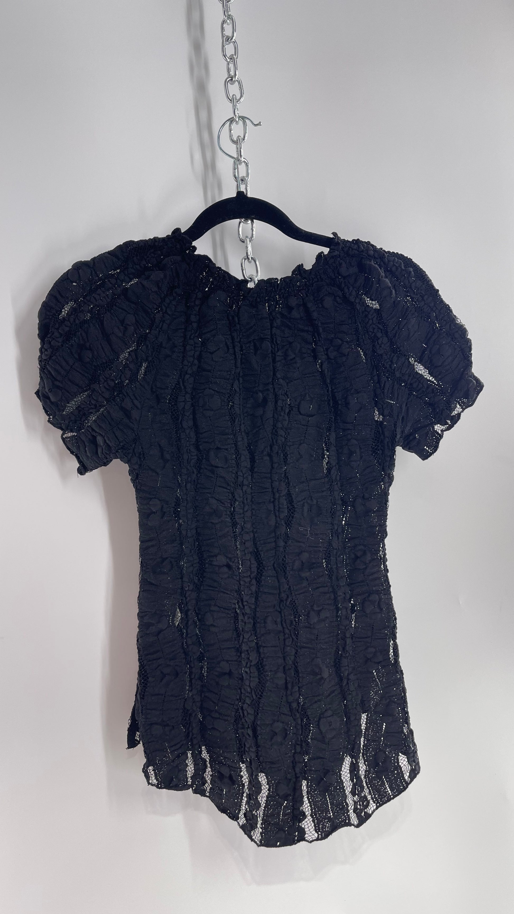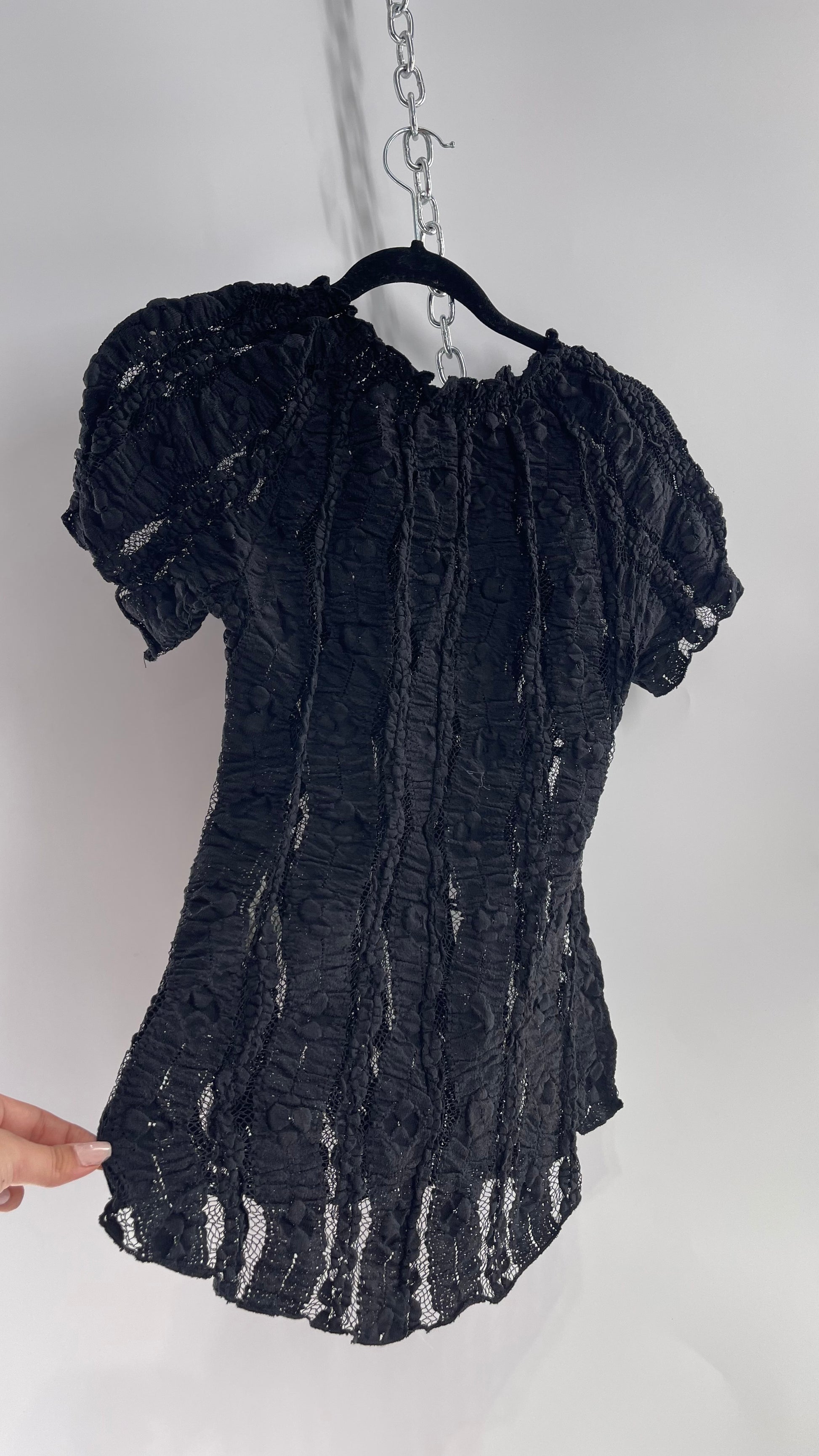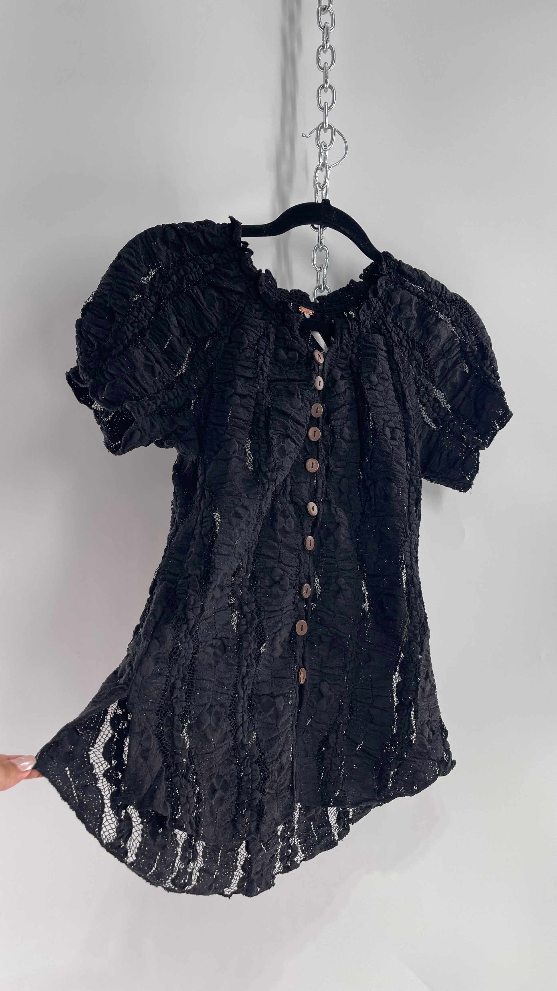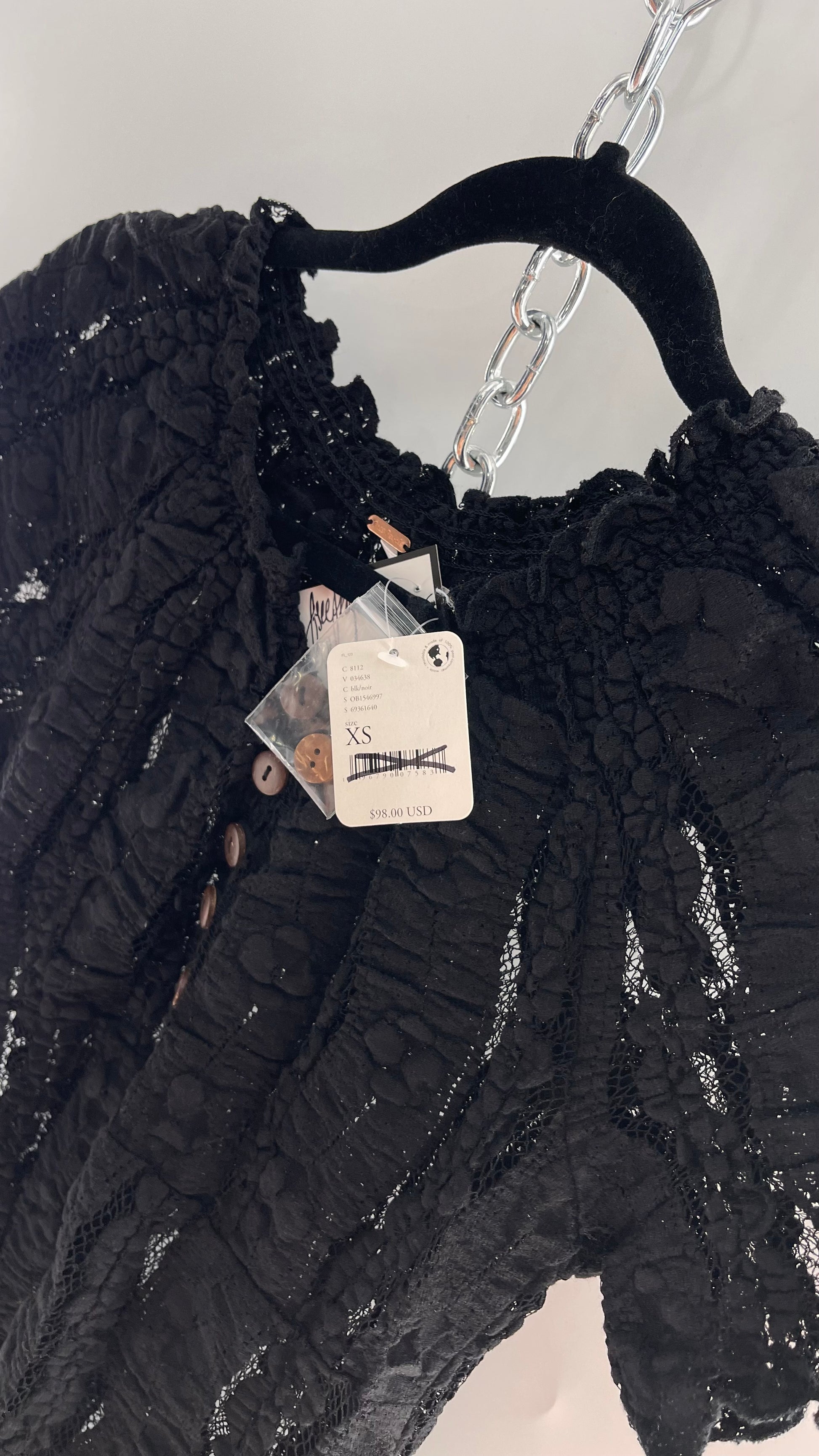 Free People Black Ruched Lace Puff Sleeve Blouse with Coconut Buttons and Tags Attached (XS)