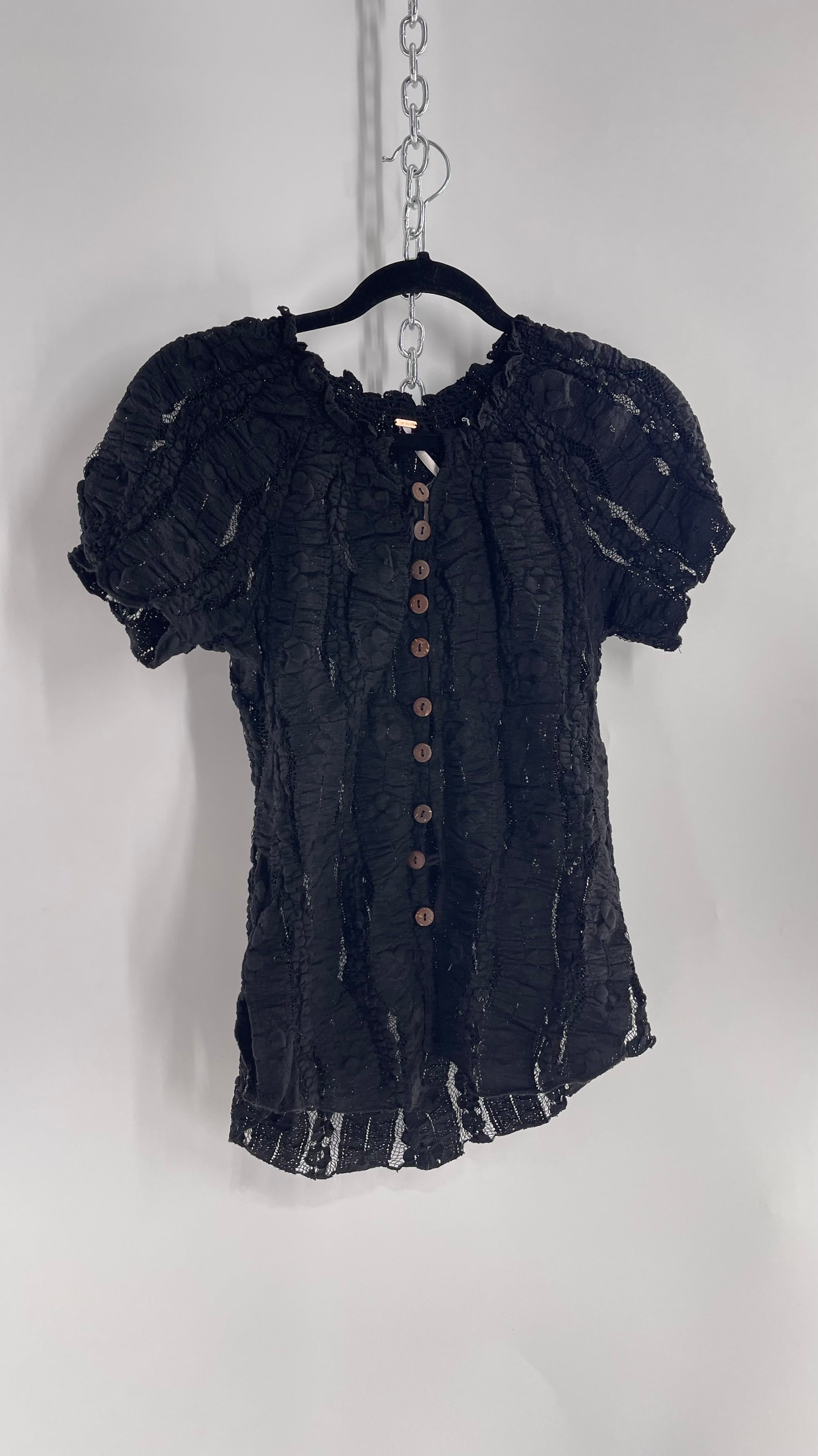 Free People Black Ruched Lace Puff Sleeve Blouse with Coconut Buttons