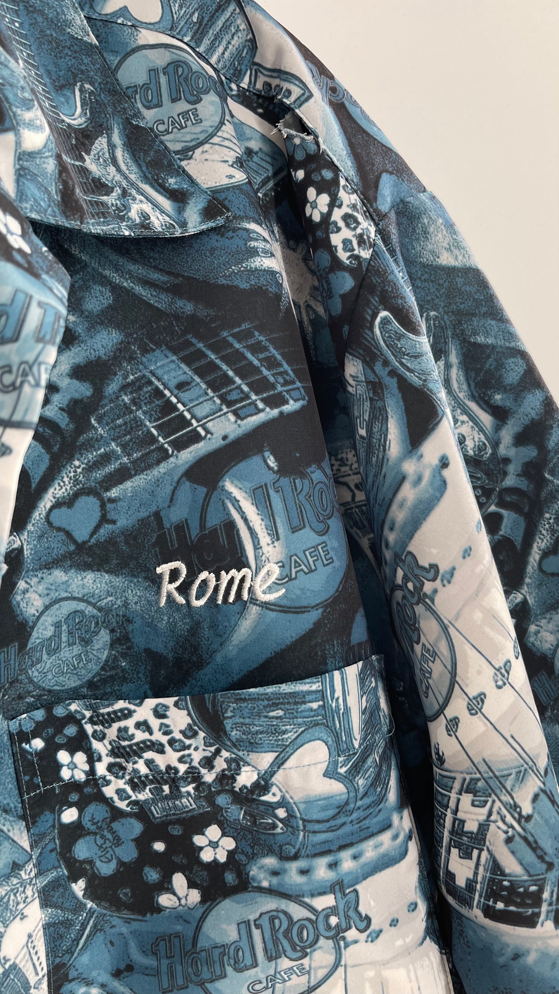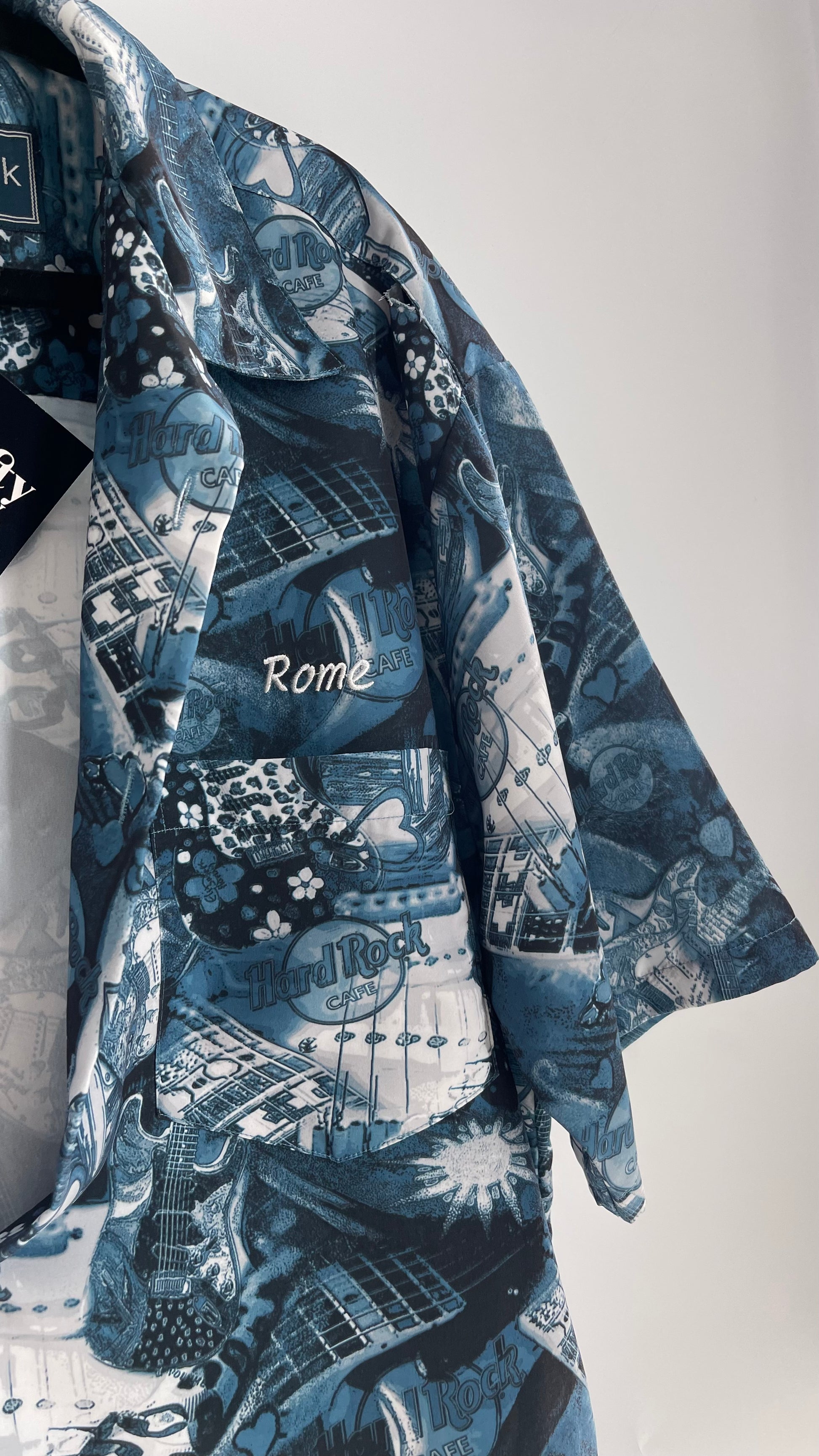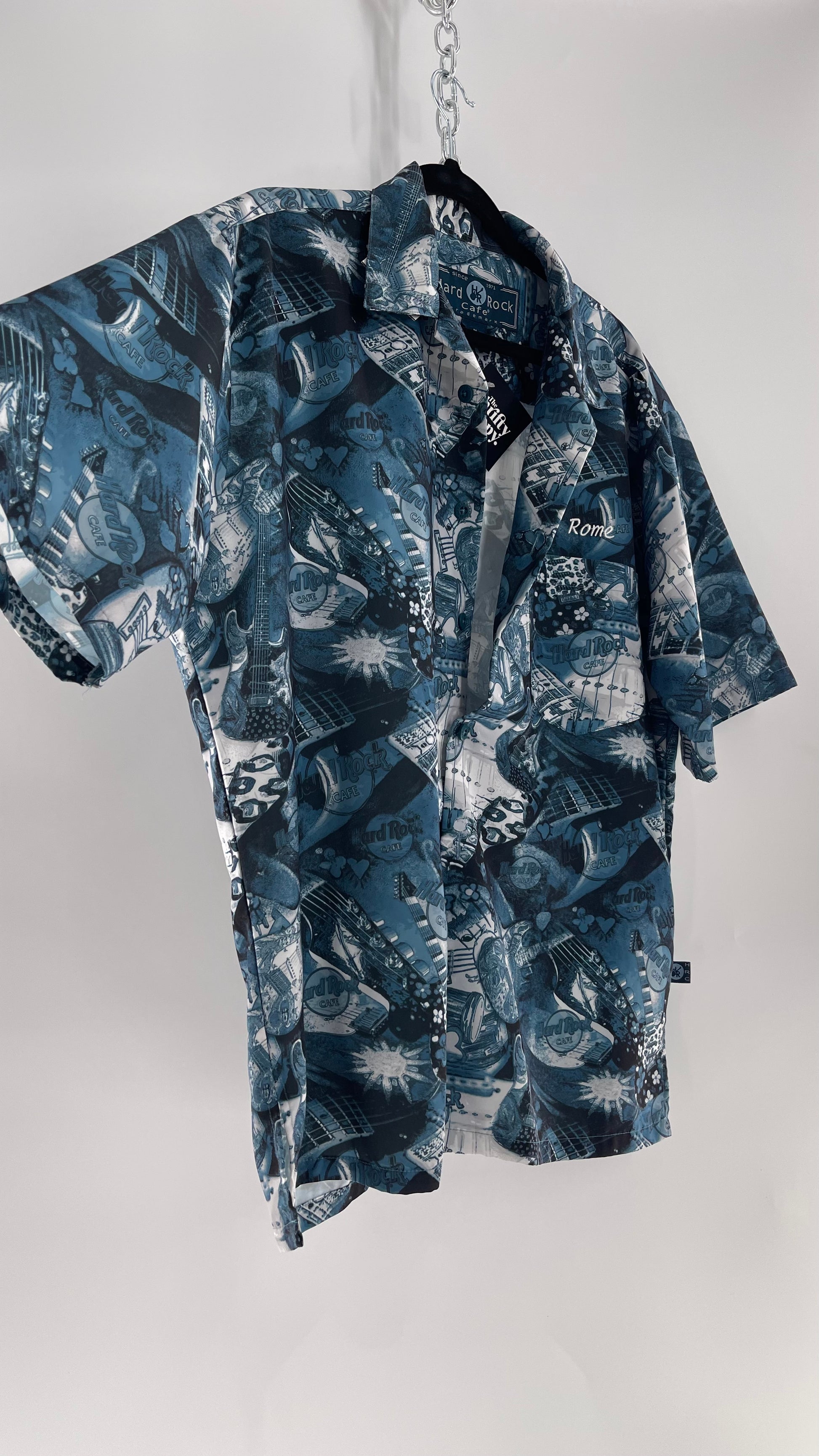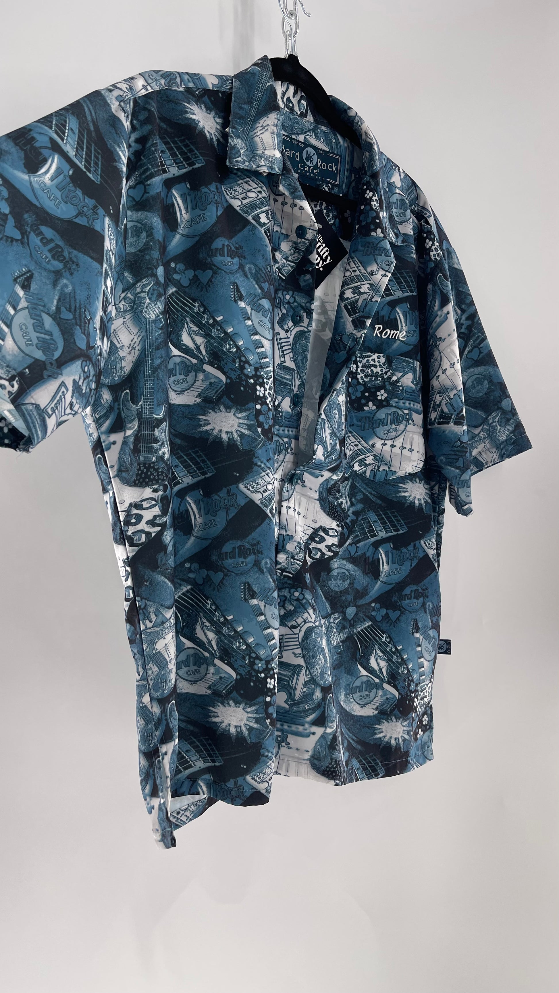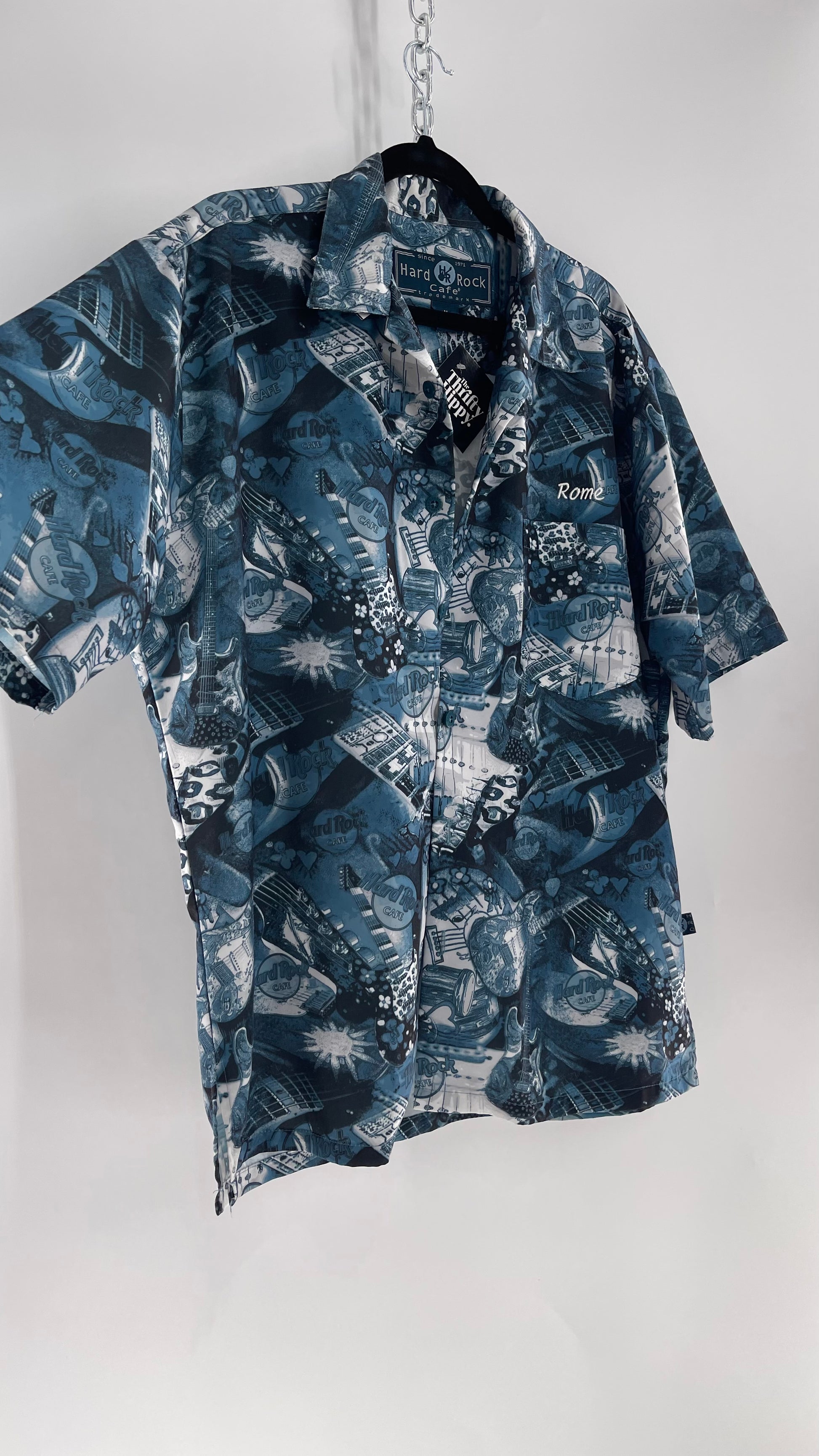 Vintage Hard Rock All Over Graphic Button Up Short Sleeve with Rome Embroidery (Medium)