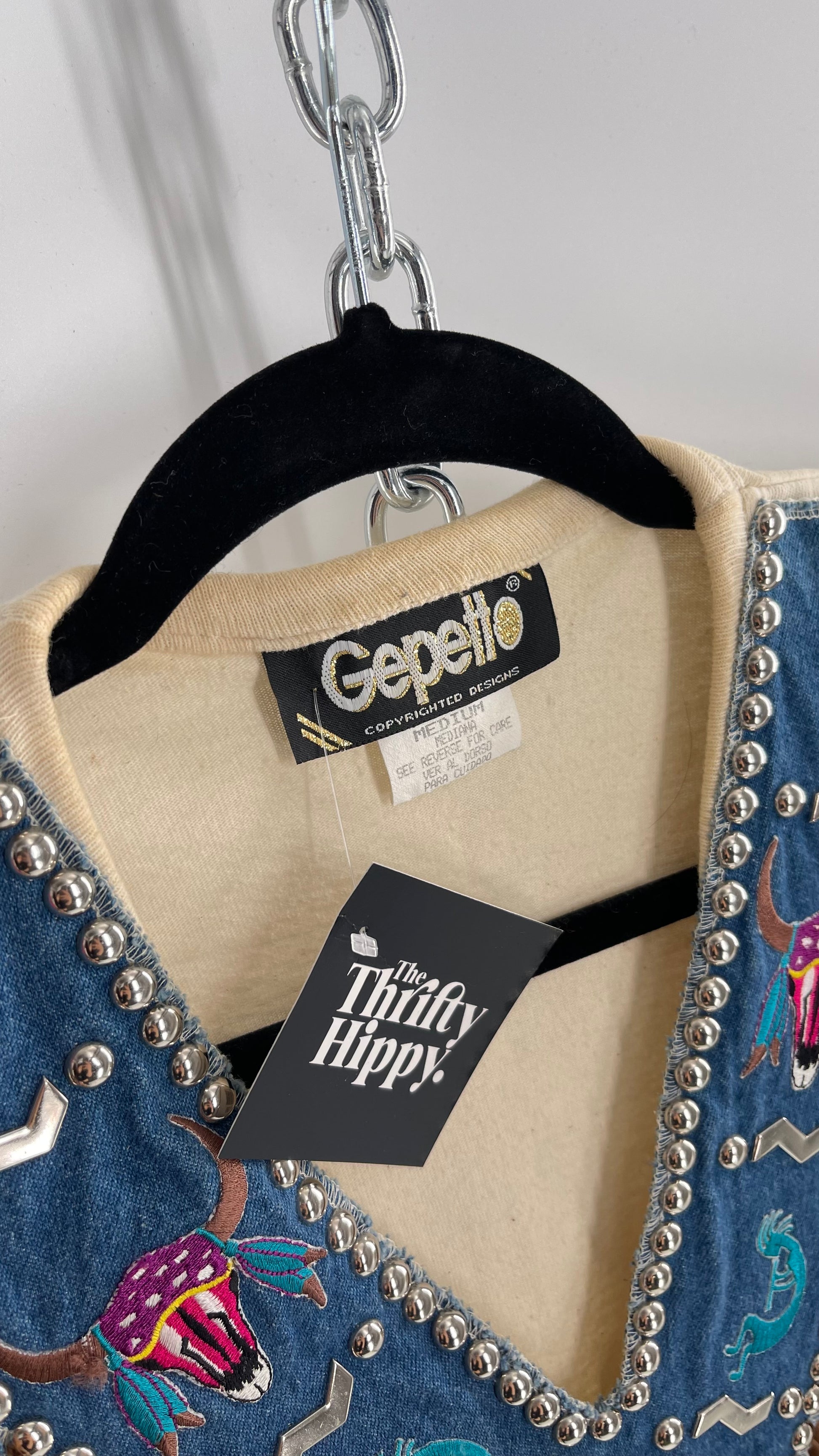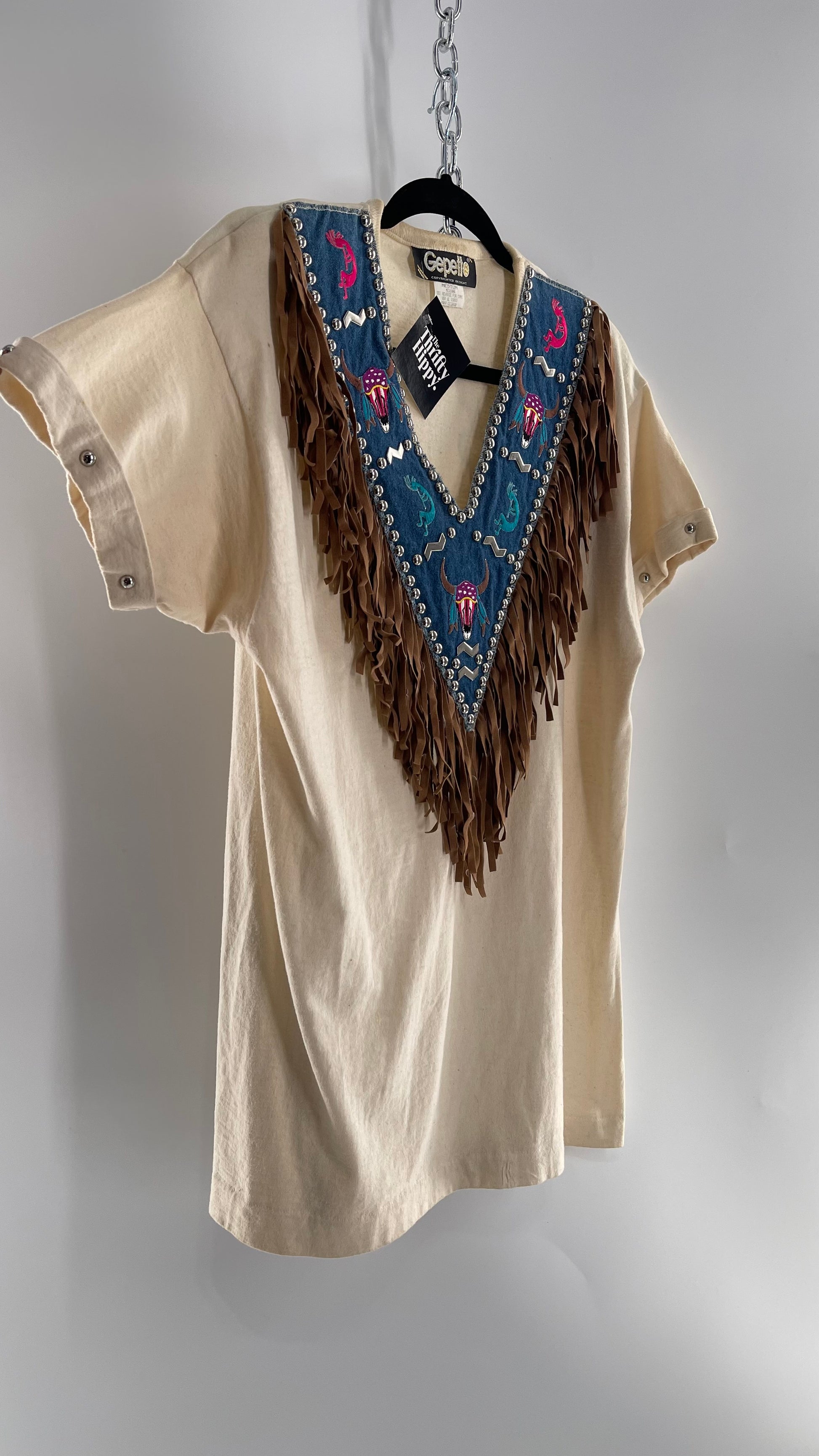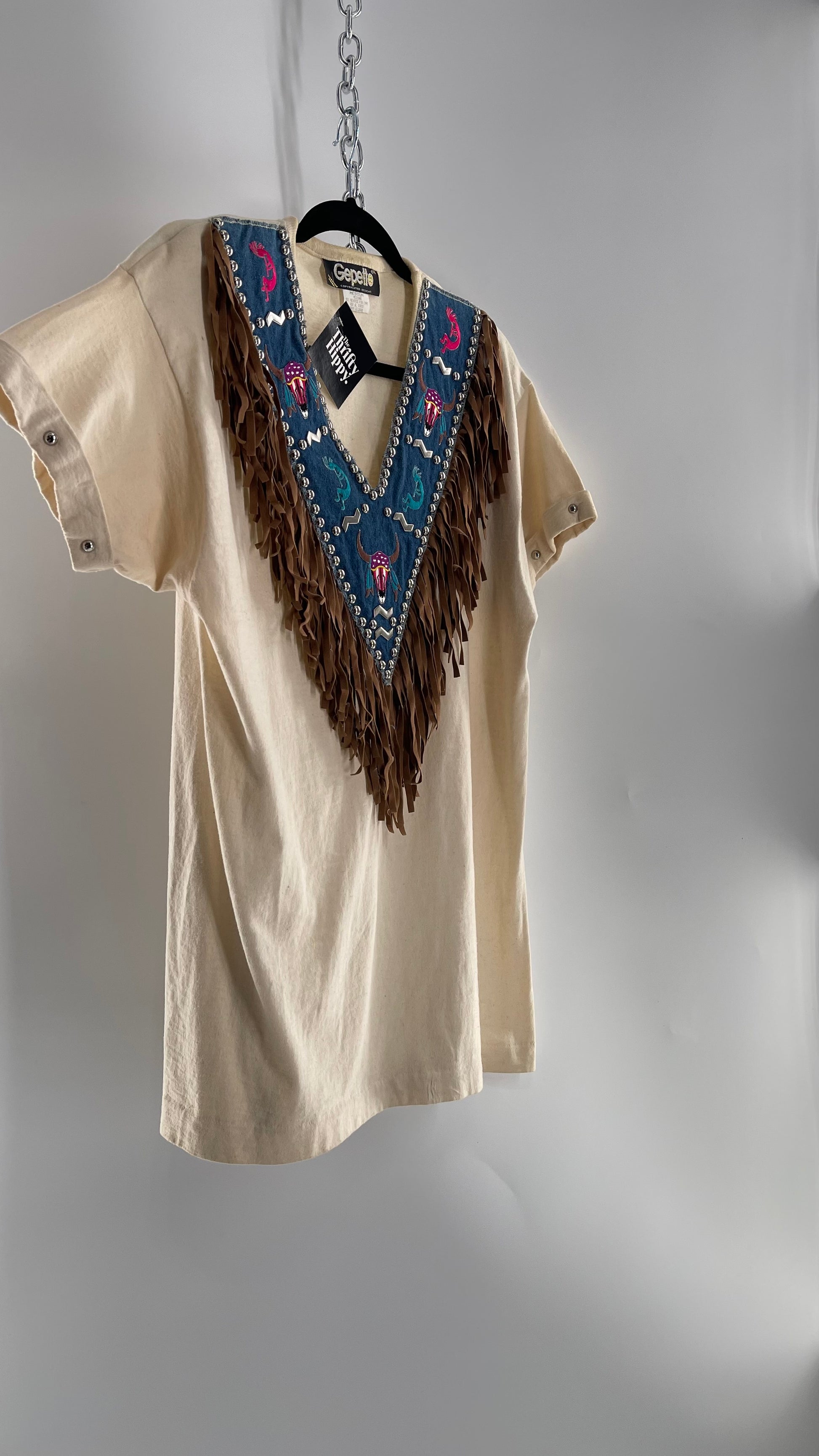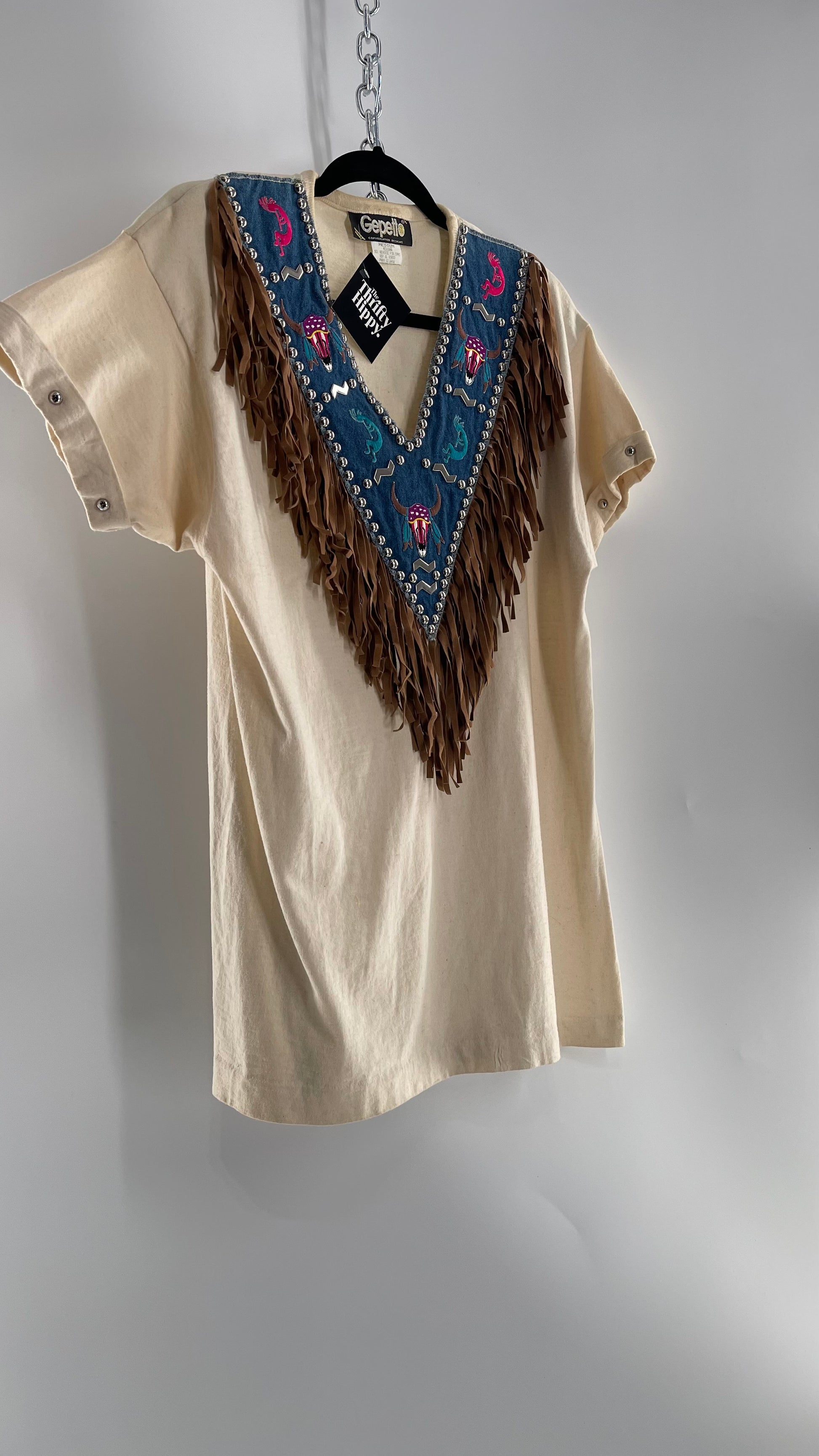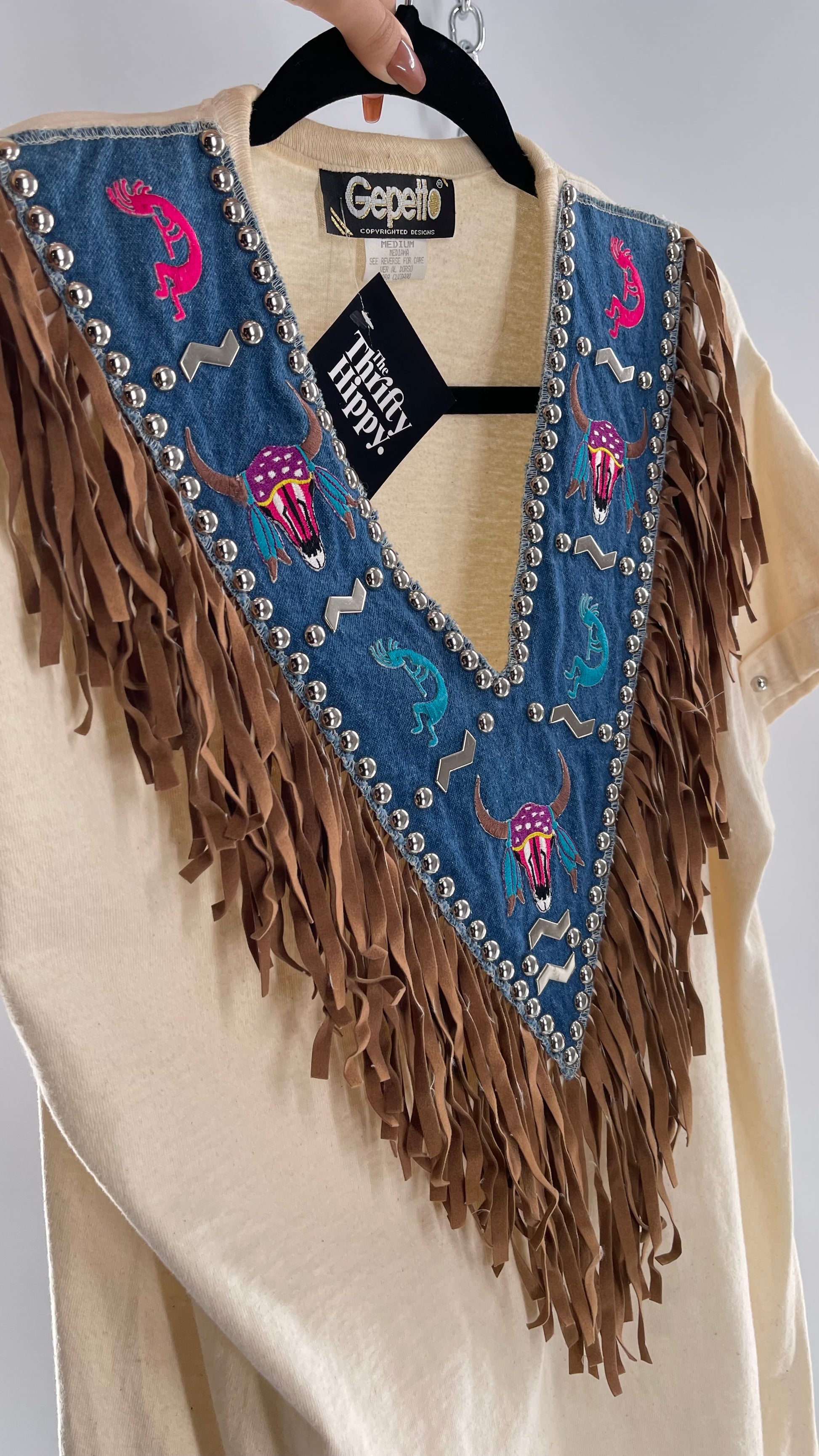 Vintage 1980s GEPETTO Off White Rodeo Western T Shirt with Denim Lined V Neck, Faux Leather Fringe Detail, Embroidery, and Heavy Duty Studs