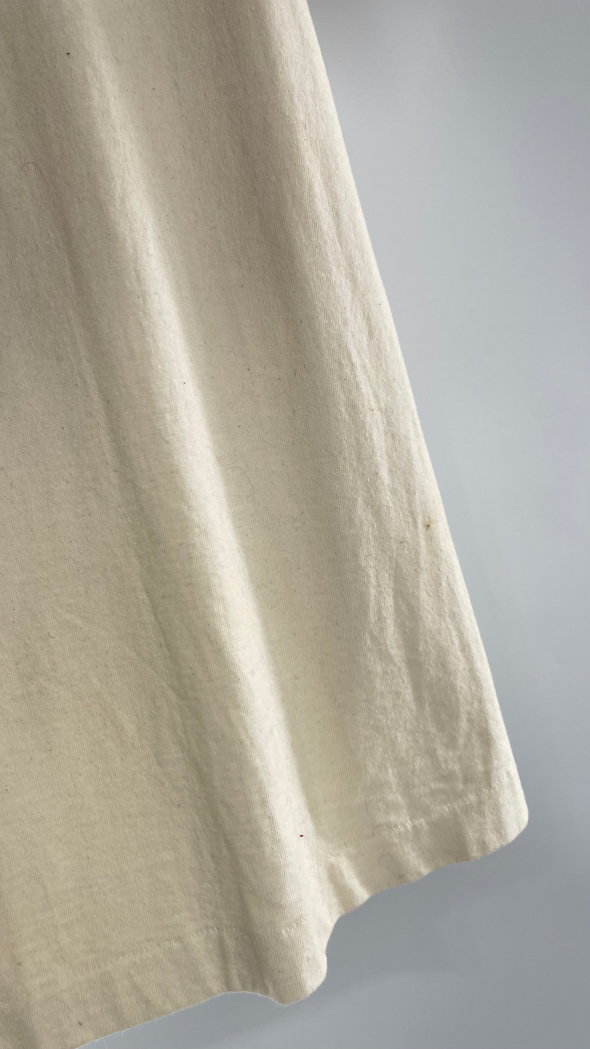 Vintage 1980s GEPETTO Off White Western T Shirt with Denim Lined V Neck Detail with Faux Leather Fringe Detail and Embroidery