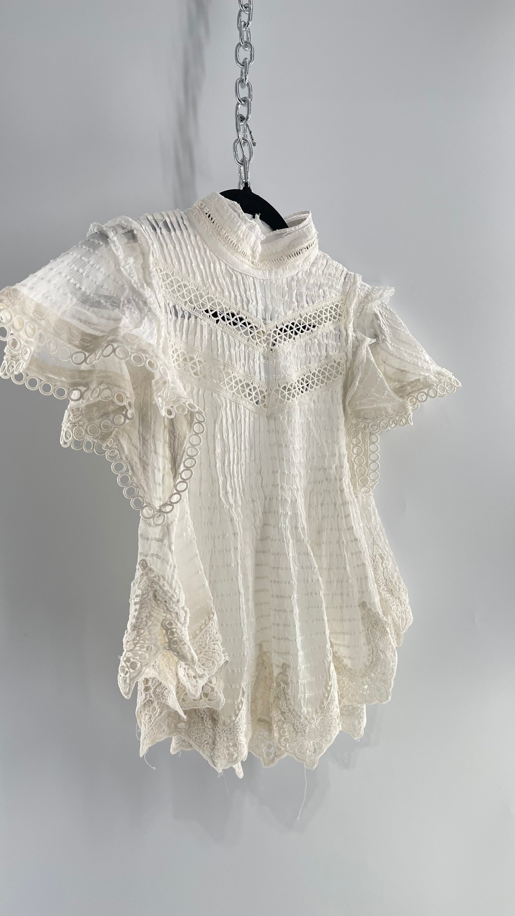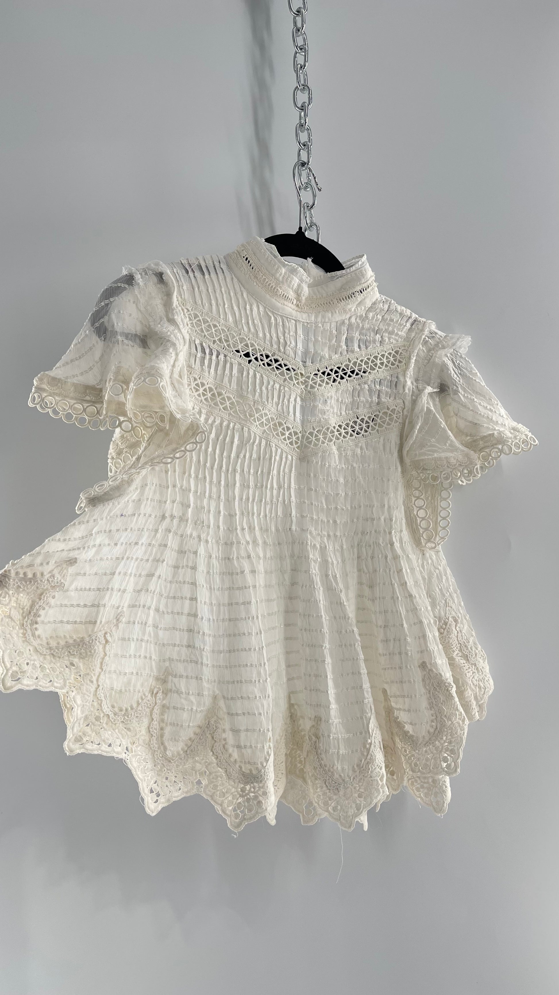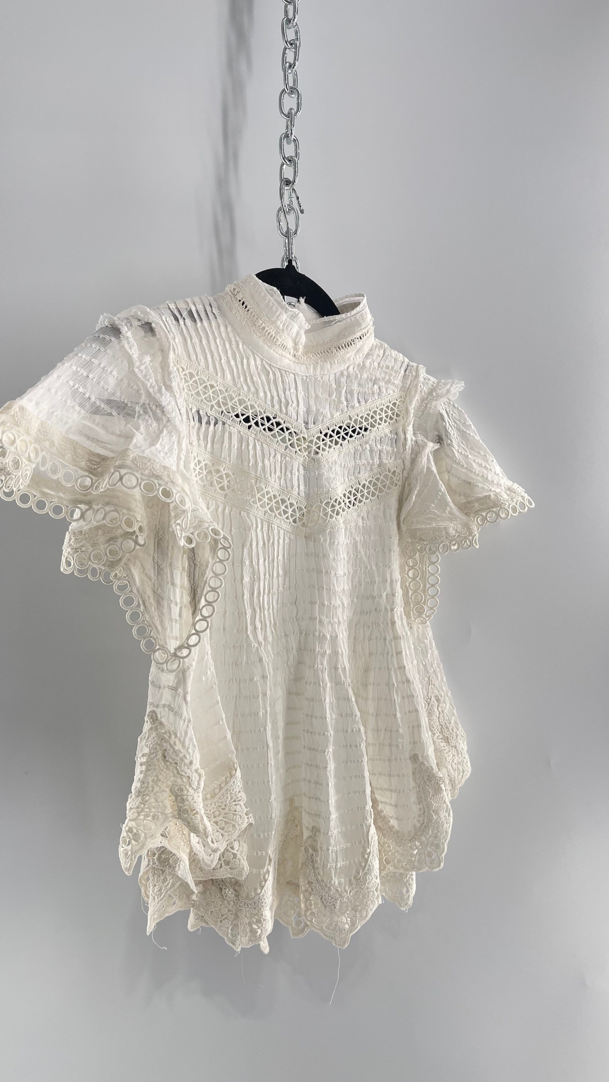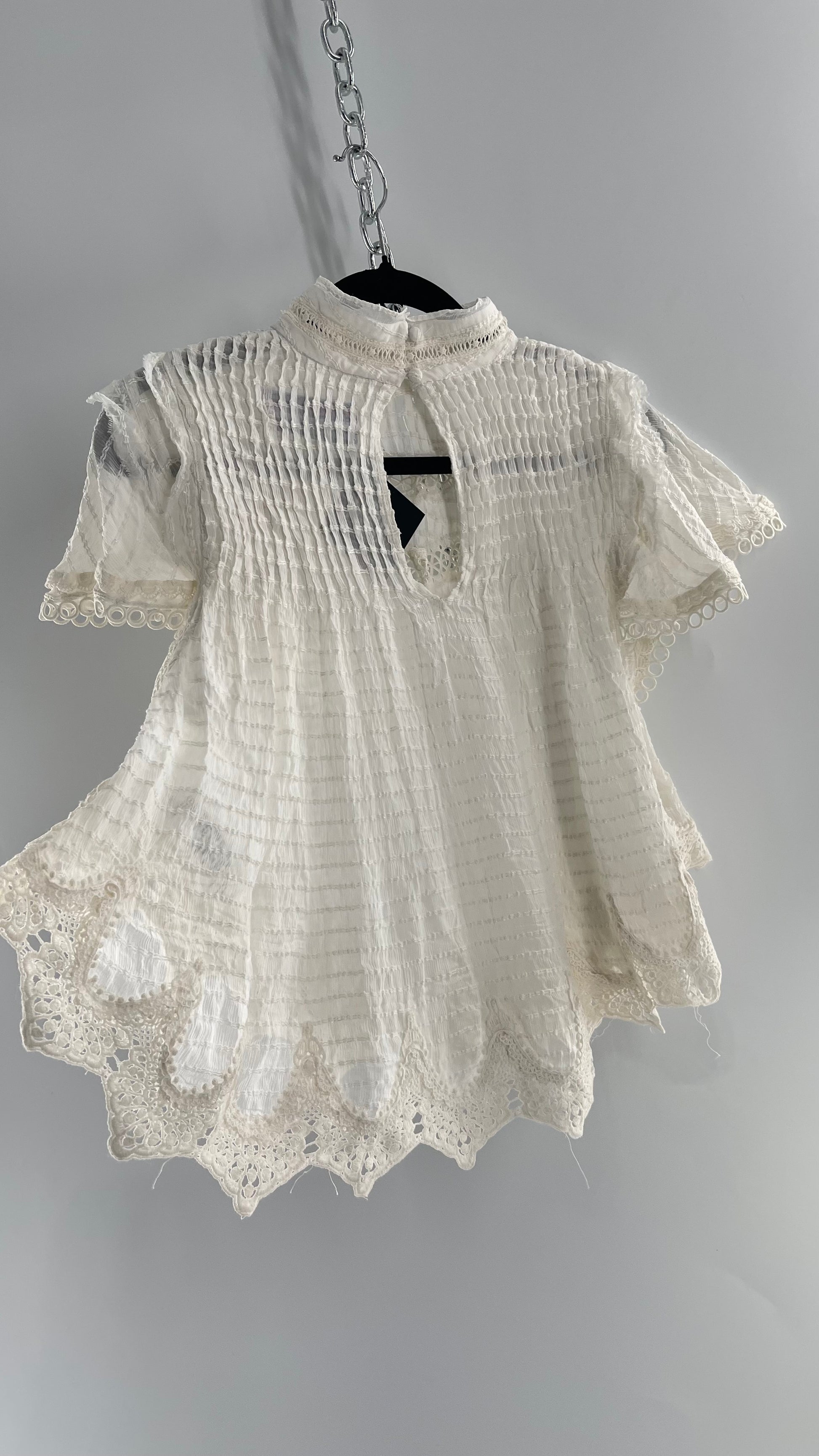 Kimchi Blue White 68% Viscose 32% Cotton Romantic Blouse with High Neck, Textured Body, and Scalloped Lace Hem and Sleeves (Small)