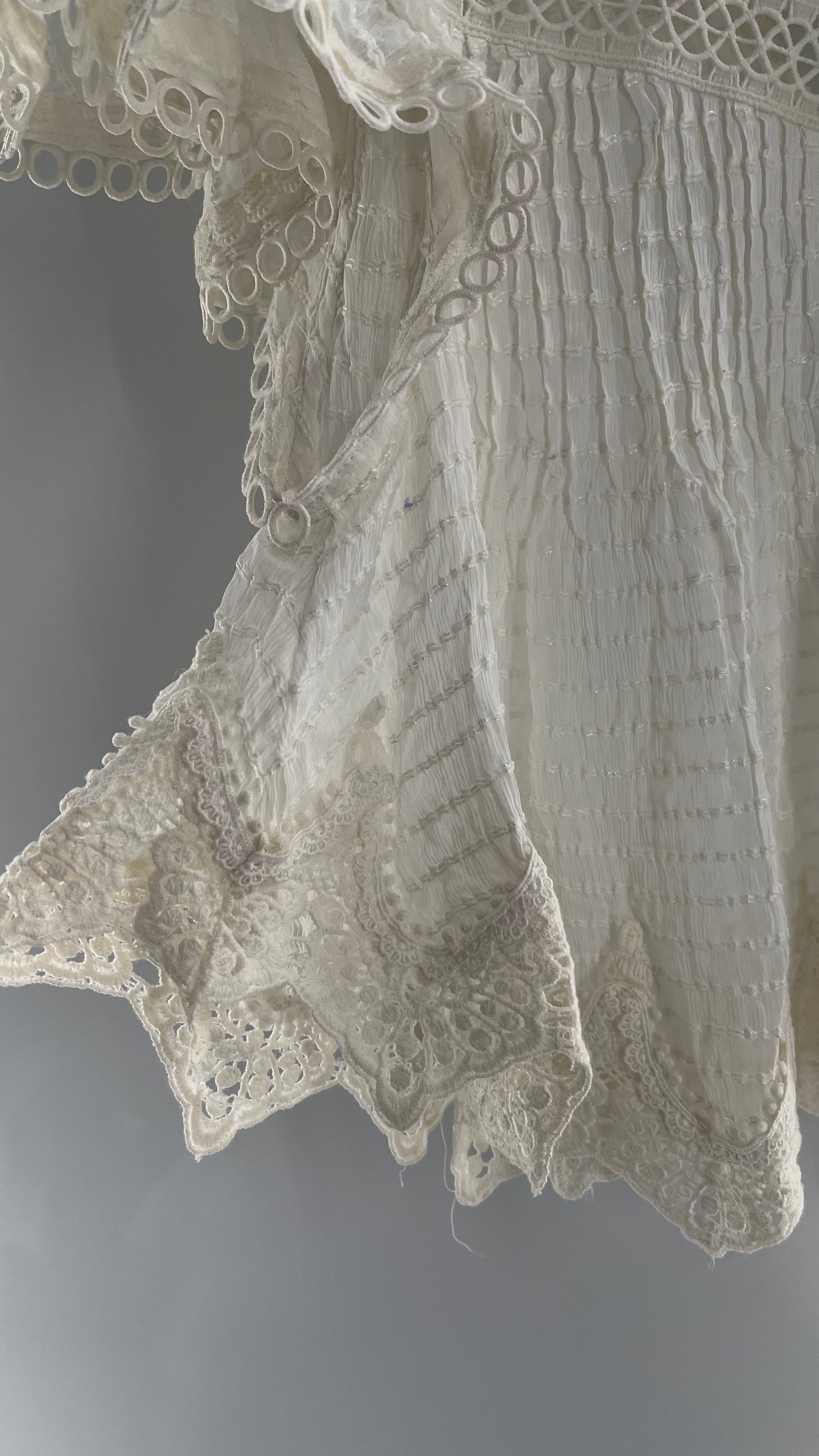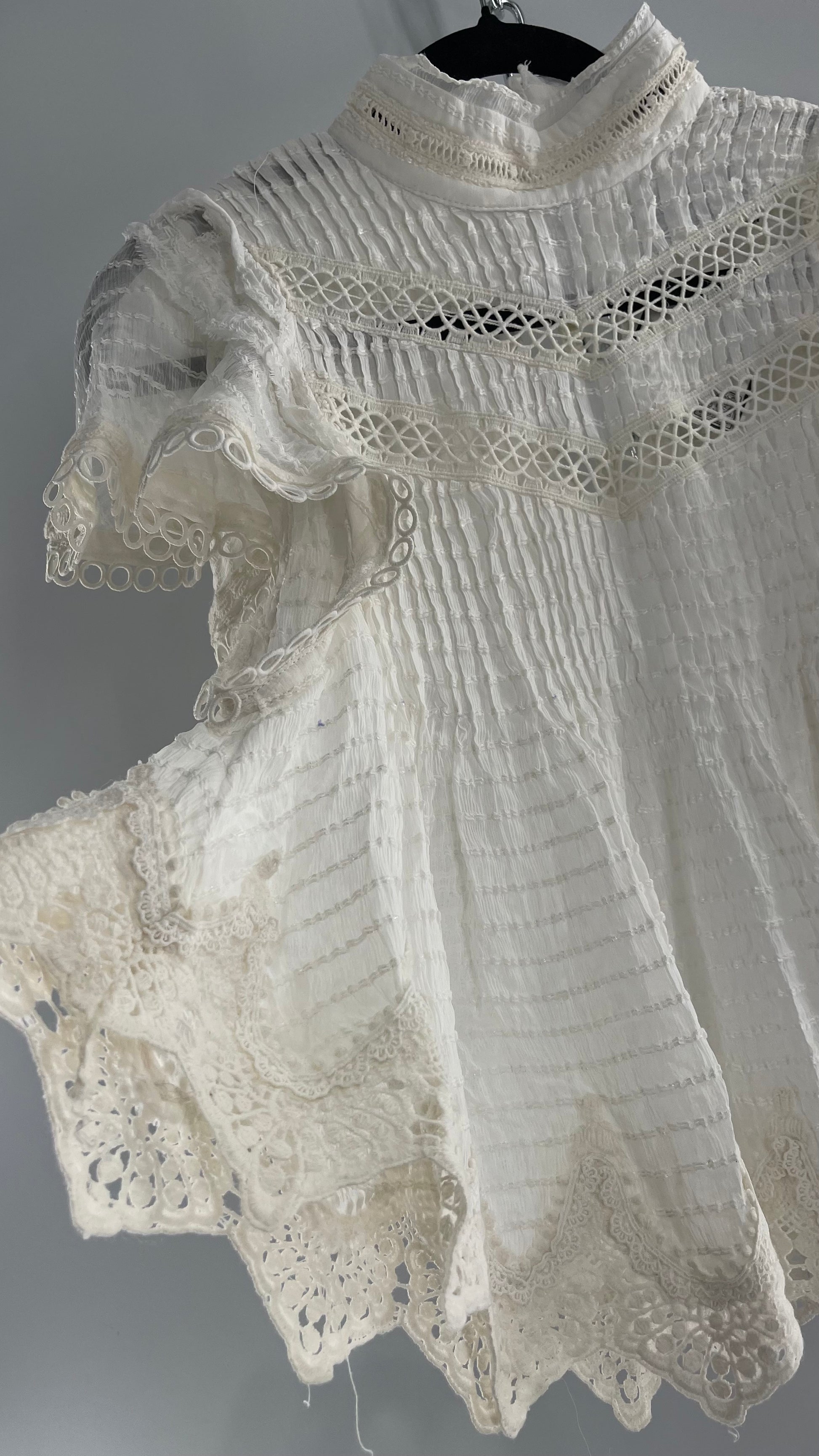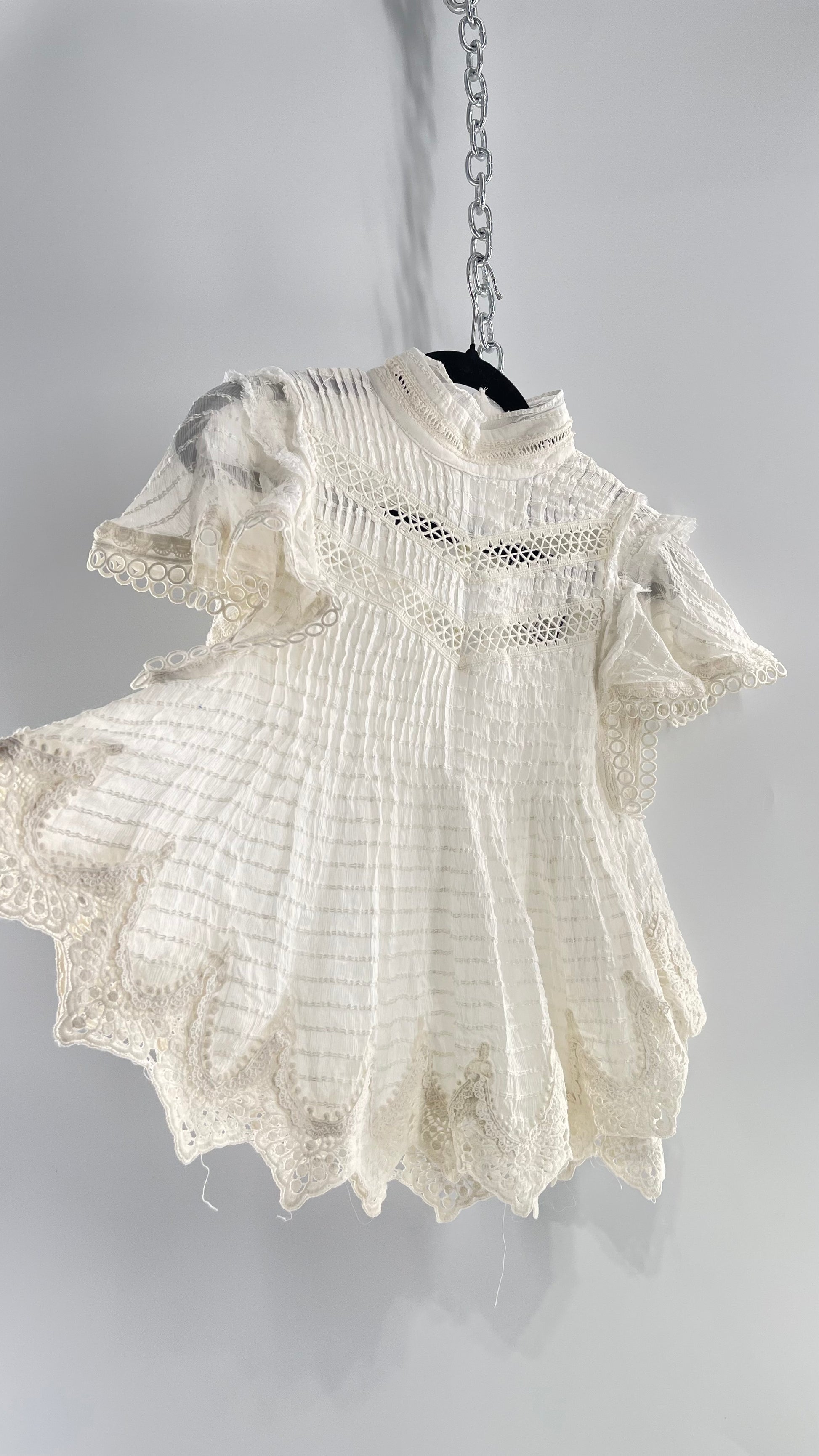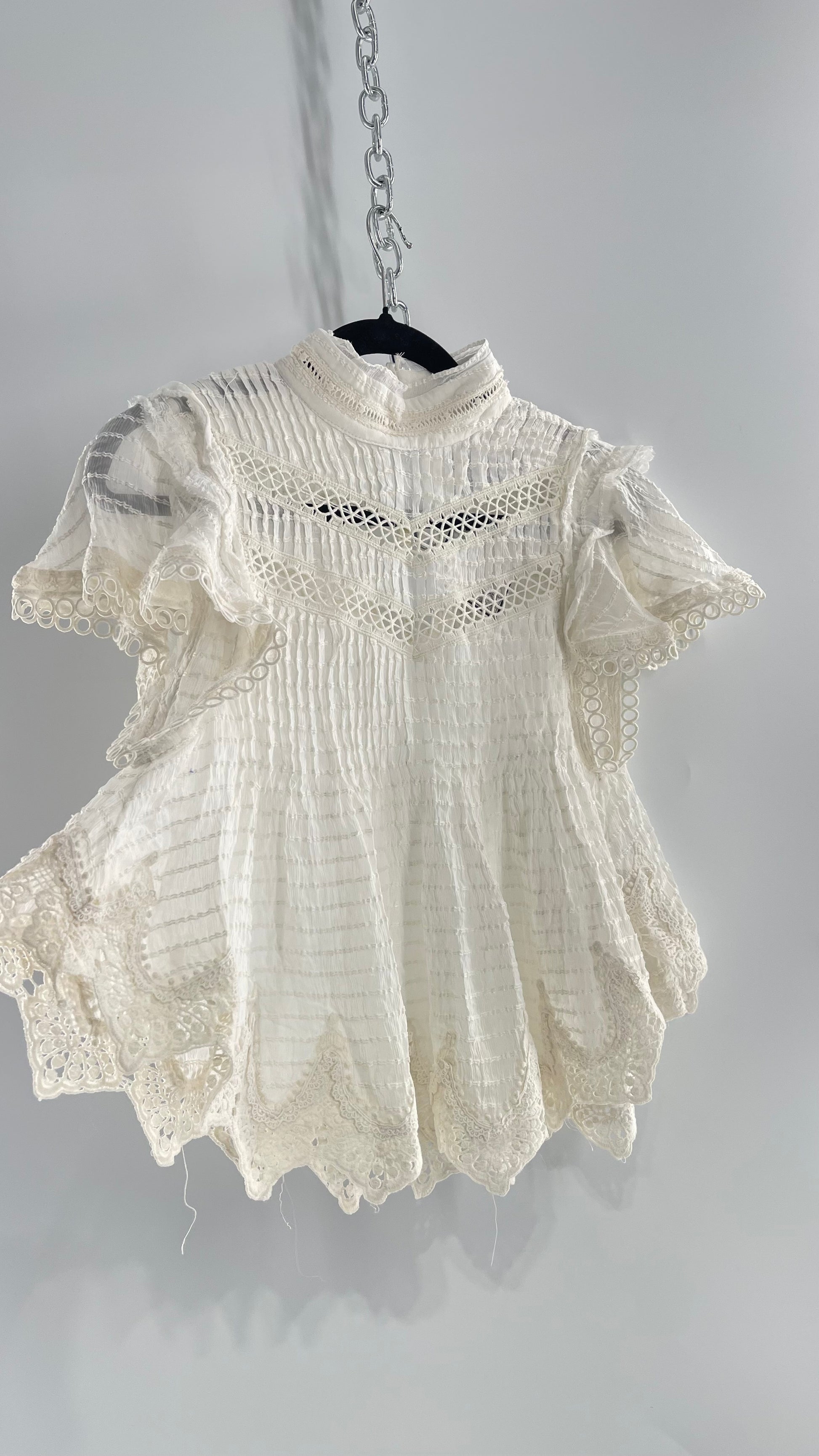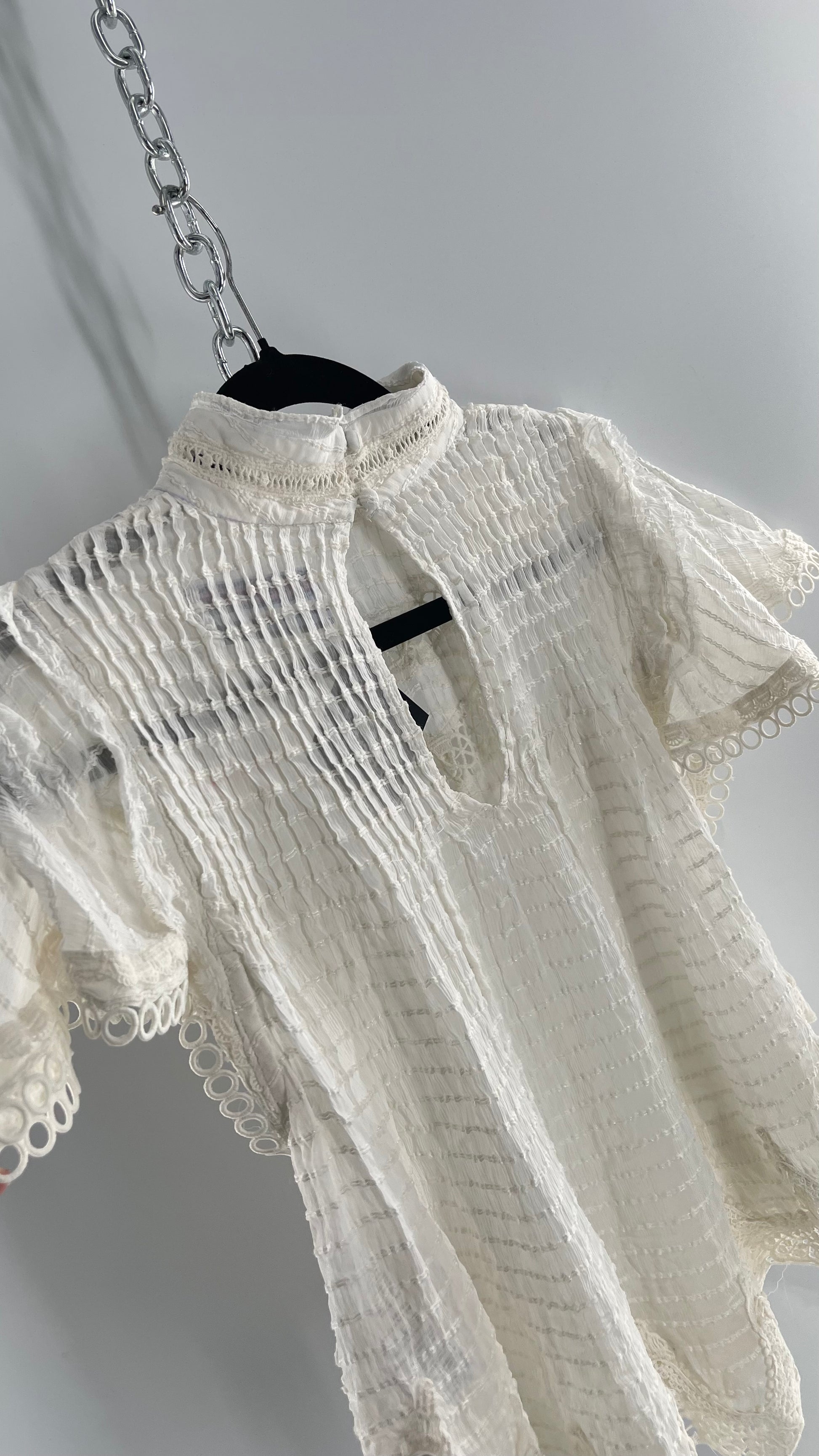 Kimchi Blue White 68% Viscose 32% Cotton Romantic Blouse with High Neck, Textured Body, and Scalloped Lace Hem and Sleeves (Small)