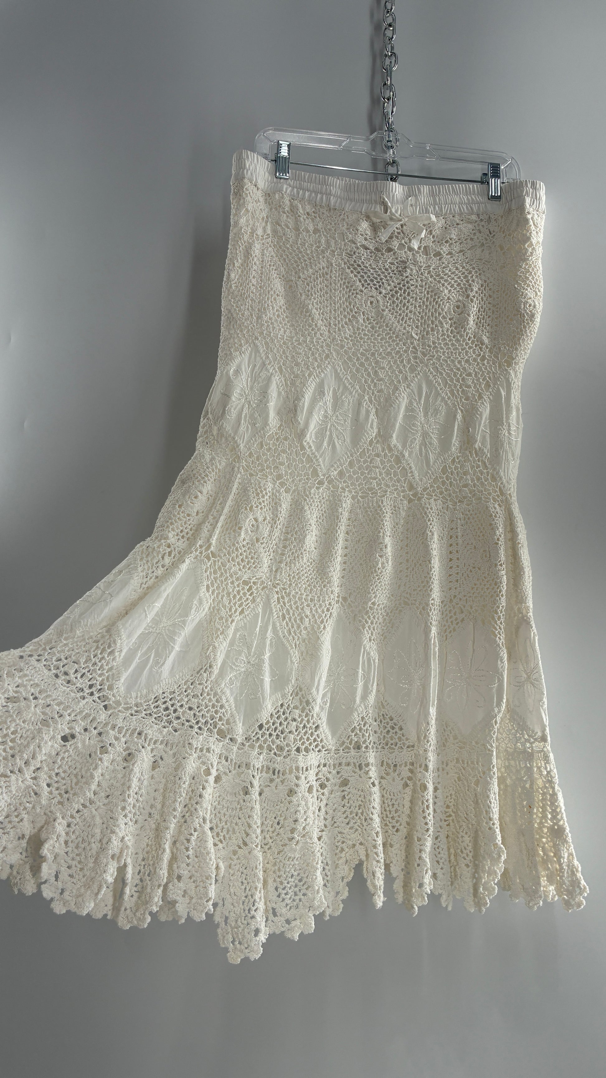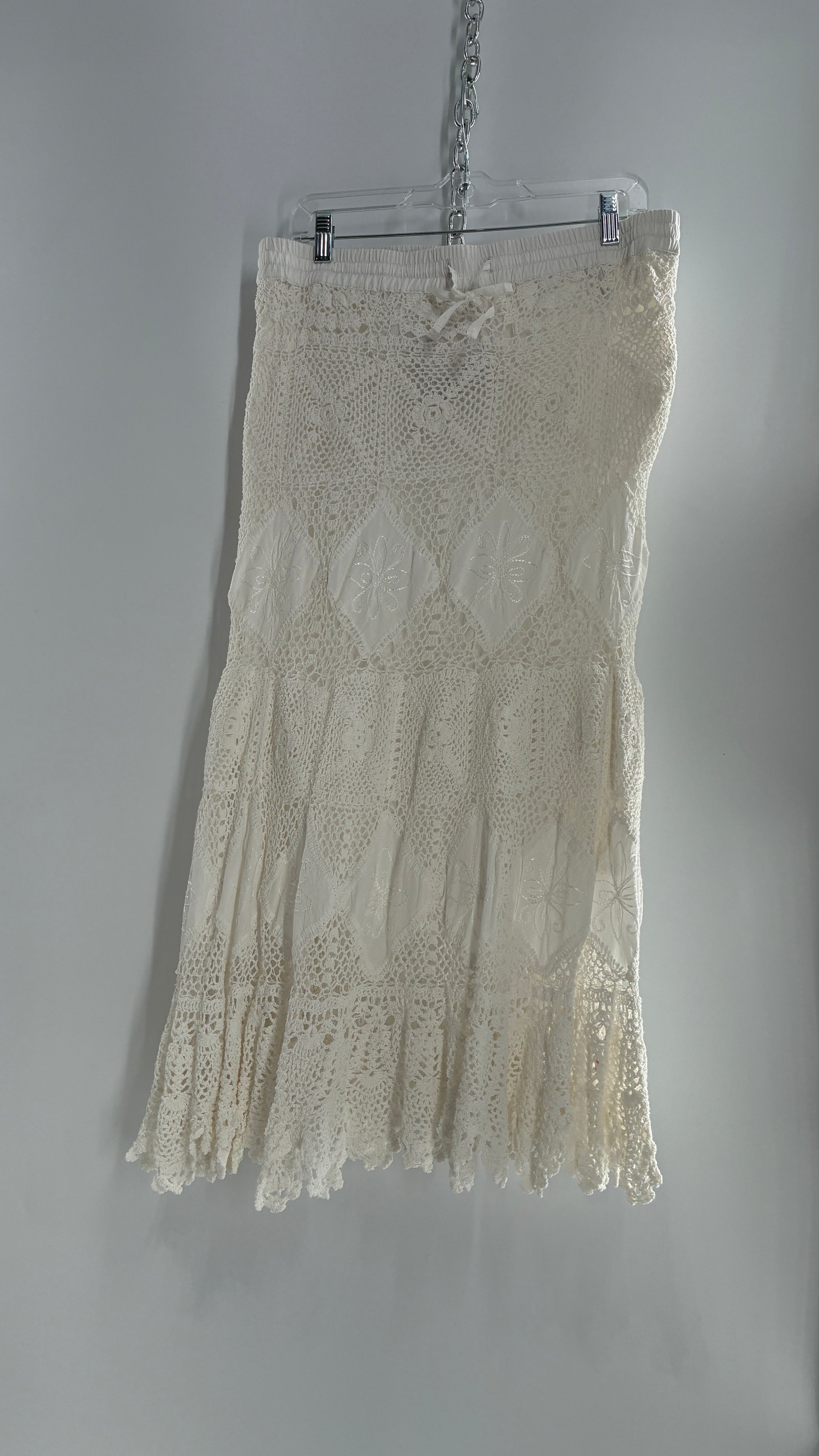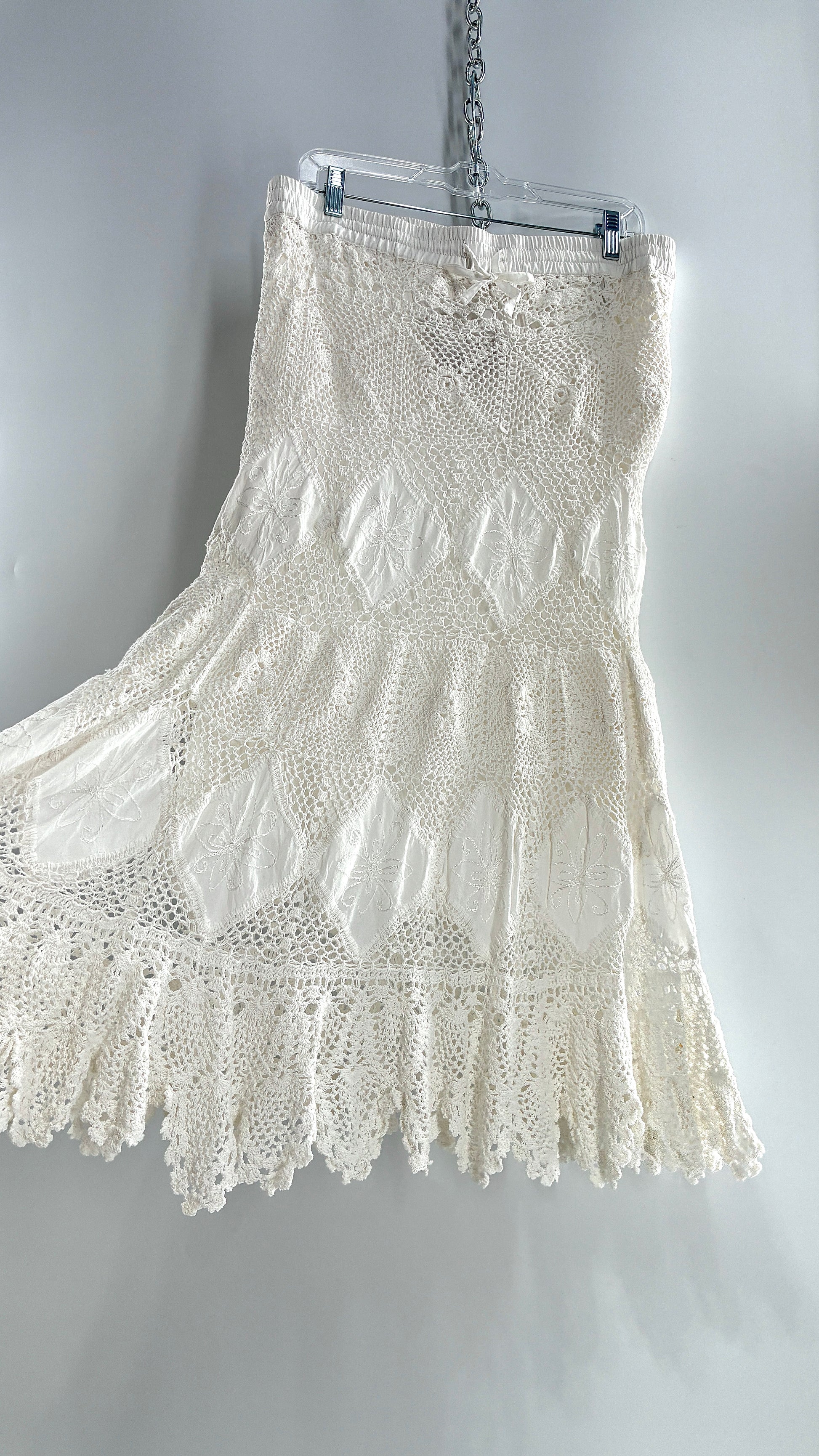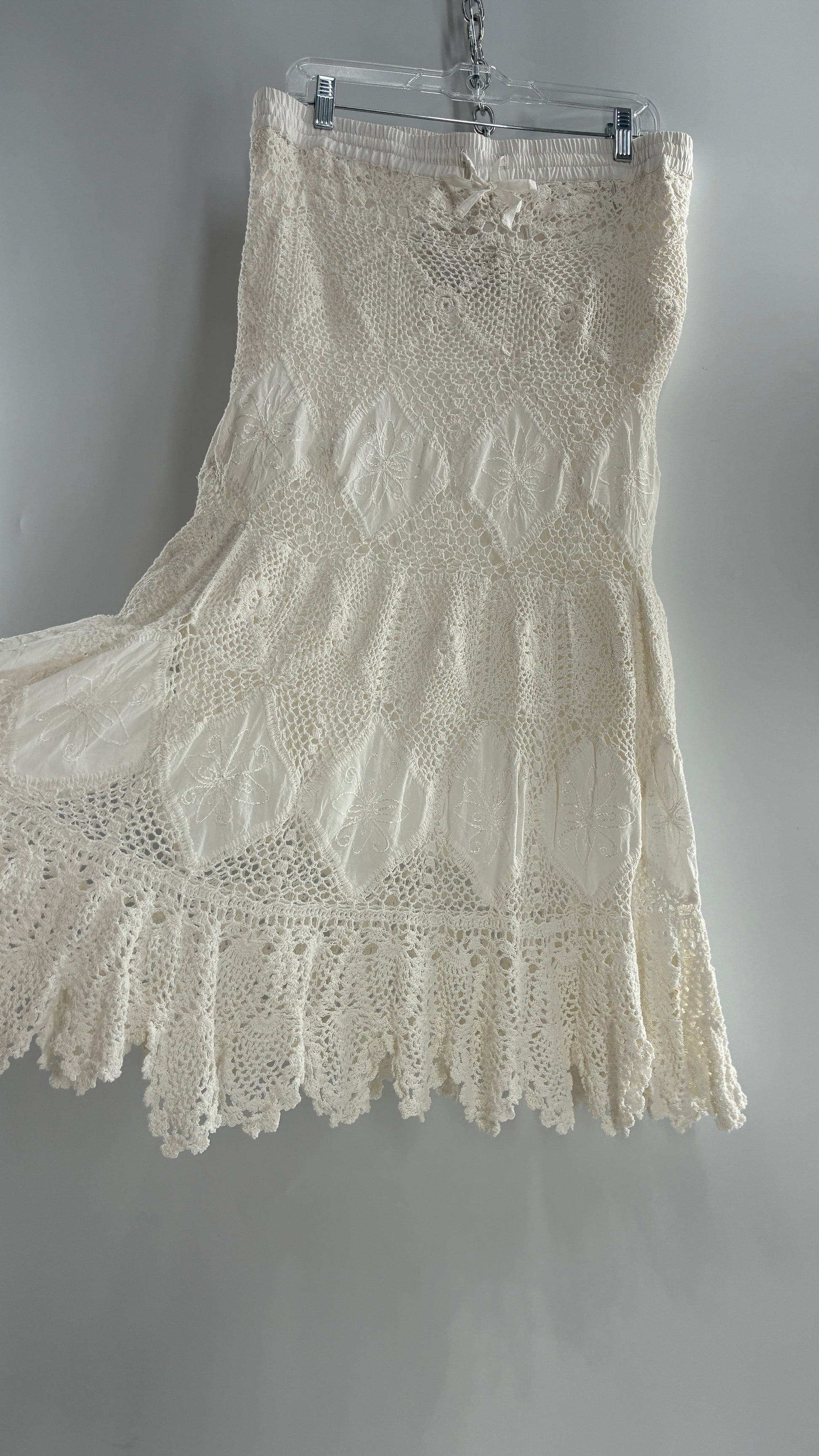 Vintage Full Length White Crochet and Appliqué Skirt (Petite Medium)