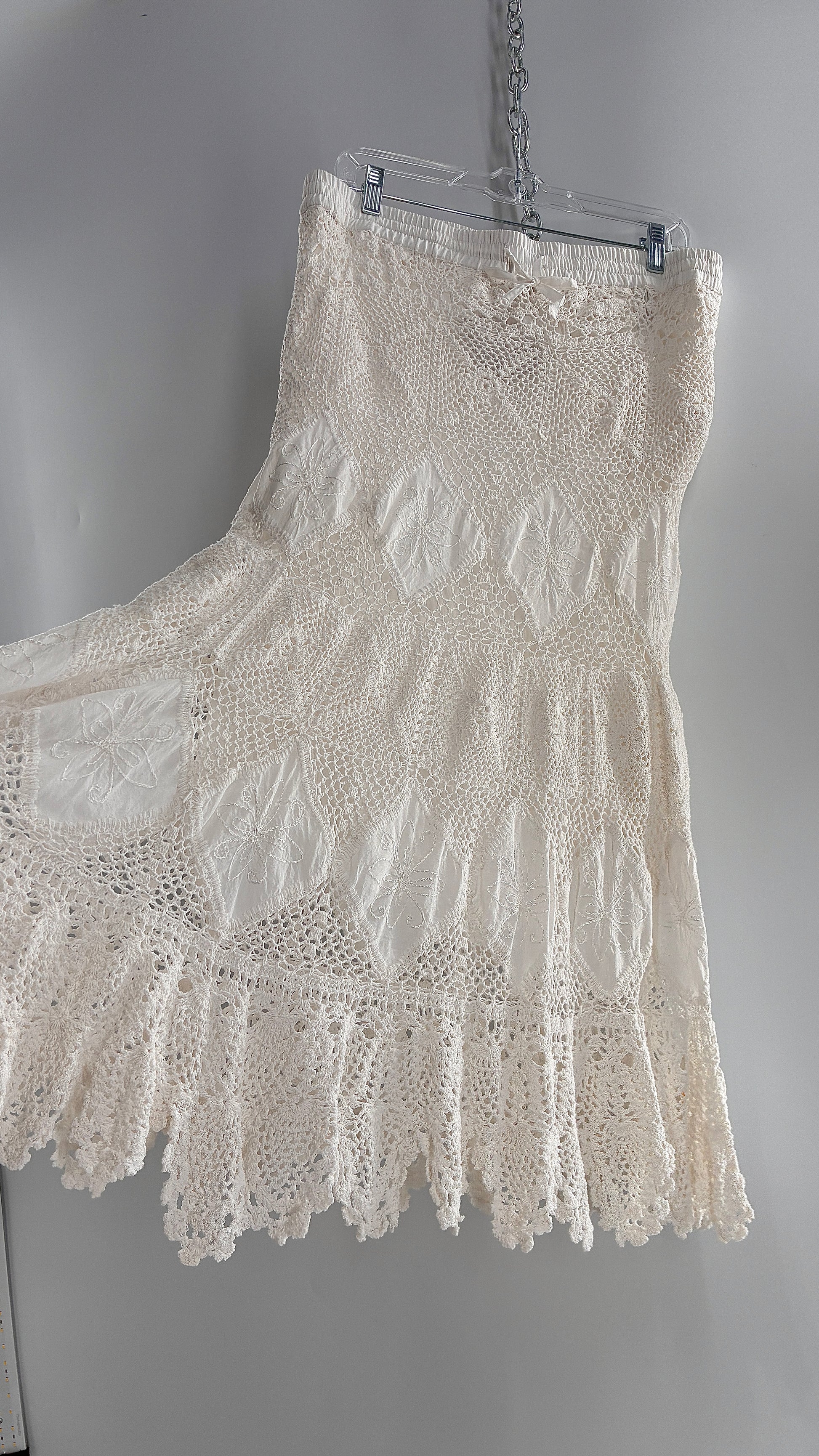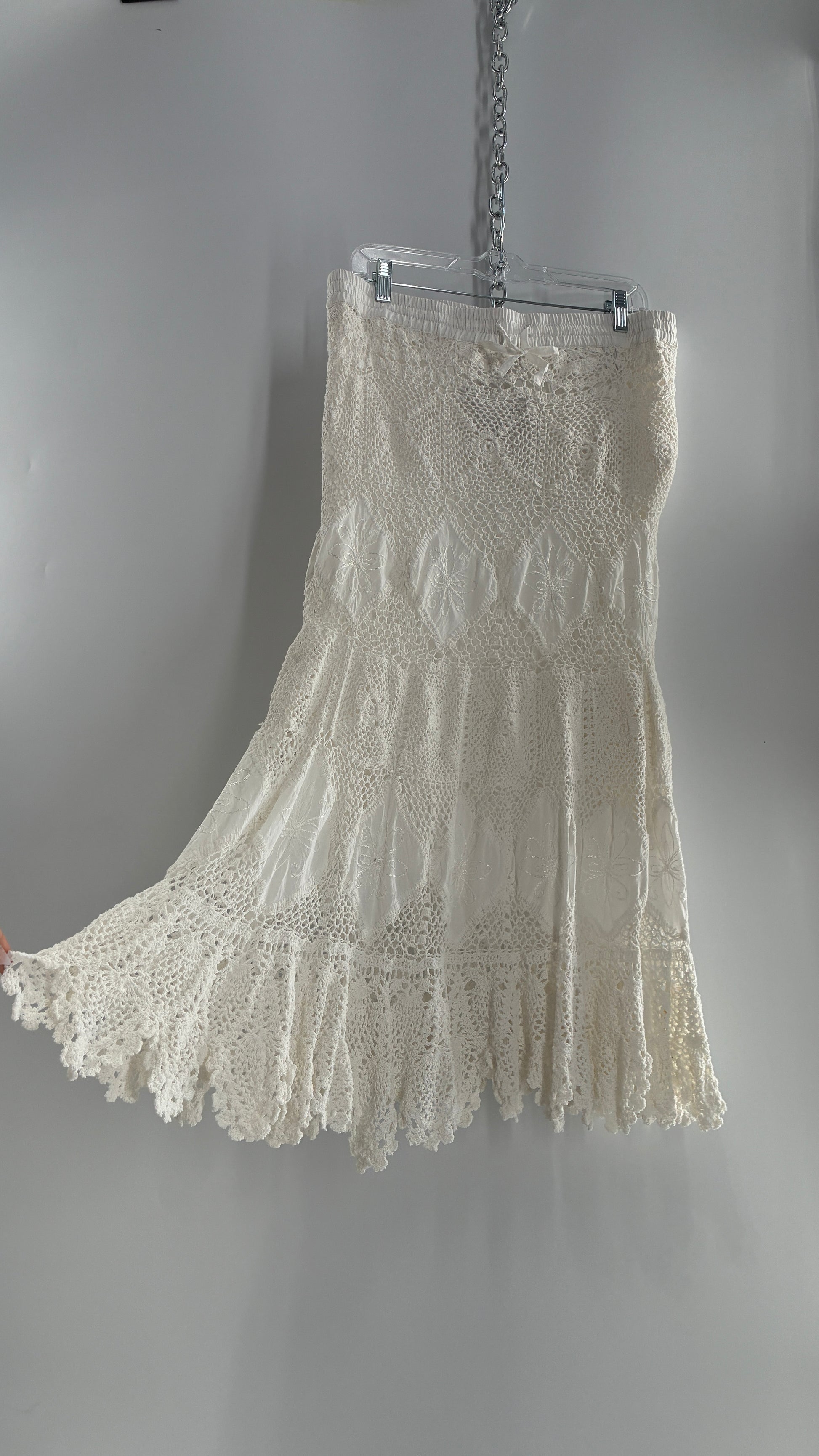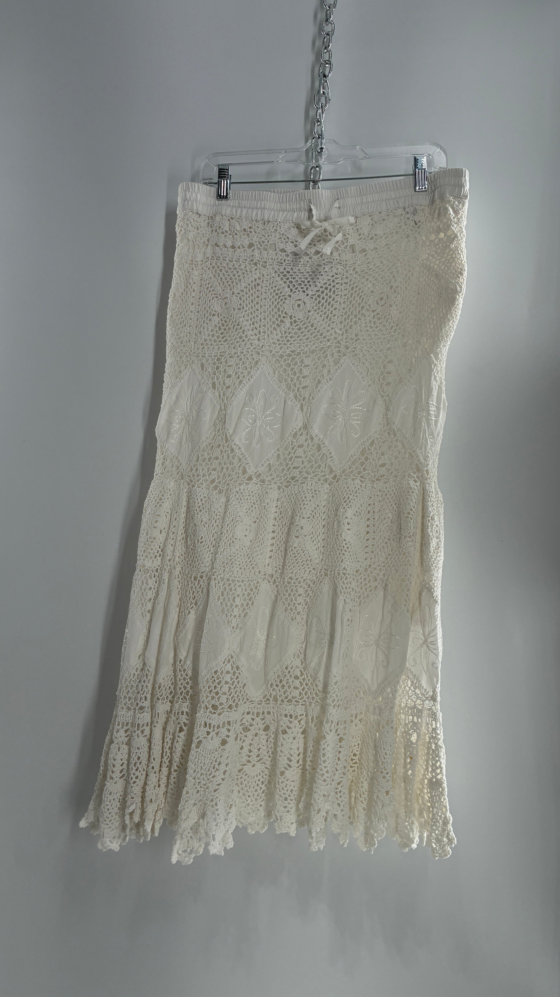 Vintage Full Length White Crochet and Appliqué Skirt (Petite Medium)