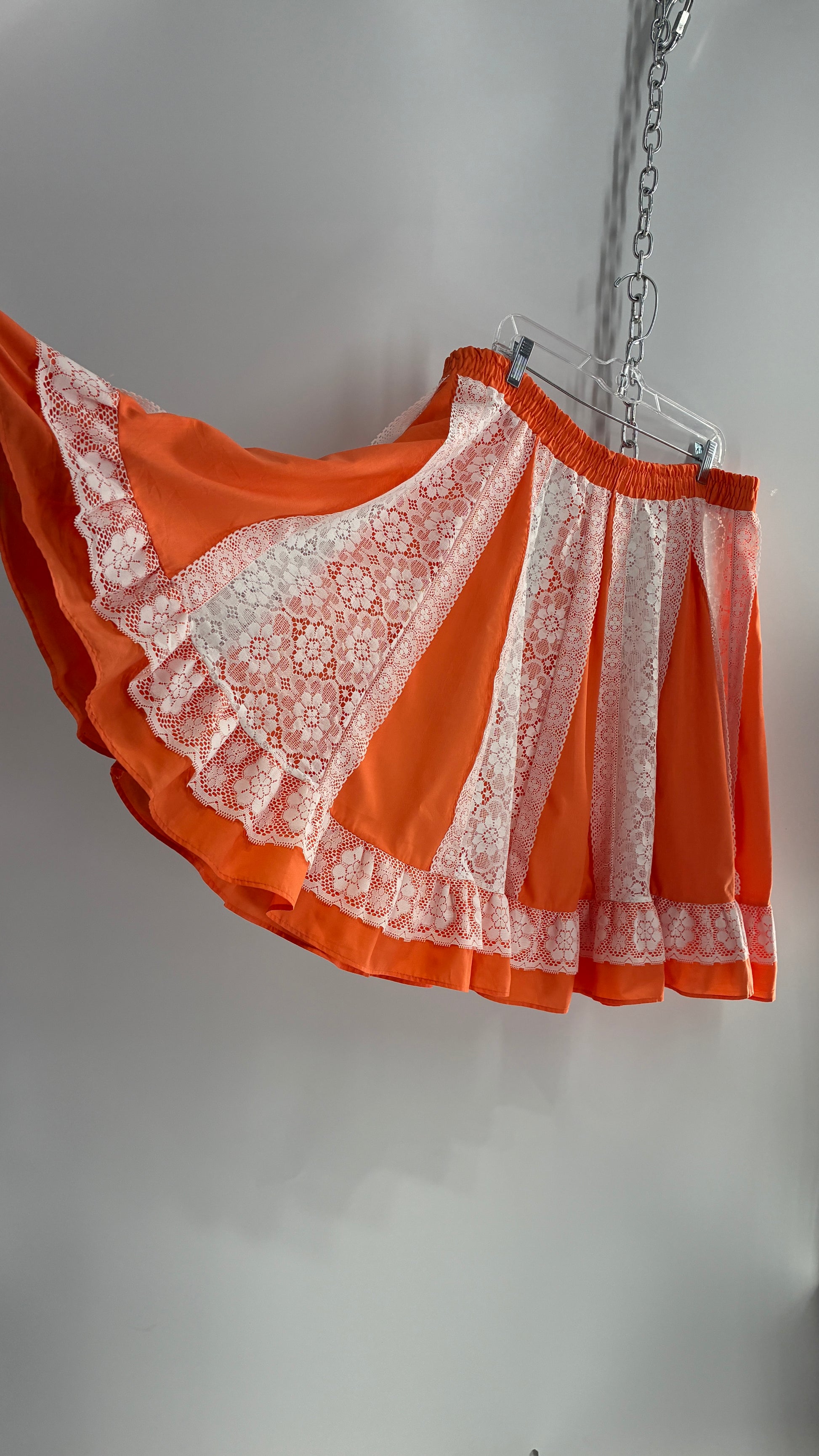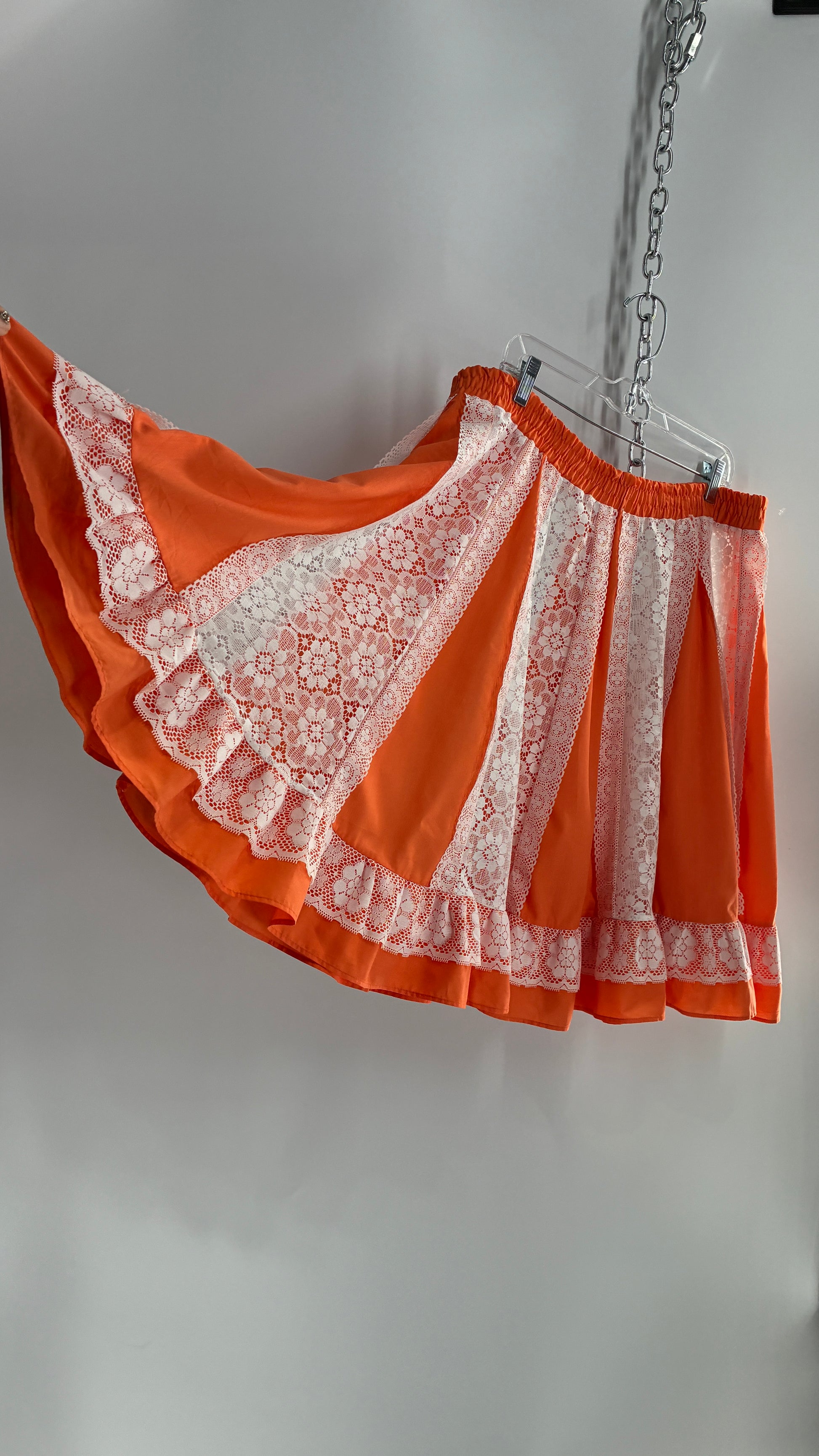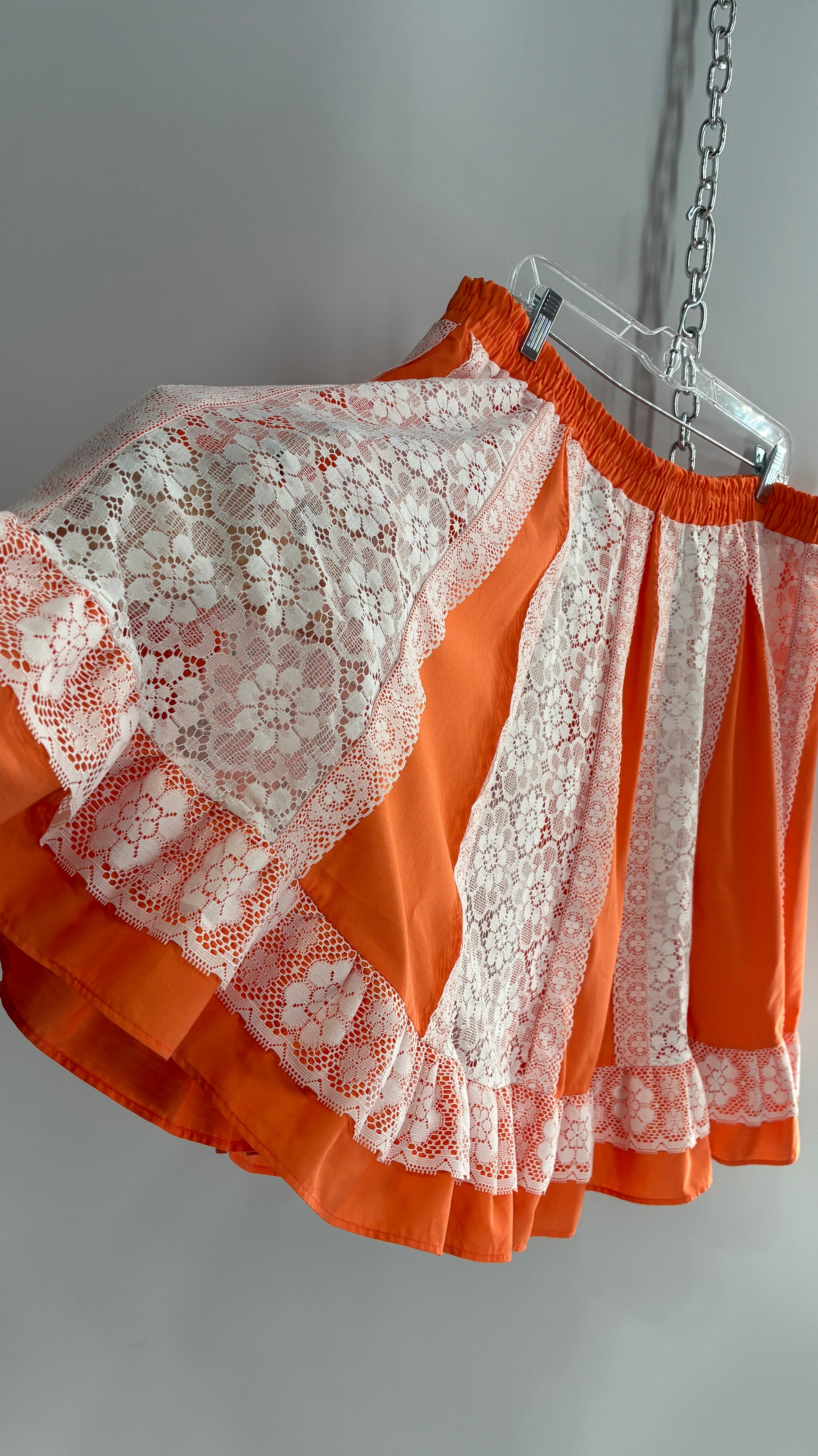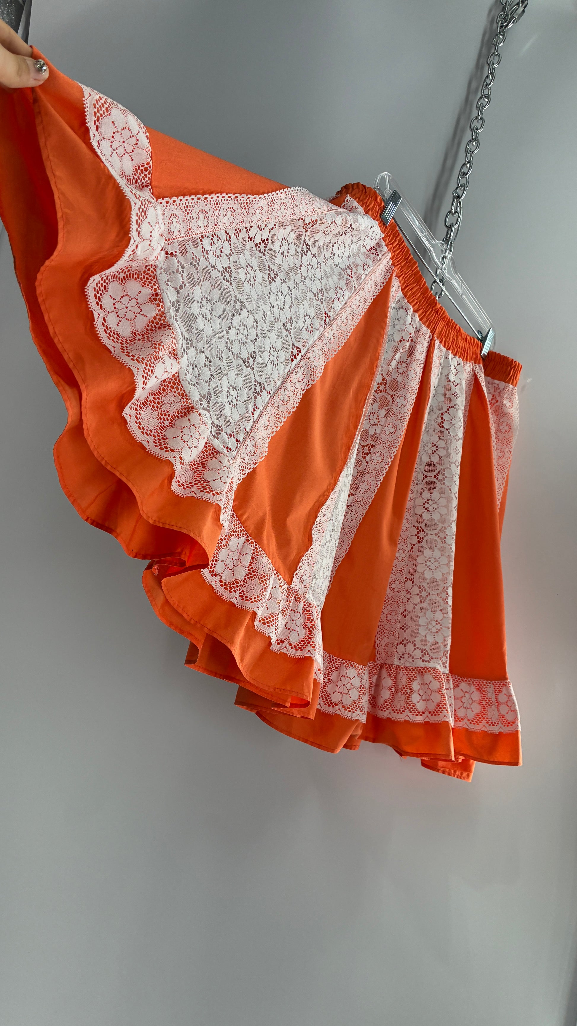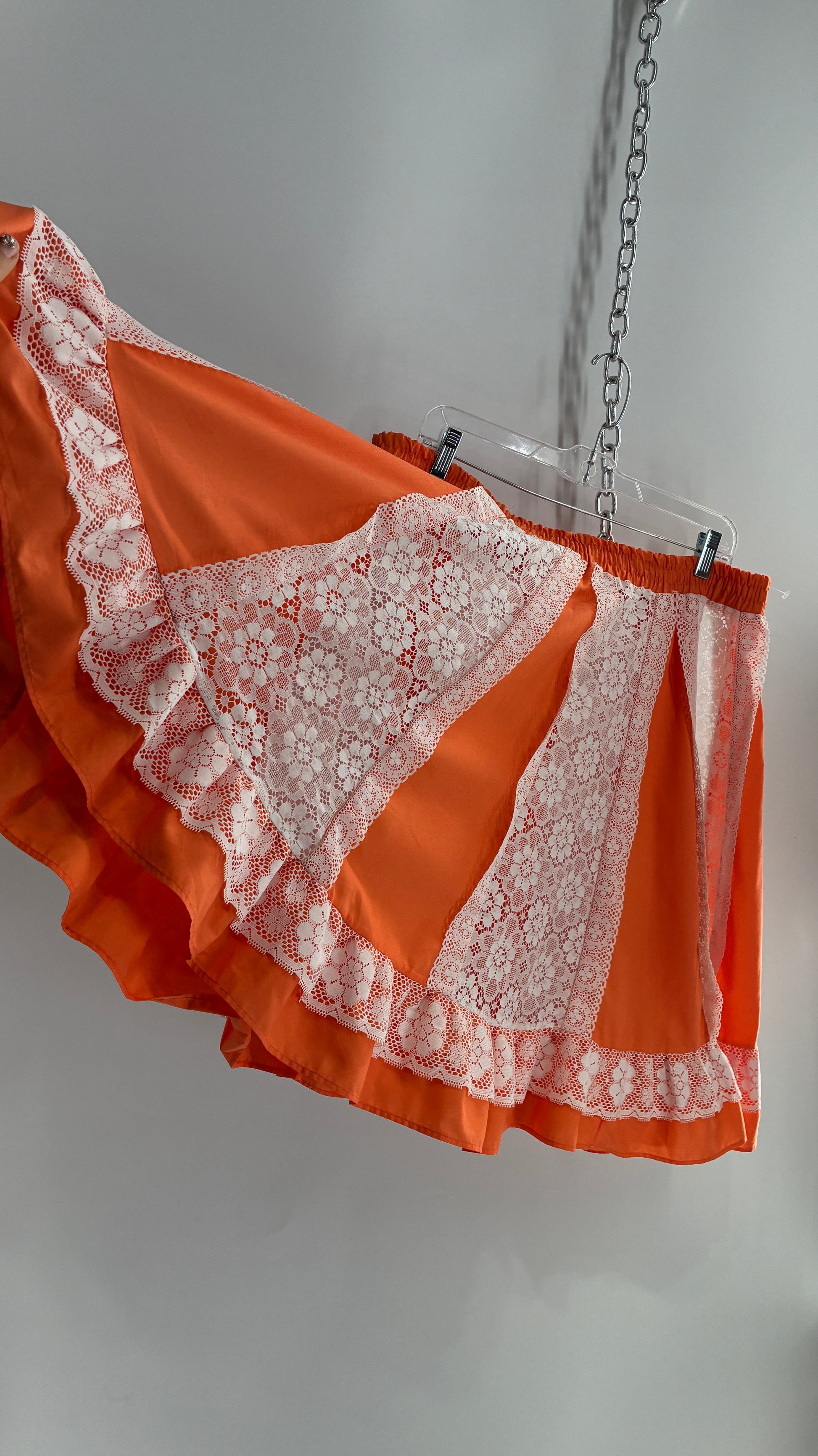 Vintage 1970s Handmade Sheer Lace Paneled Orange Mini Skirt (XL)