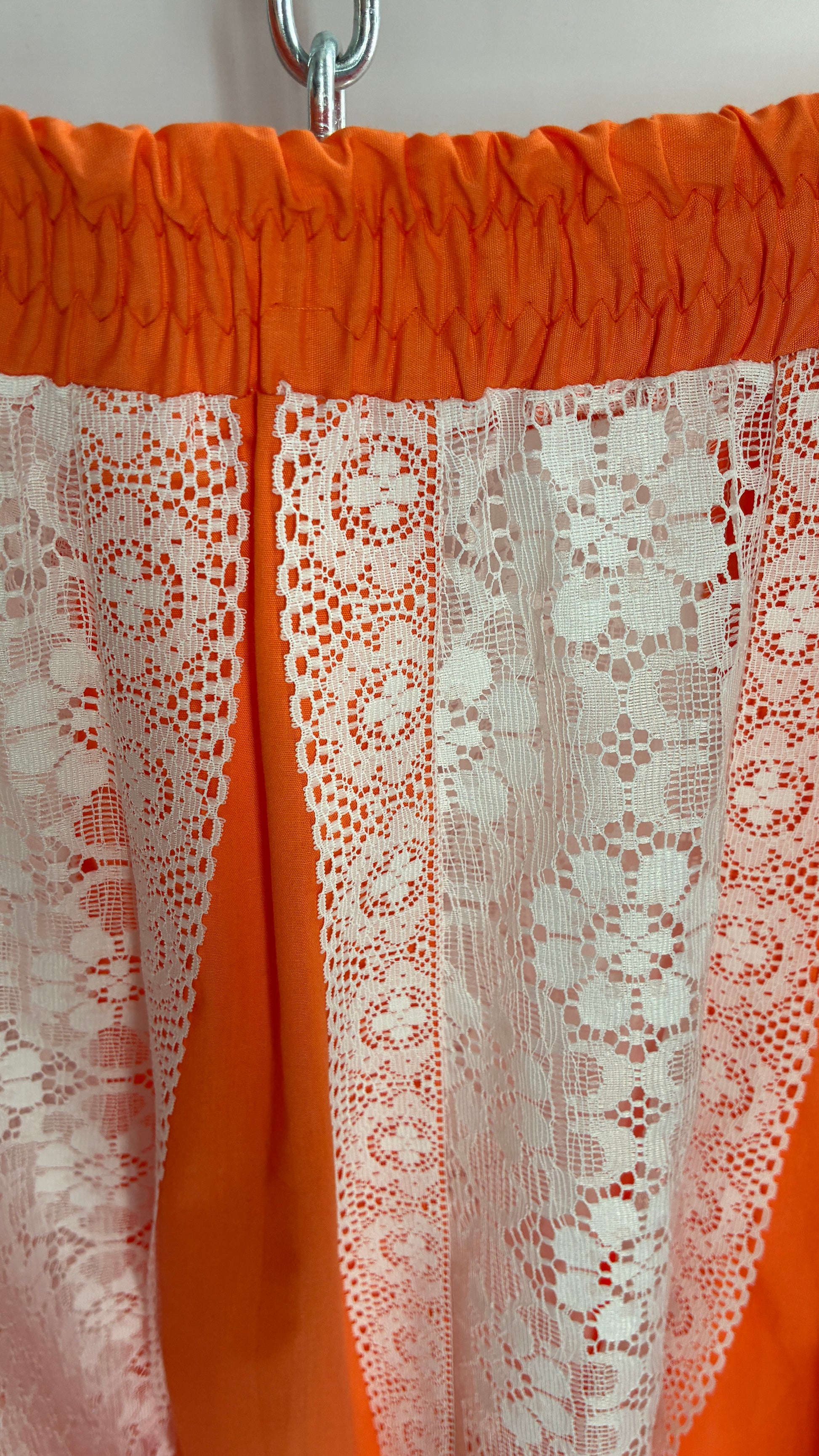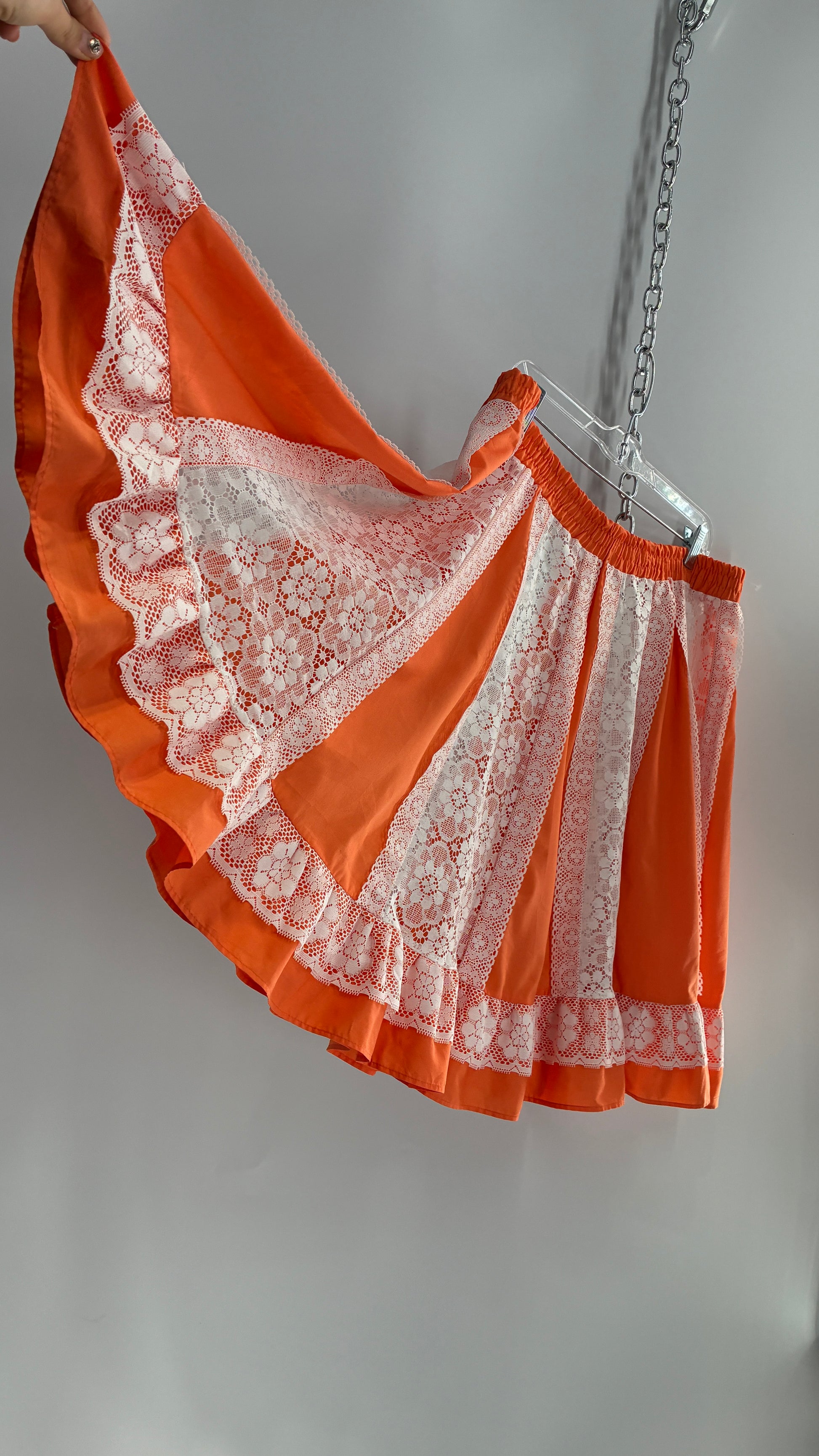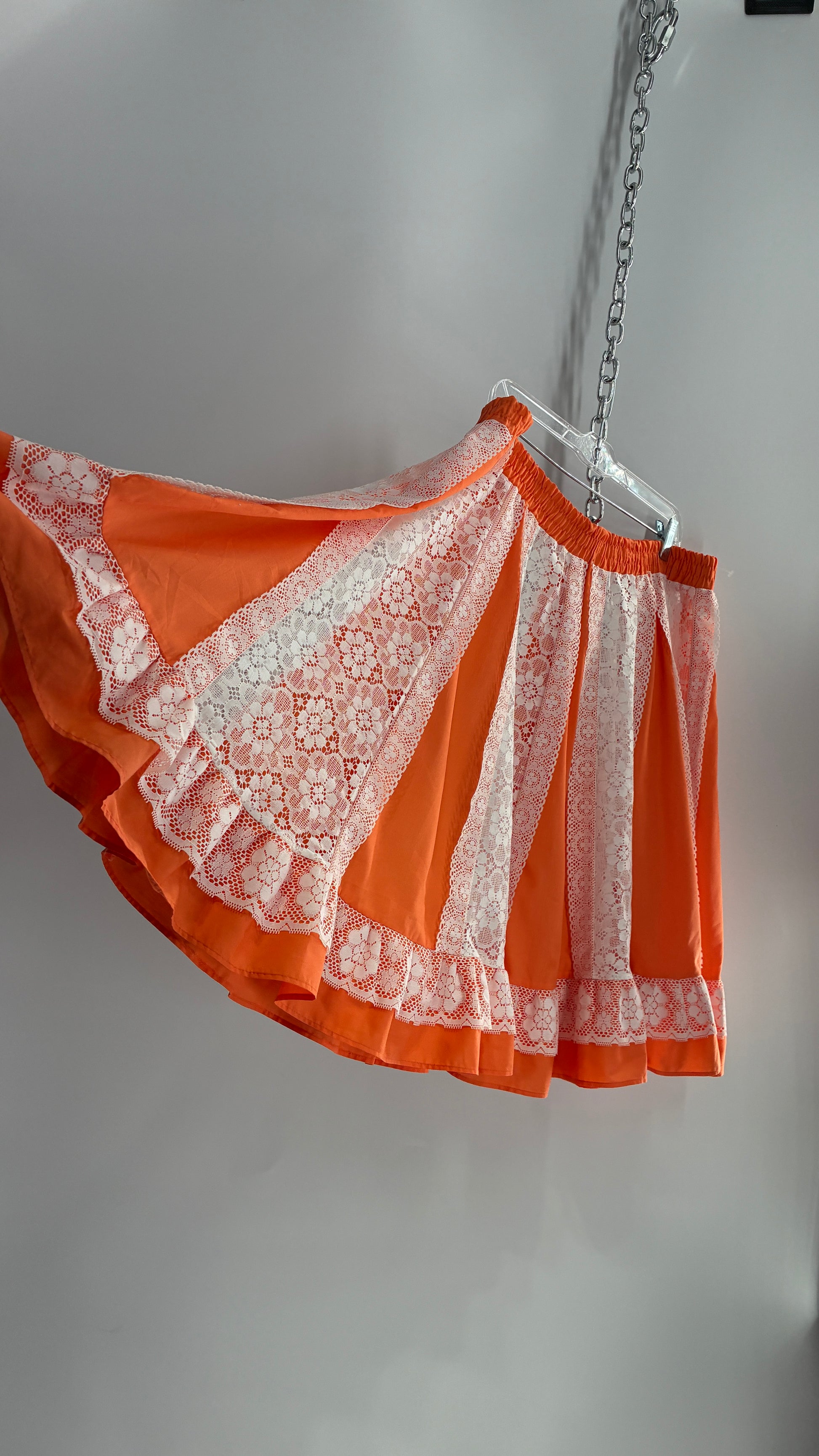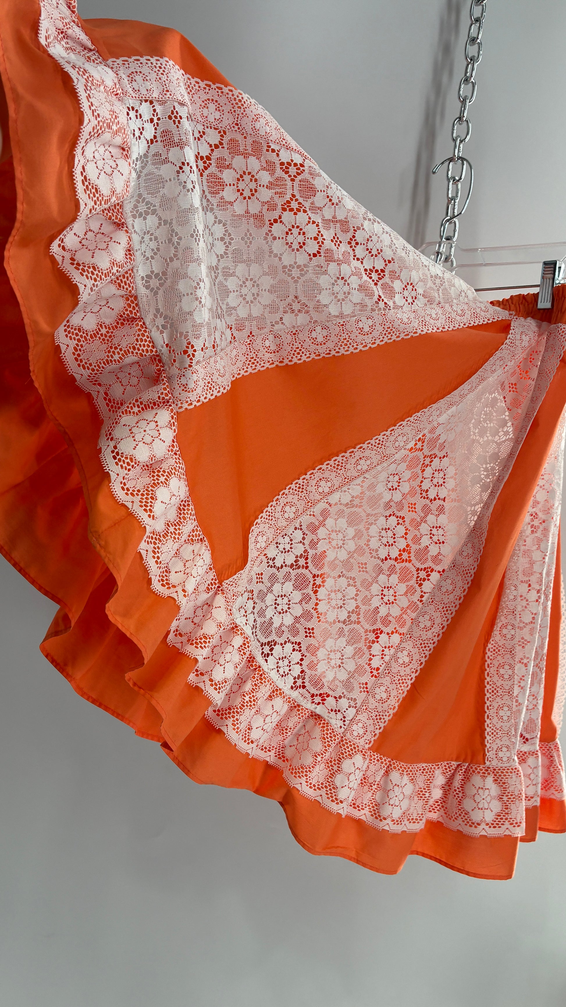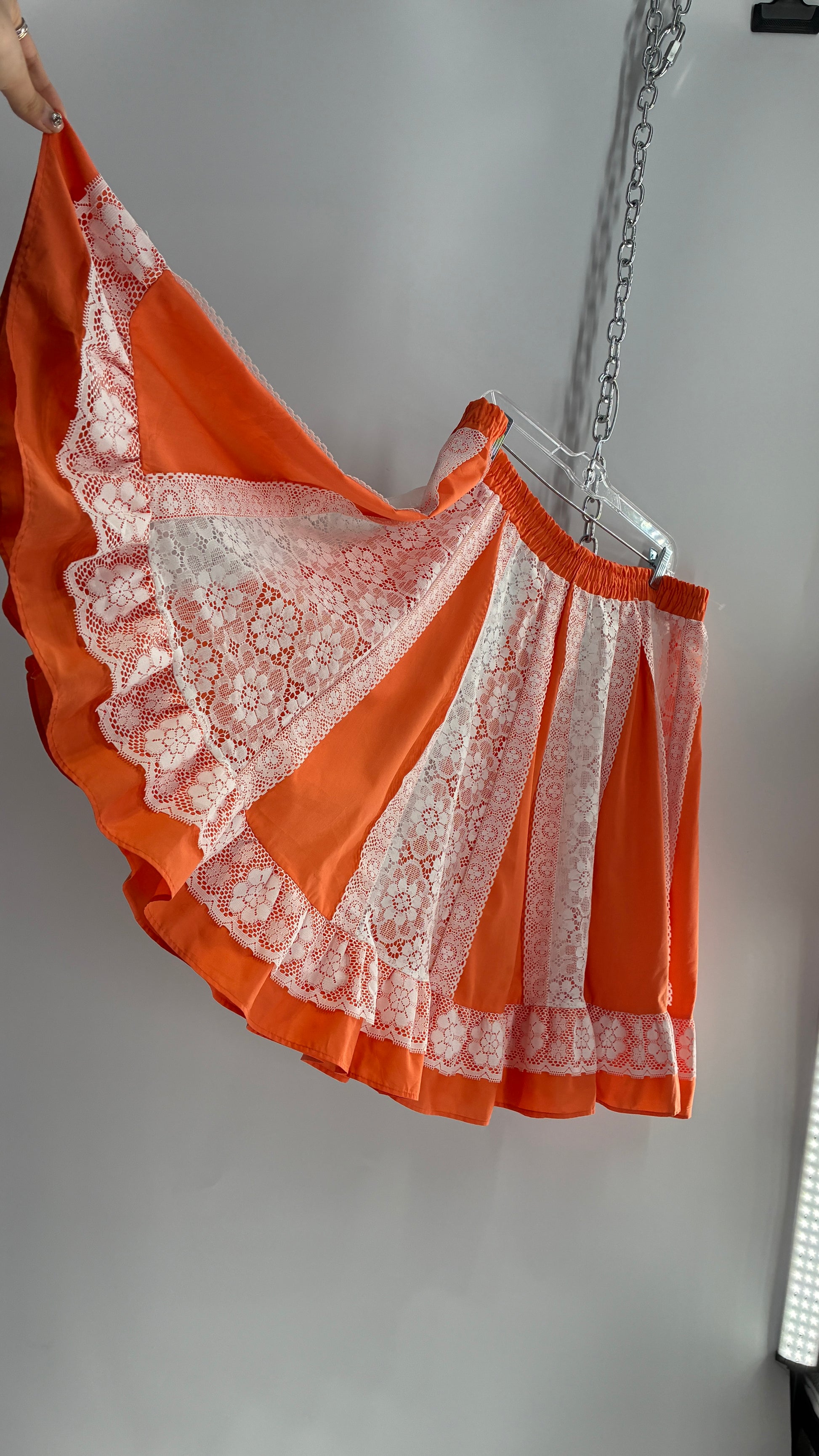 Vintage 1970s Handmade Sheer Lace Paneled Orange Mini Skirt (XL)