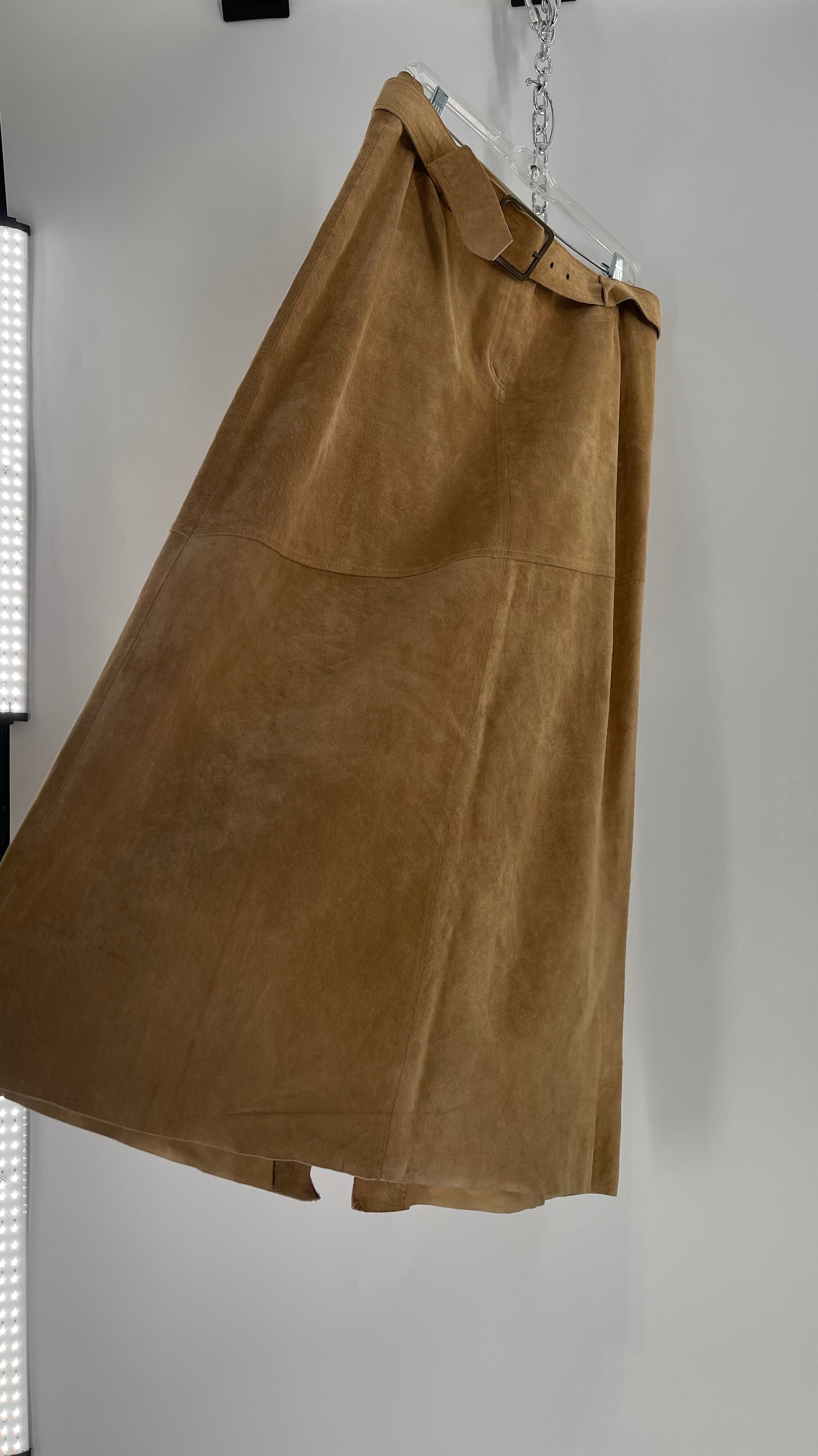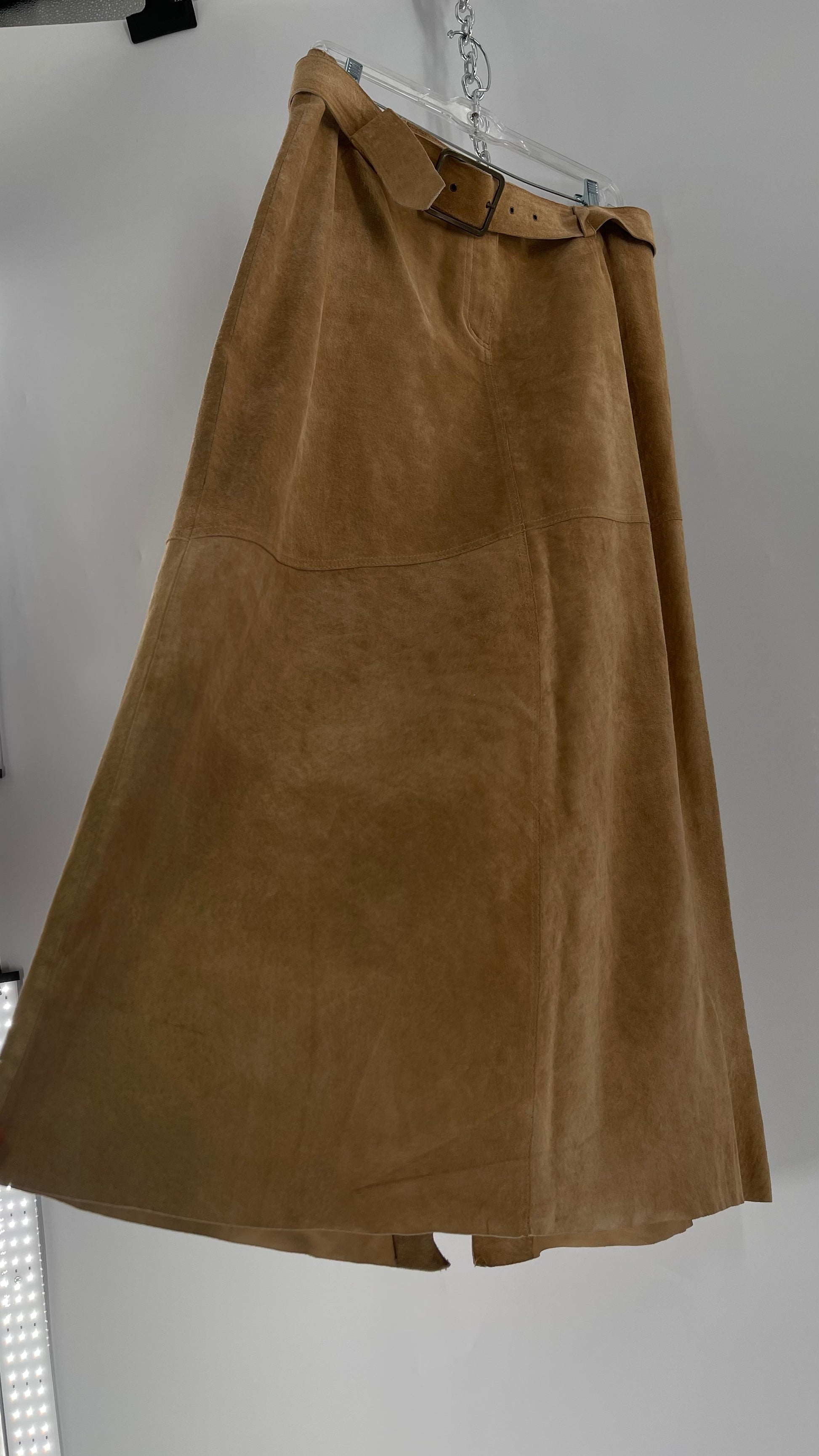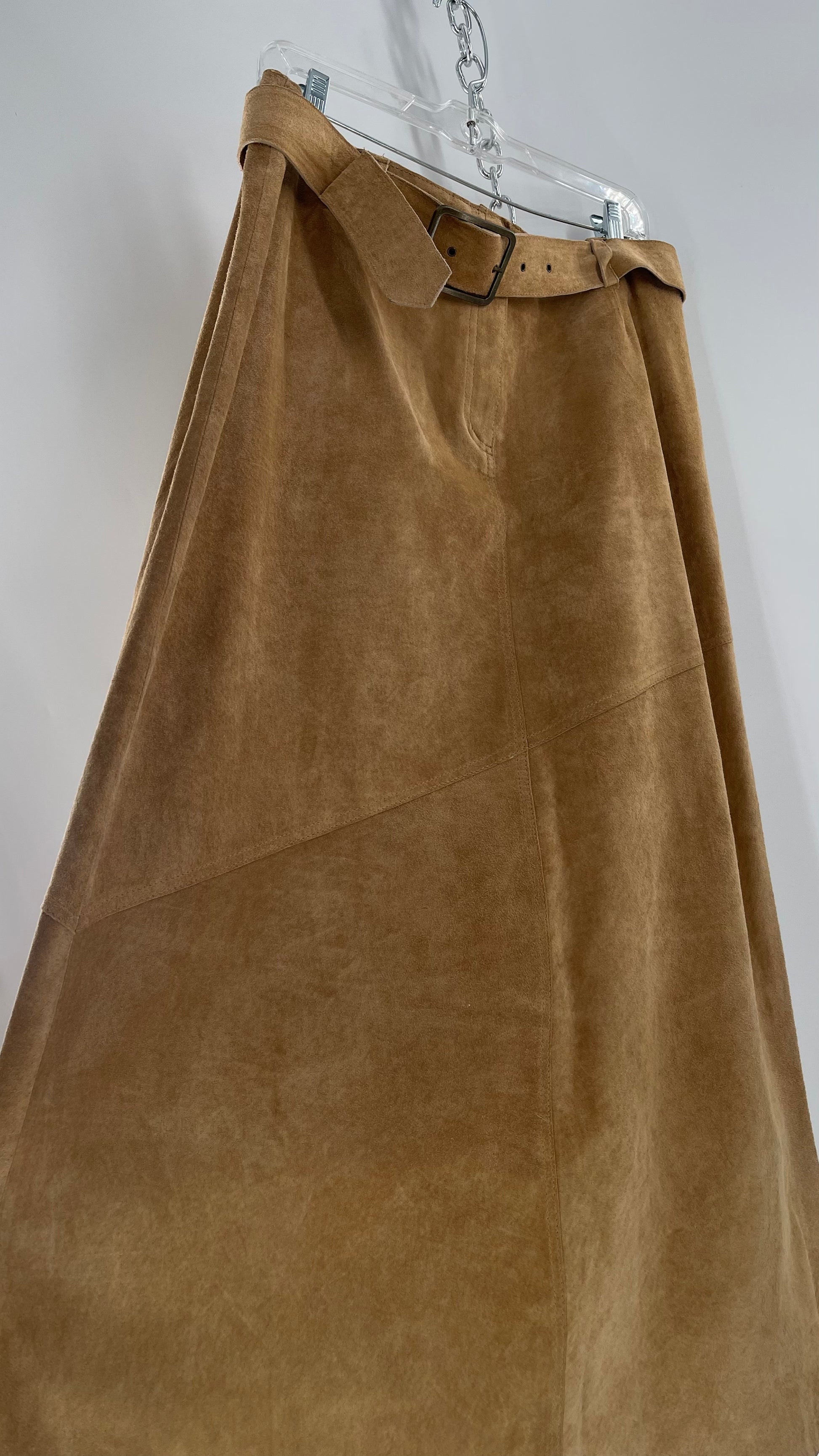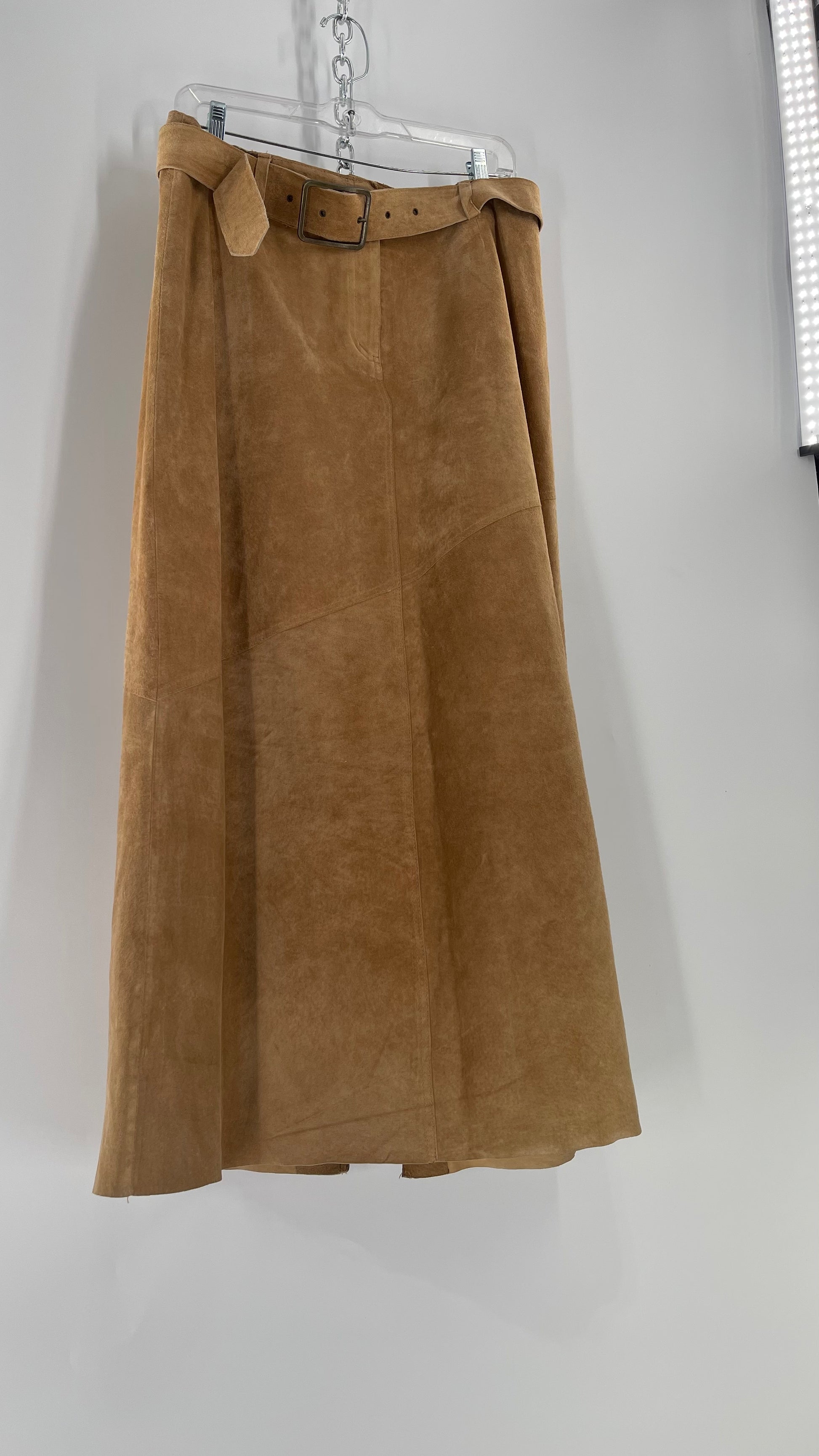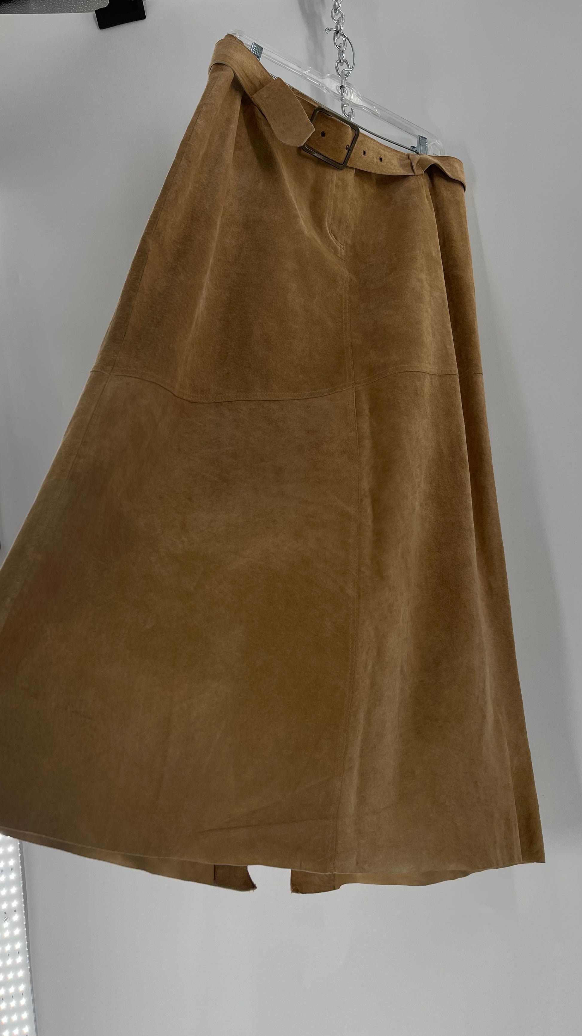 Vintage Margaret Godfrey Tan Suede Low Rise Full Length Skirt with Grommet Belt (14)