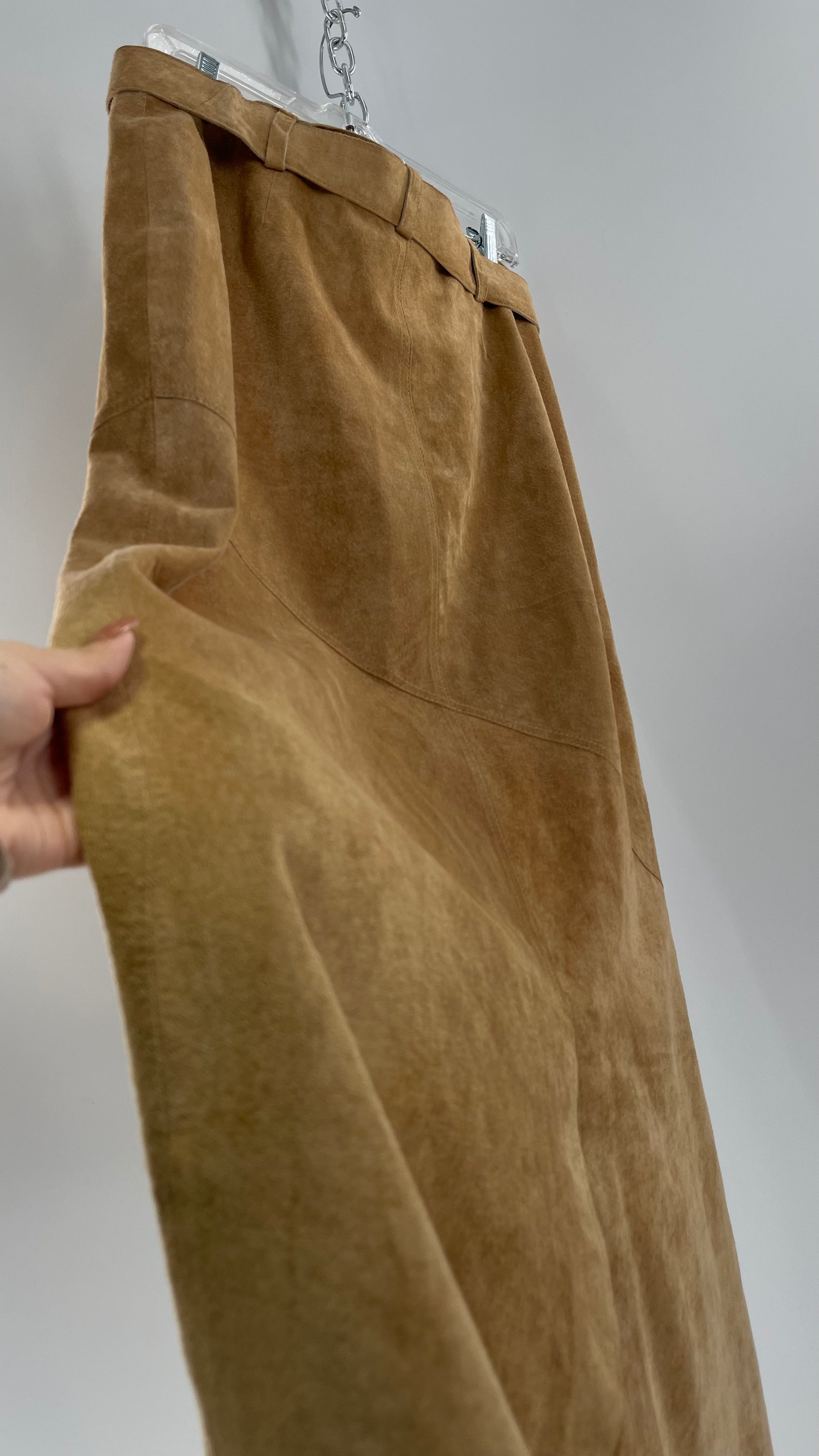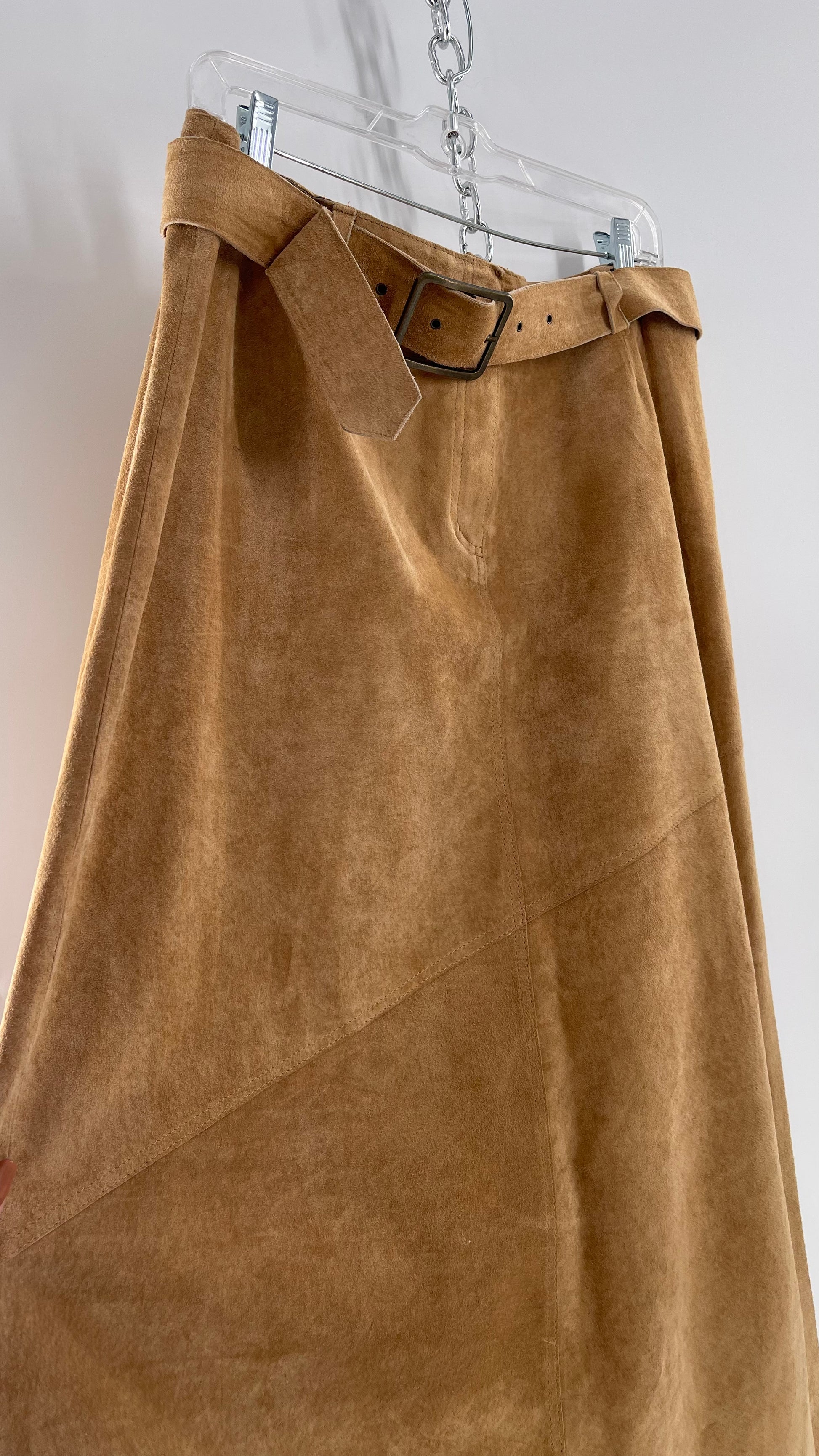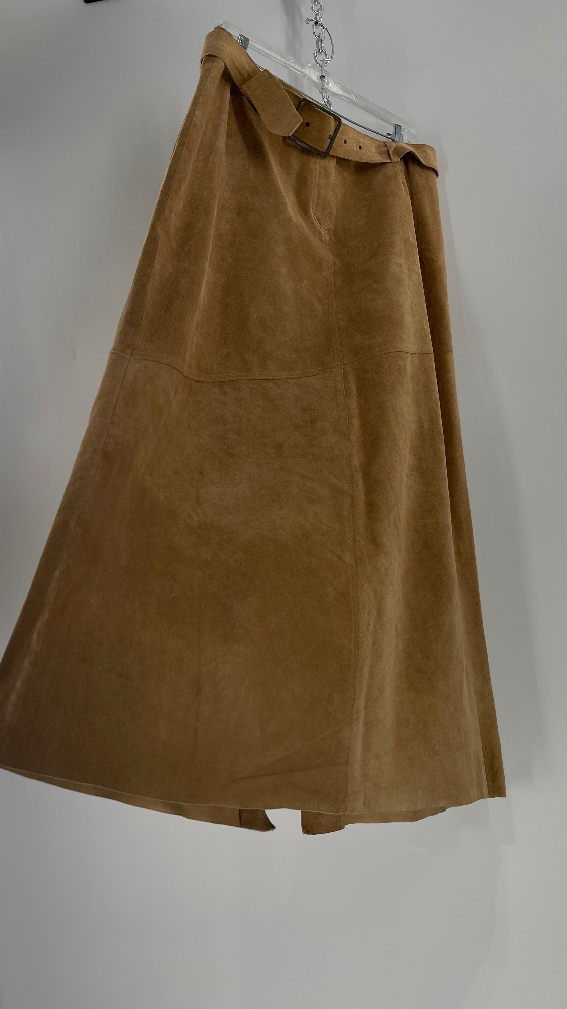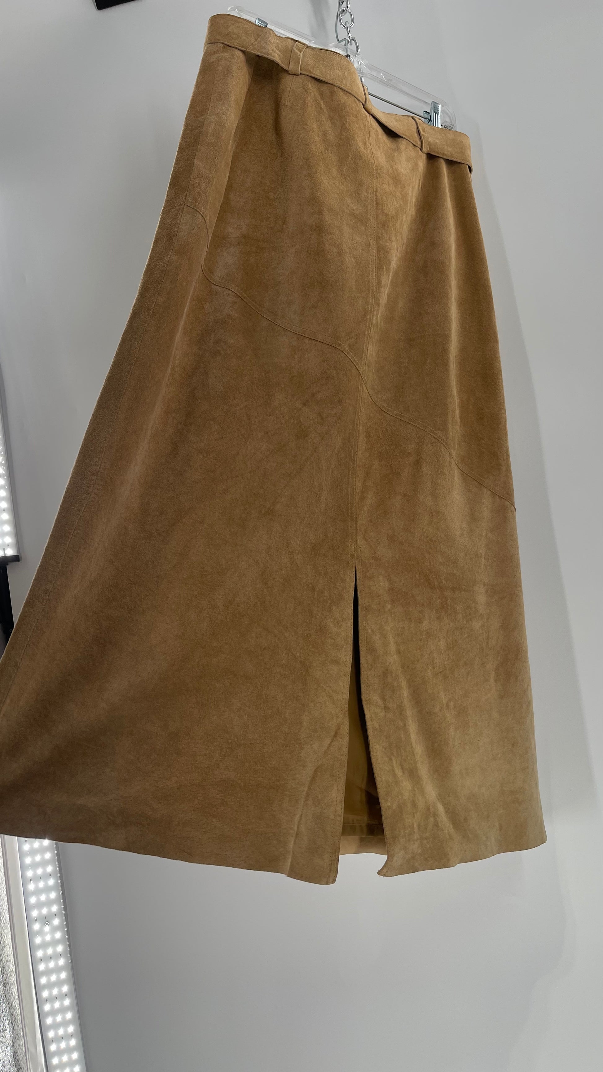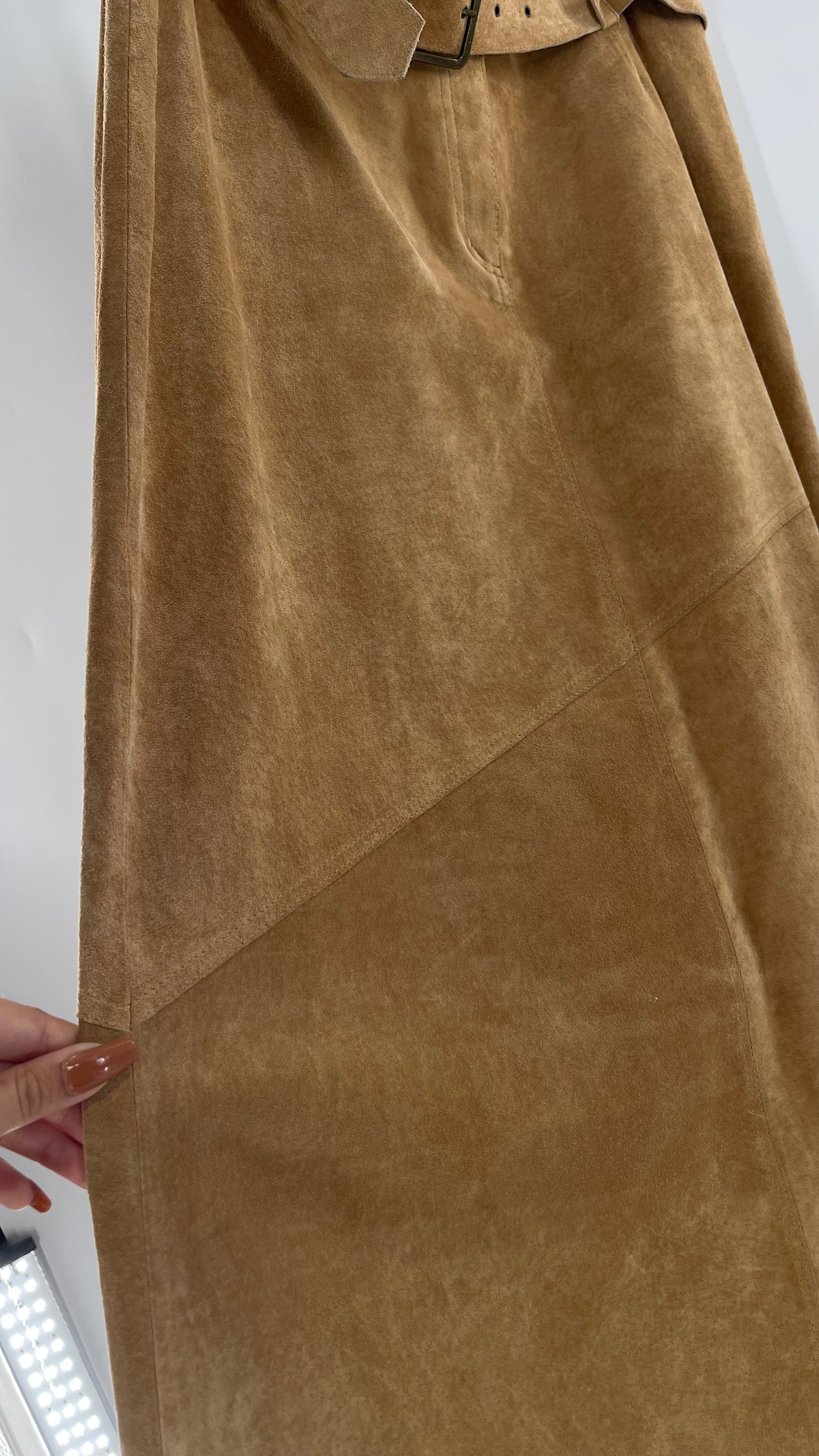 Vintage Margaret Godfrey Tan Suede Low Rise Full Length Skirt with Grommet Belt (14)