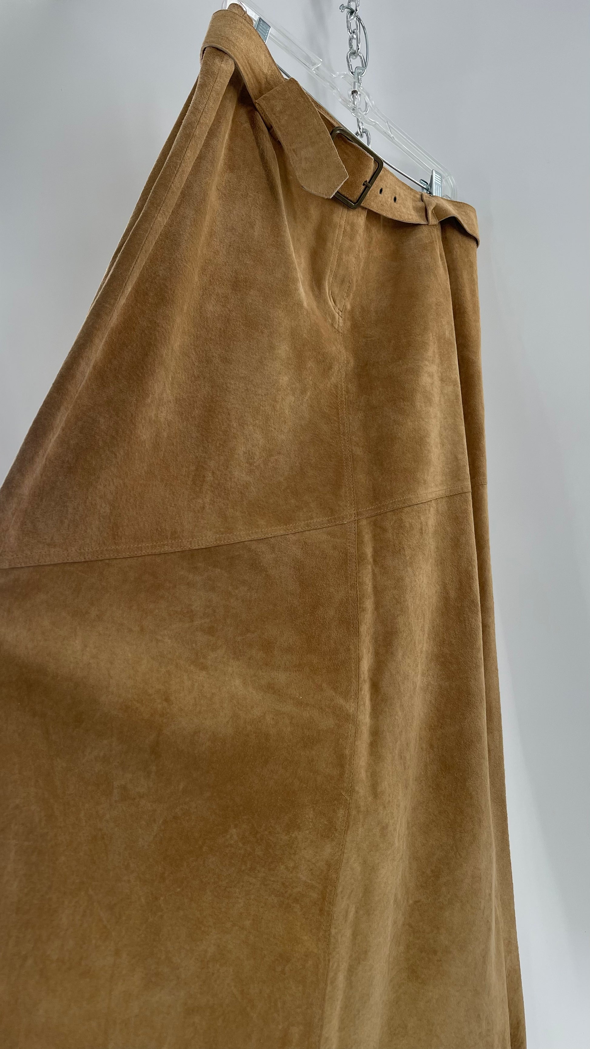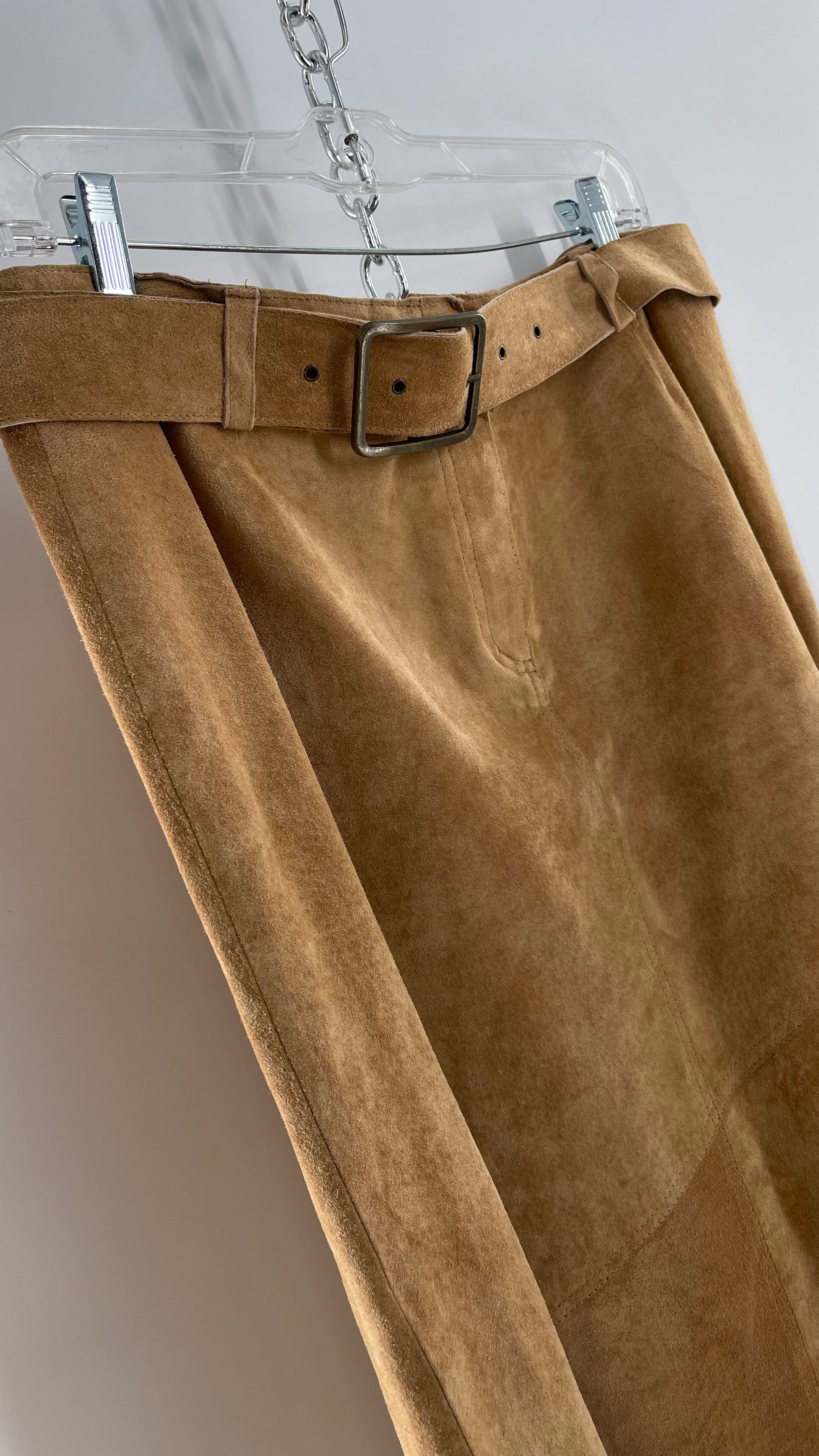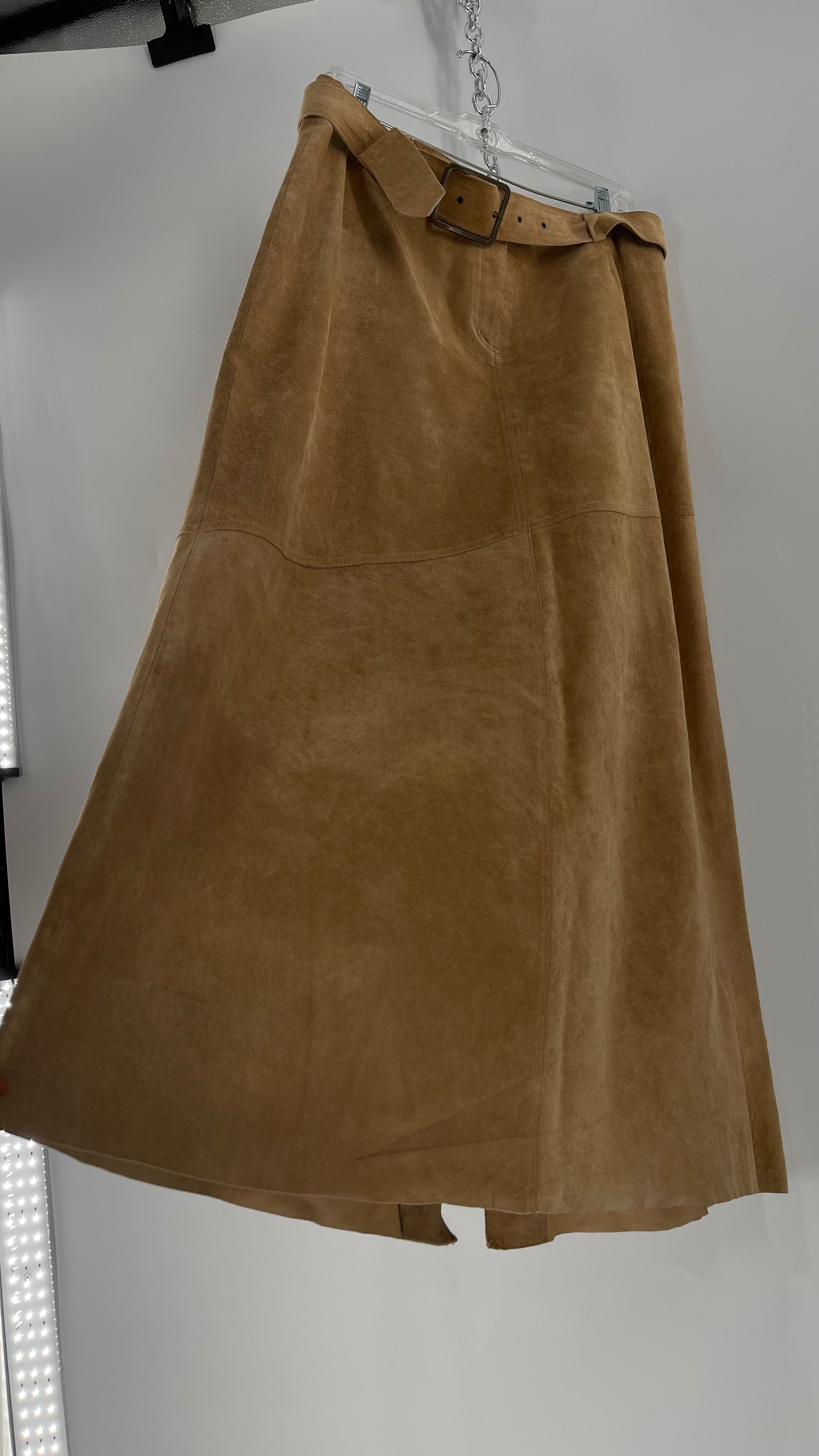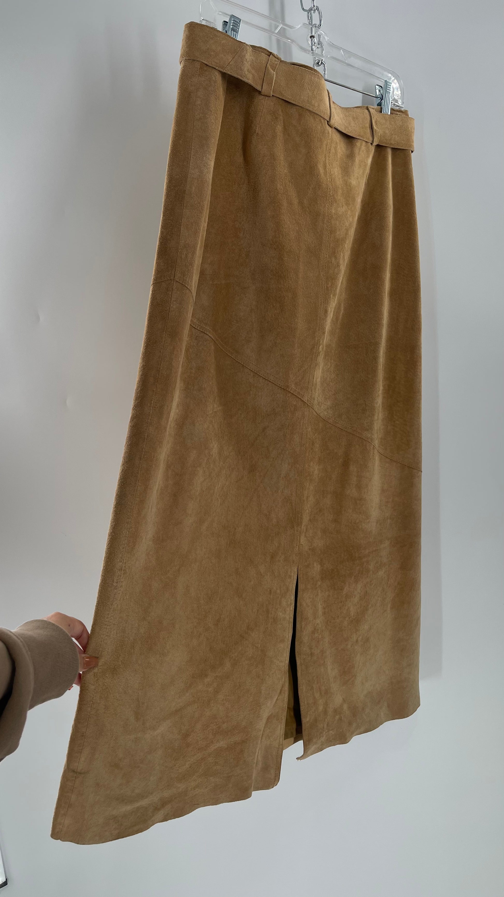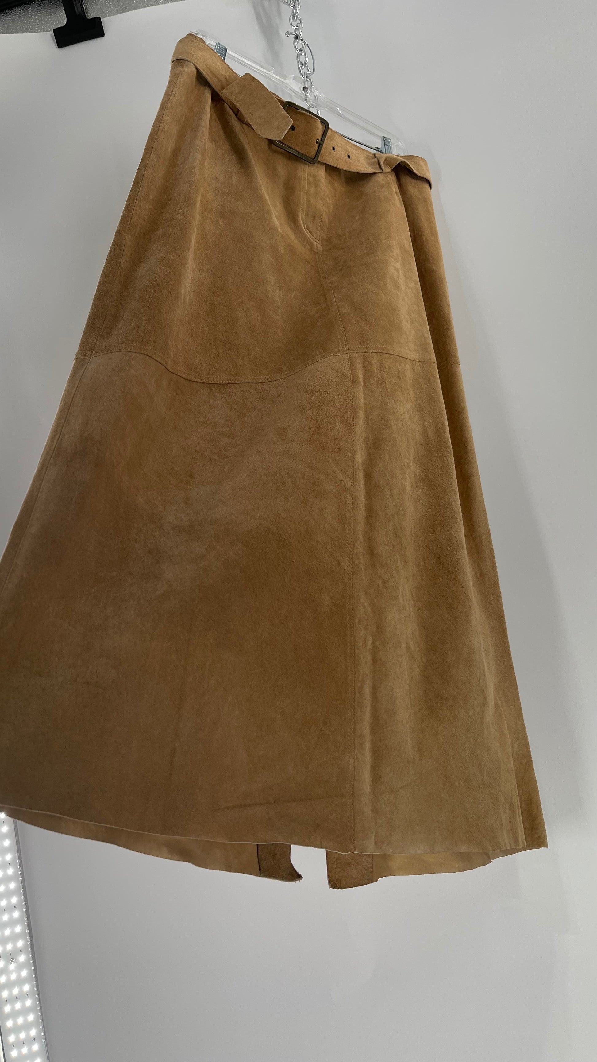 Vintage Margaret Godfrey Tan Suede Low Rise Full Length Skirt with Grommet Belt (14)