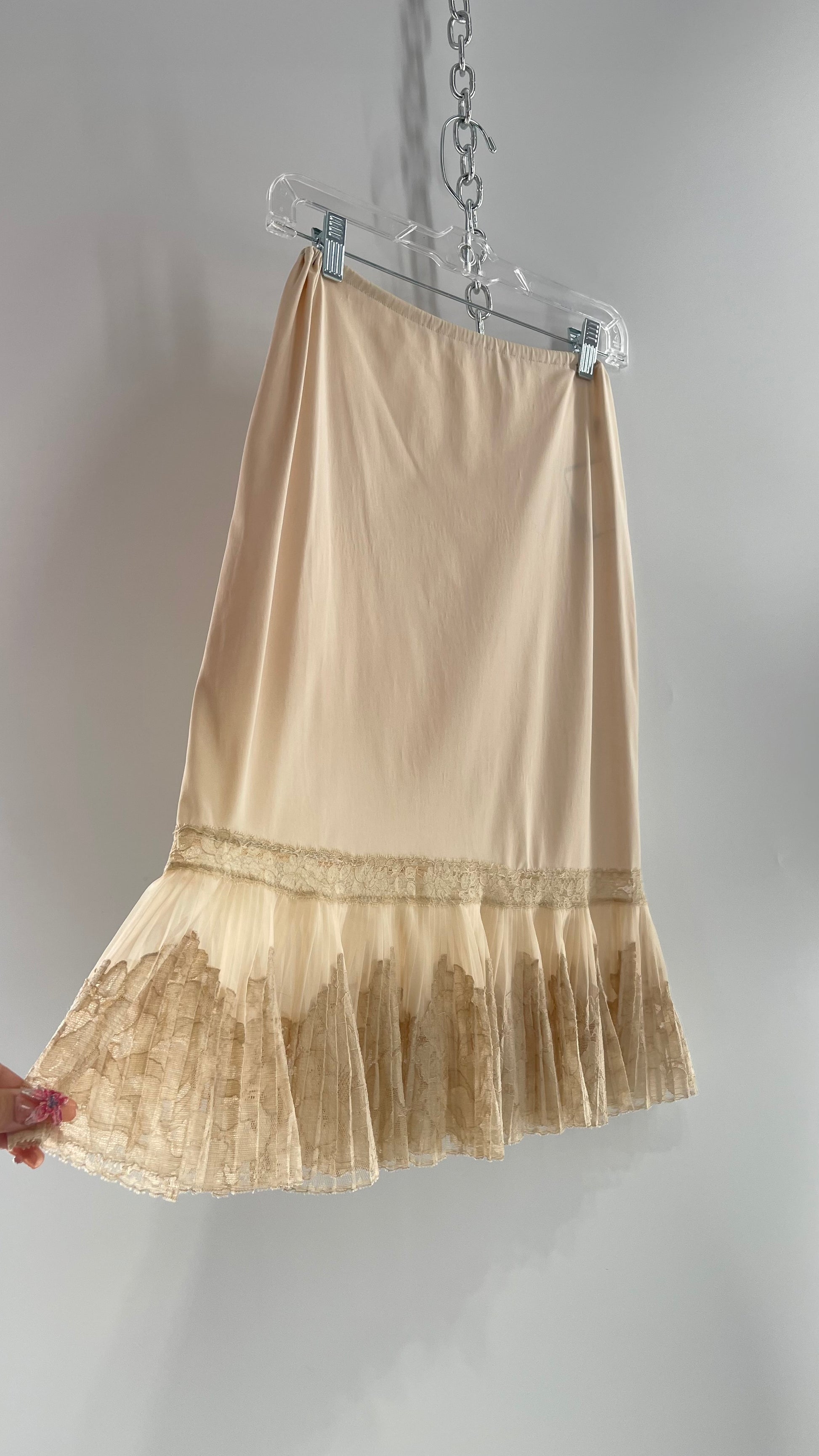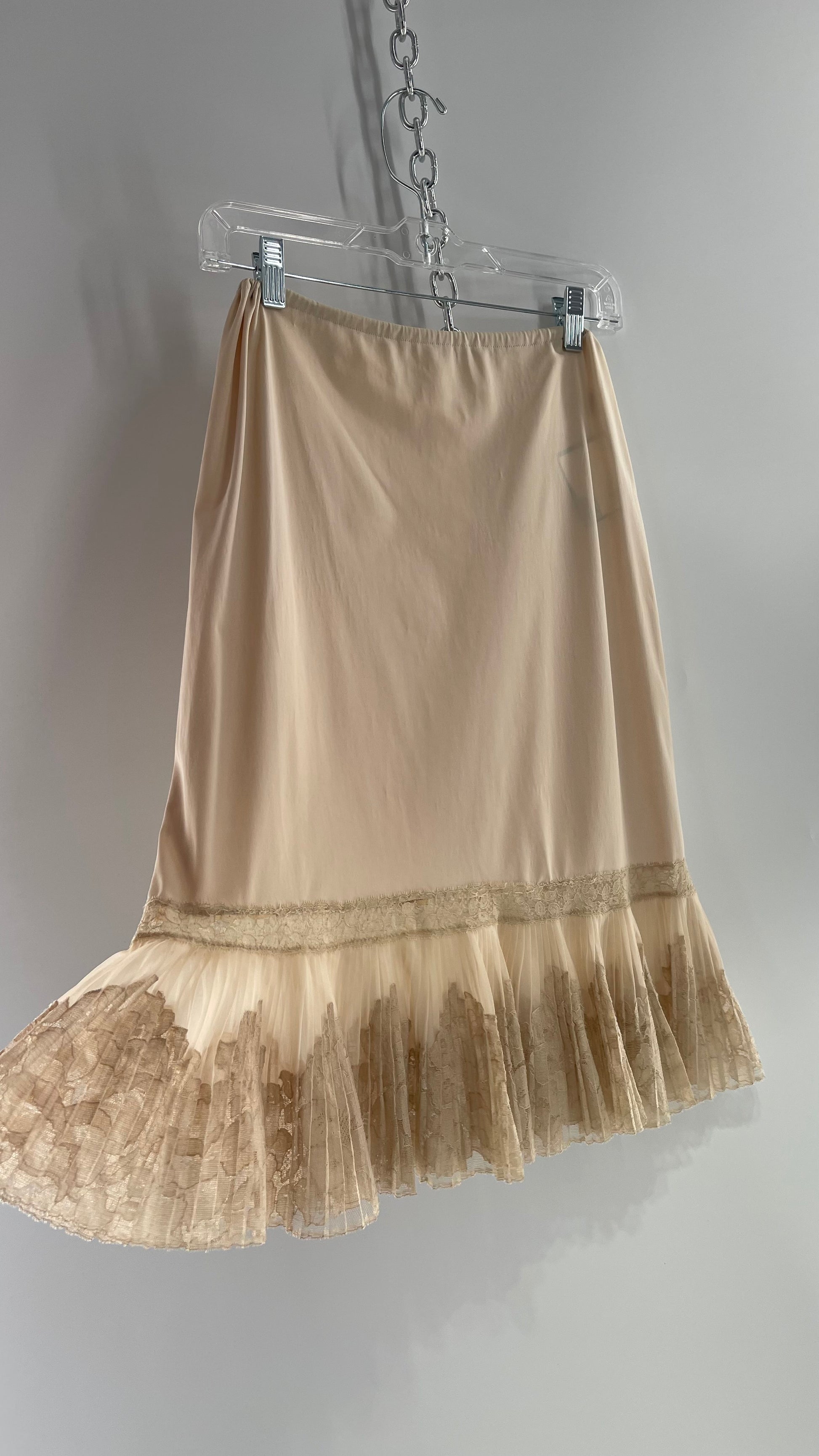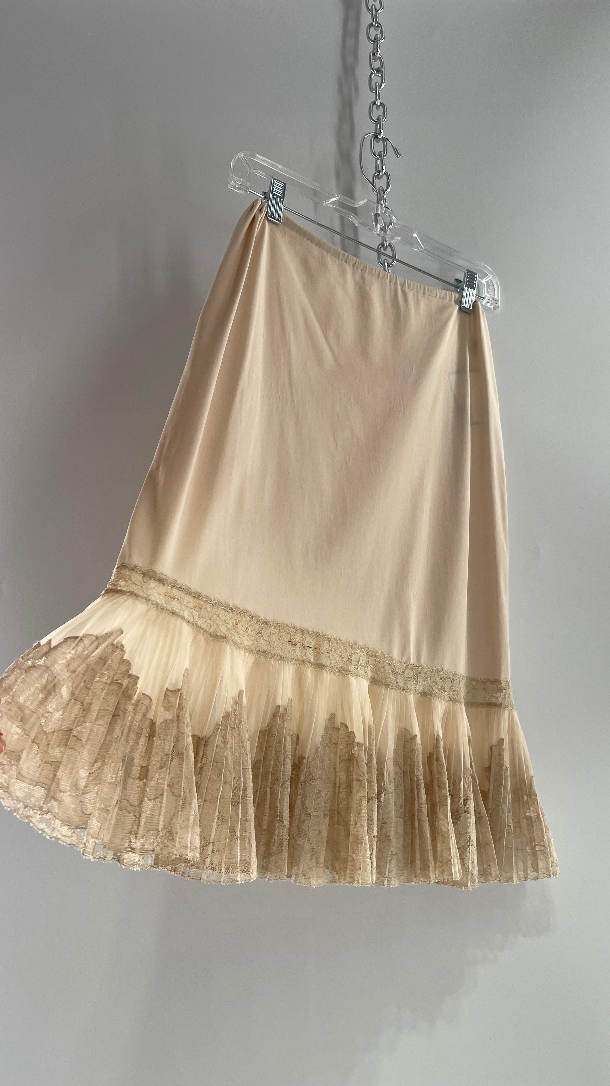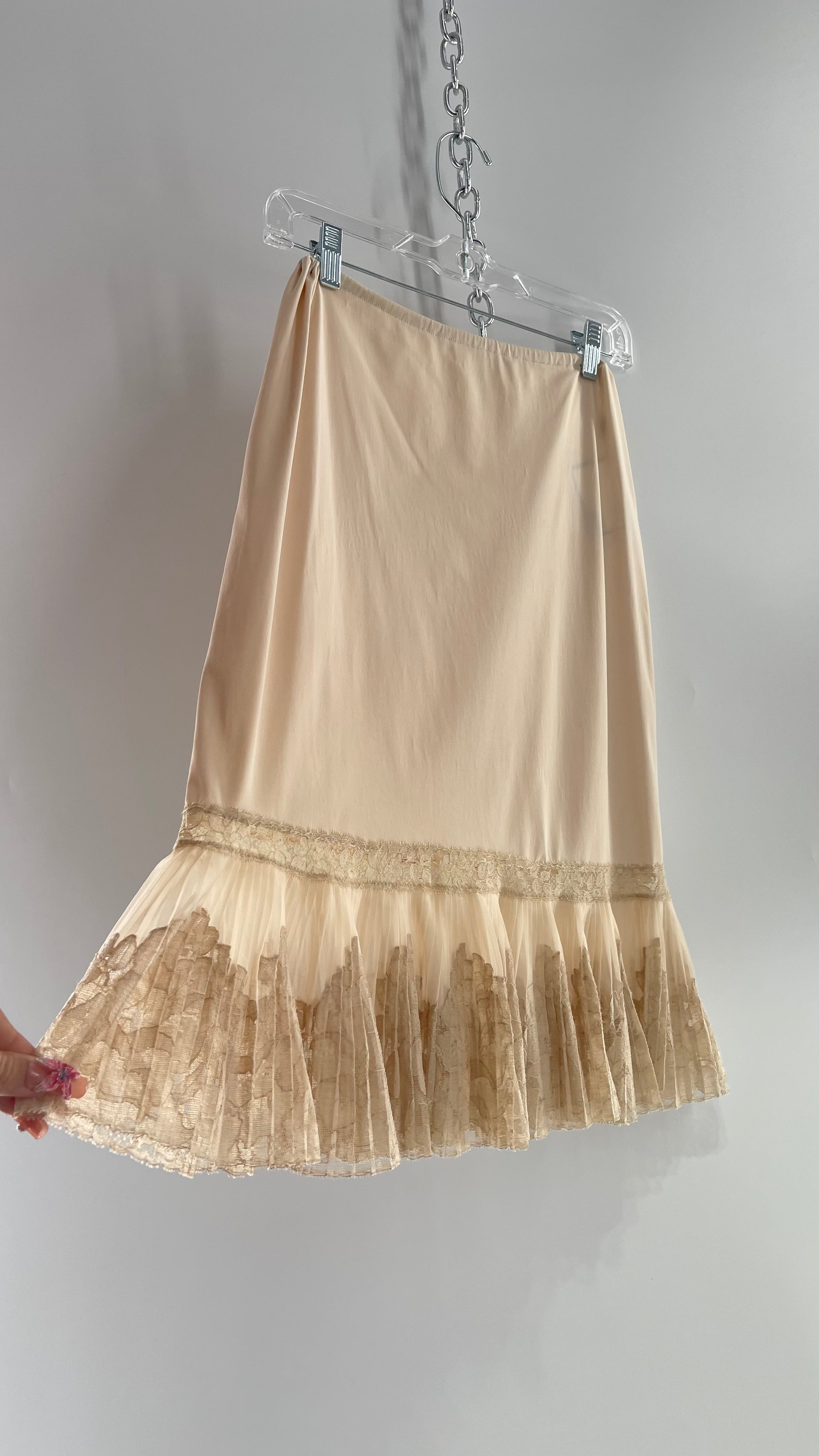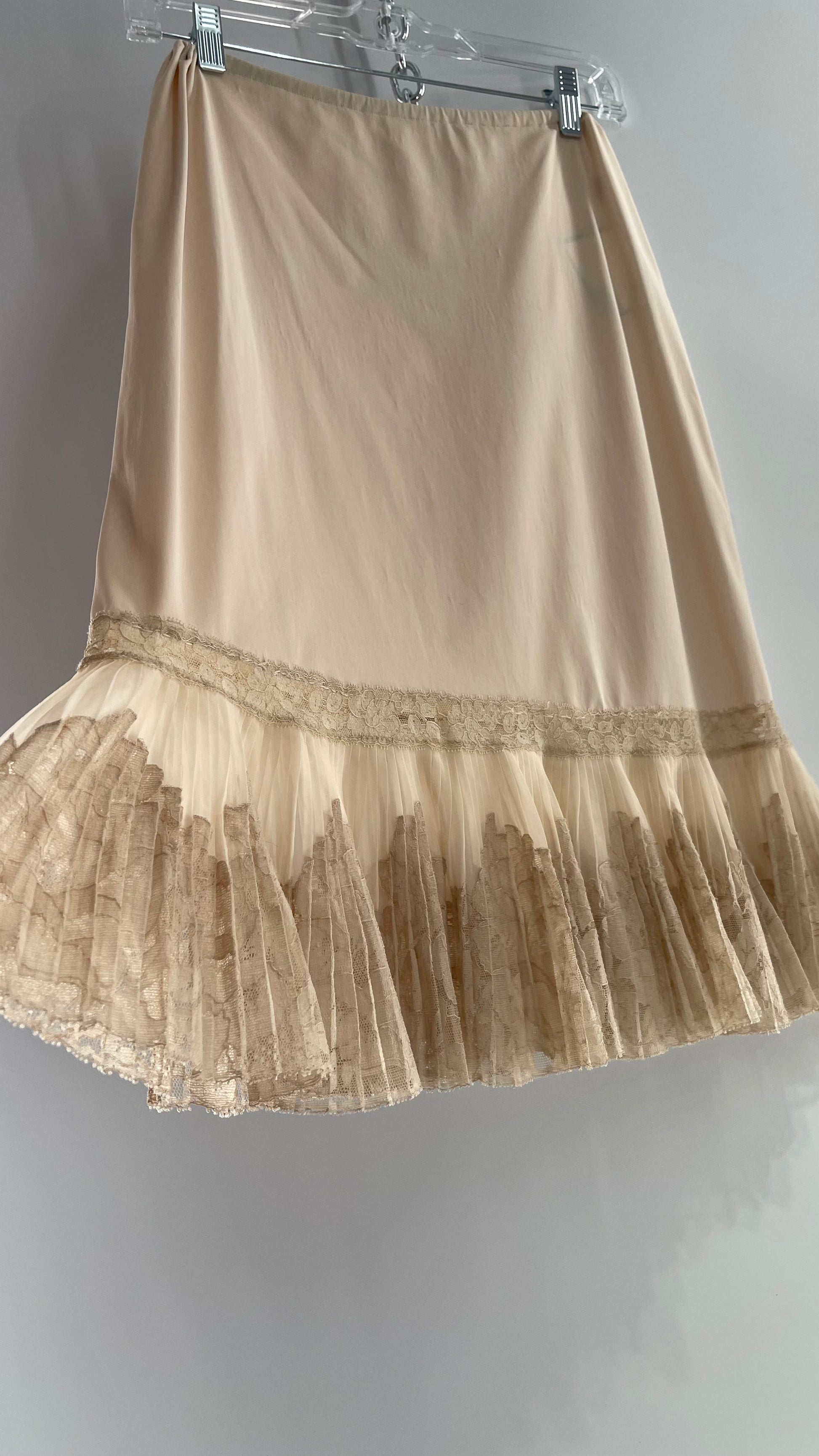 Vintage 1960s Beige Mídi Petty Skirt with Pleated Lace Hem Detail (Small)